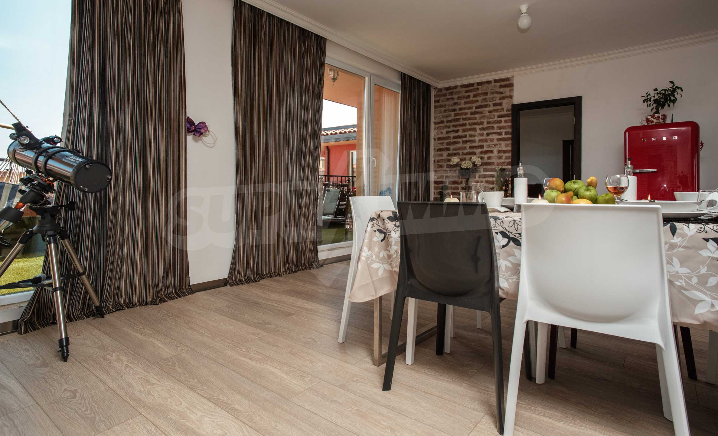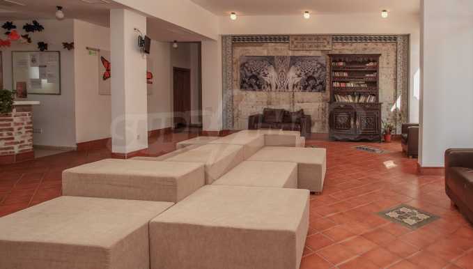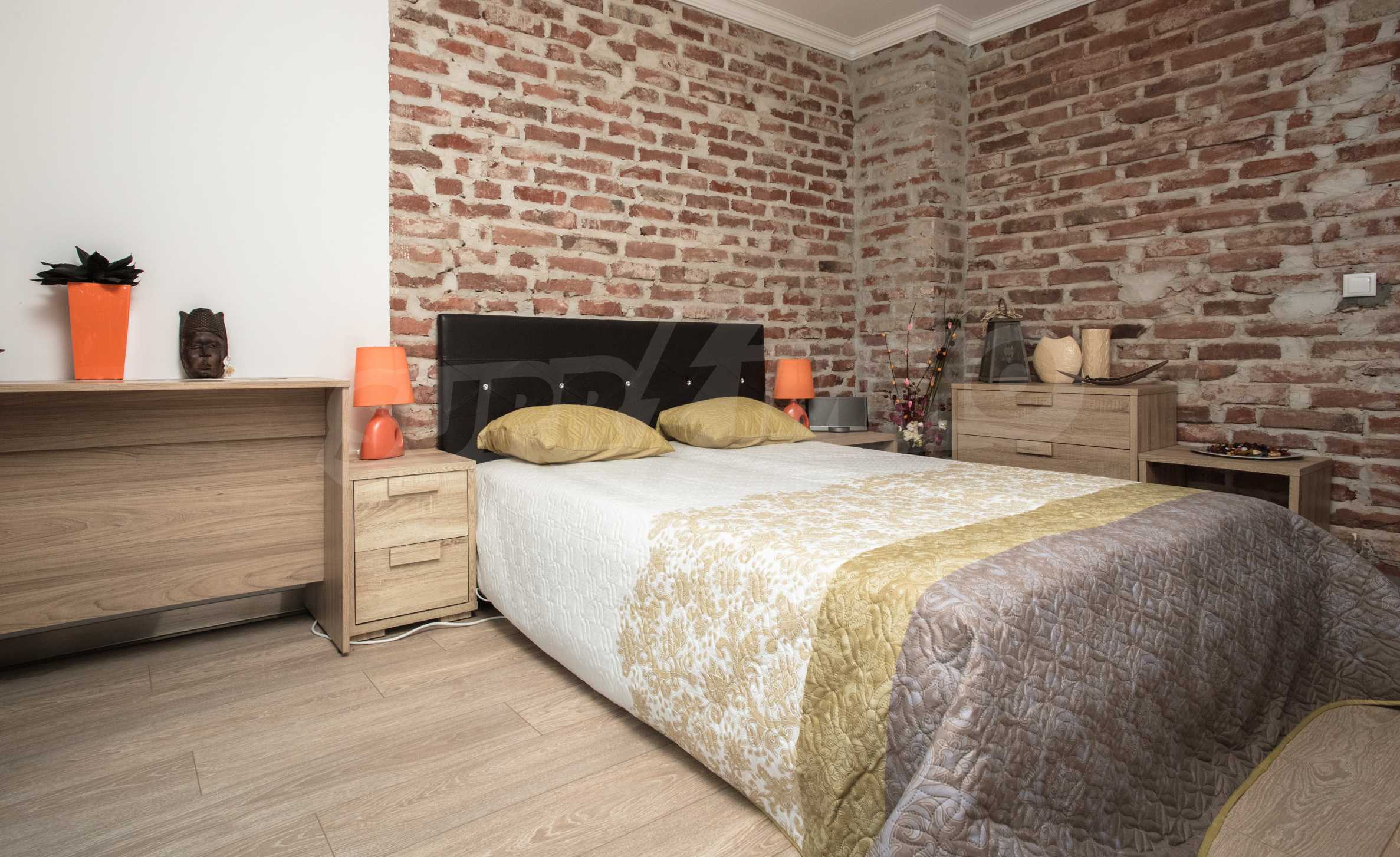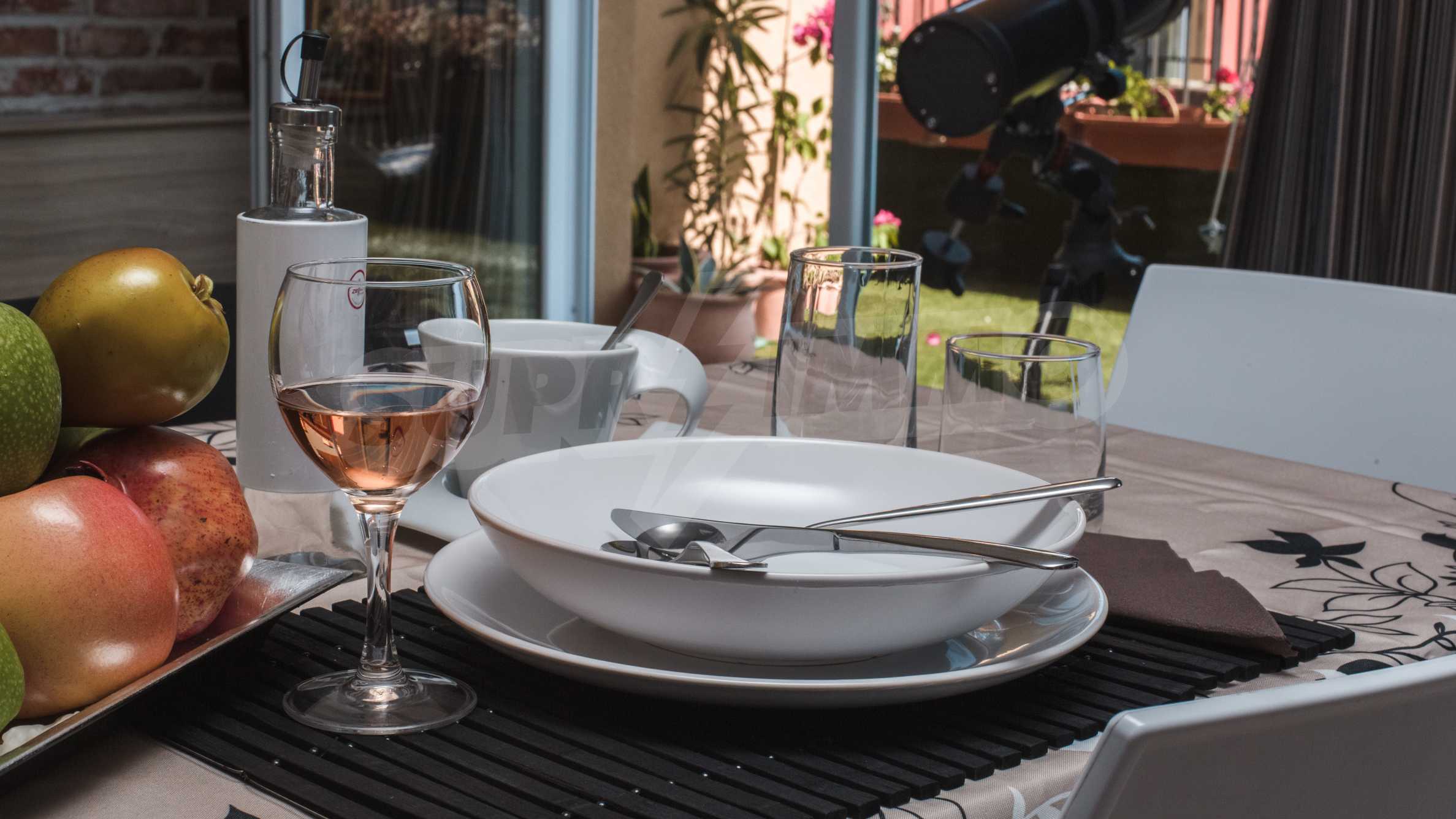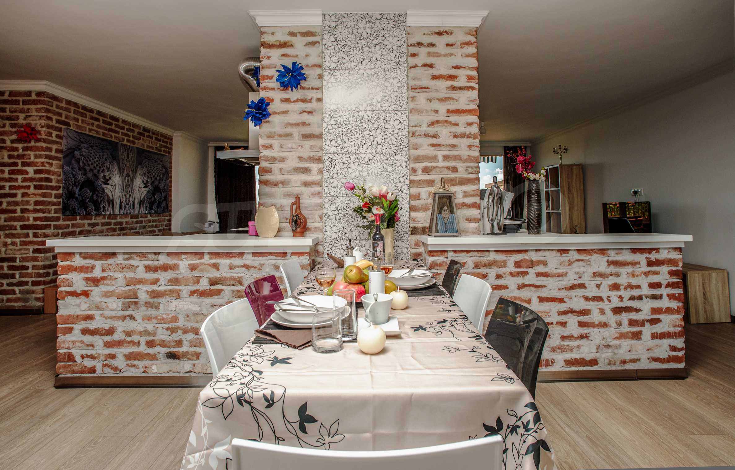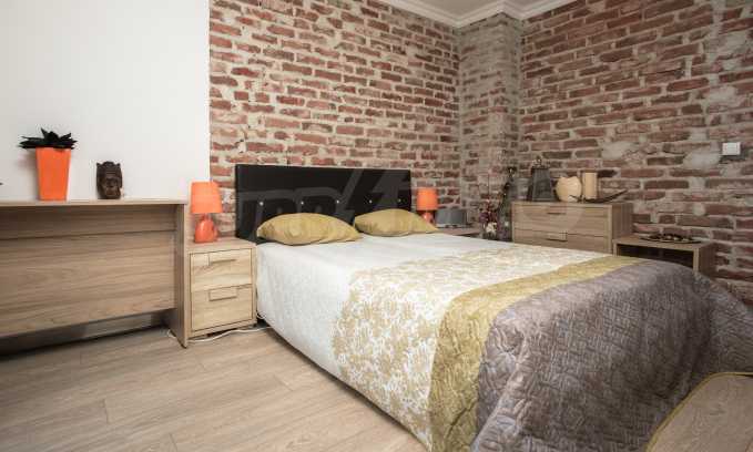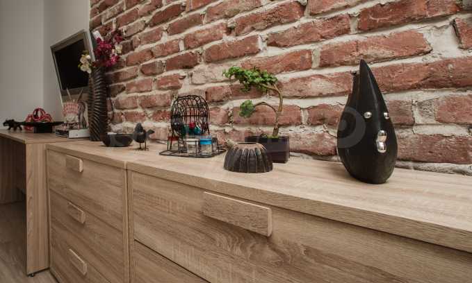 During the construction of the complex have been used only high quality materials. The apartments are finished and come with 5 cm EPS insulation, 5-chamber UPVC window frames front and interior doors from MDF with oak covering; latex painted walls, laminated flooring. The kitchen has fitted cupboards, oven / microwave; 2 electric hotplates, a refrigerator and a sink. The bathrooms have bathtubs, faucets for hot and cold water, flush toilet, sink with hot and cold water mixer, lighting, 4 electric boilers for hot water meter, air conditioners. The apartment has installations for cable television, wireless internet, security and fire alarm system.