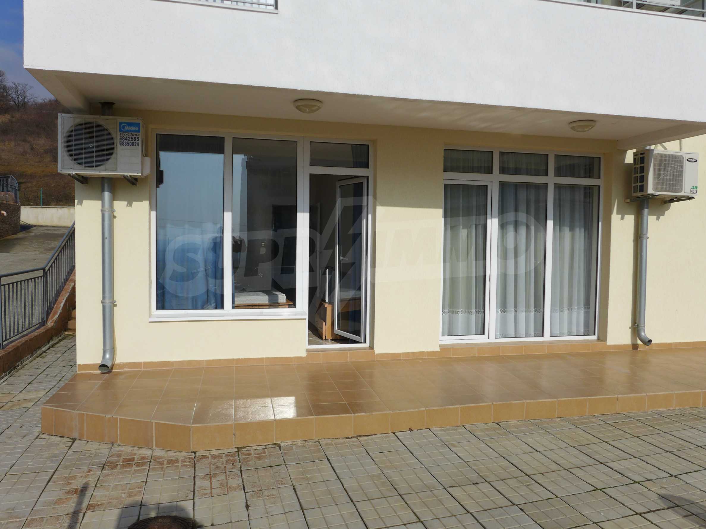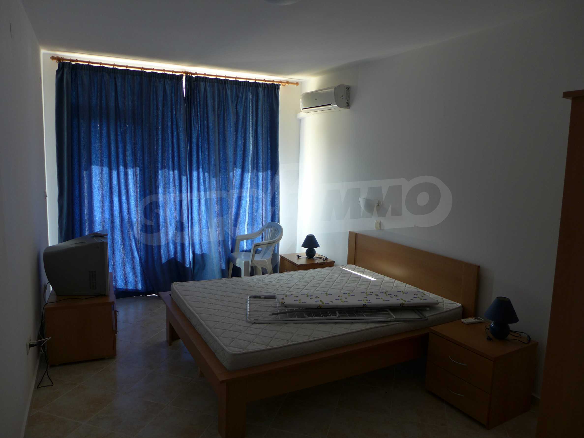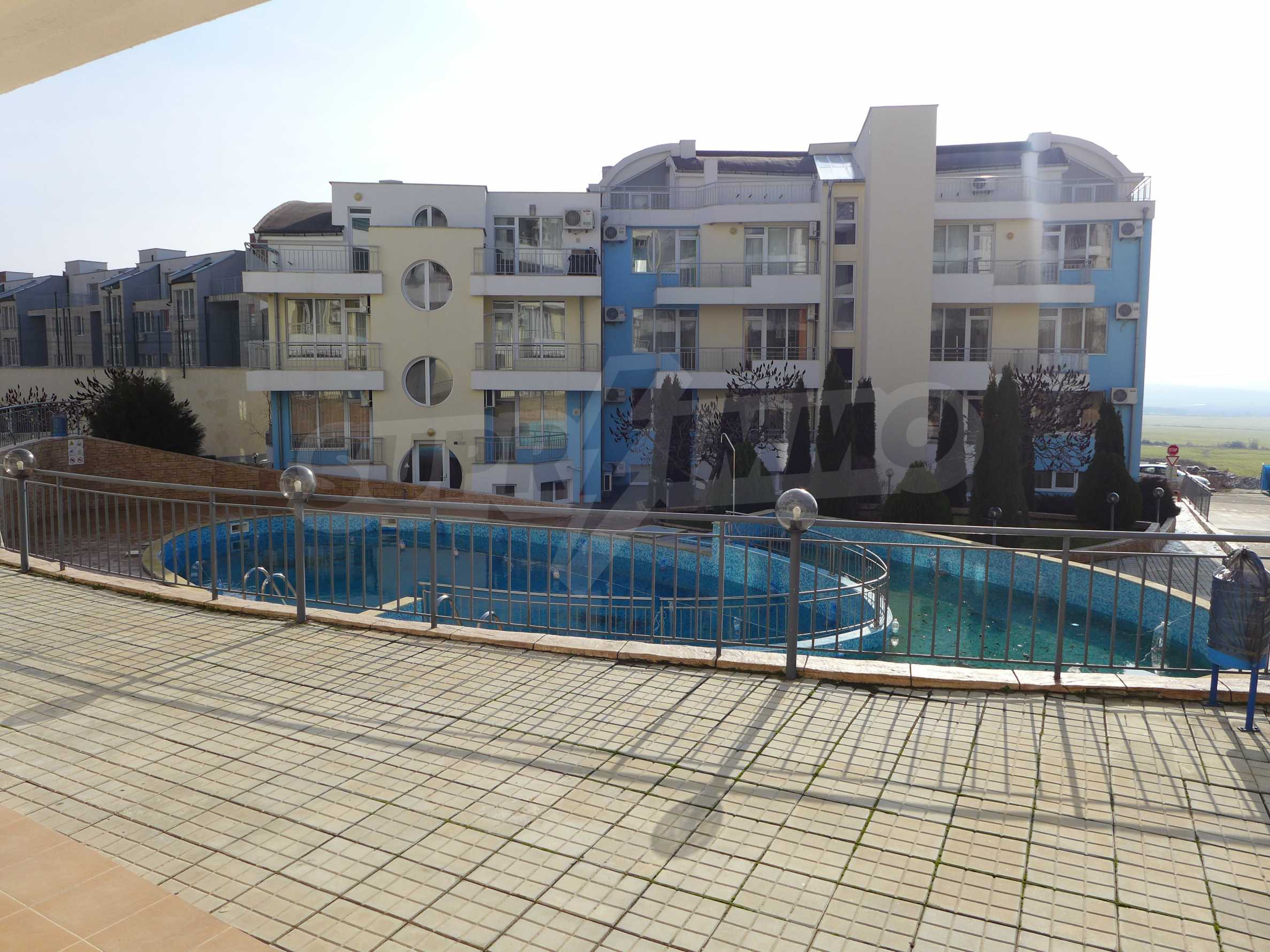 This one-bedroom apartment with an area of 60.66 sq.m. is finished with tiled flooring, comfortable furniture, equipped kitchenette and bathroom with WC, air conditioning for the heating and cooling. The modern home offers beautiful views of the swimming pool in the inner yard of the complex. The apartment has telephone, cable TV, internet. The annual maintenance fee is 9 euro per sq.m.