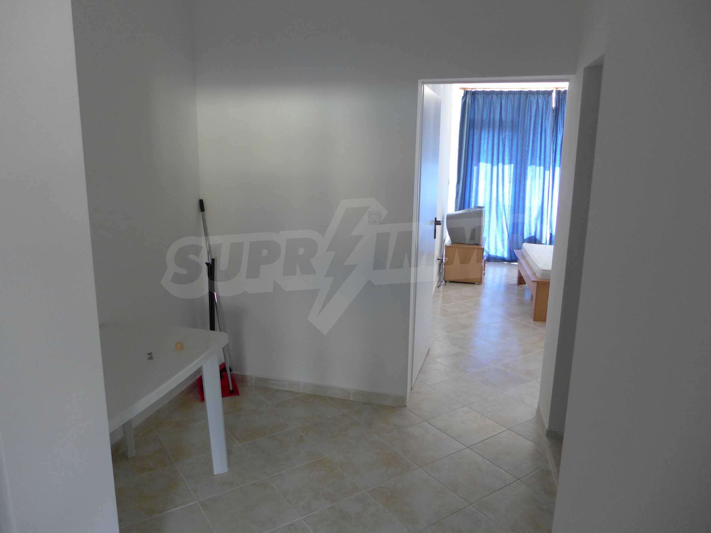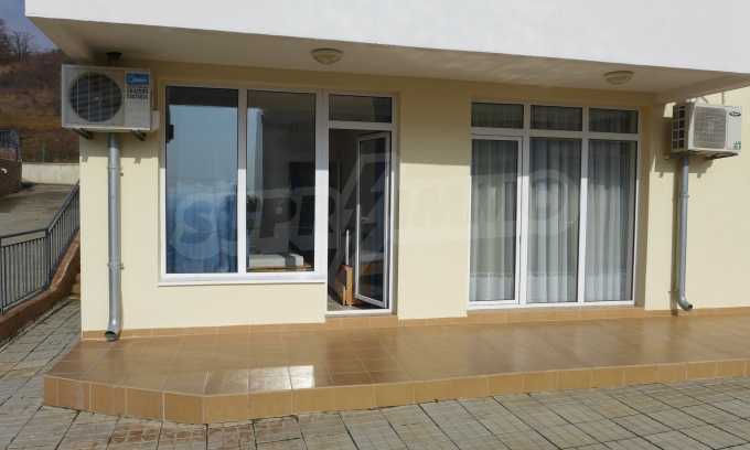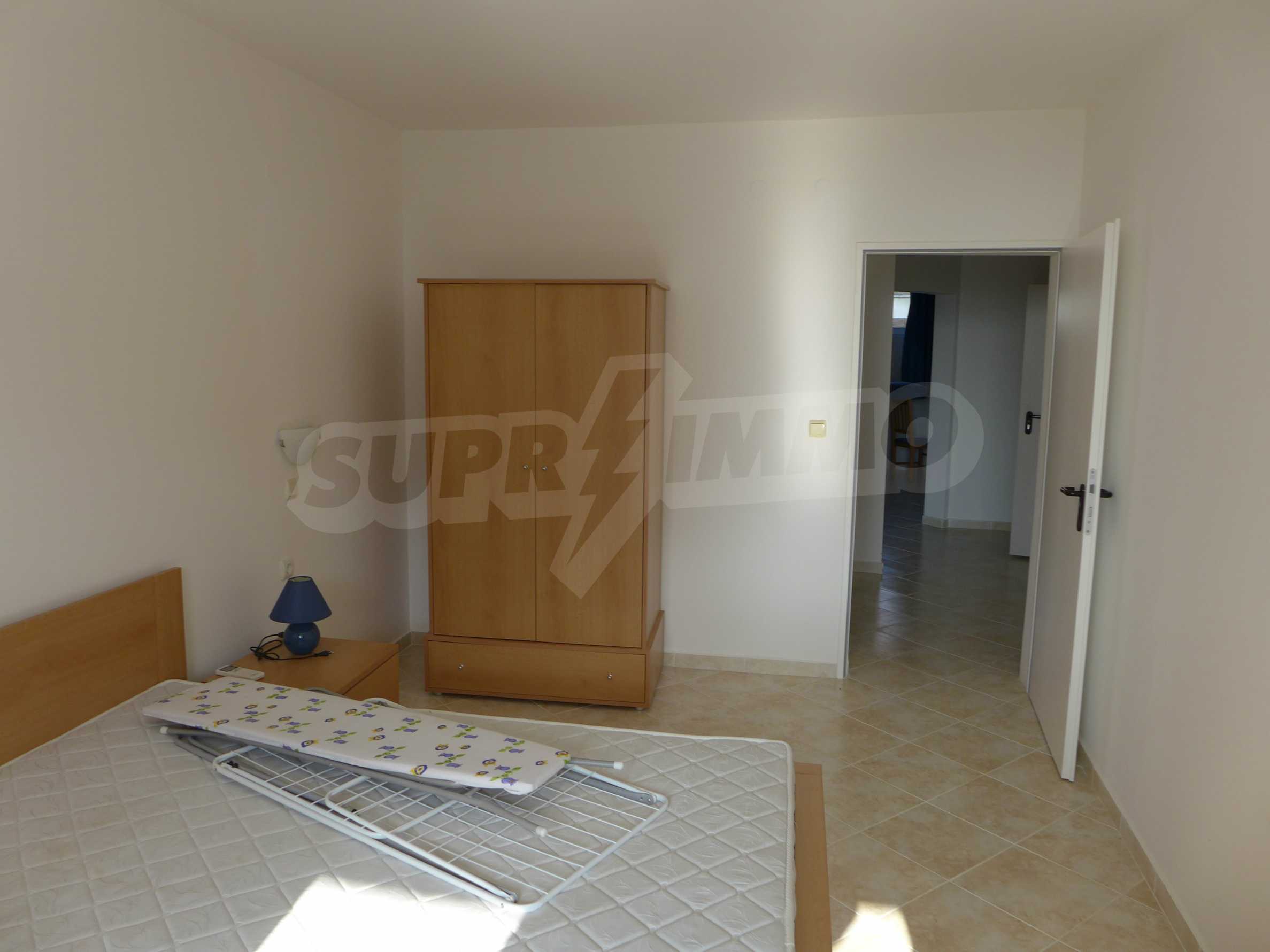 This one-bedroom apartment with an area of 60.66 sq.m. is finished with tiled flooring, comfortable furniture, equipped kitchenette and bathroom with WC, air conditioning for the heating and cooling. The modern home offers beautiful views of the swimming pool in the inner yard of the complex. The apartment has telephone, cable TV, internet. The annual maintenance fee is 9 euro per sq.m.
