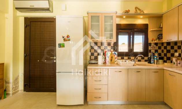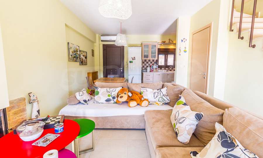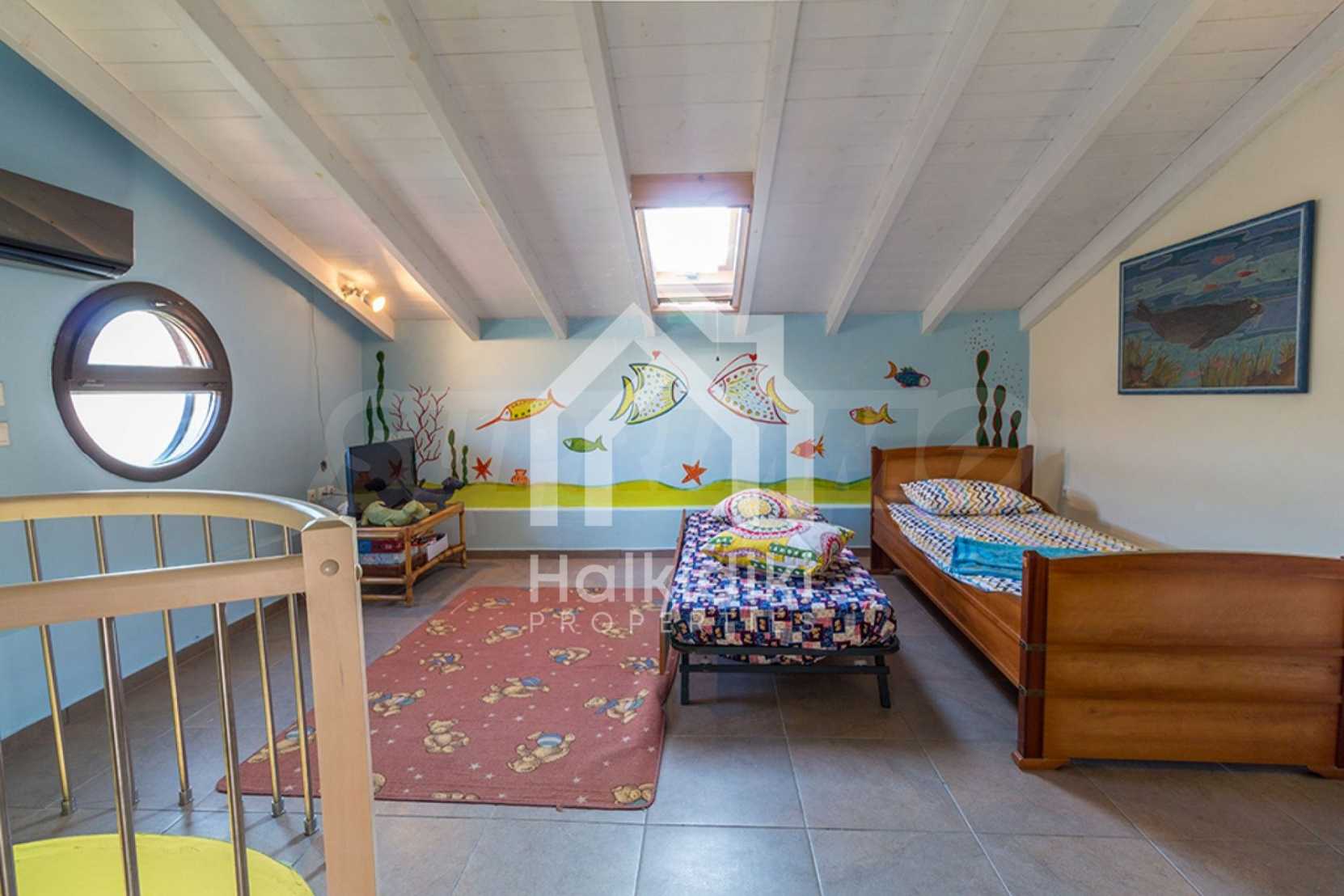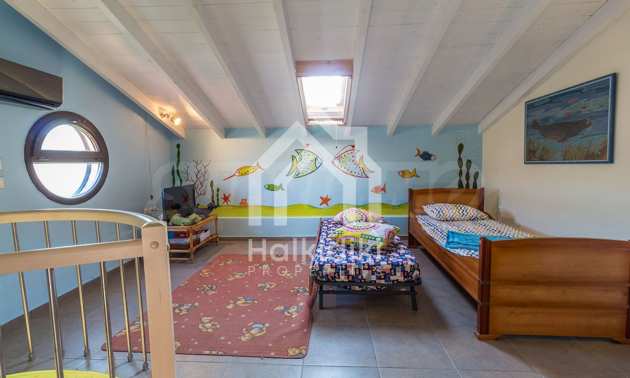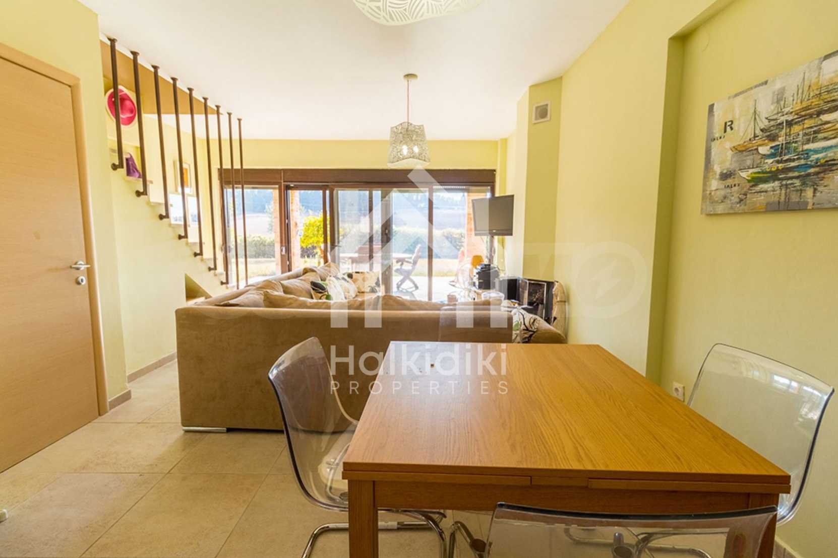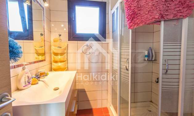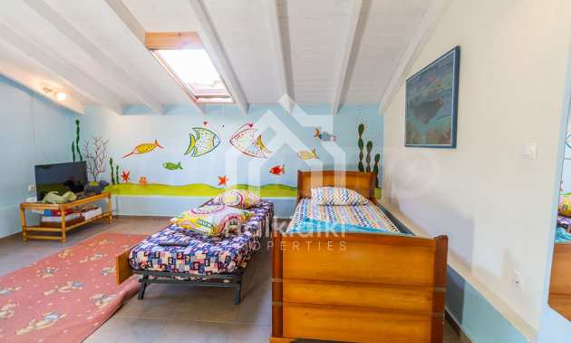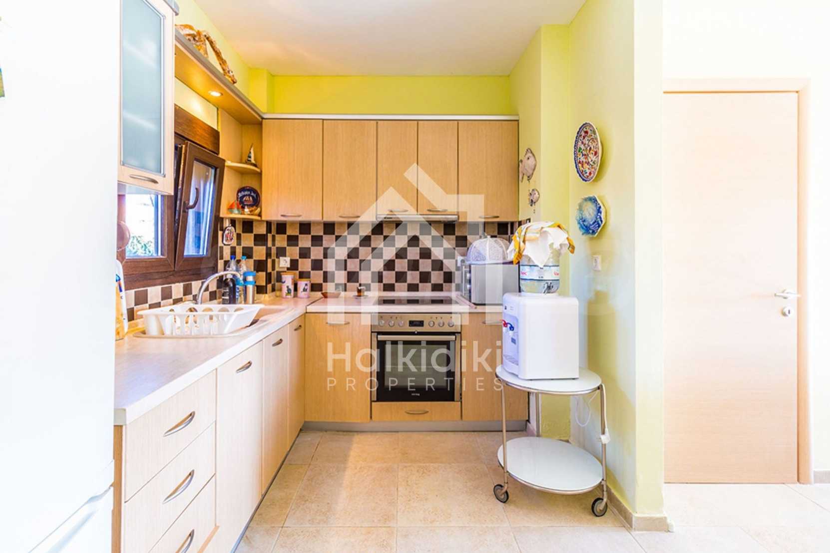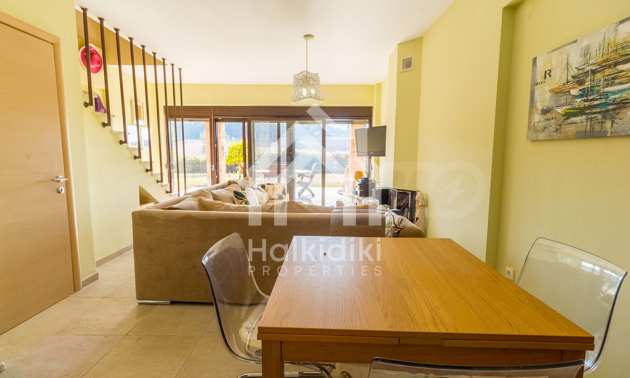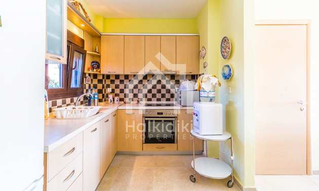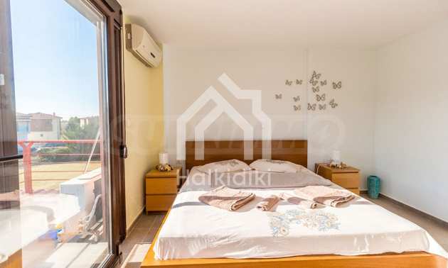 Newly built, three storey maisonette in Kassandra, Halkidki, 115 m2, with a large garden, swimming pool, gardener and parking spots. It has three bedrooms, a bathroom, a toilet, fireplace and a warehouse.