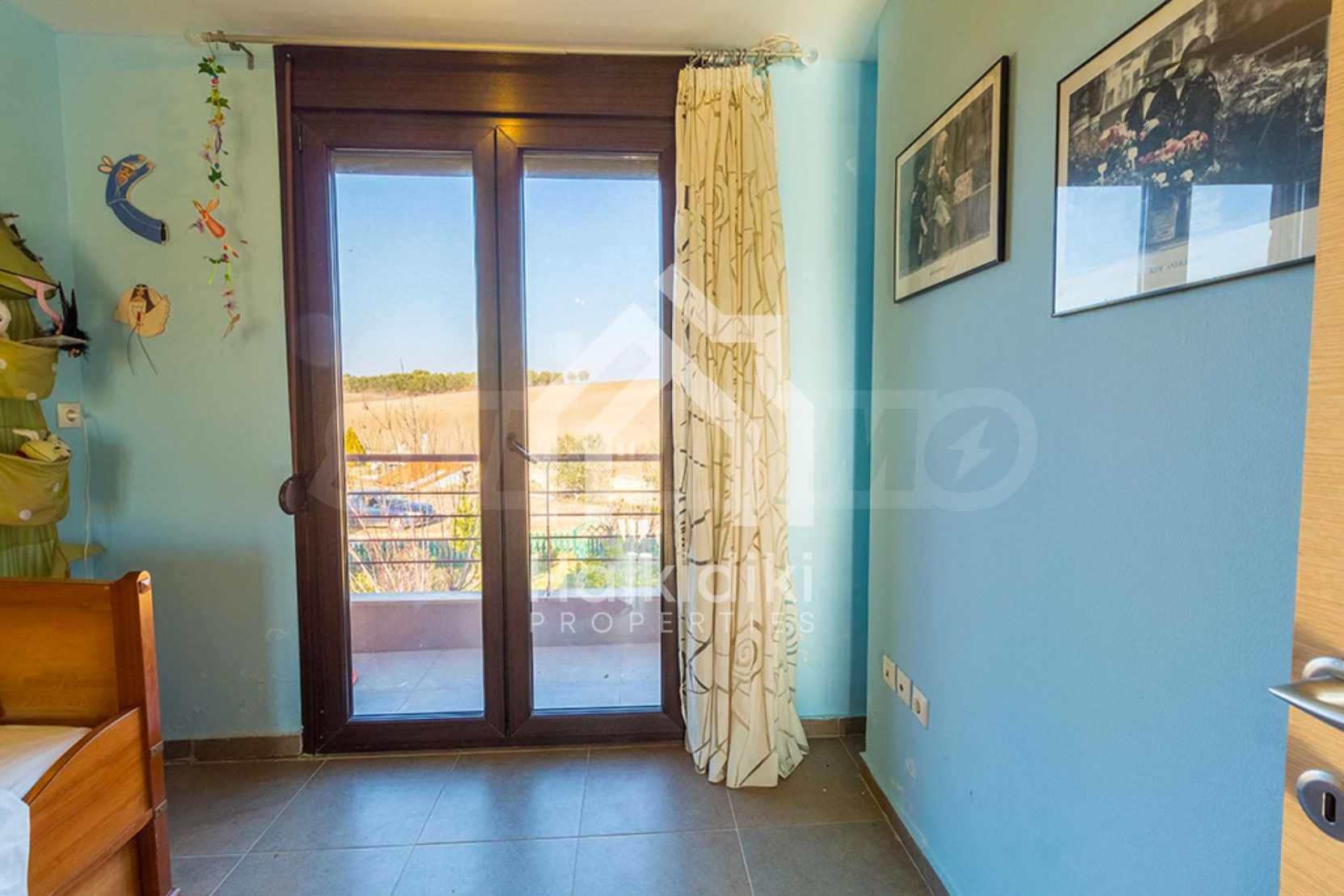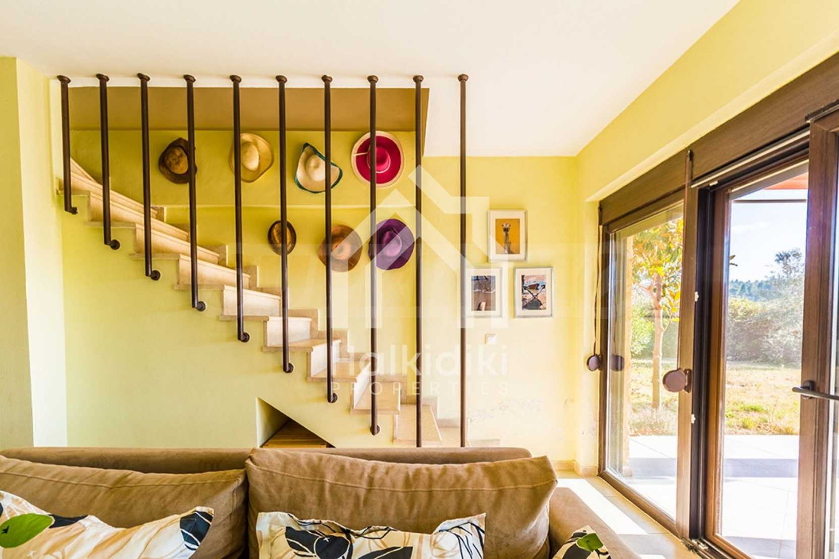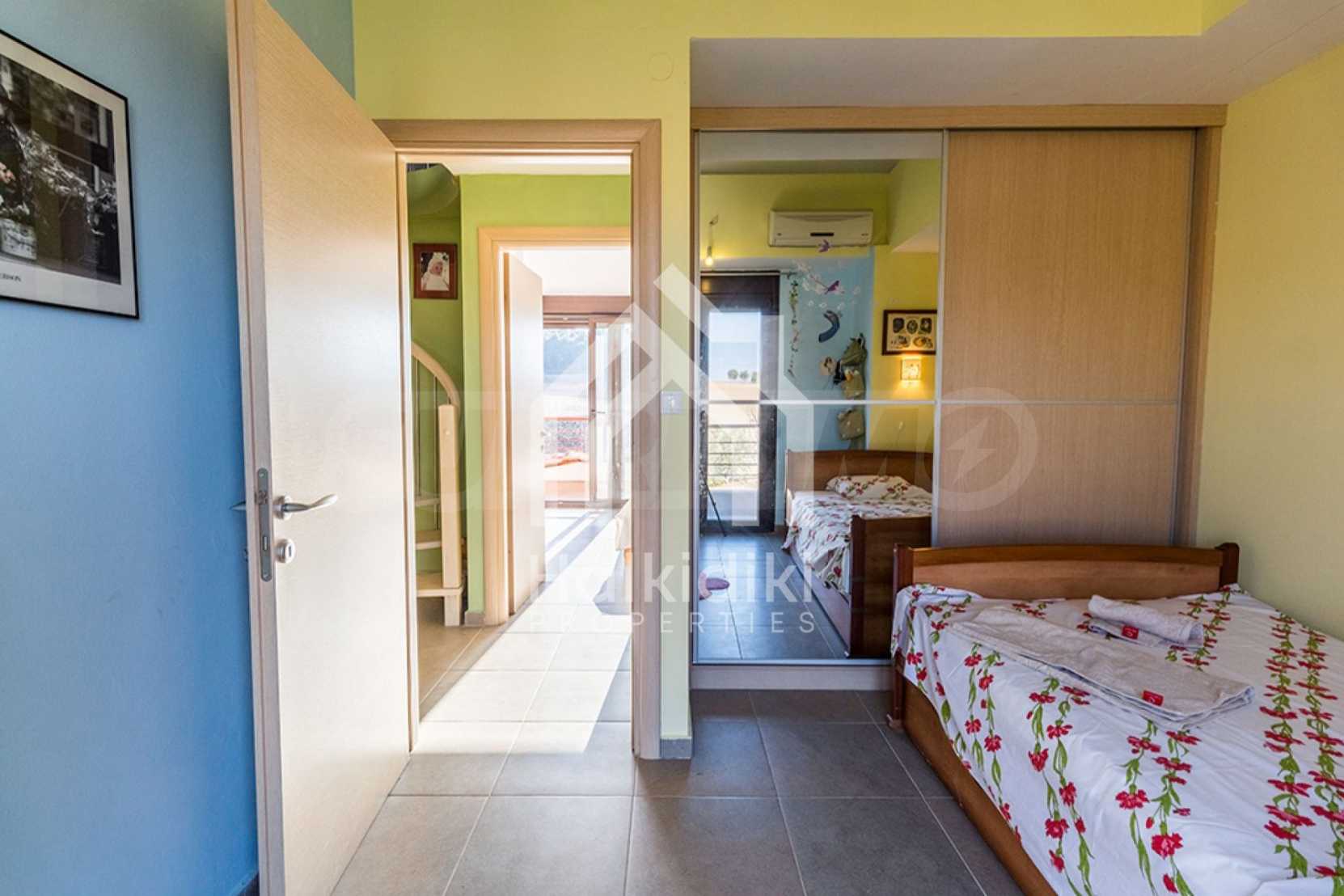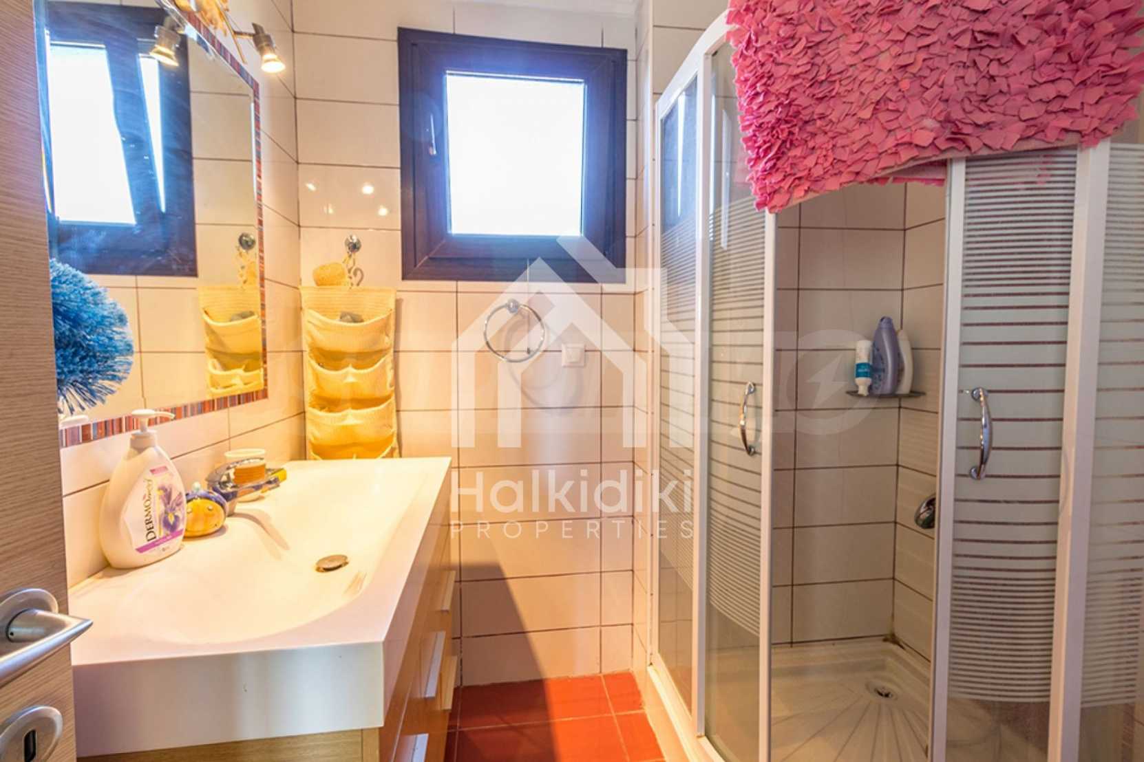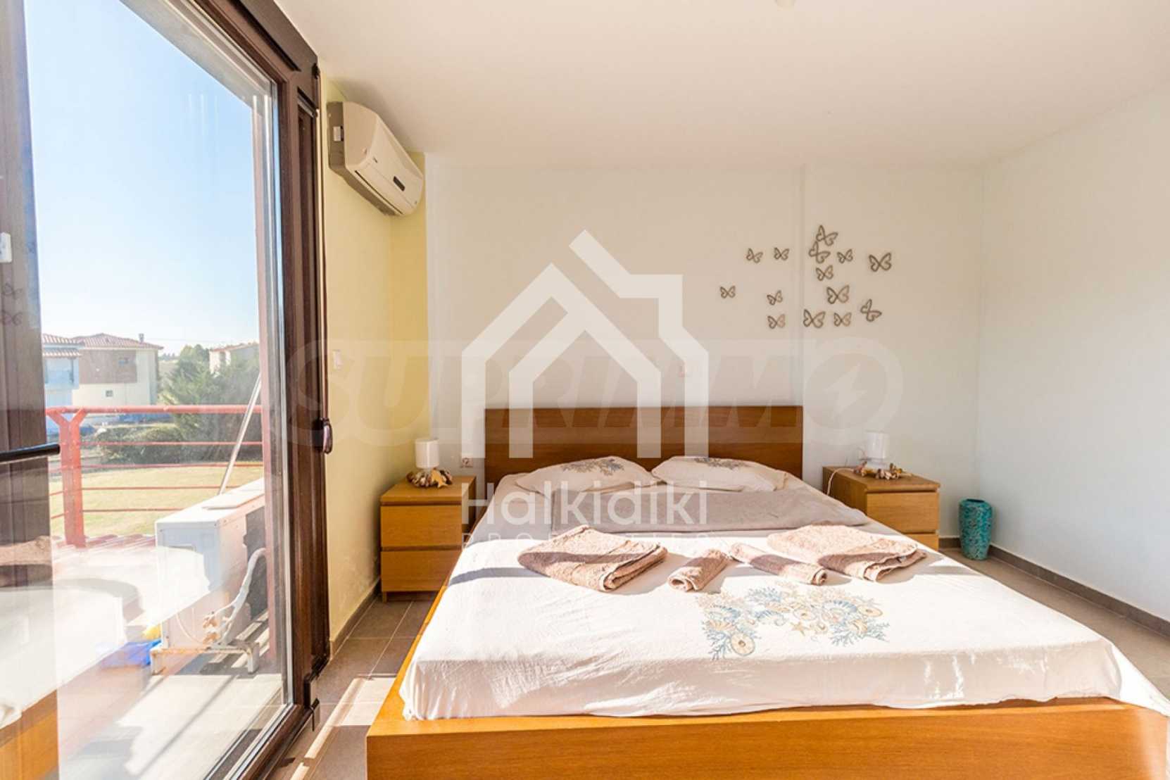 Newly built, three storey maisonette in Kassandra, Halkidki, 115 m2, with a large garden, swimming pool, gardener and parking spots. It has three bedrooms, a bathroom, a toilet, fireplace and a warehouse.