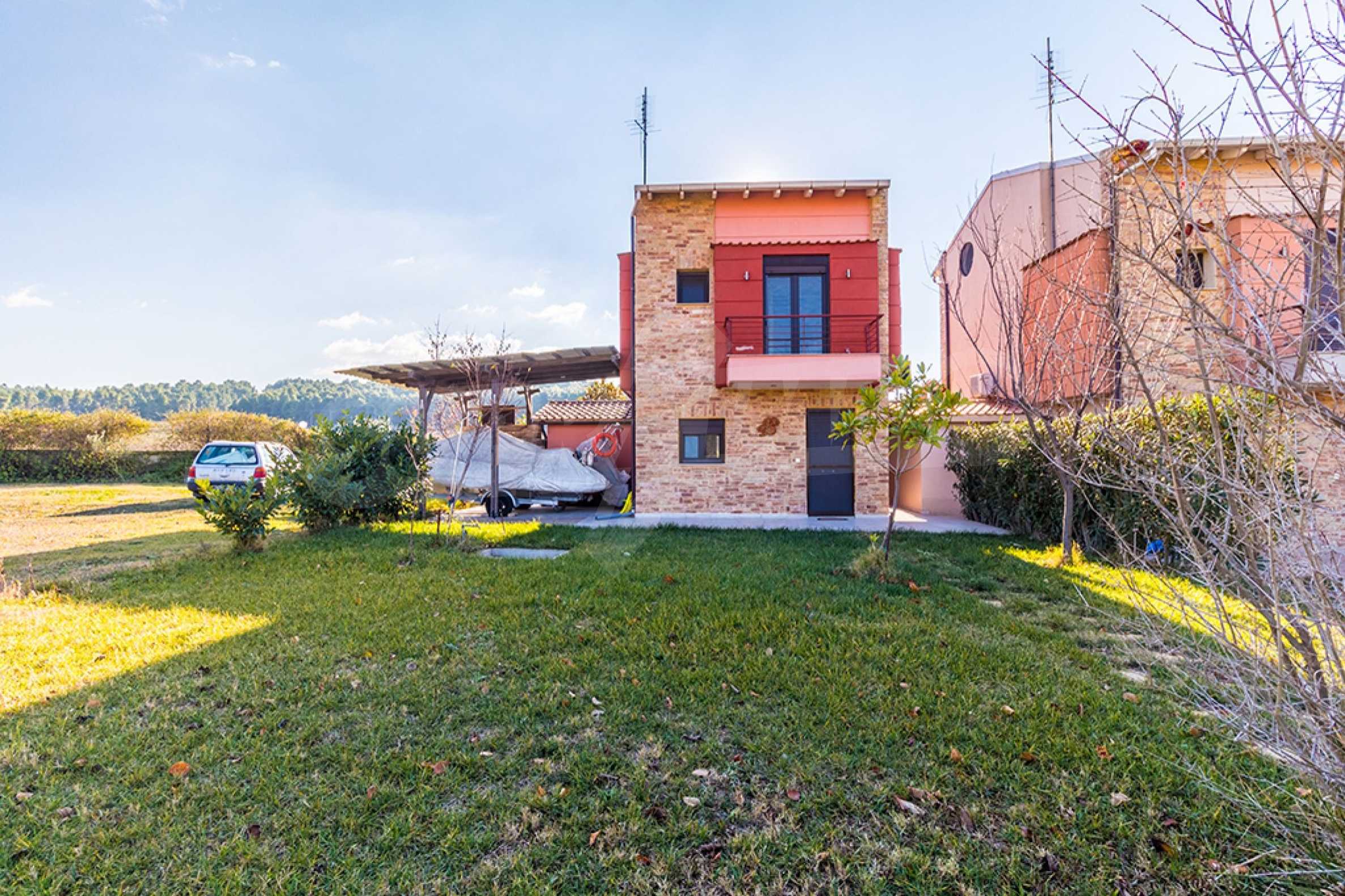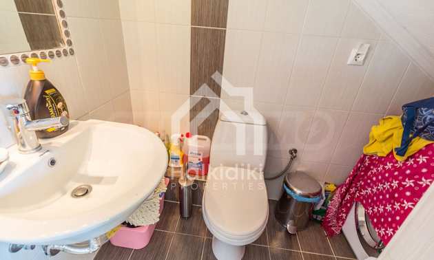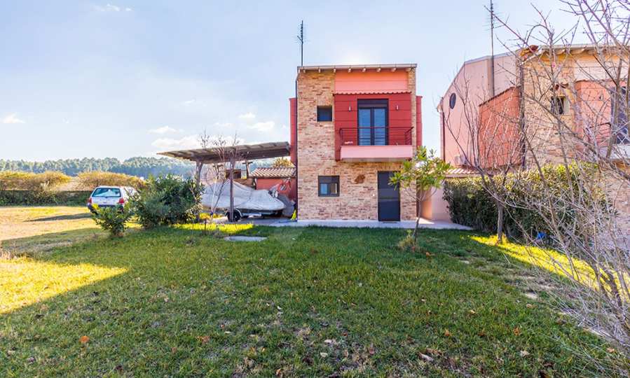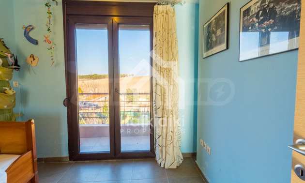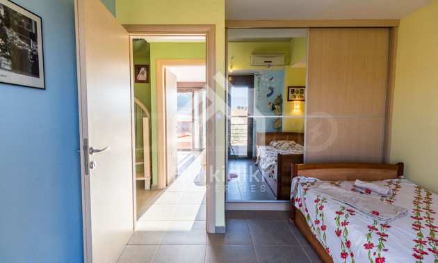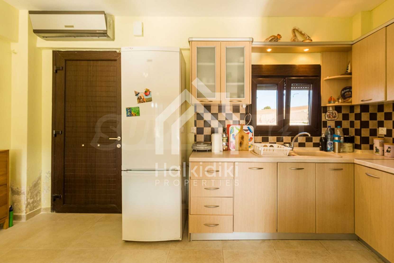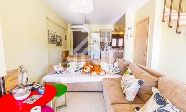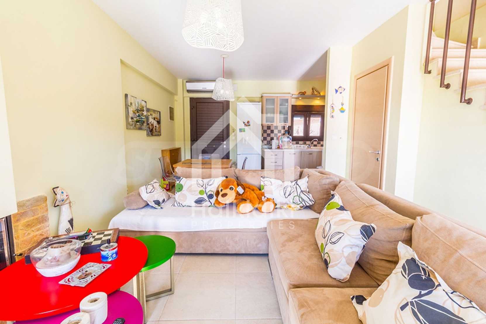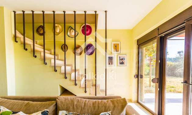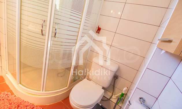 Newly built, three storey maisonette in Kassandra, Halkidki, 115 m2, with a large garden, swimming pool, gardener and parking spots. It has three bedrooms, a bathroom, a toilet, fireplace and a warehouse.