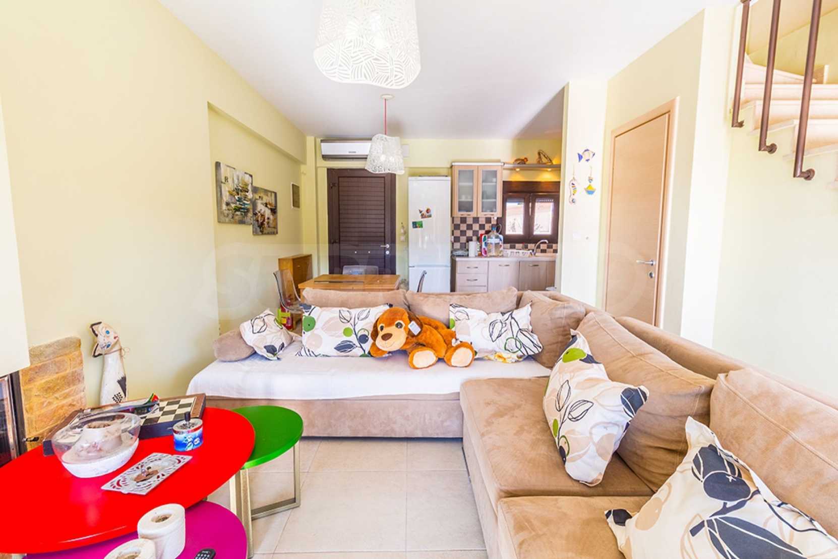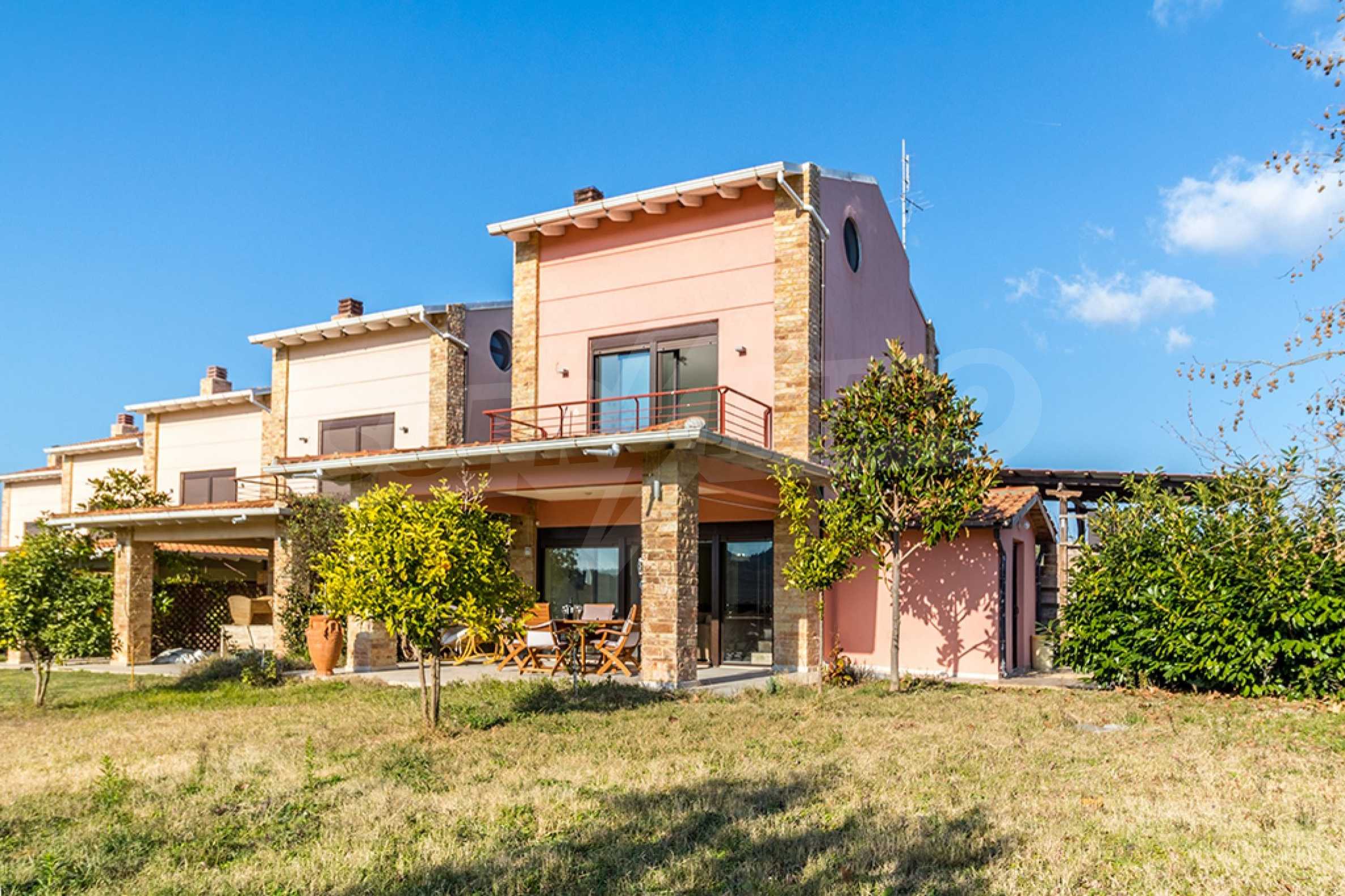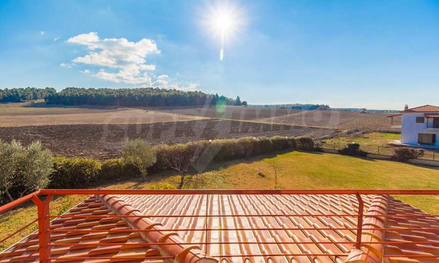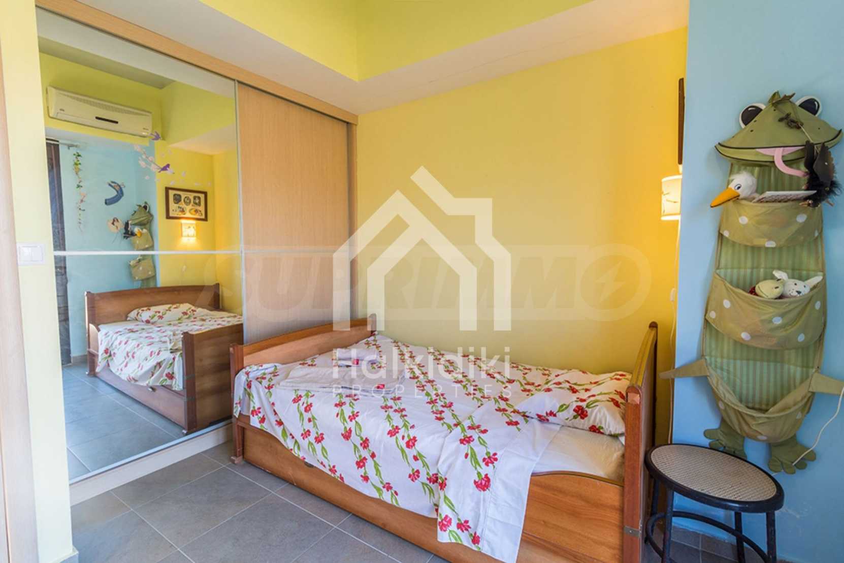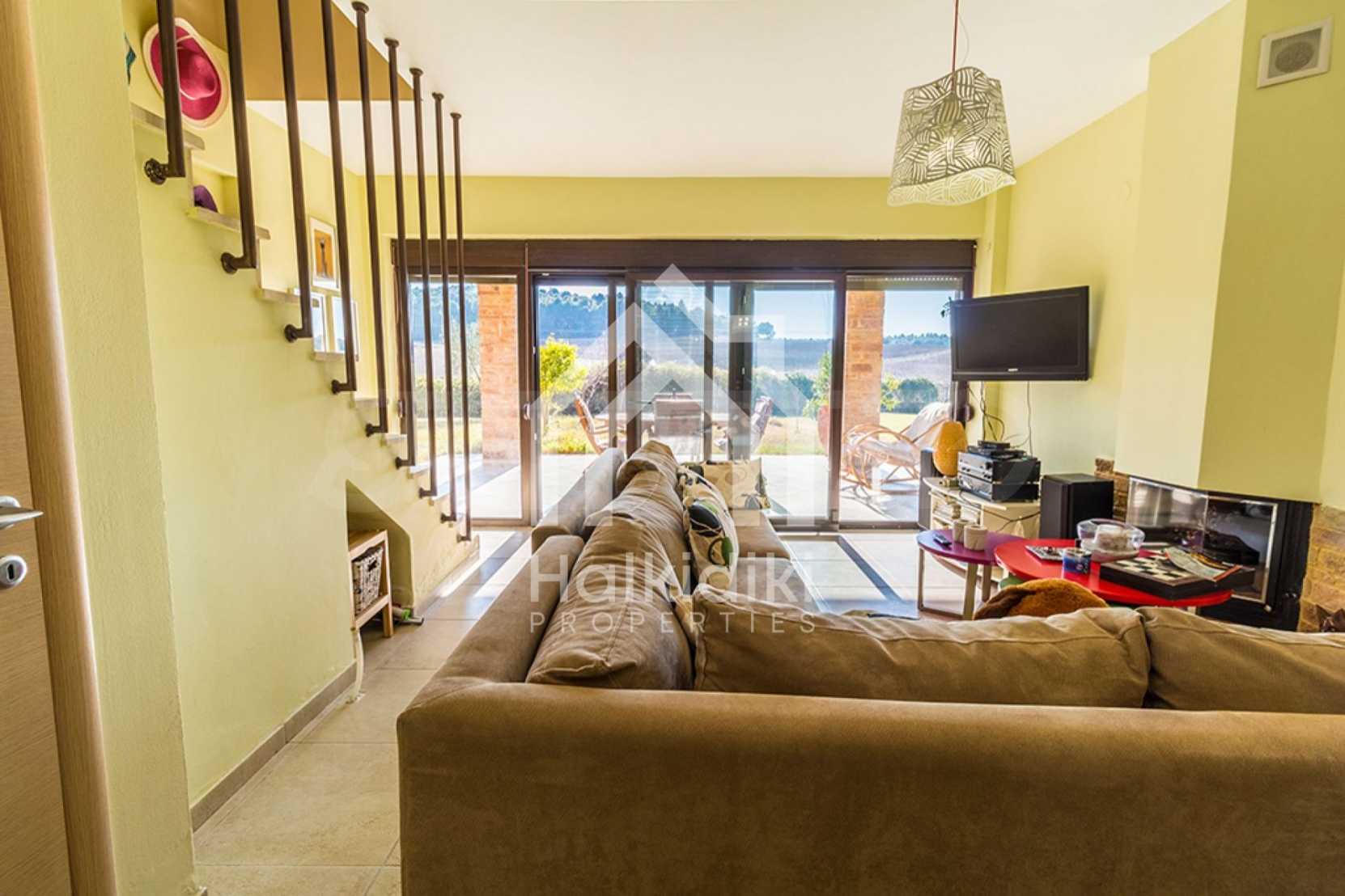Newly built, three storey maisonette in Kassandra, Halkidki, 115 m2, with a large garden, swimming pool, gardener and parking spots. It has three bedrooms, a bathroom, a toilet, fireplace and a warehouse.