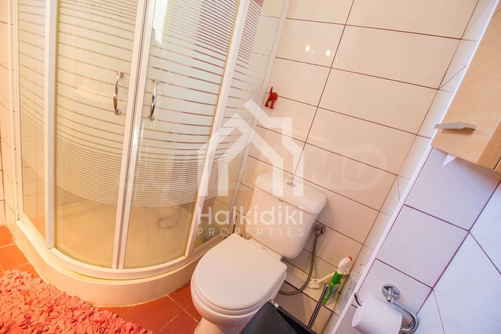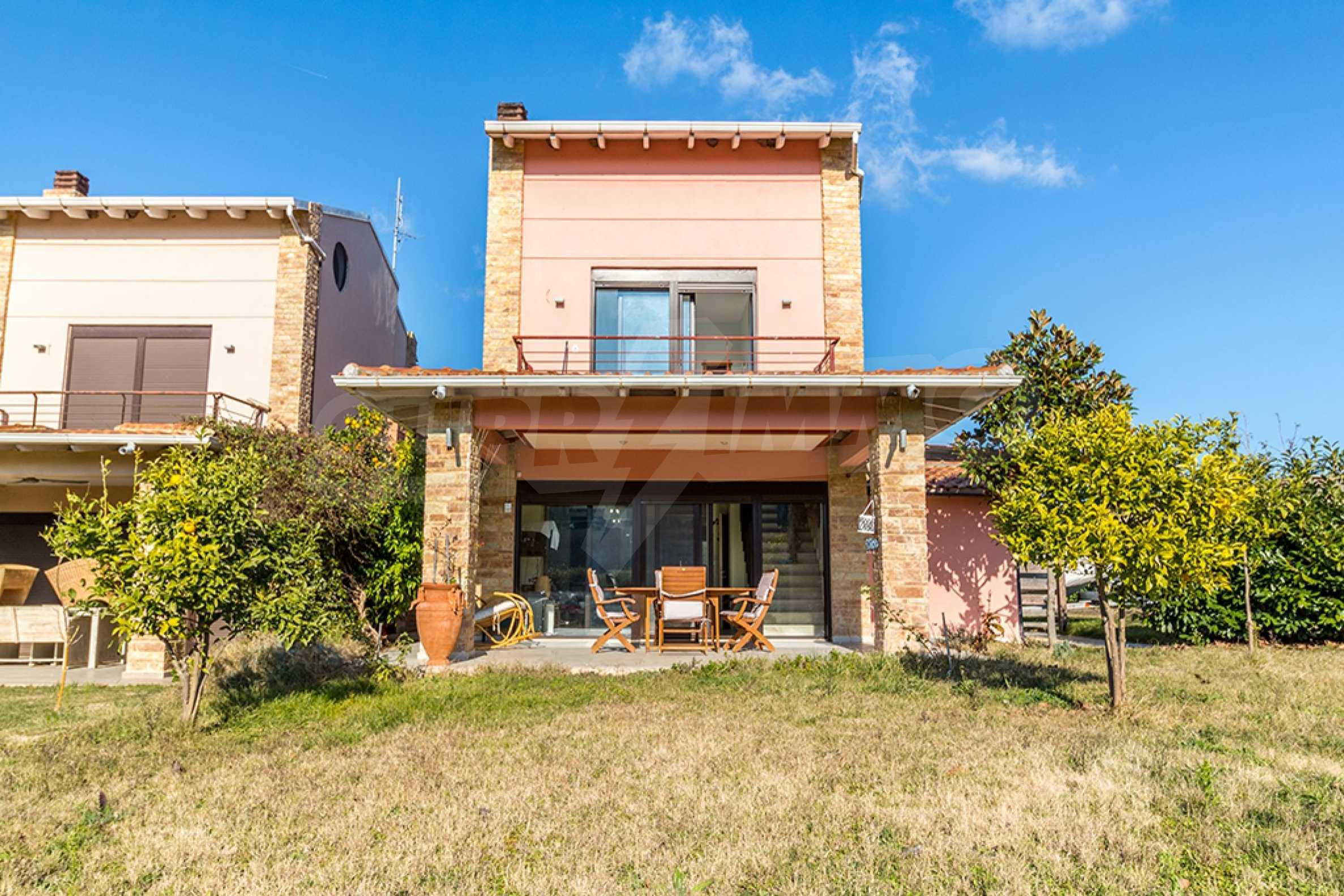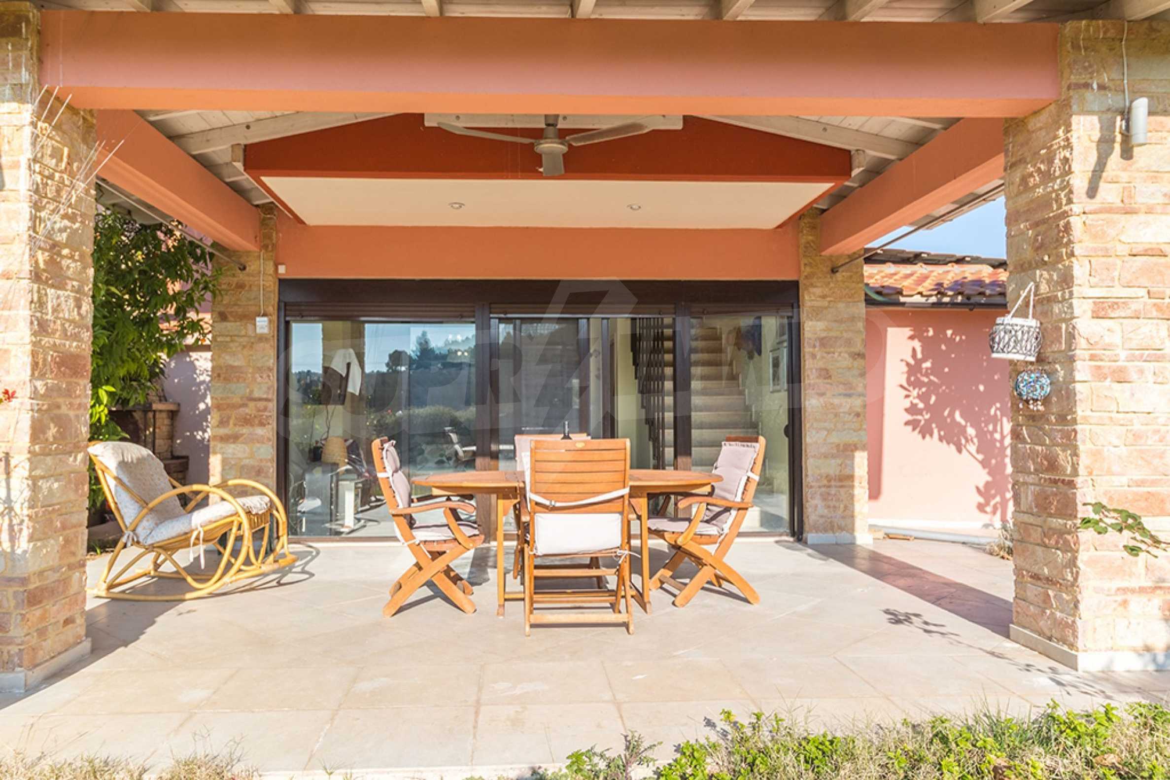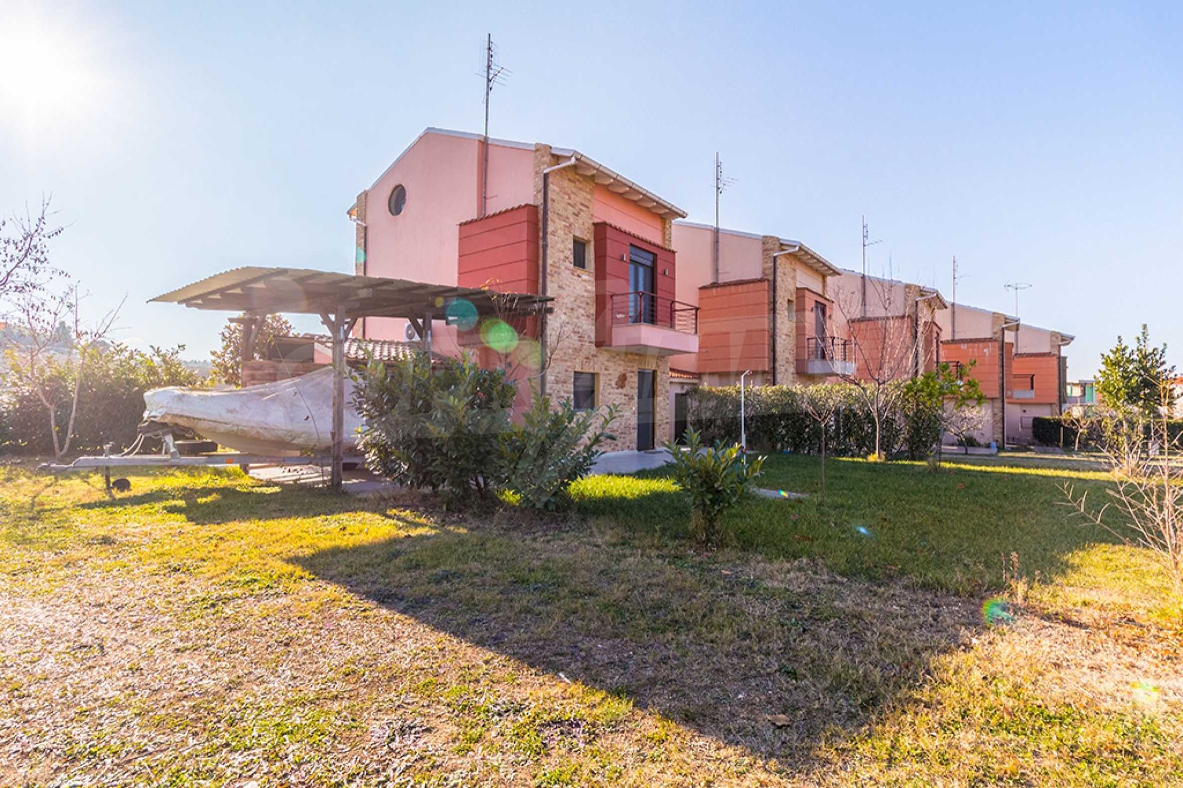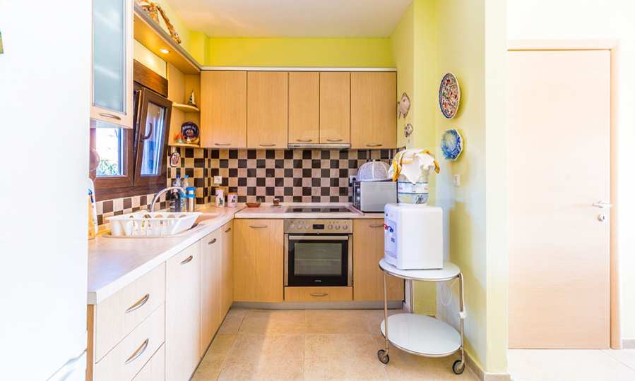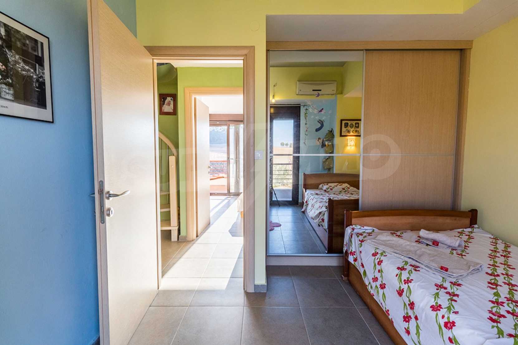 Newly built, three storey maisonette in Kassandra, Halkidki, 115 m2, with a large garden, swimming pool, gardener and parking spots. It has three bedrooms, a bathroom, a toilet, fireplace and a warehouse.