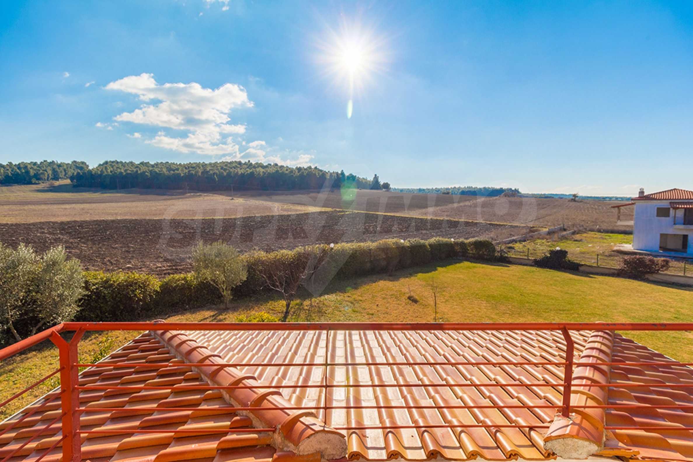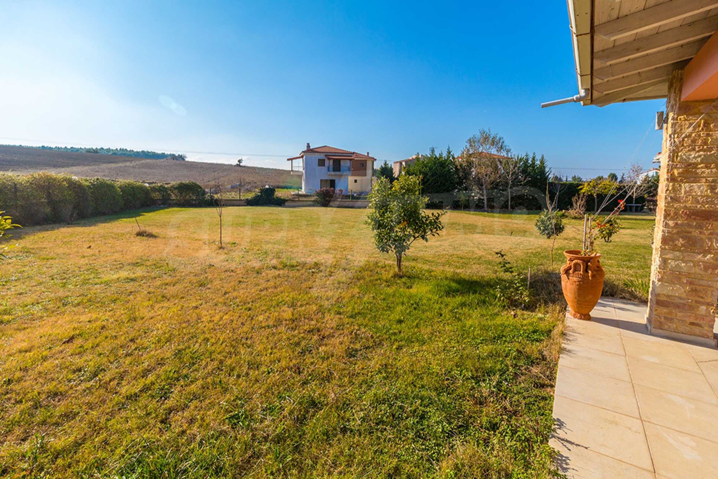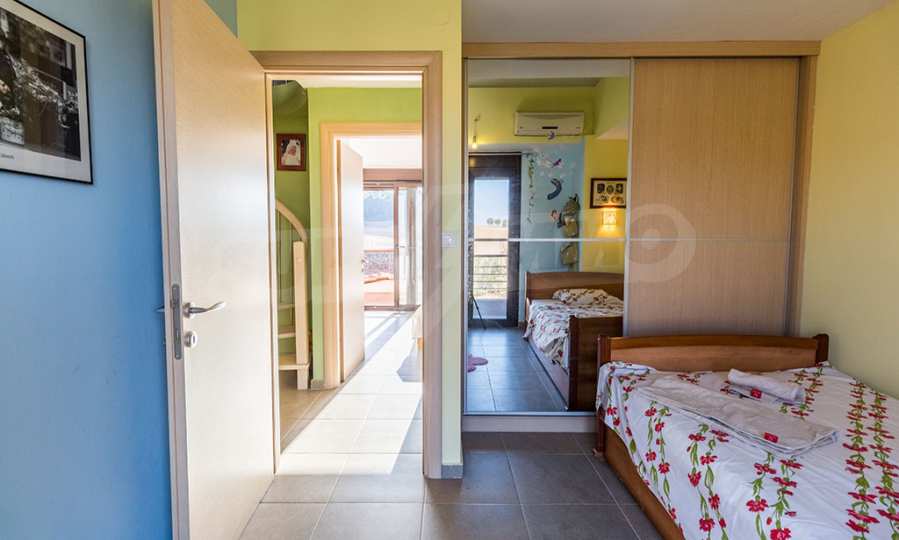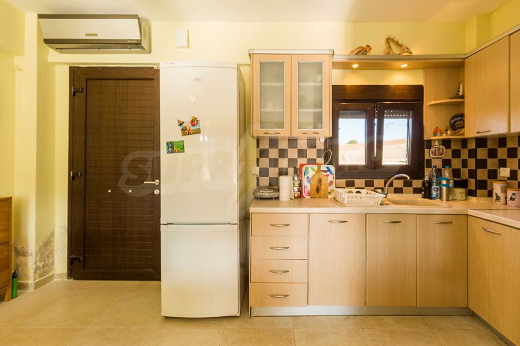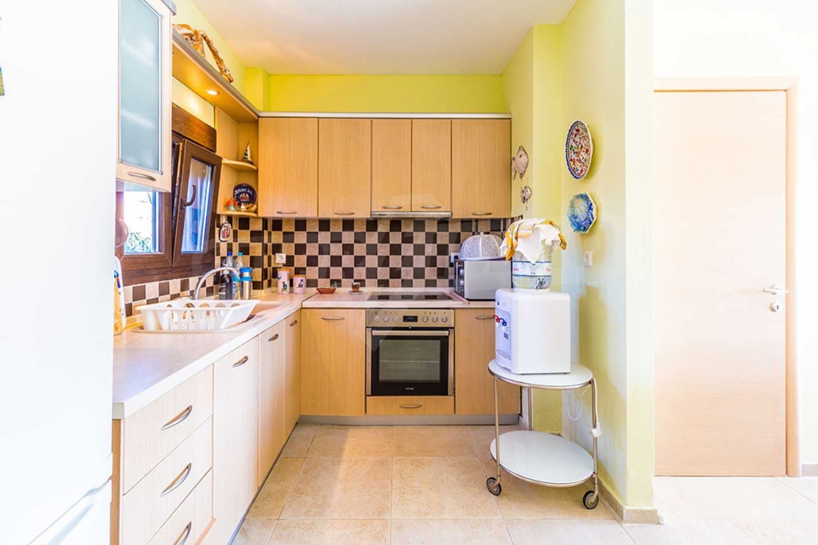 Newly built, three storey maisonette in Kassandra, Halkidki, 115 m2, with a large garden, swimming pool, gardener and parking spots. It has three bedrooms, a bathroom, a toilet, fireplace and a warehouse.