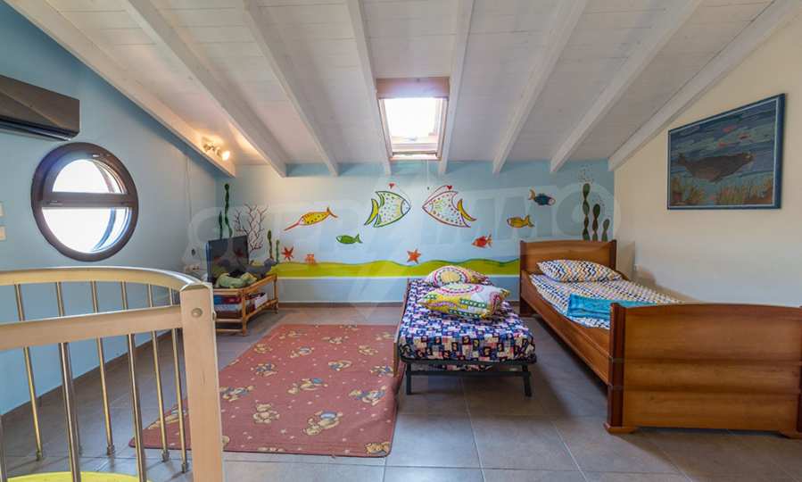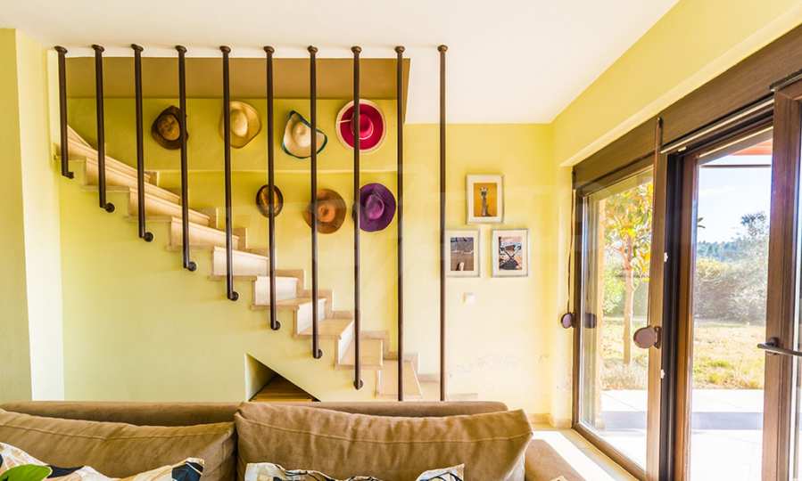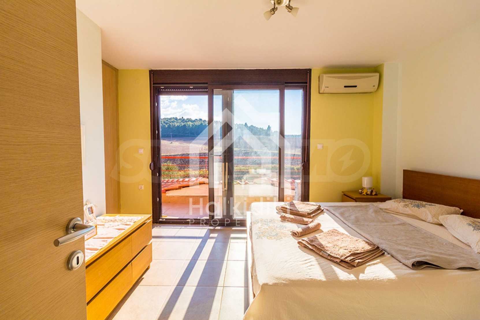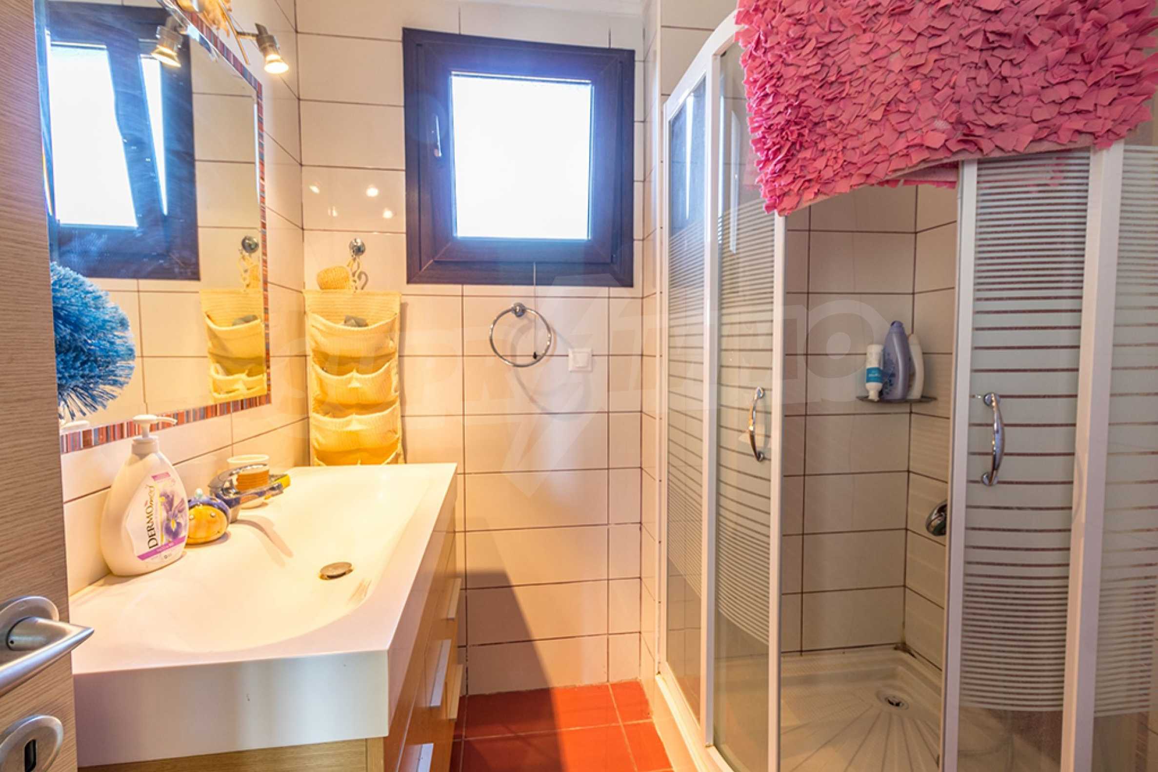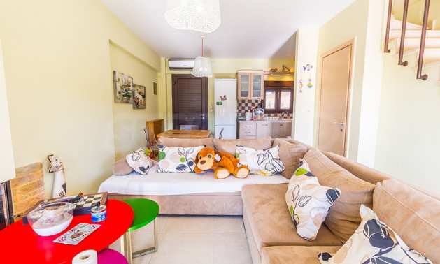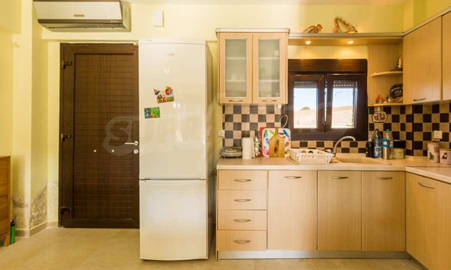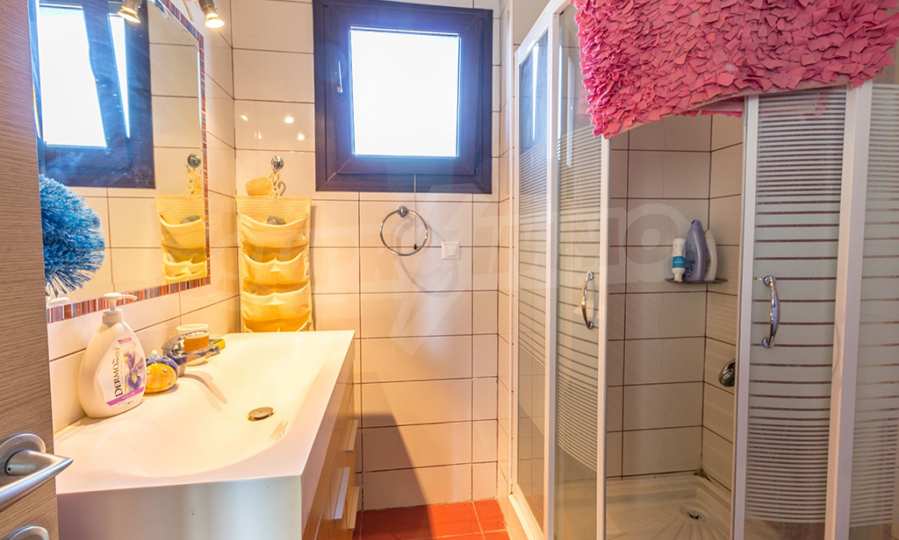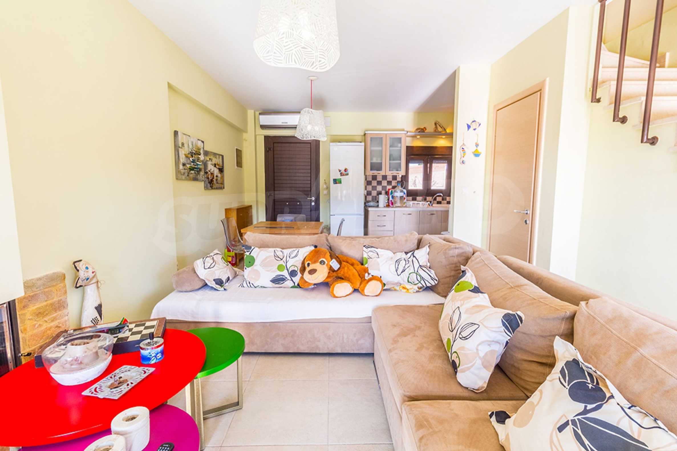 Newly built, three storey maisonette in Kassandra, Halkidki, 115 m2, with a large garden, swimming pool, gardener and parking spots. It has three bedrooms, a bathroom, a toilet, fireplace and a warehouse.