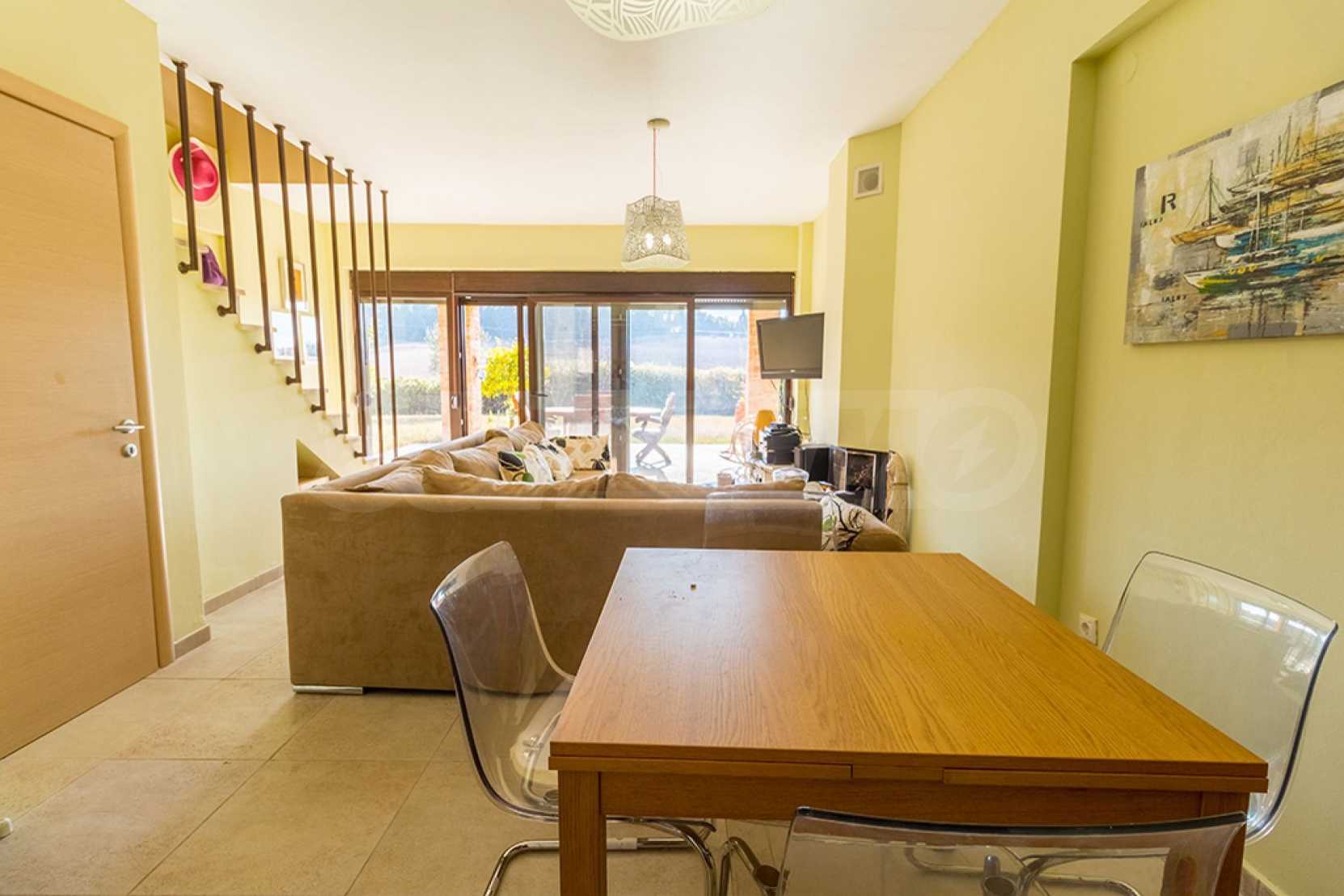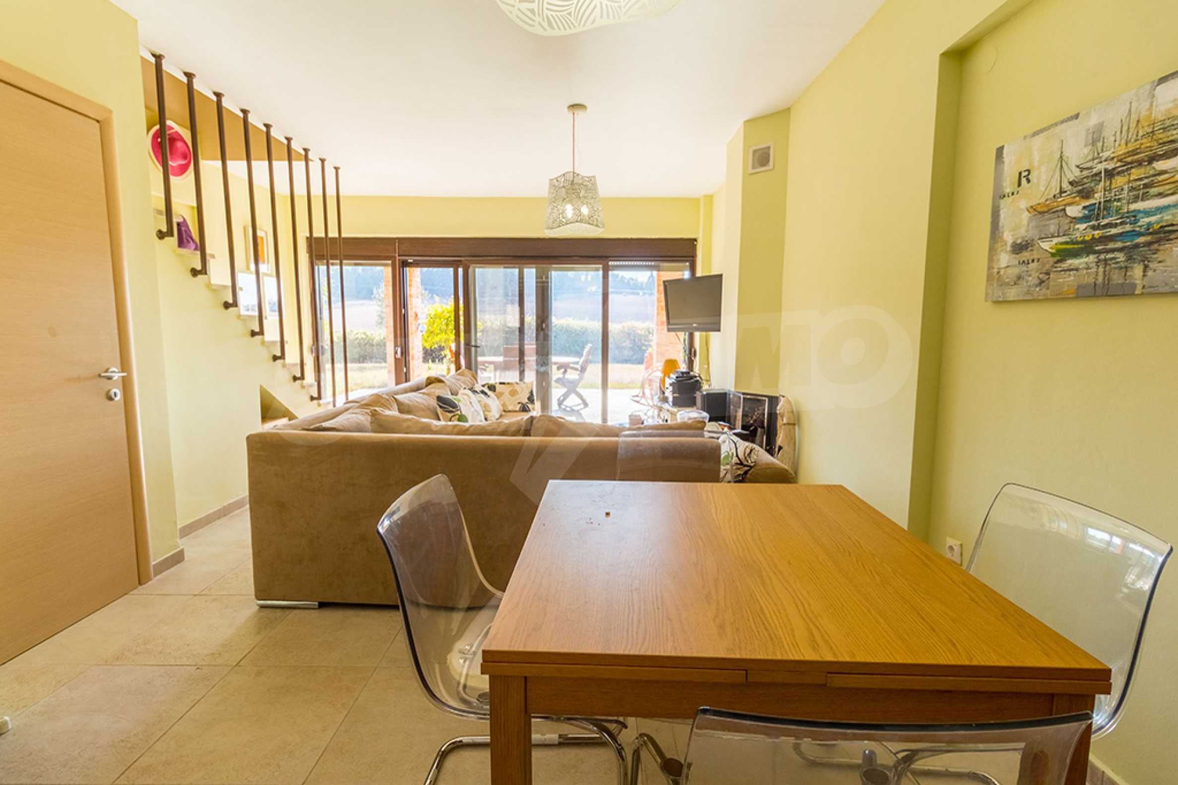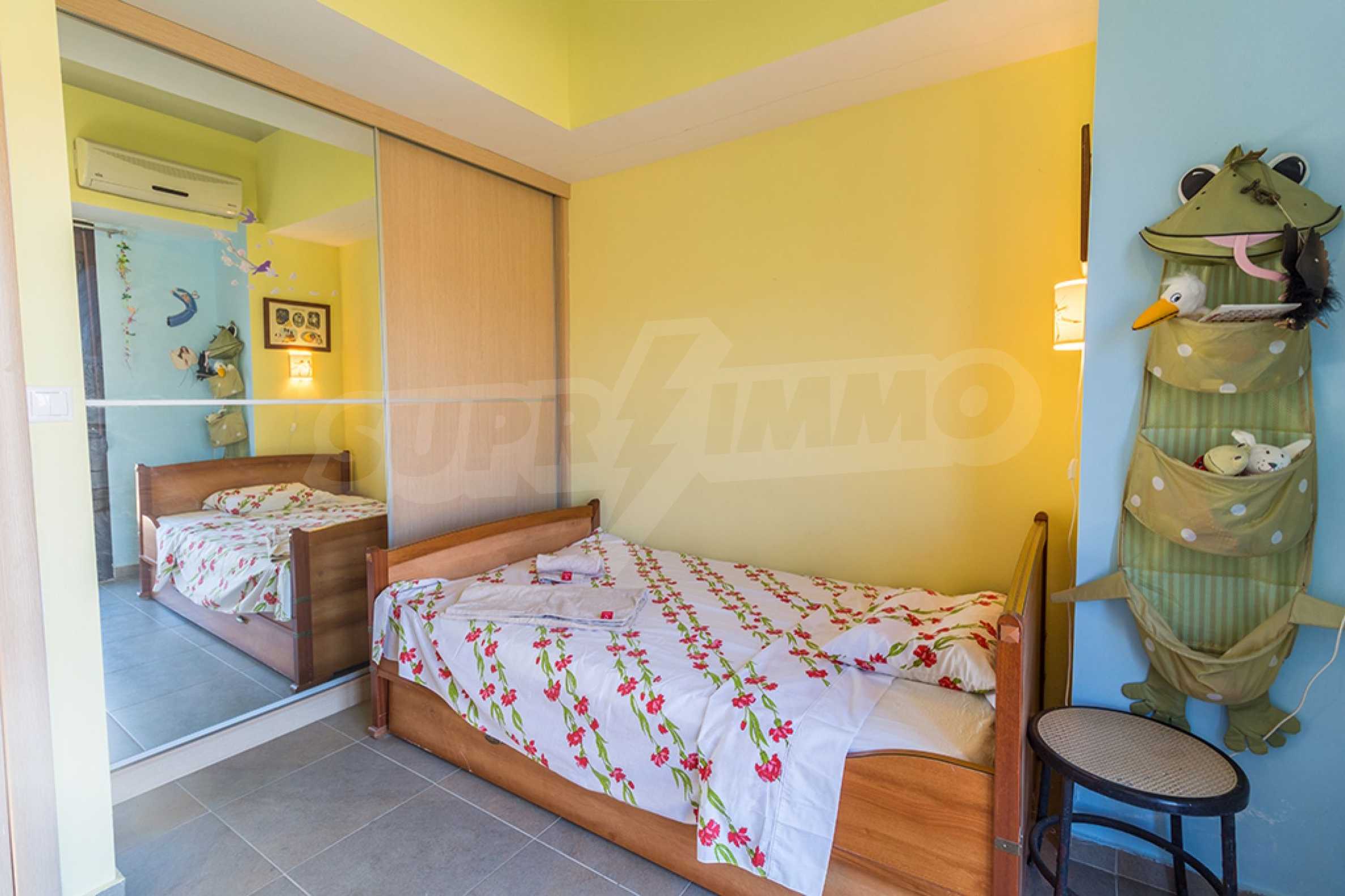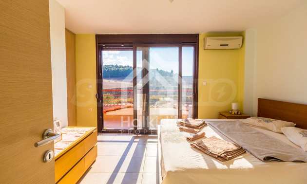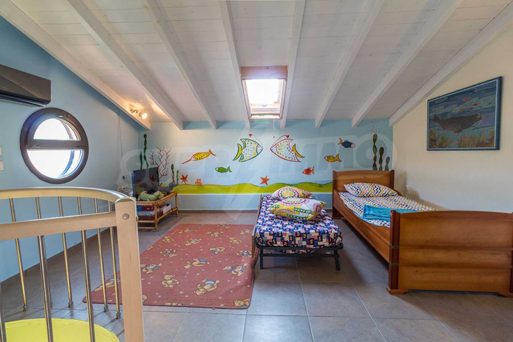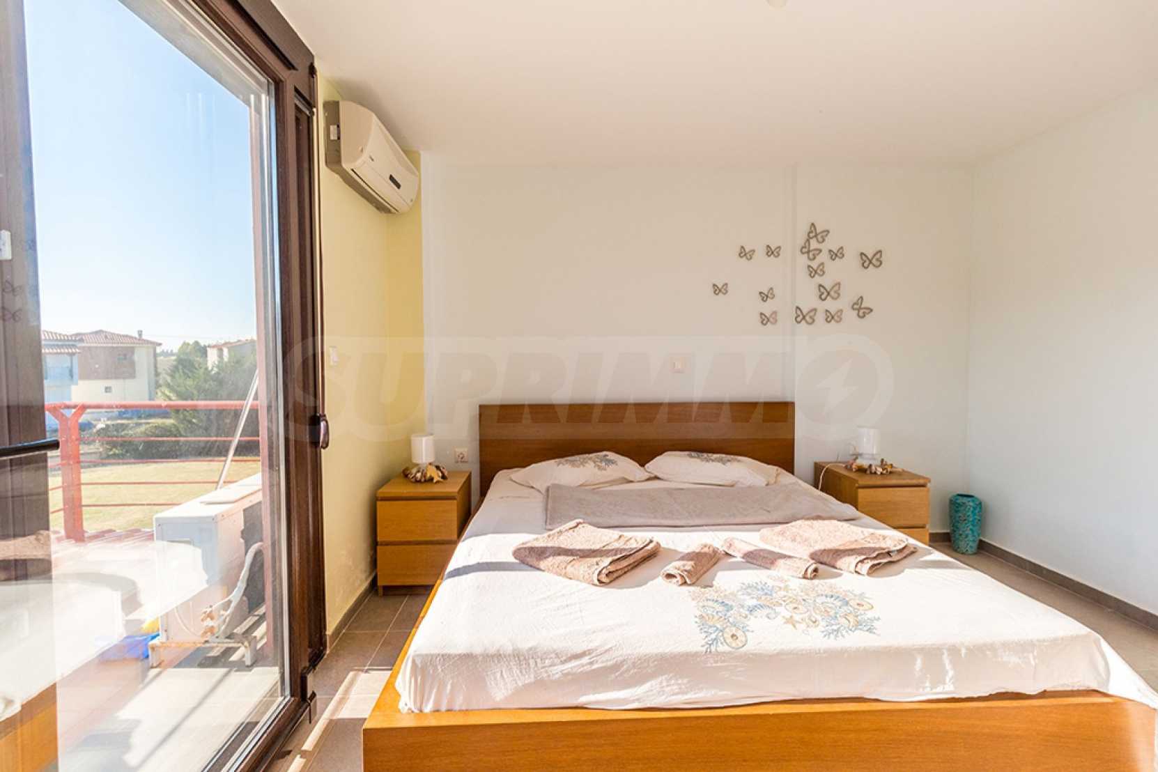 Newly built, three storey maisonette in Kassandra, Halkidki, 115 m2, with a large garden, swimming pool, gardener and parking spots. It has three bedrooms, a bathroom, a toilet, fireplace and a warehouse.