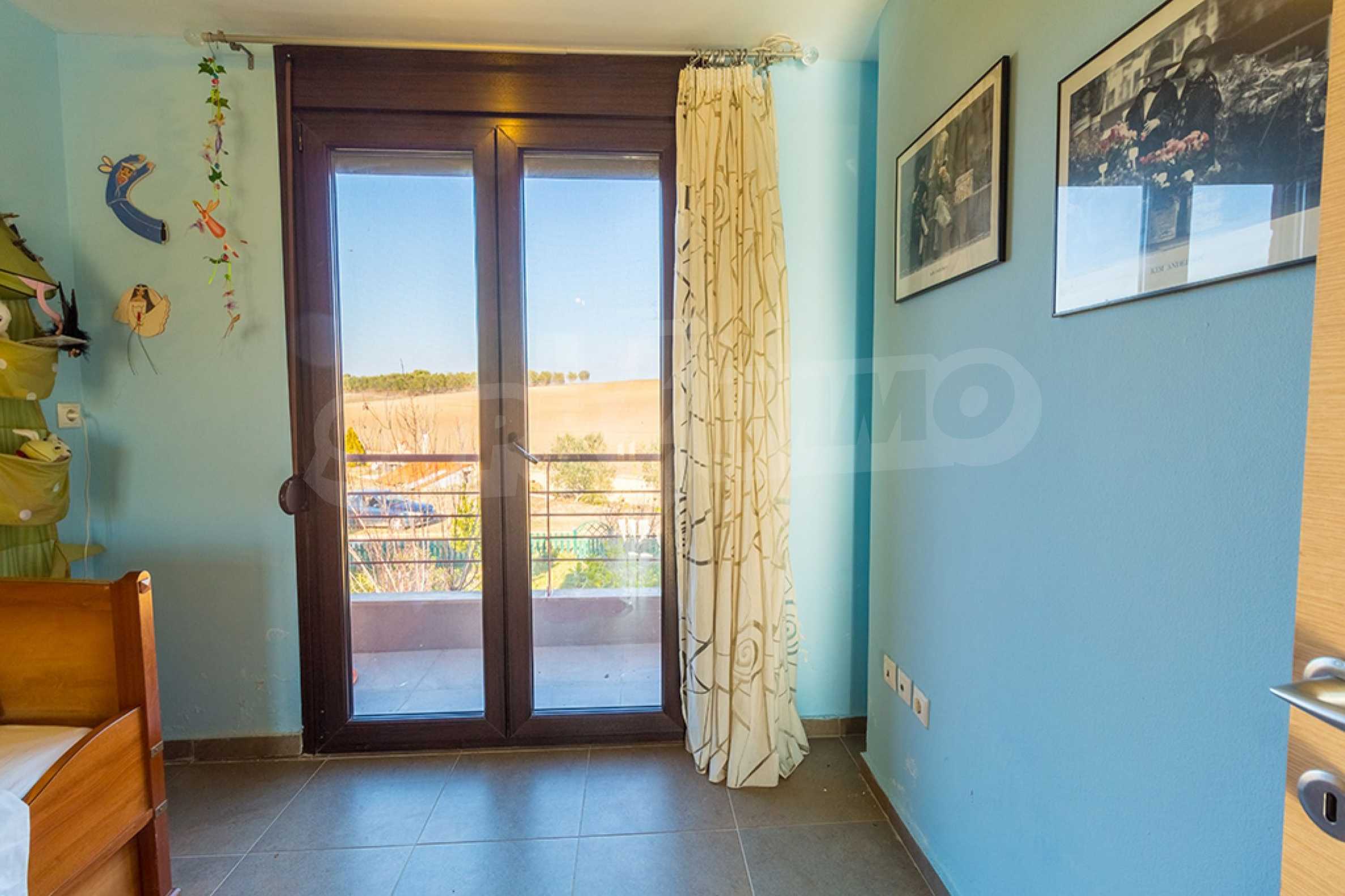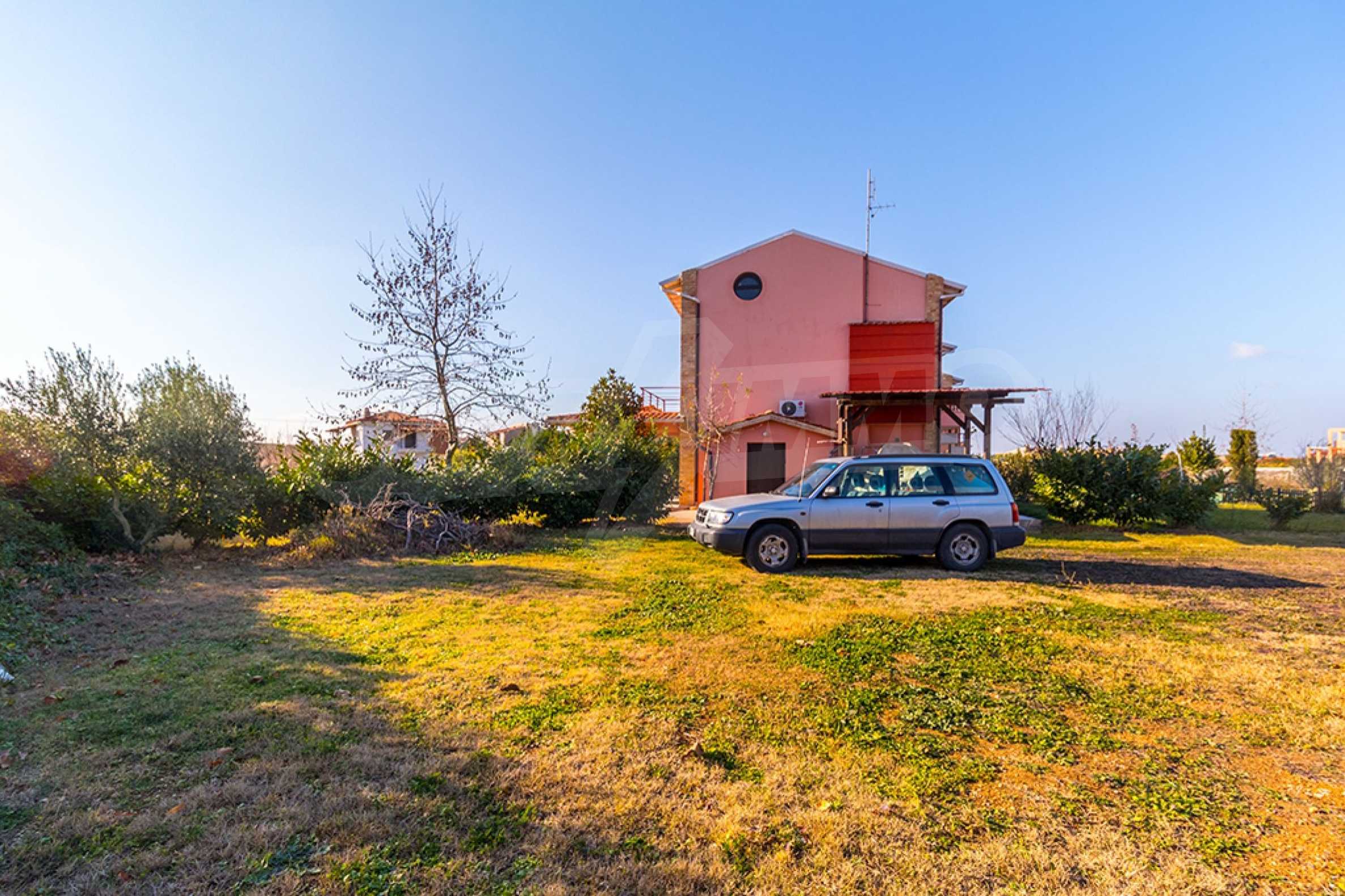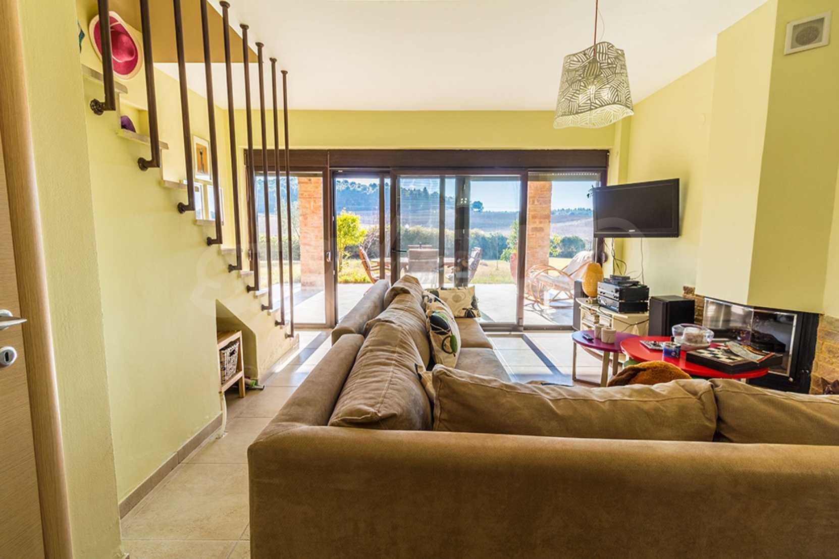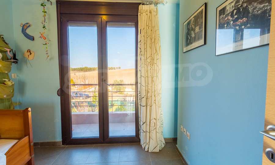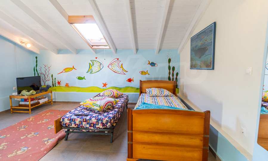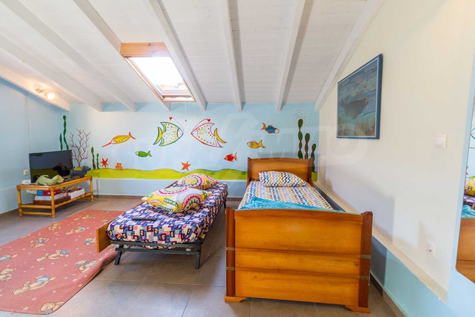 Newly built, three storey maisonette in Kassandra, Halkidki, 115 m2, with a large garden, swimming pool, gardener and parking spots. It has three bedrooms, a bathroom, a toilet, fireplace and a warehouse.