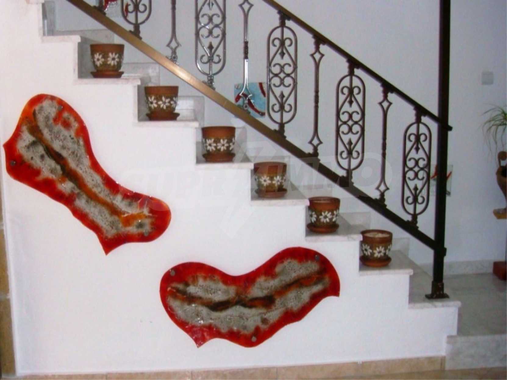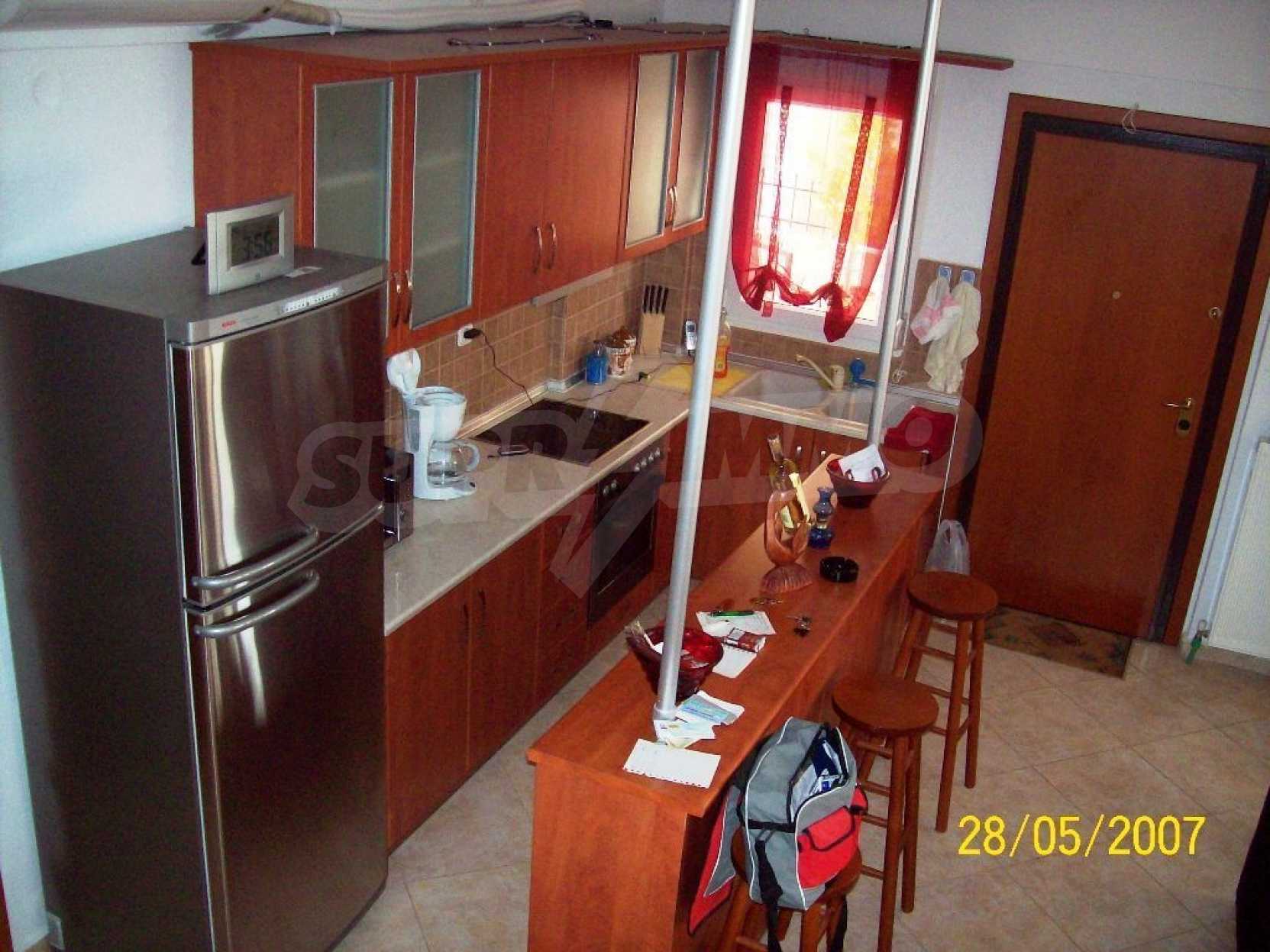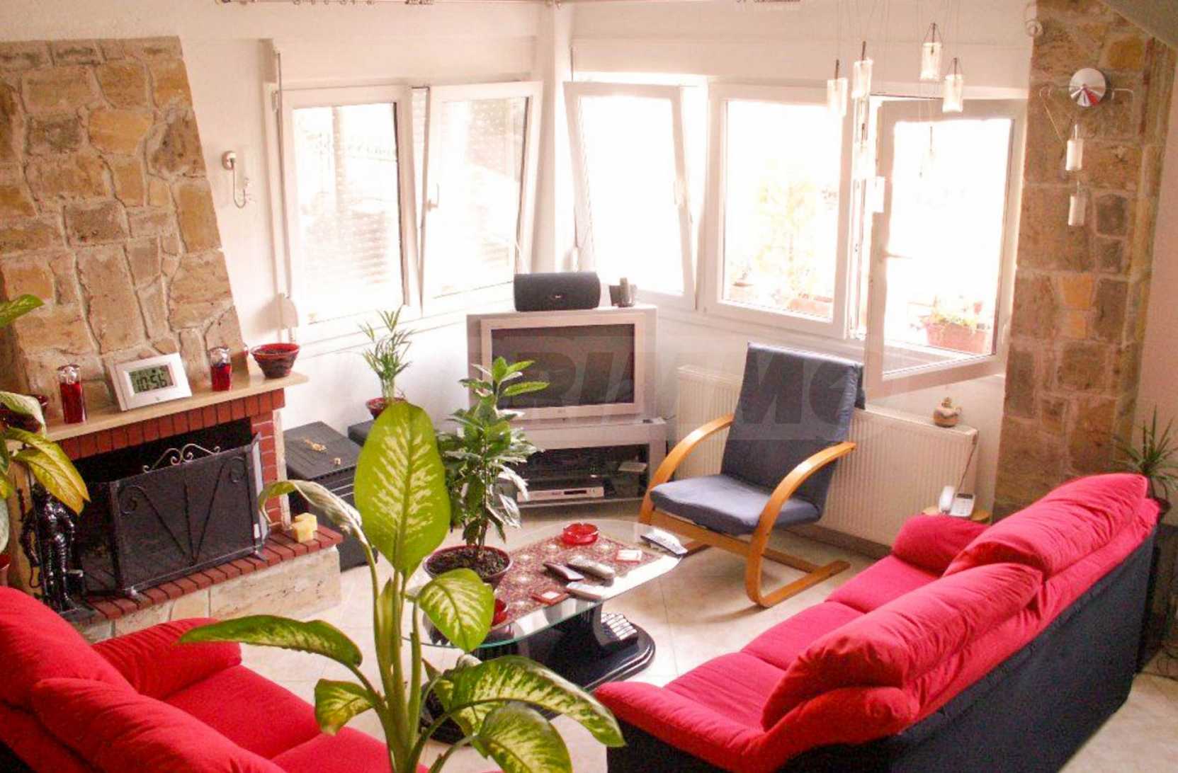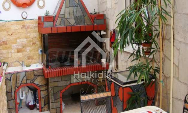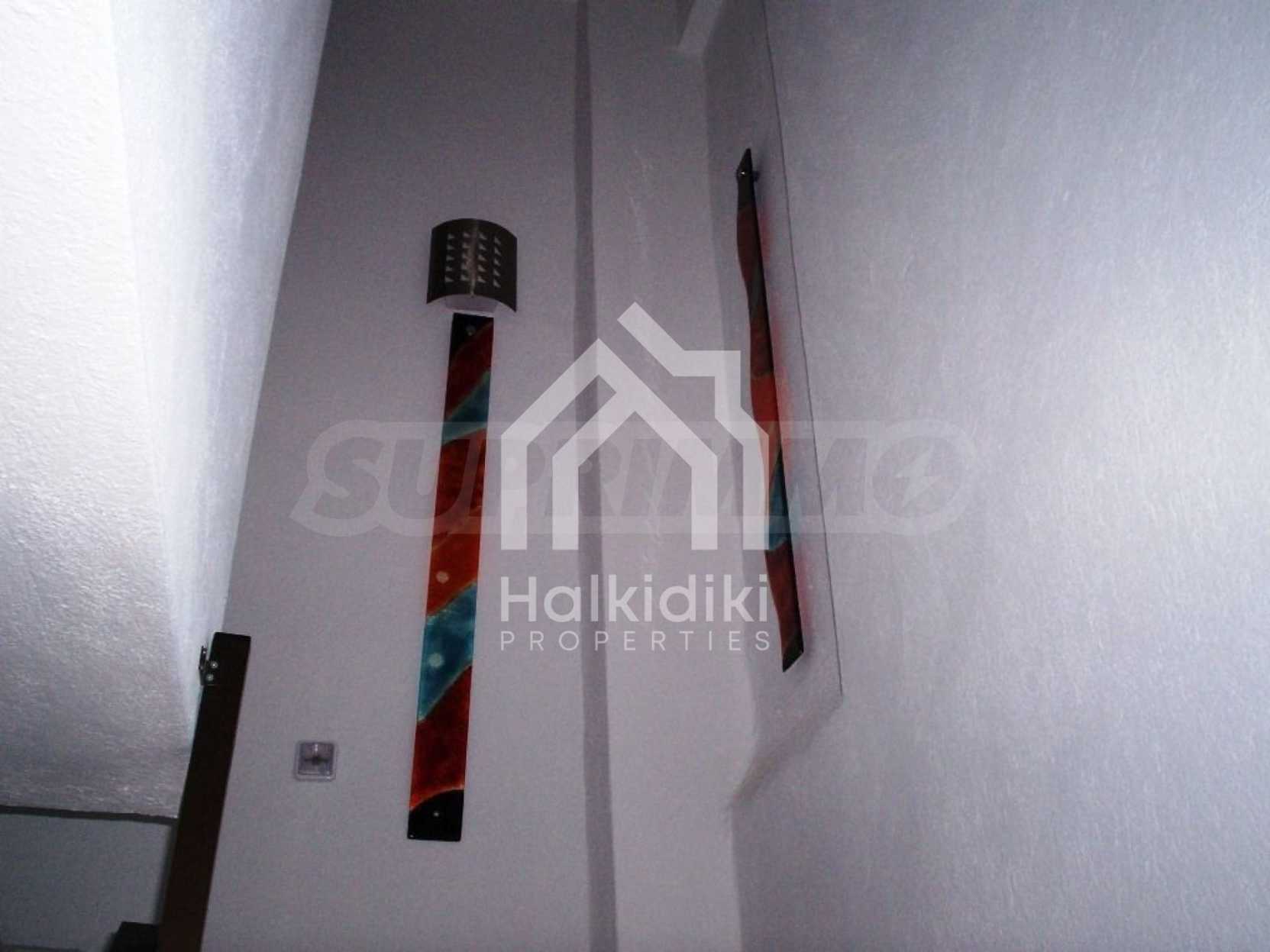 Two storey, luxurious maisonette in Kassandra, Halkidiki, 120 m2, furnished, with a large garden and sea view. It has two bedrooms, two bathrooms, a cozy living room with a fireplace, fitted kitchenware and closets and a parking spot.