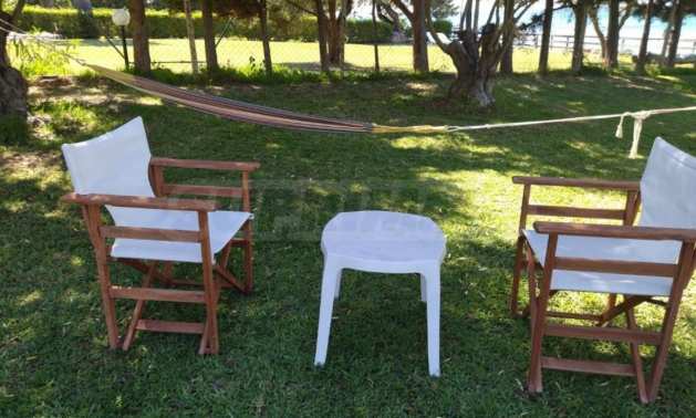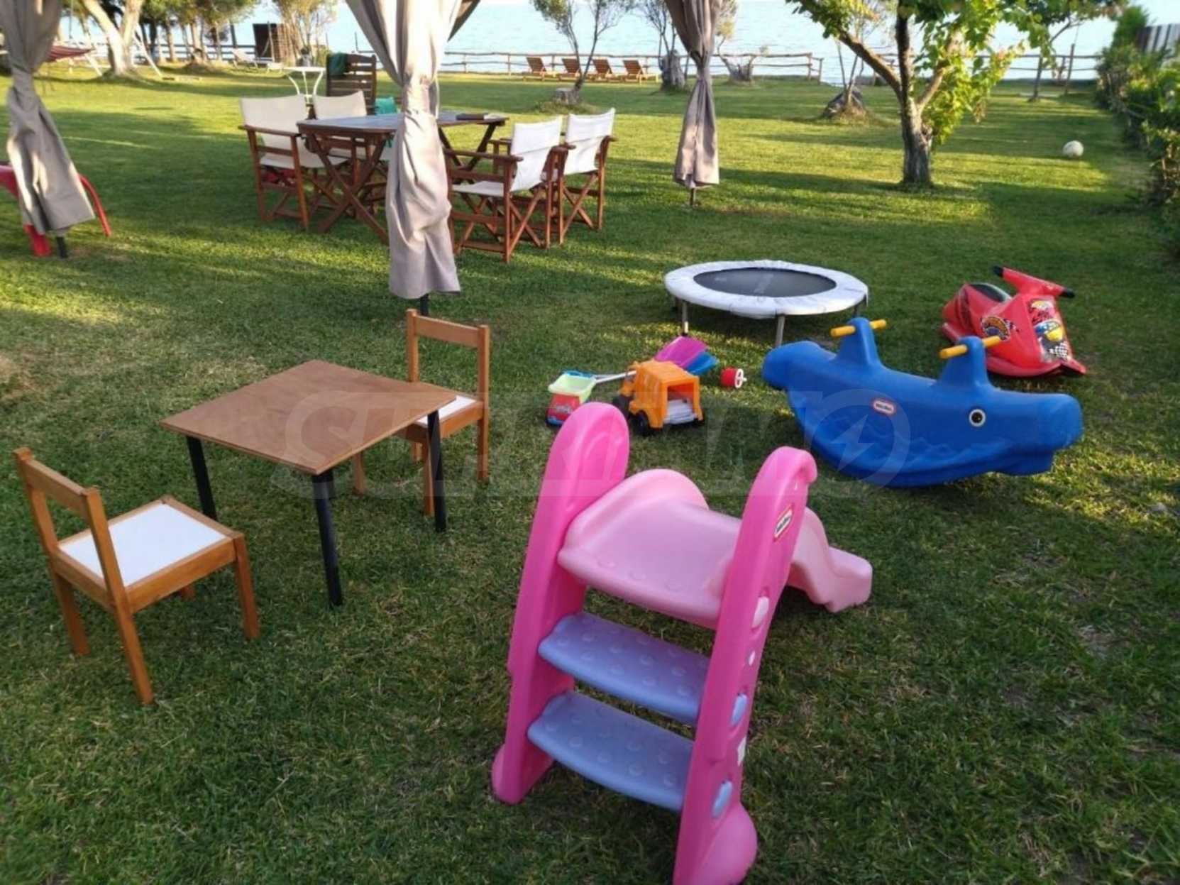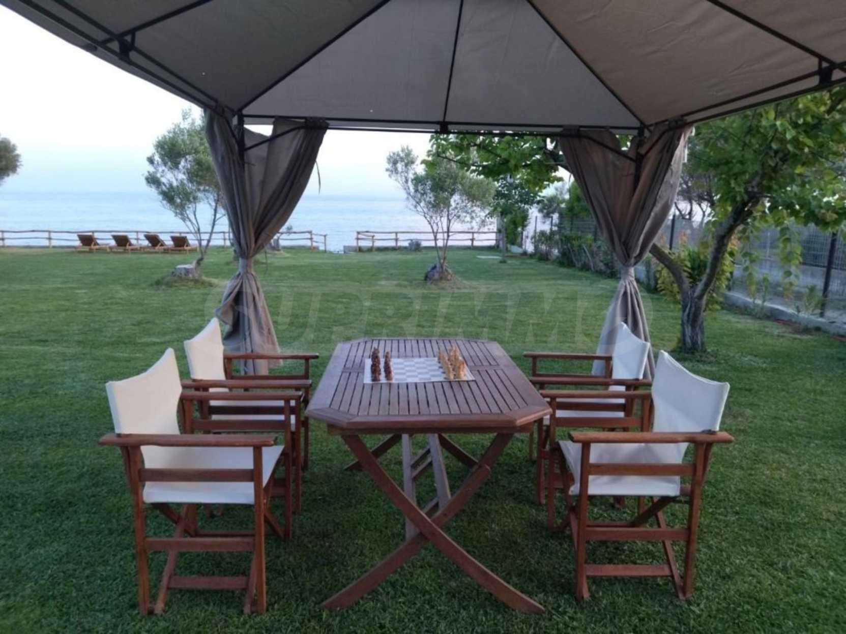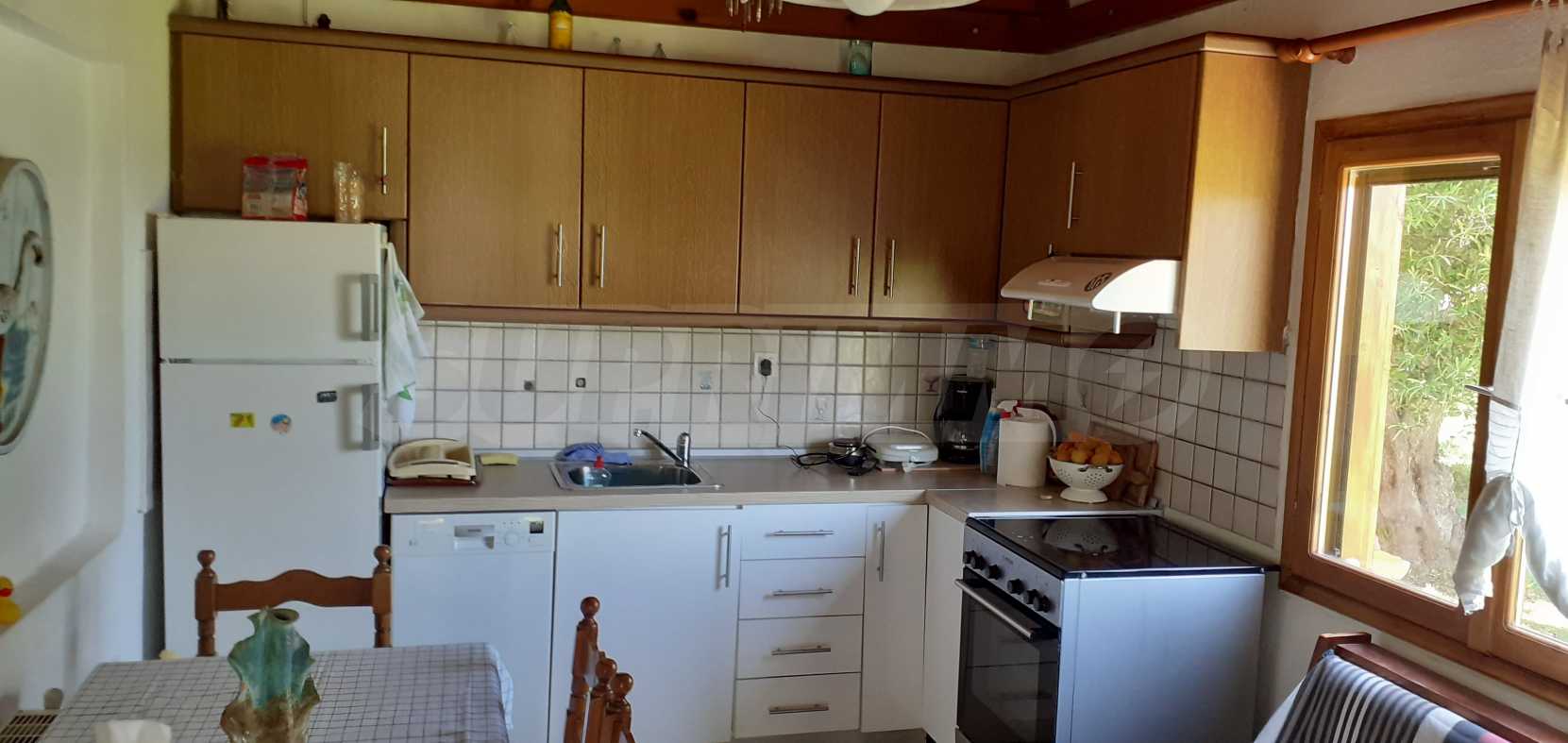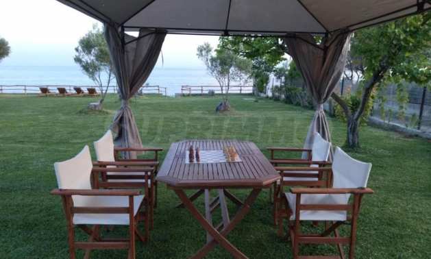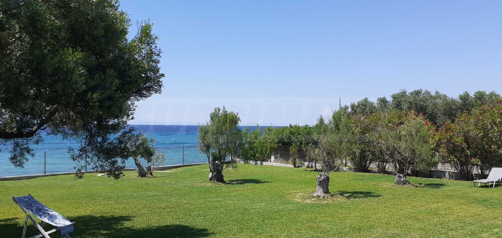 Beachfront detached house in Kassandra, Halkidiki, 66 m2, with a garden of 1100 m2, with lawn, drilling, plants, olive trees and a beautiful cobblestone courtyard. It has two bedrooms, two bathrooms and a gorgeous view to the mountain and the sea. It is very close to the village, in a tranquil spot, with access to the highway.