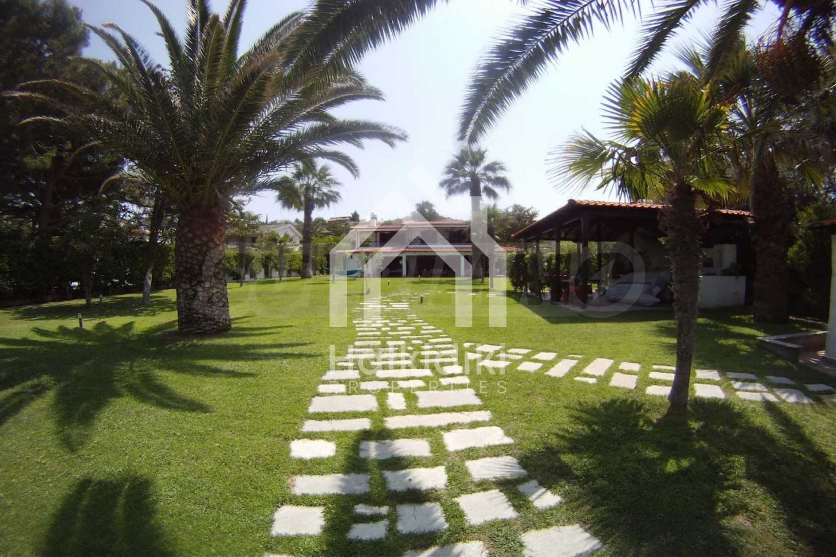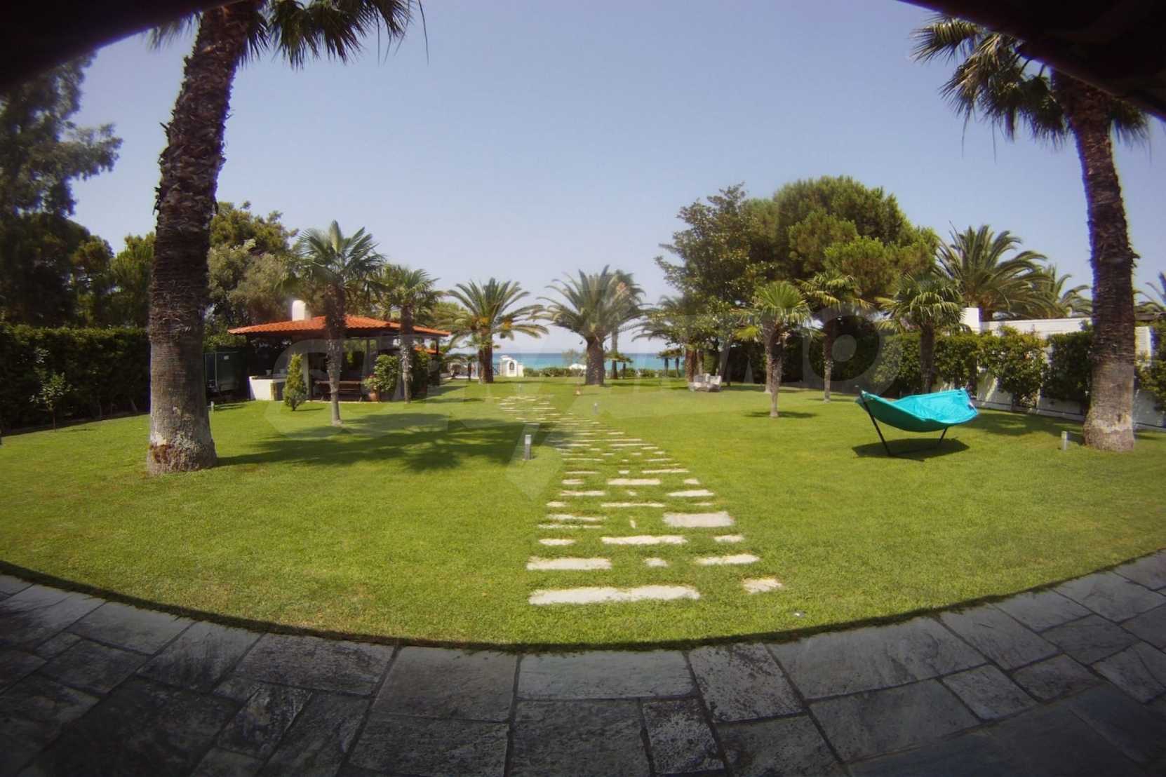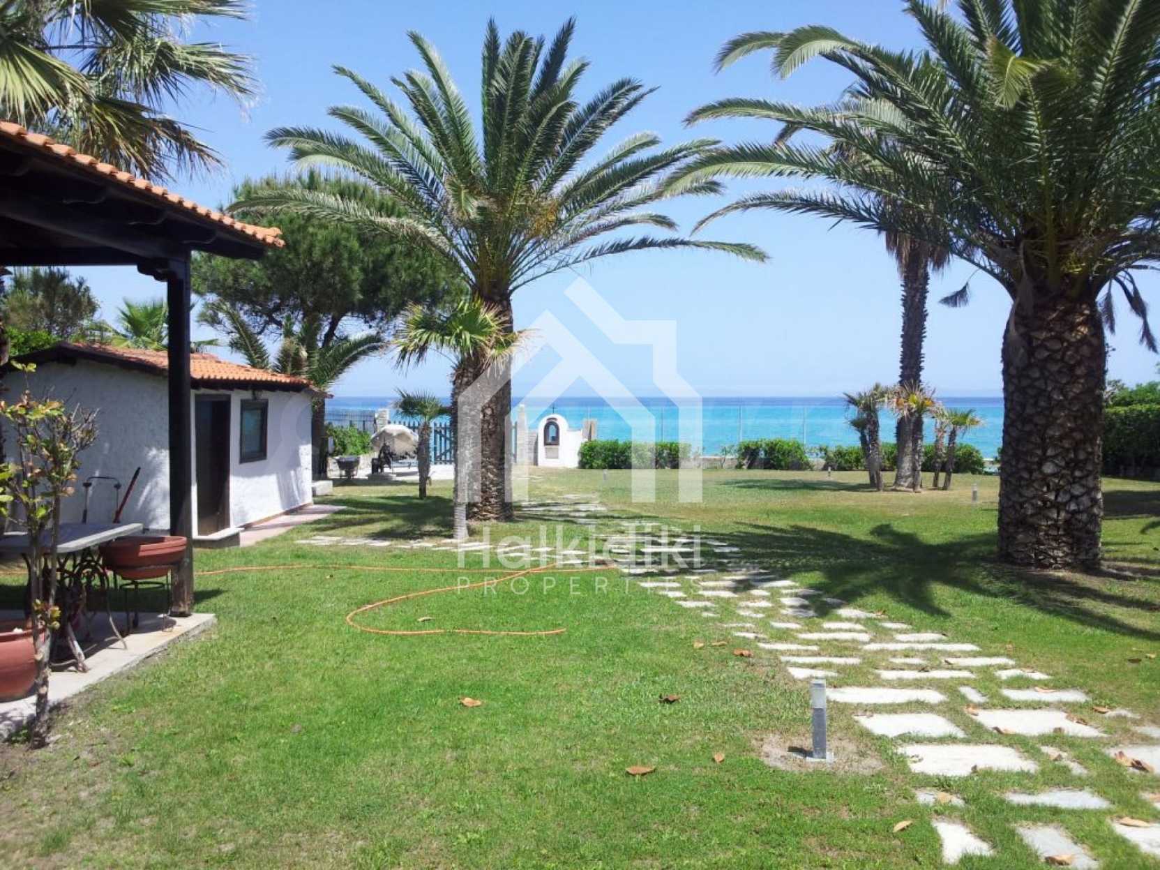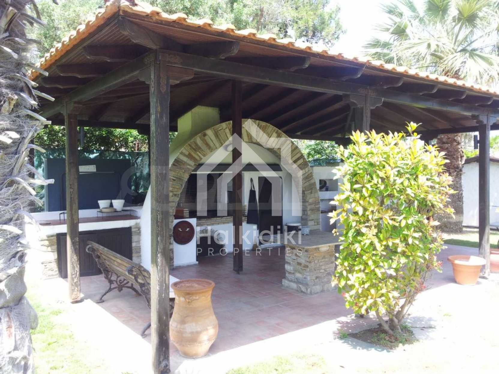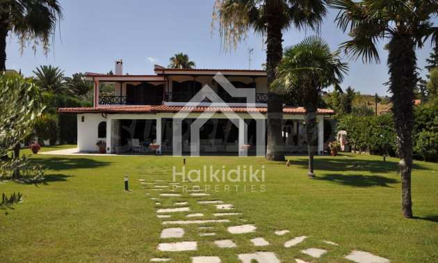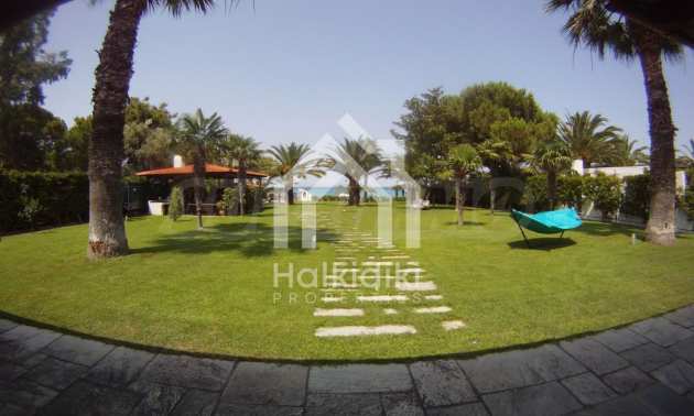 Villa in Kassandra, Halkidiki, 400 sqm, on the first line in a heavenly beach, surrounded by 2.5 acres of garden. The villa has five bedrooms and four bathrooms. The carefully landscaped garden has outdoors kitchen and living room with barbeque, as well as two parking spots. It is a unique house of great aesthetics and architecture, compining harmonically materials such as wood and stone.