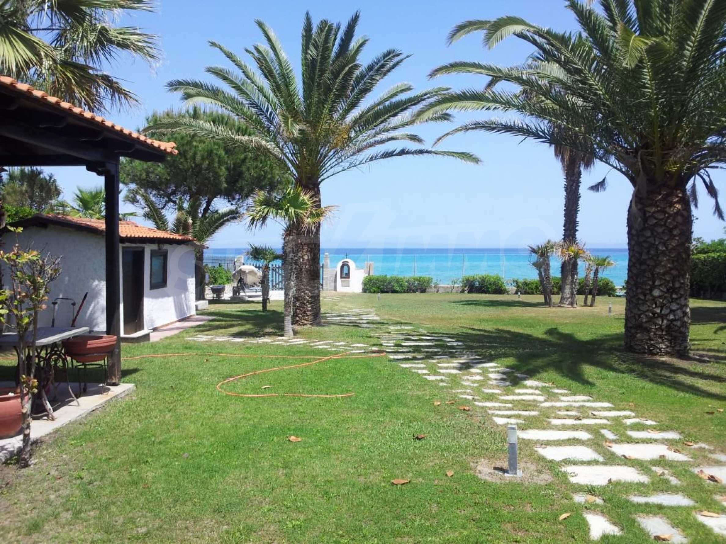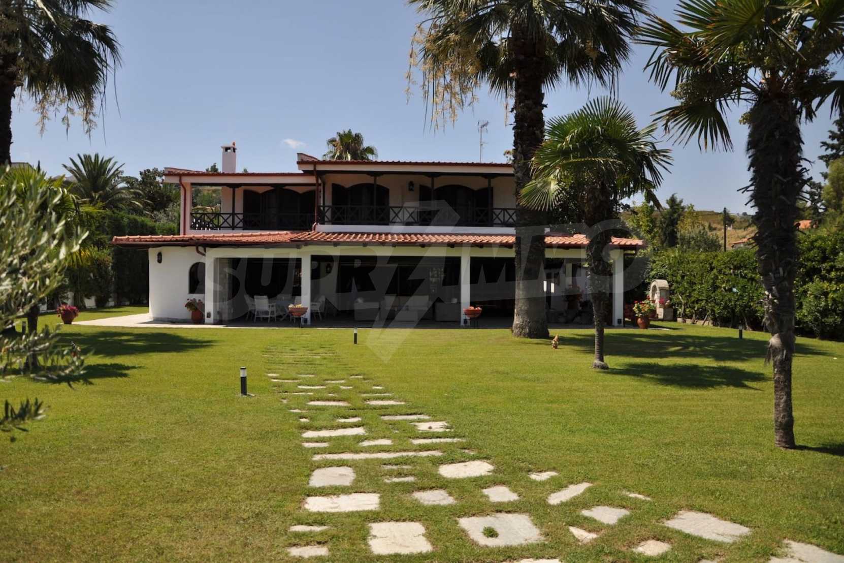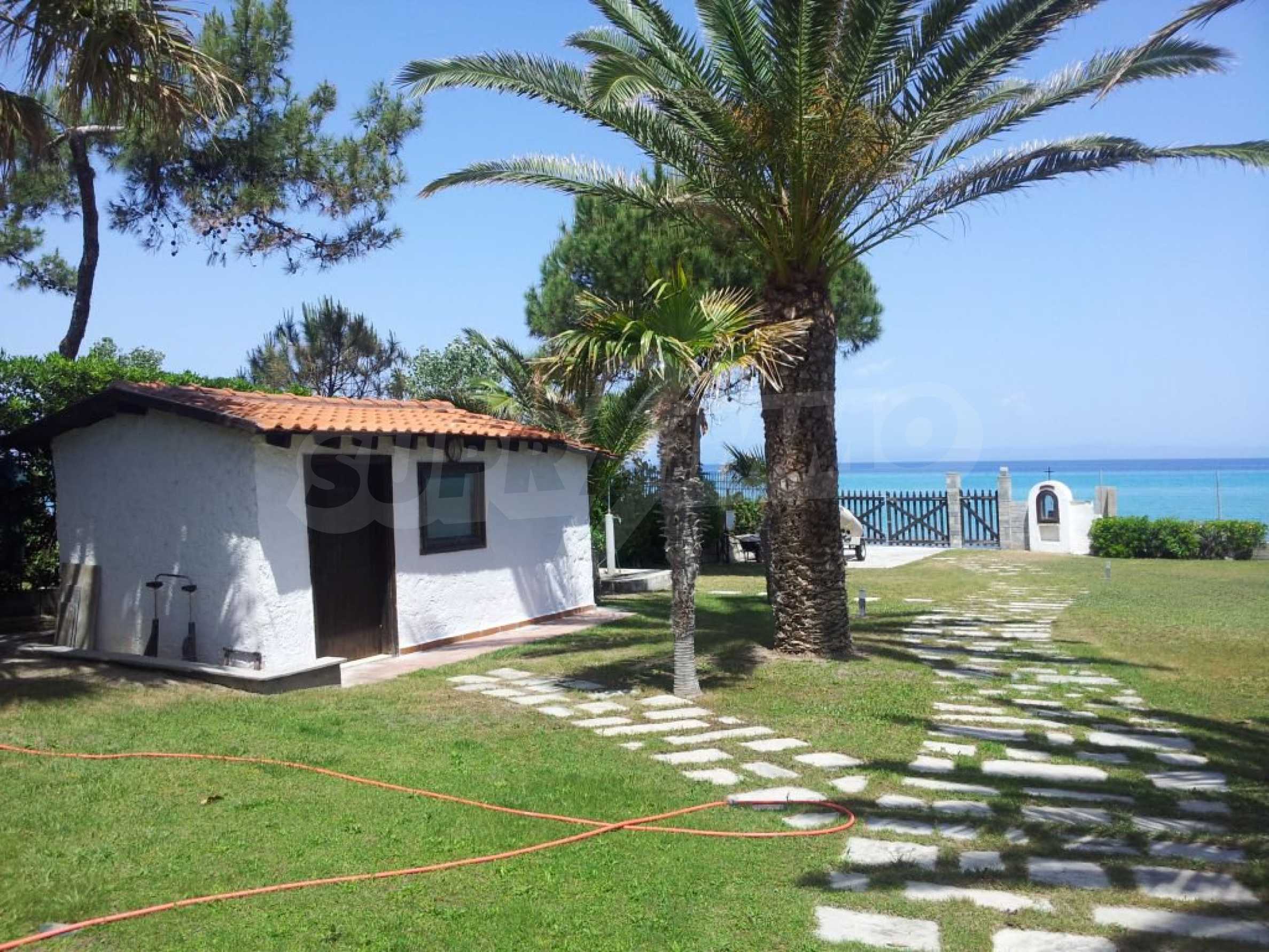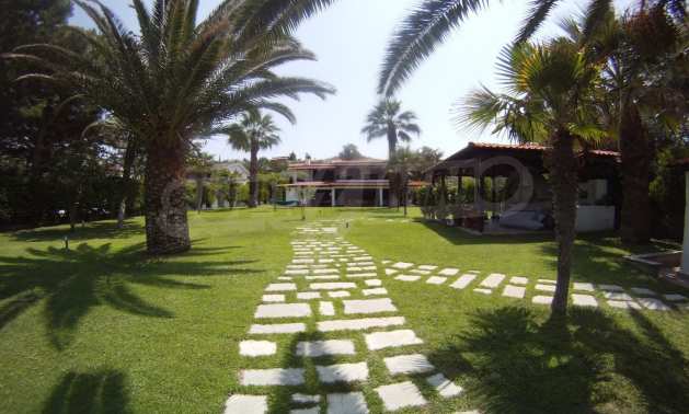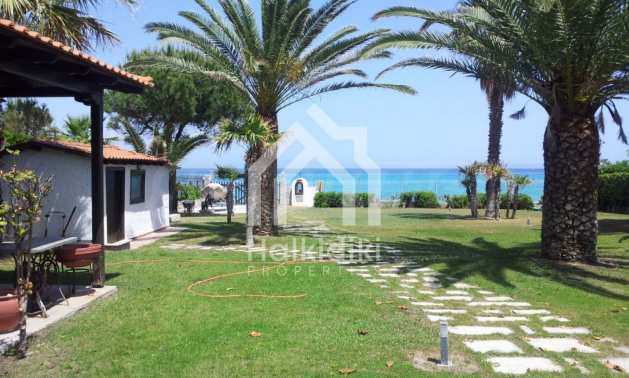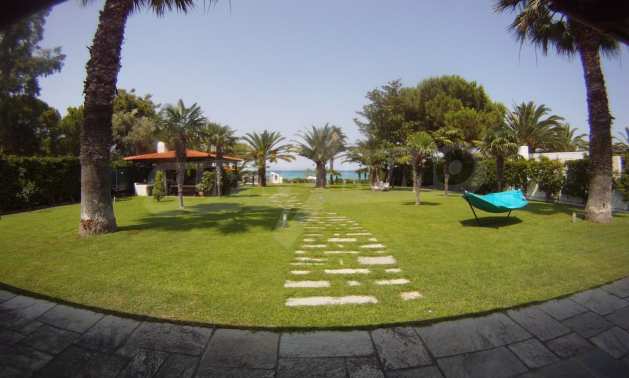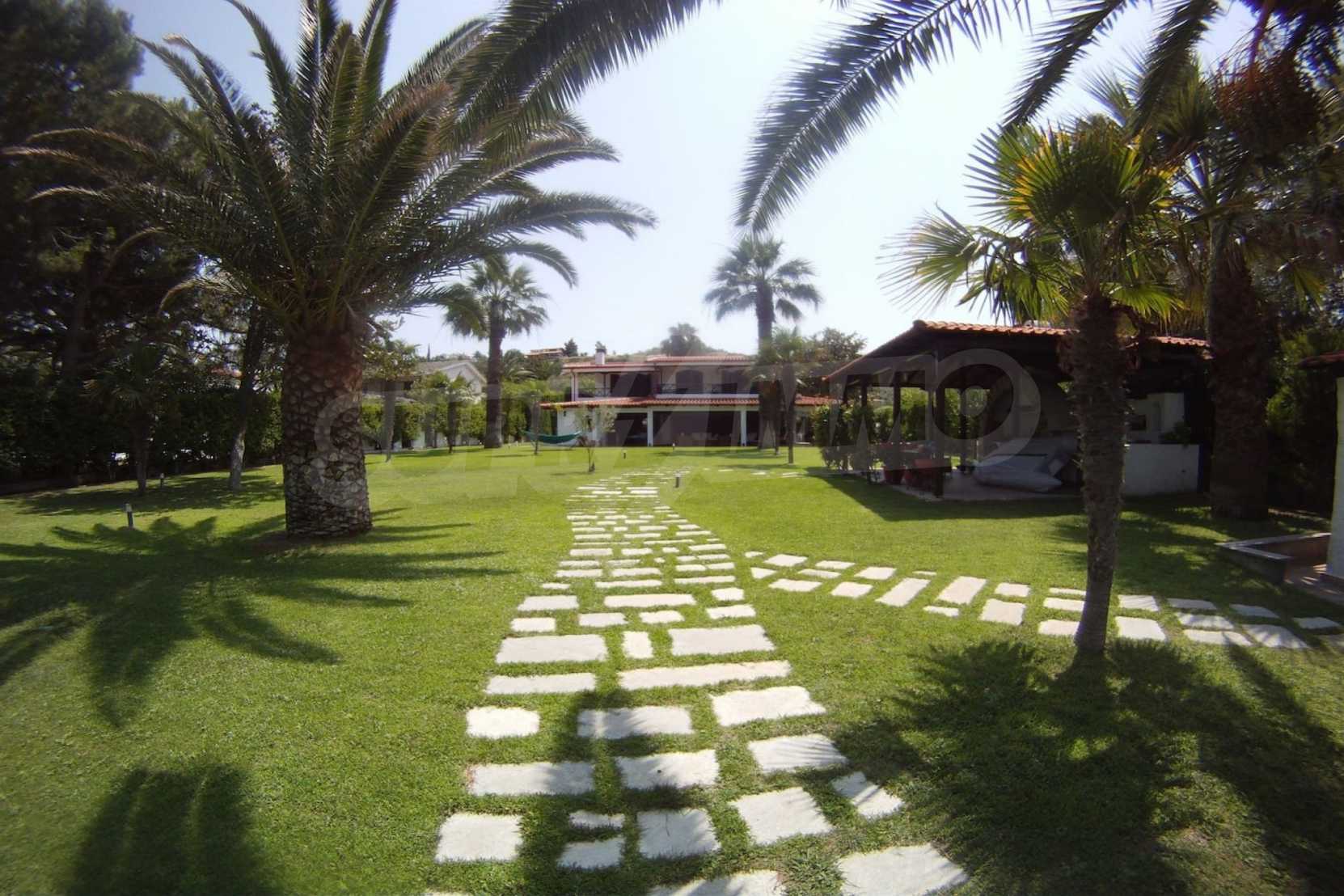 Villa in Kassandra, Halkidiki, 400 sqm, on the first line in a heavenly beach, surrounded by 2.5 acres of garden. The villa has five bedrooms and four bathrooms. The carefully landscaped garden has outdoors kitchen and living room with barbeque, as well as two parking spots. It is a unique house of great aesthetics and architecture, compining harmonically materials such as wood and stone.