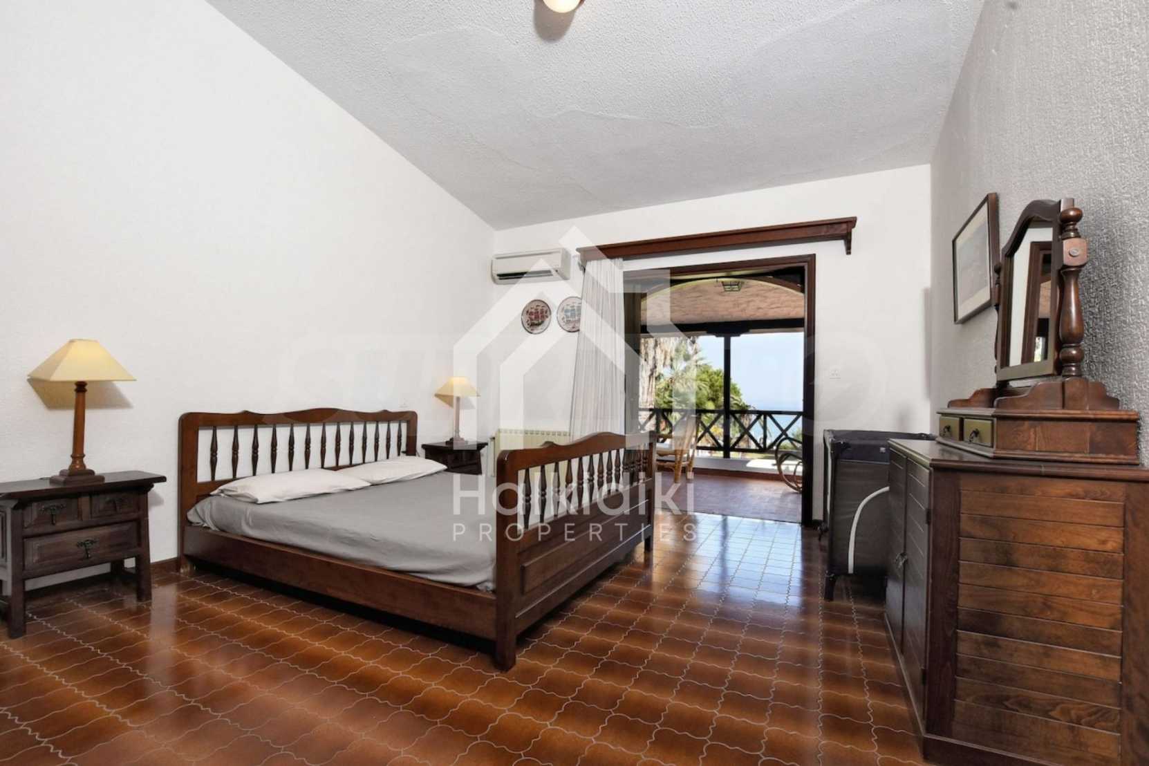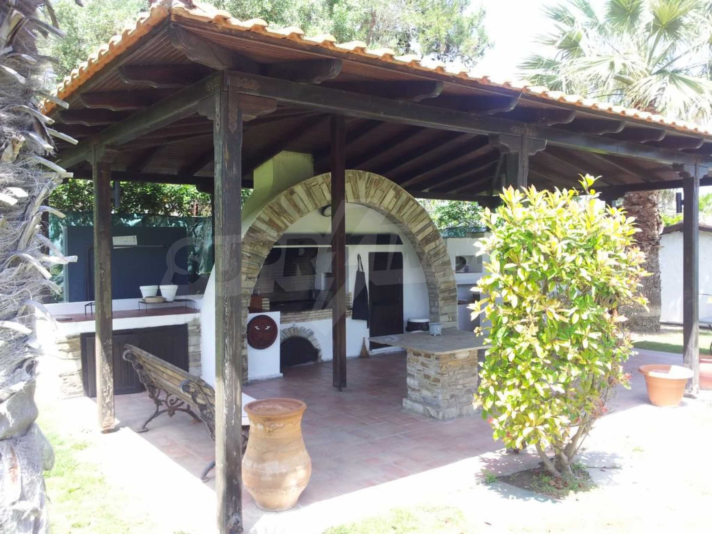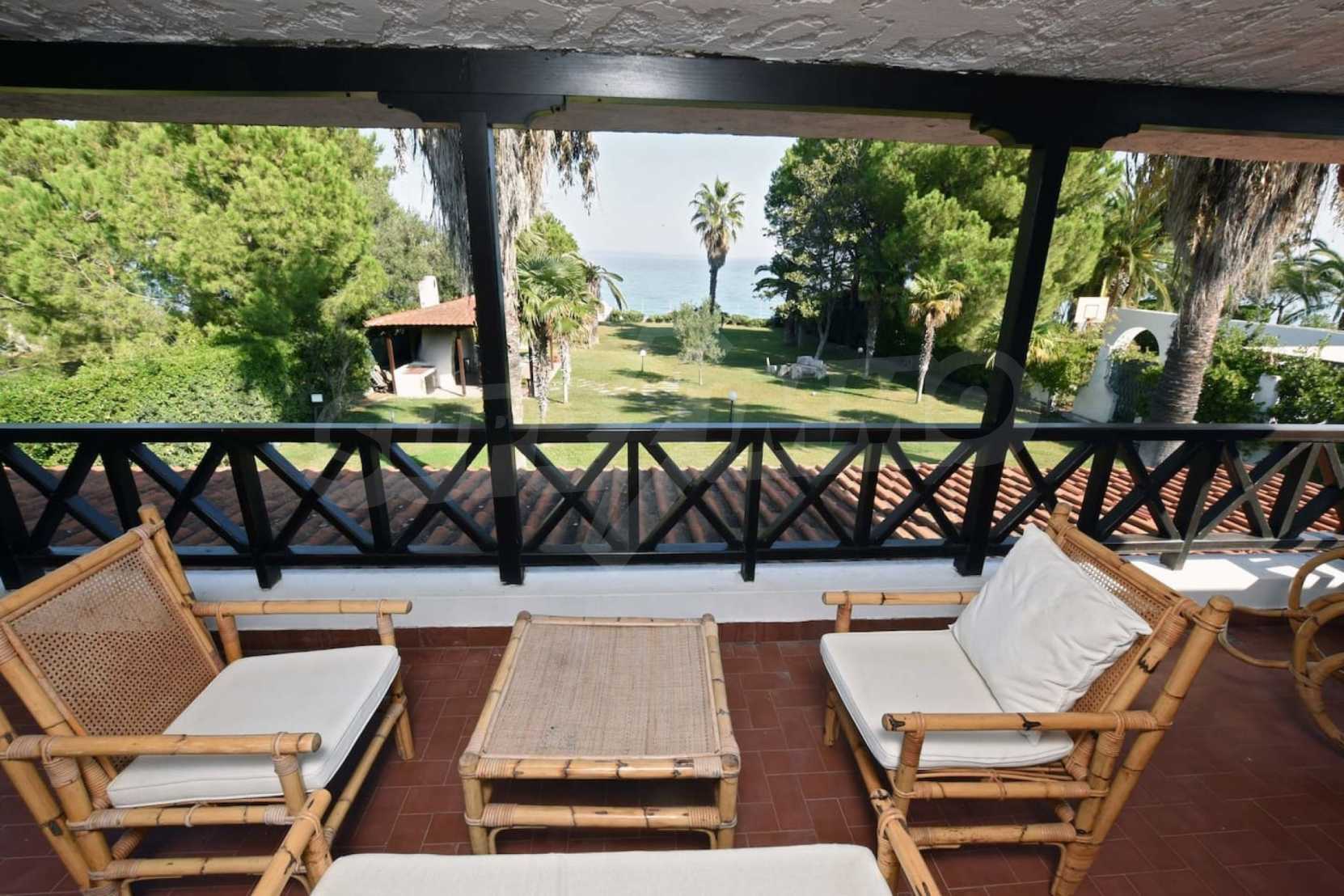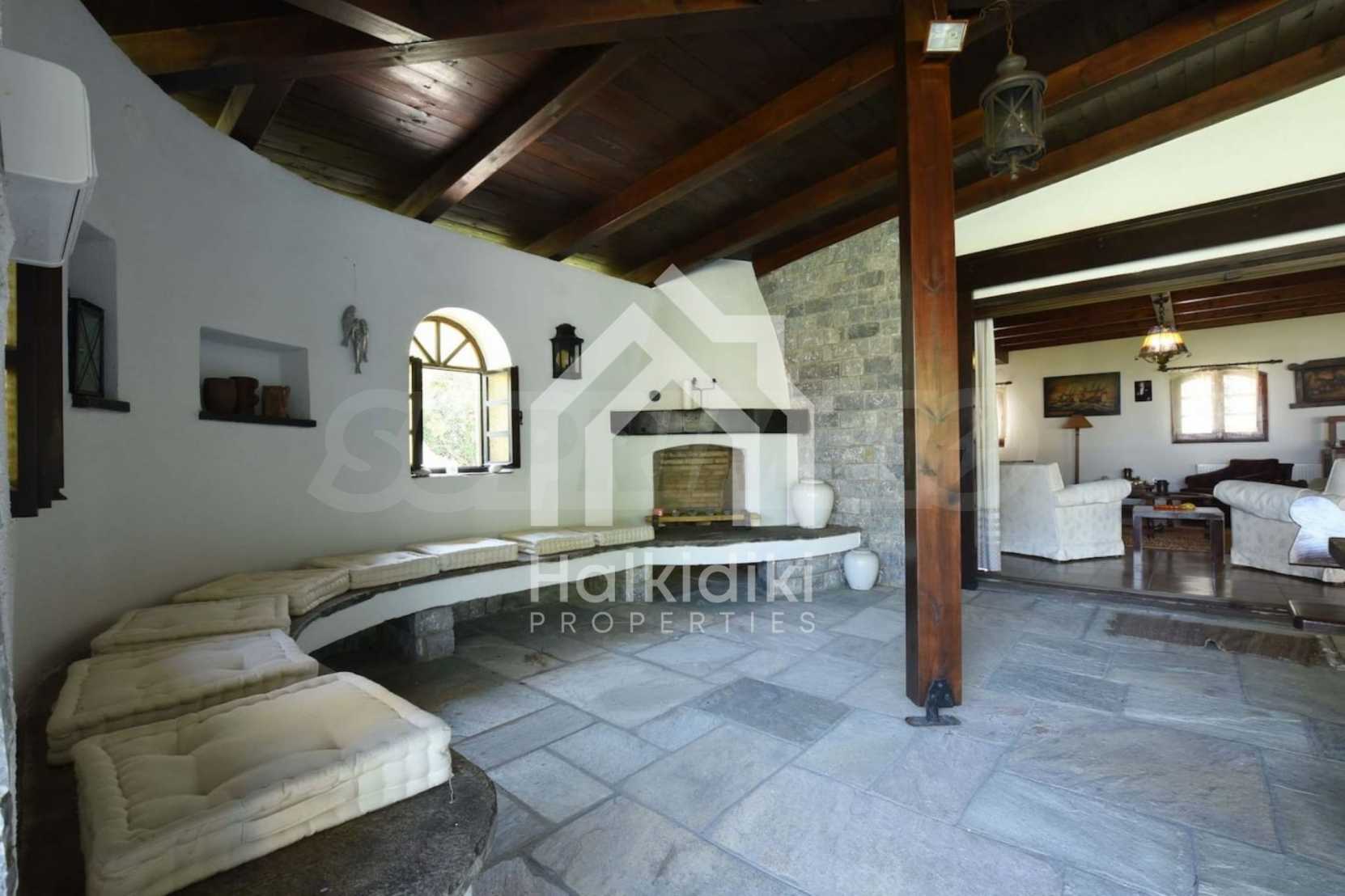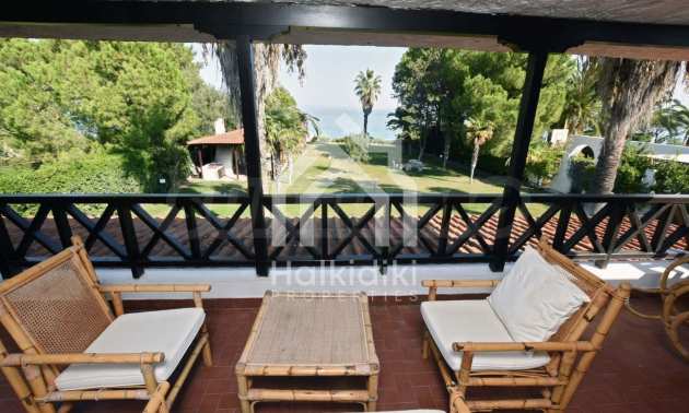Villa in Kassandra, Halkidiki, 400 sqm, on the first line in a heavenly beach, surrounded by 2.5 acres of garden. The villa has five bedrooms and four bathrooms. The carefully landscaped garden has outdoors kitchen and living room with barbeque, as well as two parking spots. It is a unique house of great aesthetics and architecture, compining harmonically materials such as wood and stone.