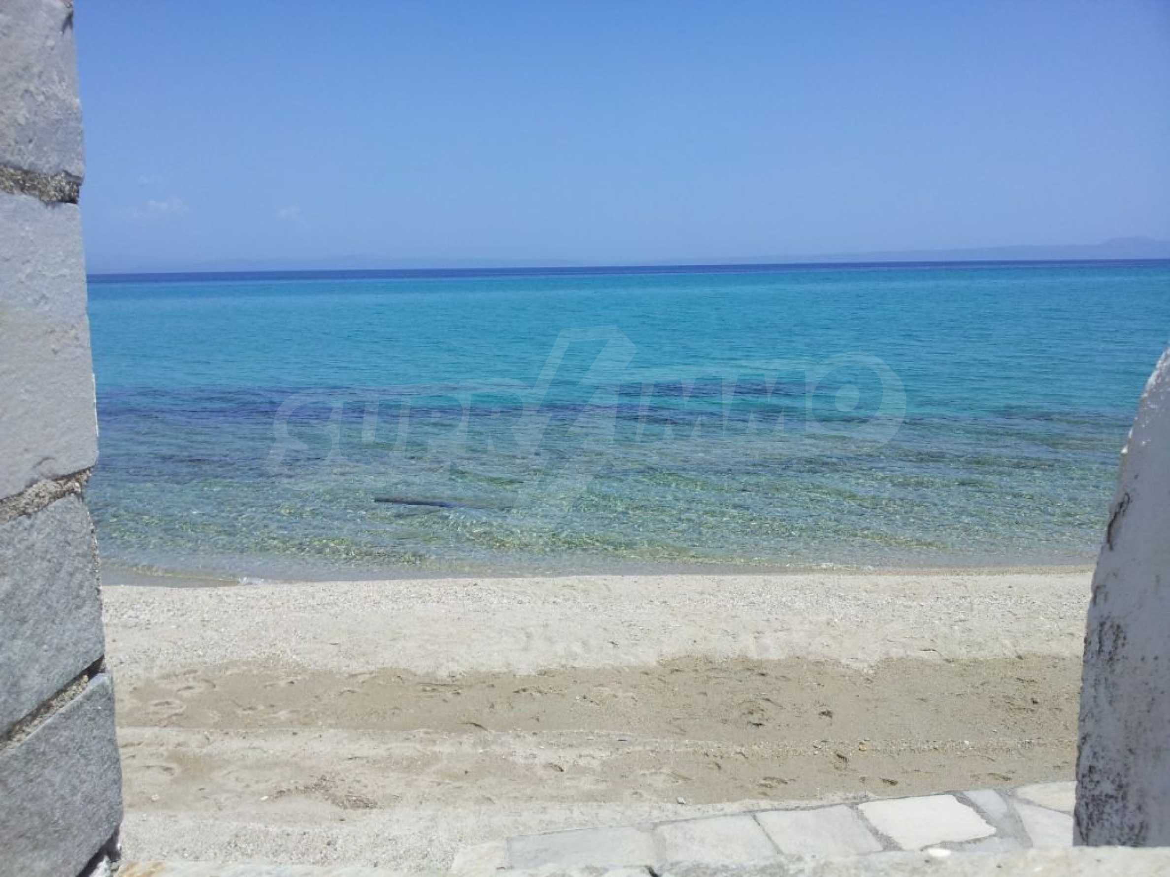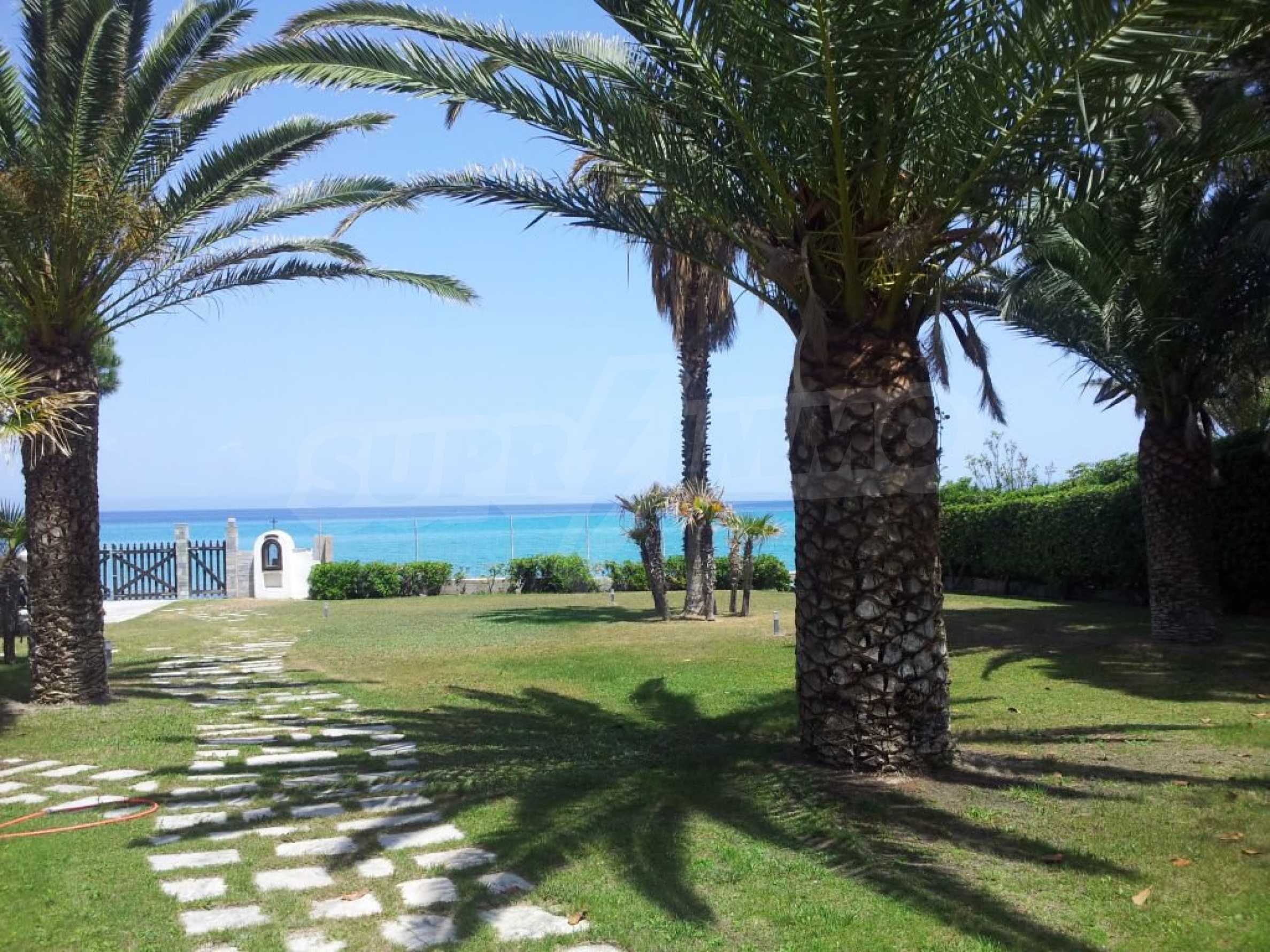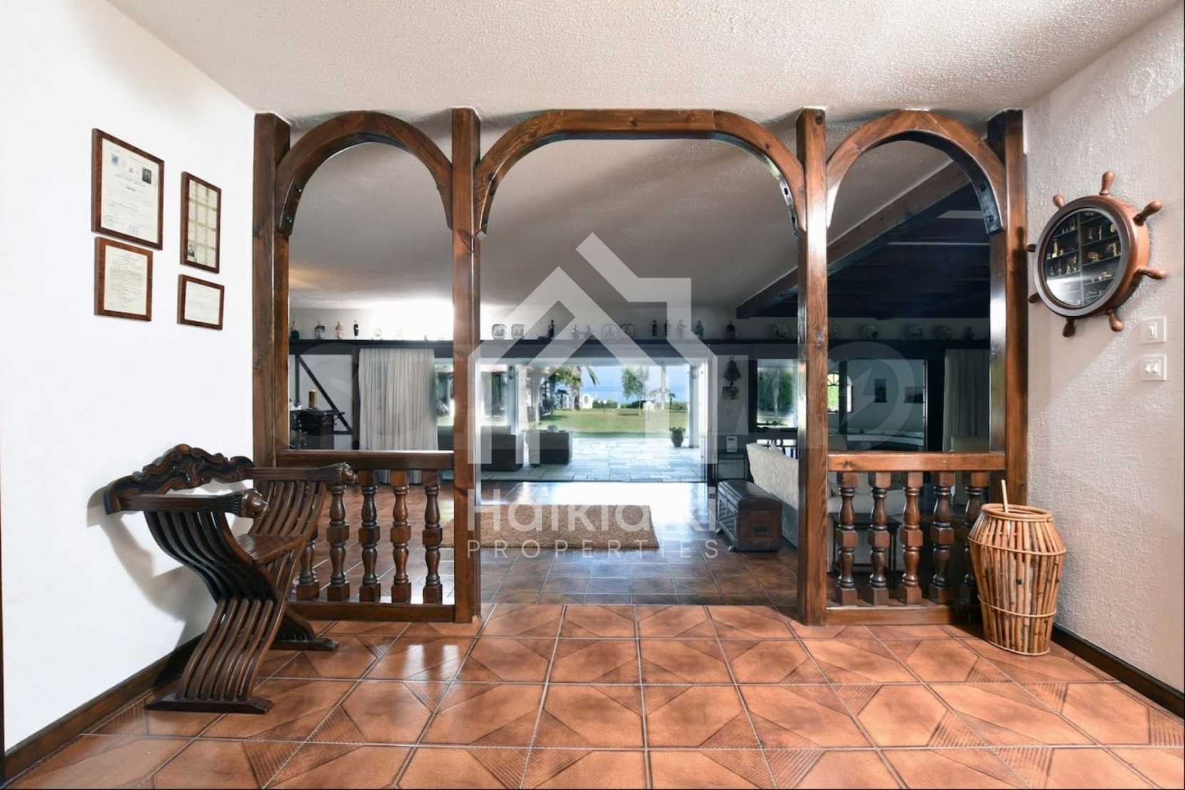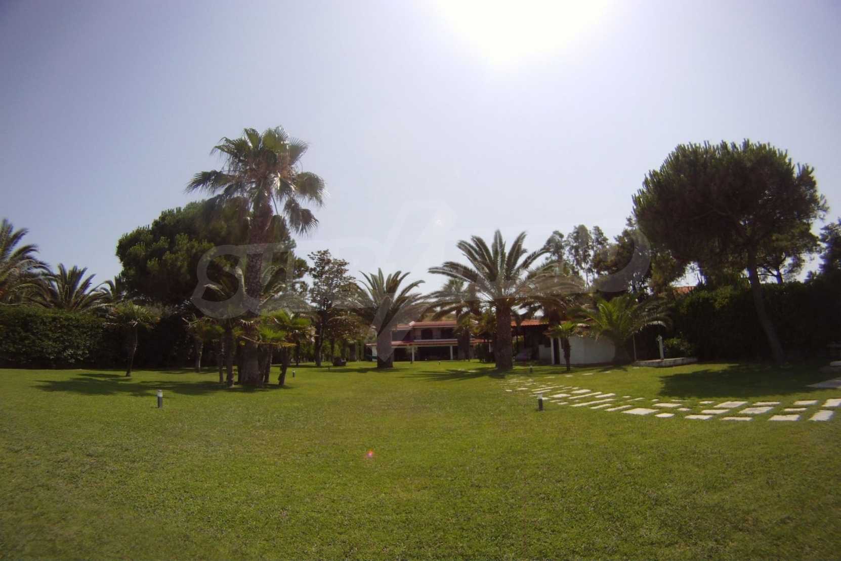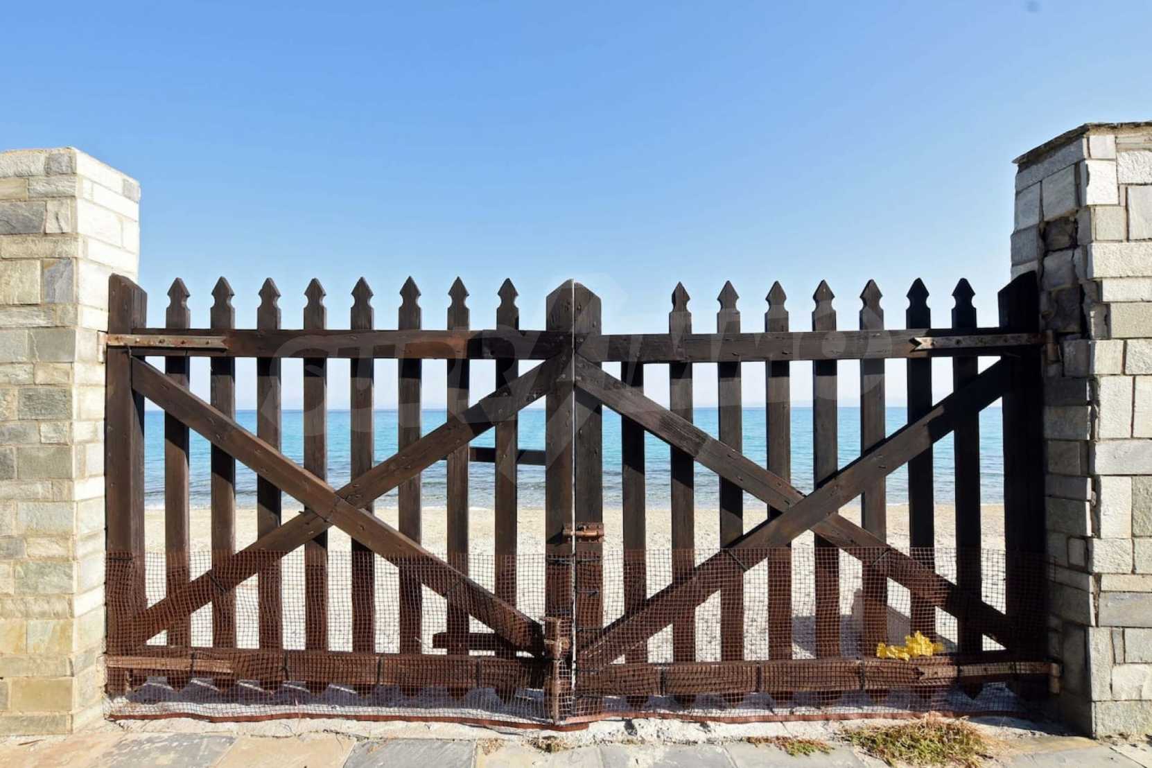 Villa in Kassandra, Halkidiki, 400 sqm, on the first line in a heavenly beach, surrounded by 2.5 acres of garden. The villa has five bedrooms and four bathrooms. The carefully landscaped garden has outdoors kitchen and living room with barbeque, as well as two parking spots. It is a unique house of great aesthetics and architecture, compining harmonically materials such as wood and stone.