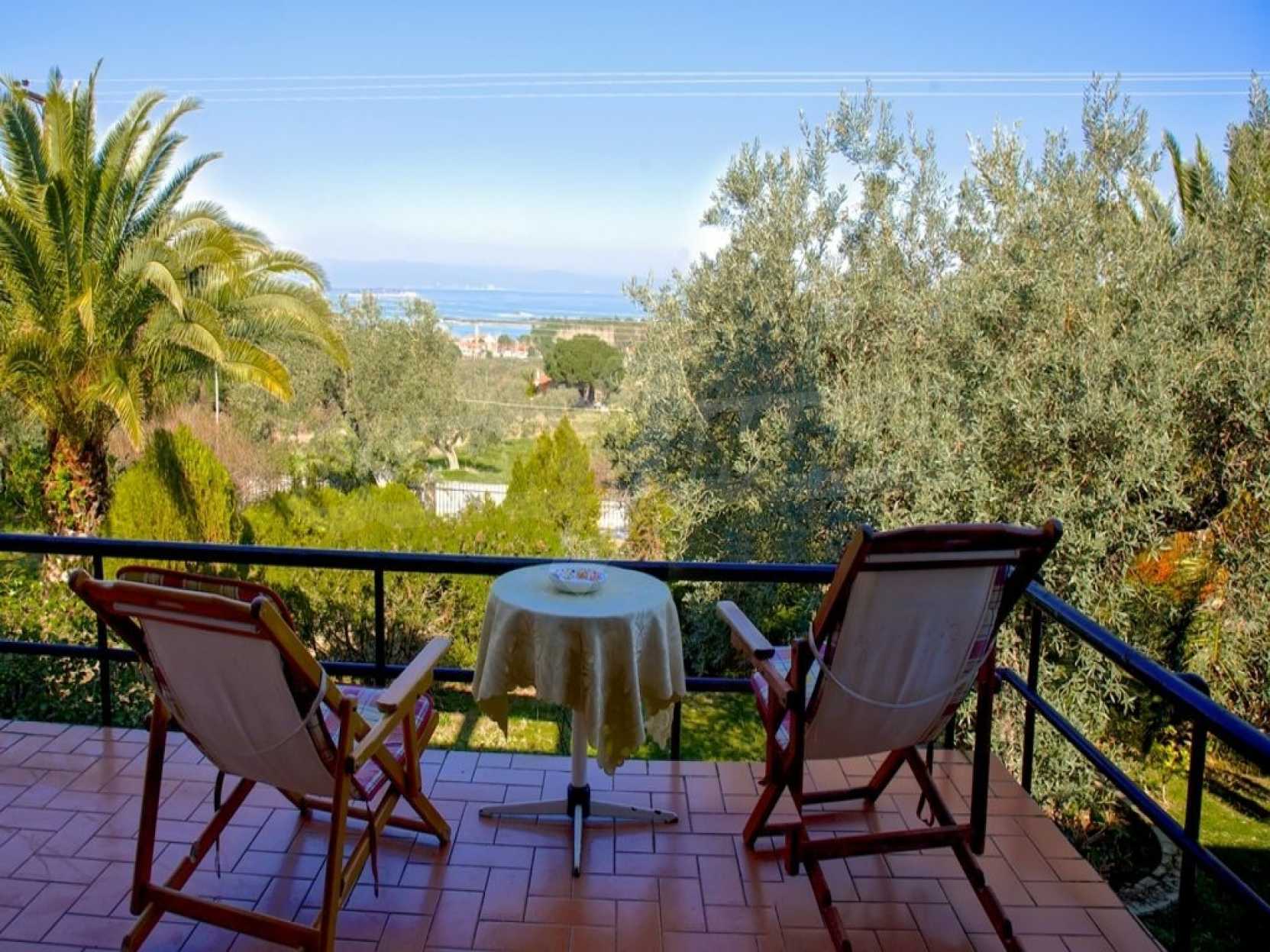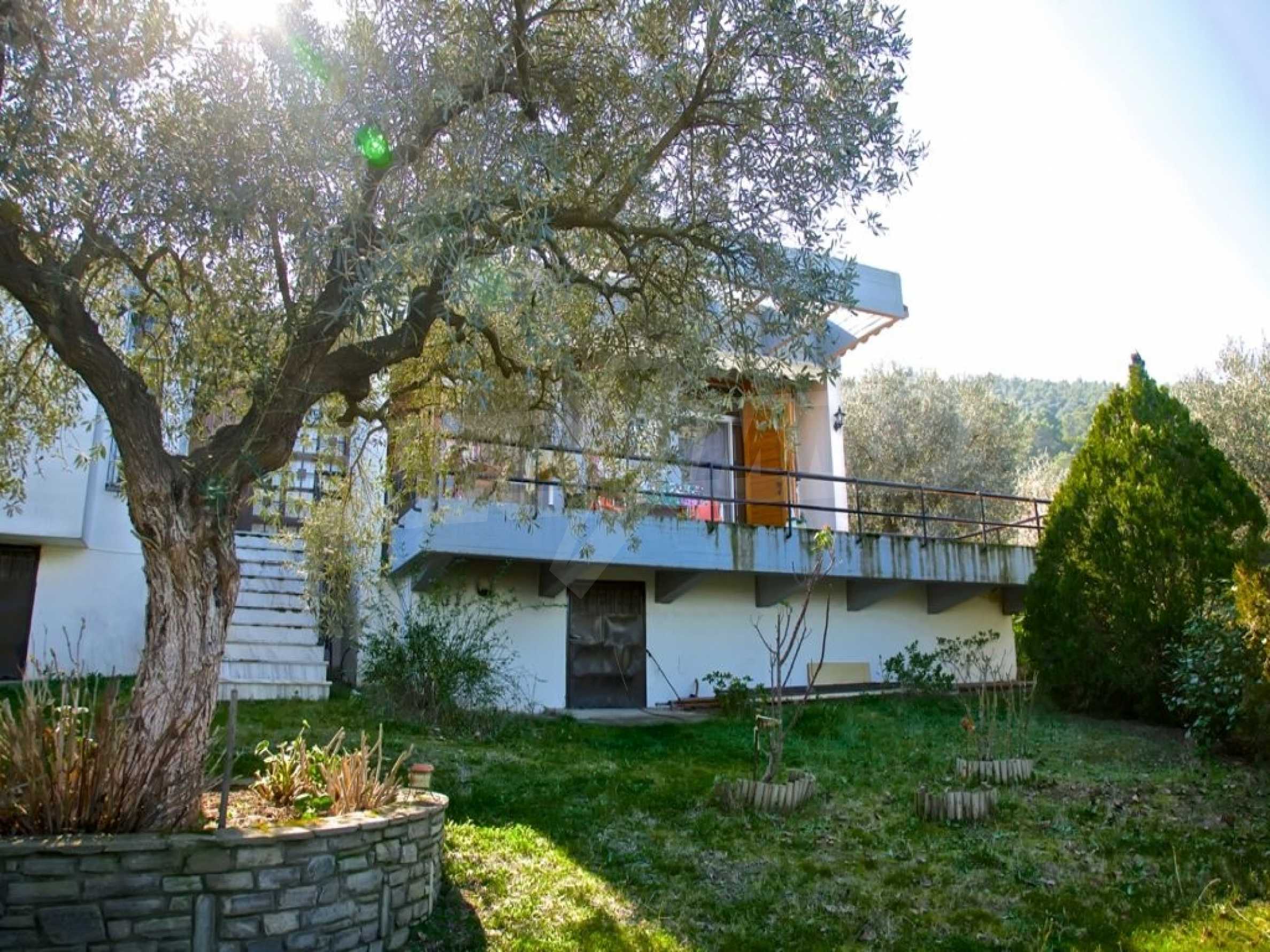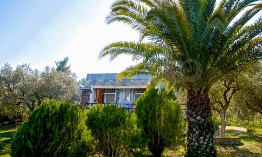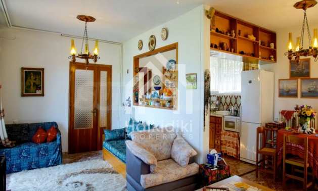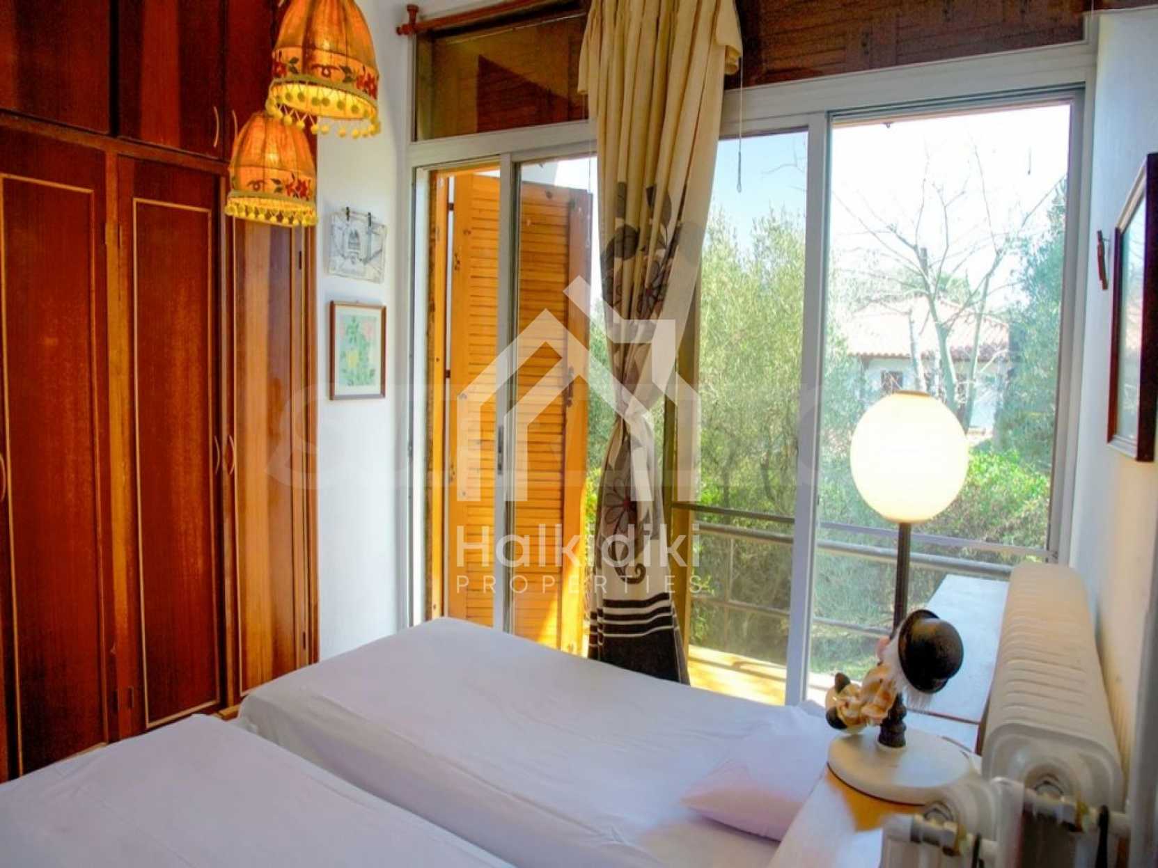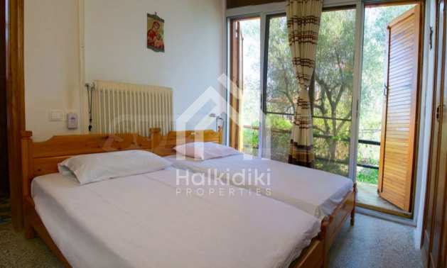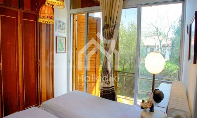 Detached house in Sithonia, Halkidiki, 130 sqm. It is located in a panoramic position, overlooking the sea and mountains, next to pine trees. Surrounded by 2 acres of tree-lined garden, which contains another building of 40 sqm with a bedroom, bathroom and a kitchen. The main house has a living room, kitchen, 3 bedrooms, bathroom and large balconies. The property has a fireplace, screens, wooden windows and water heater. It can also be sold furnished.
