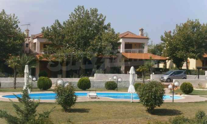 Maisonette in Kassandra, Halkidiki, 146 sqm. It is built on a privileged spot on a hill and has beautiful view to the sea and the second peninsula of Halkidiki. The maisonette is part of a complex with a shared pool, only 1, 5 km from the center of the village. It is split in two levels. The ground floor (86 sqm) has a living room with kitchen, a bedroom and a bathroom. On the first floor (60 sqm) there are two bedrooms and two bathrooms. The house is fully furnished. It is surrounded by a beautiful, lush garden equipped with garden furniture and has shady pergolas, for pleasant summer evenings.