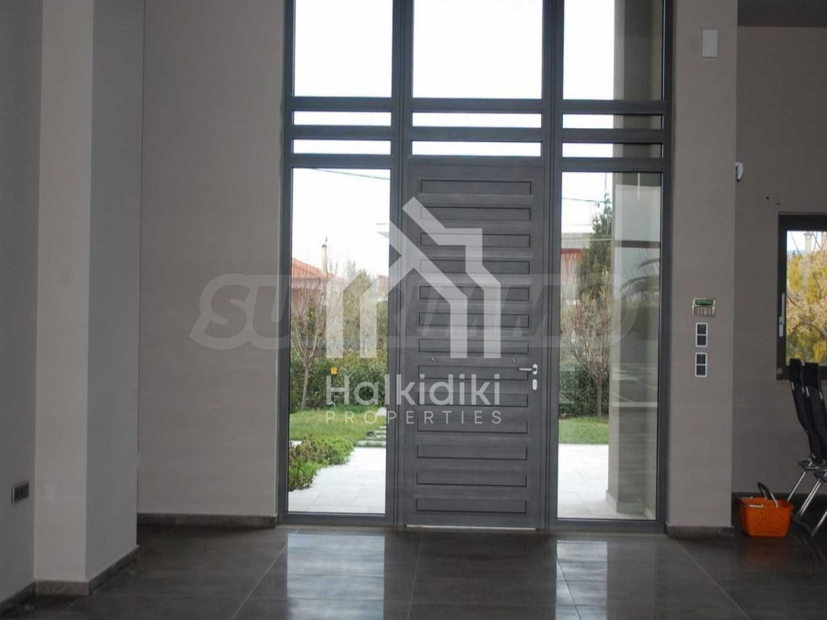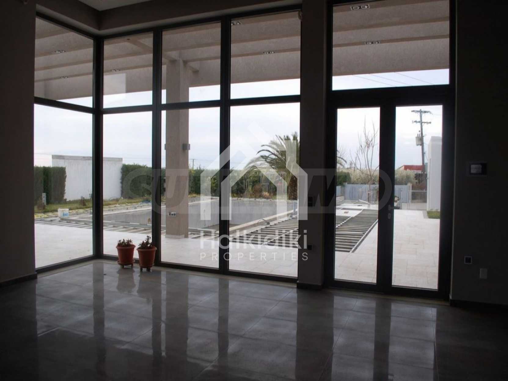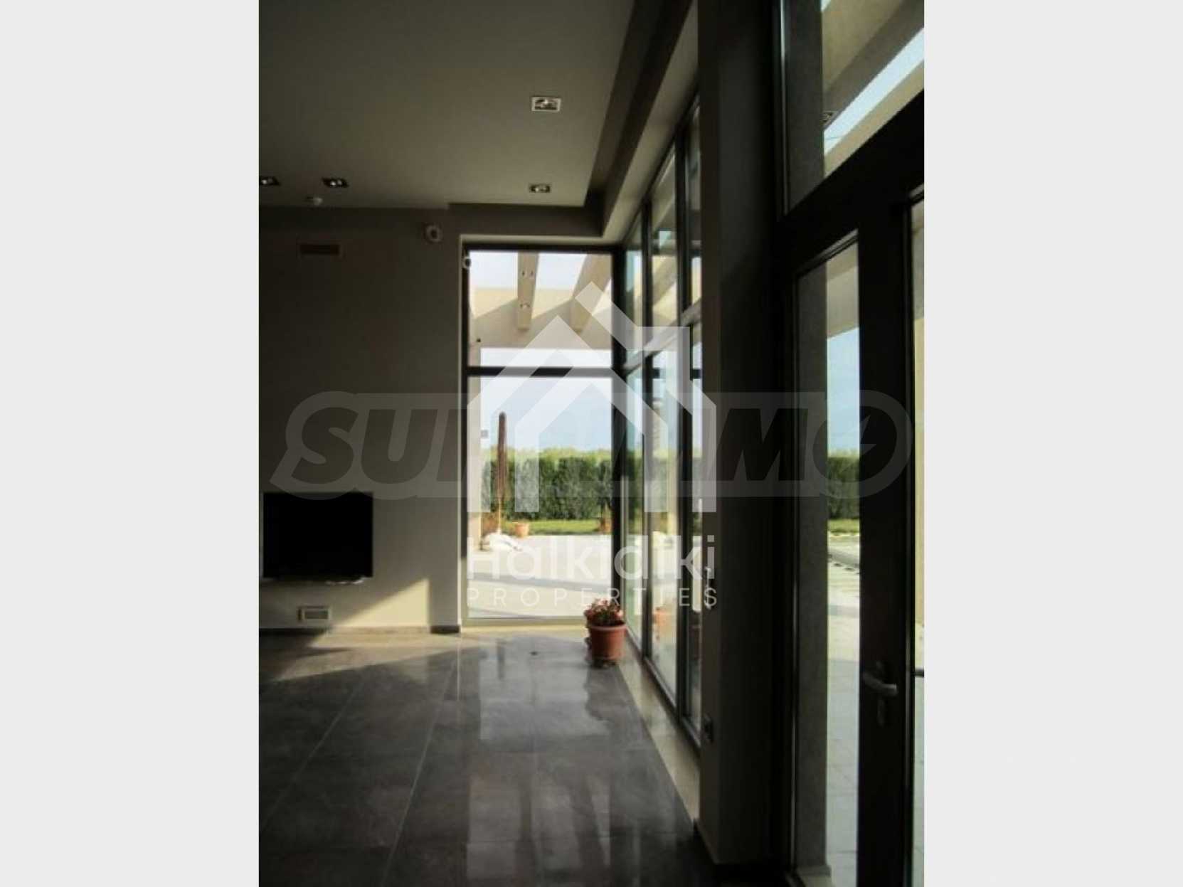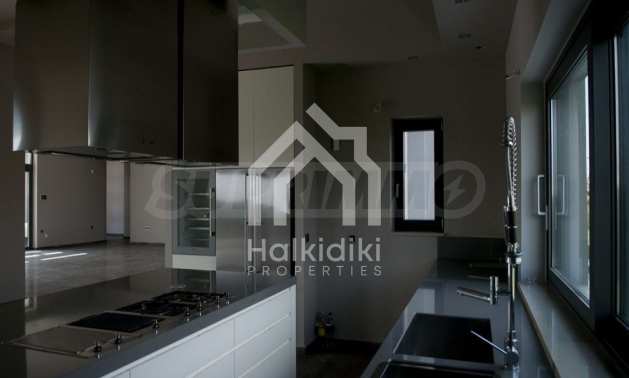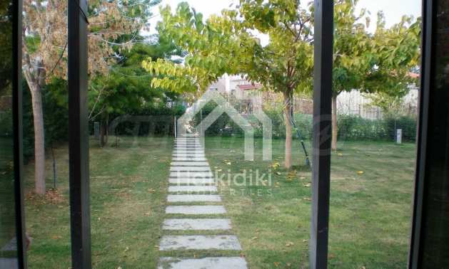 Detached house in Kassandra, Halkidiki. It is a house of unique luxury, very close to the beach. The plot includes three buildings, with their corresponding land. The main building has a floor area 318 sqm and 1, 45 acres of land. The guest house is 47, 3 sqm and 1 acre of land and the storage house is 97, 62 sqm, on the same piece of land. The whole plot has in total 2, 45 acres floor area. The three buildings form a corner, a shape, which creates a cool oasis in the center of the plot, where the swimming pool and a variety of trees are located. This carefully designed architecture maintains the privacy of the yard, not only by indiscreet eyes, but also from any unpleasant weather conditions, such as northern wind. The main house consists of three large bedrooms, three bathrooms, a storage room, four parking lots and garage for two vehicles. It is equipped with automated vacuum system and fully automatic cupboards, heat pump system and CCTV system, as long as fingerprint – functioning security door. This house constitutes the epitome of a smart house!