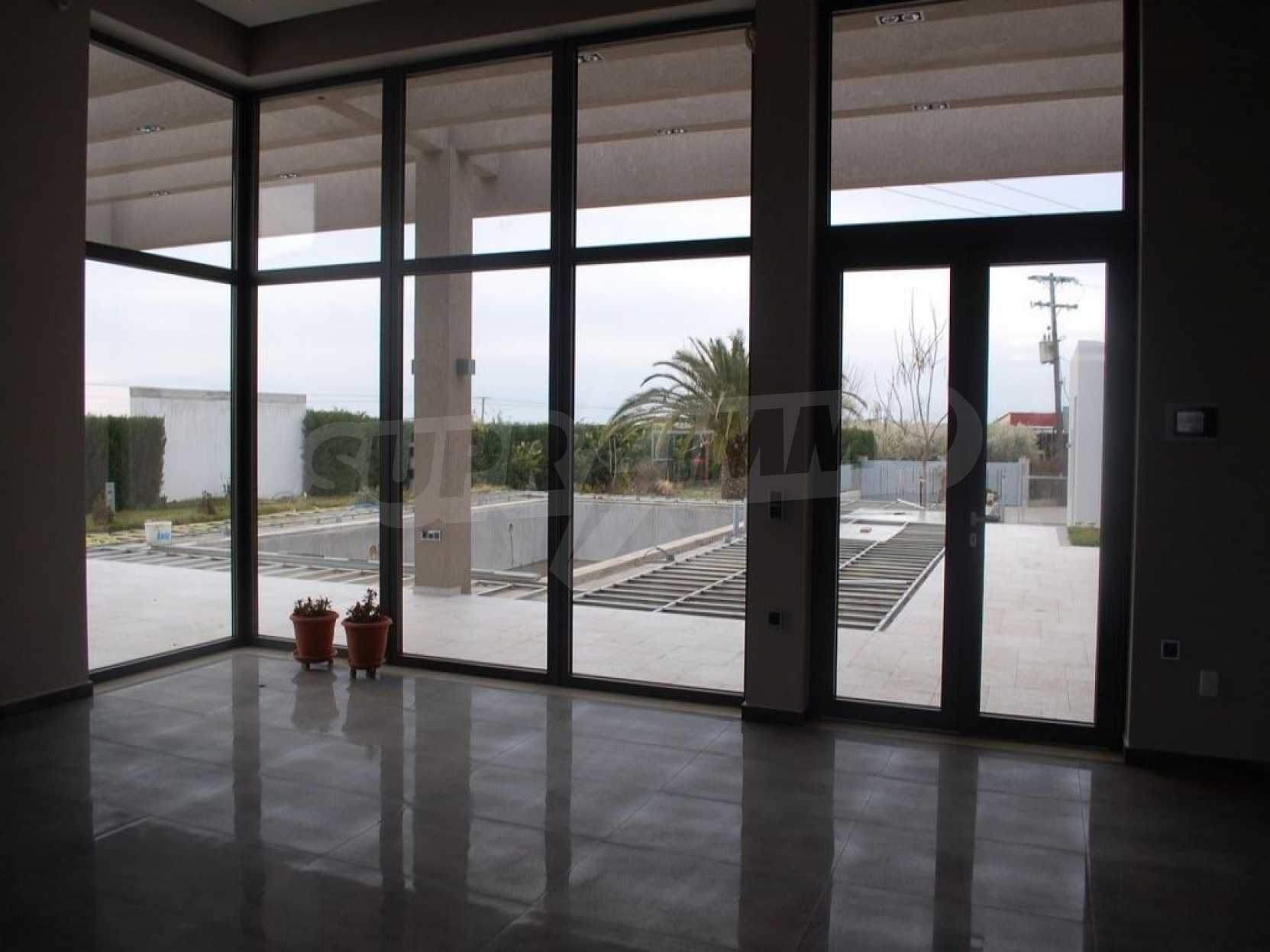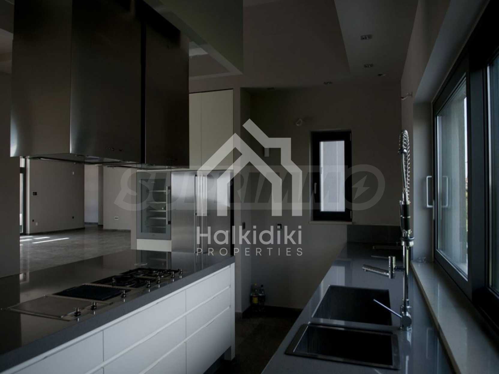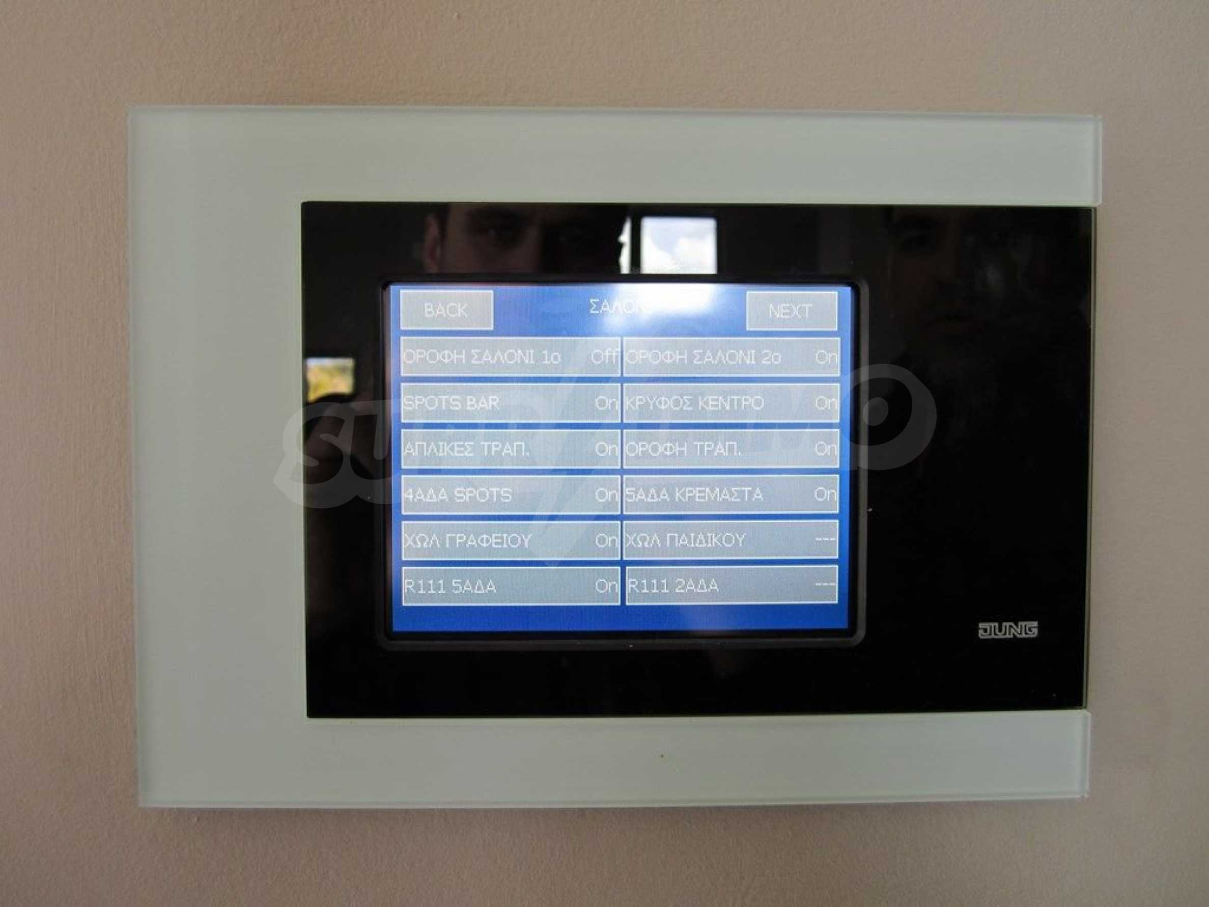 Detached house in Kassandra, Halkidiki. It is a house of unique luxury, very close to the beach. The plot includes three buildings, with their corresponding land. The main building has a floor area 318 sqm and 1, 45 acres of land. The guest house is 47, 3 sqm and 1 acre of land and the storage house is 97, 62 sqm, on the same piece of land. The whole plot has in total 2, 45 acres floor area. The three buildings form a corner, a shape, which creates a cool oasis in the center of the plot, where the swimming pool and a variety of trees are located. This carefully designed architecture maintains the privacy of the yard, not only by indiscreet eyes, but also from any unpleasant weather conditions, such as northern wind. The main house consists of three large bedrooms, three bathrooms, a storage room, four parking lots and garage for two vehicles. It is equipped with automated vacuum system and fully automatic cupboards, heat pump system and CCTV system, as long as fingerprint – functioning security door. This house constitutes the epitome of a smart house!