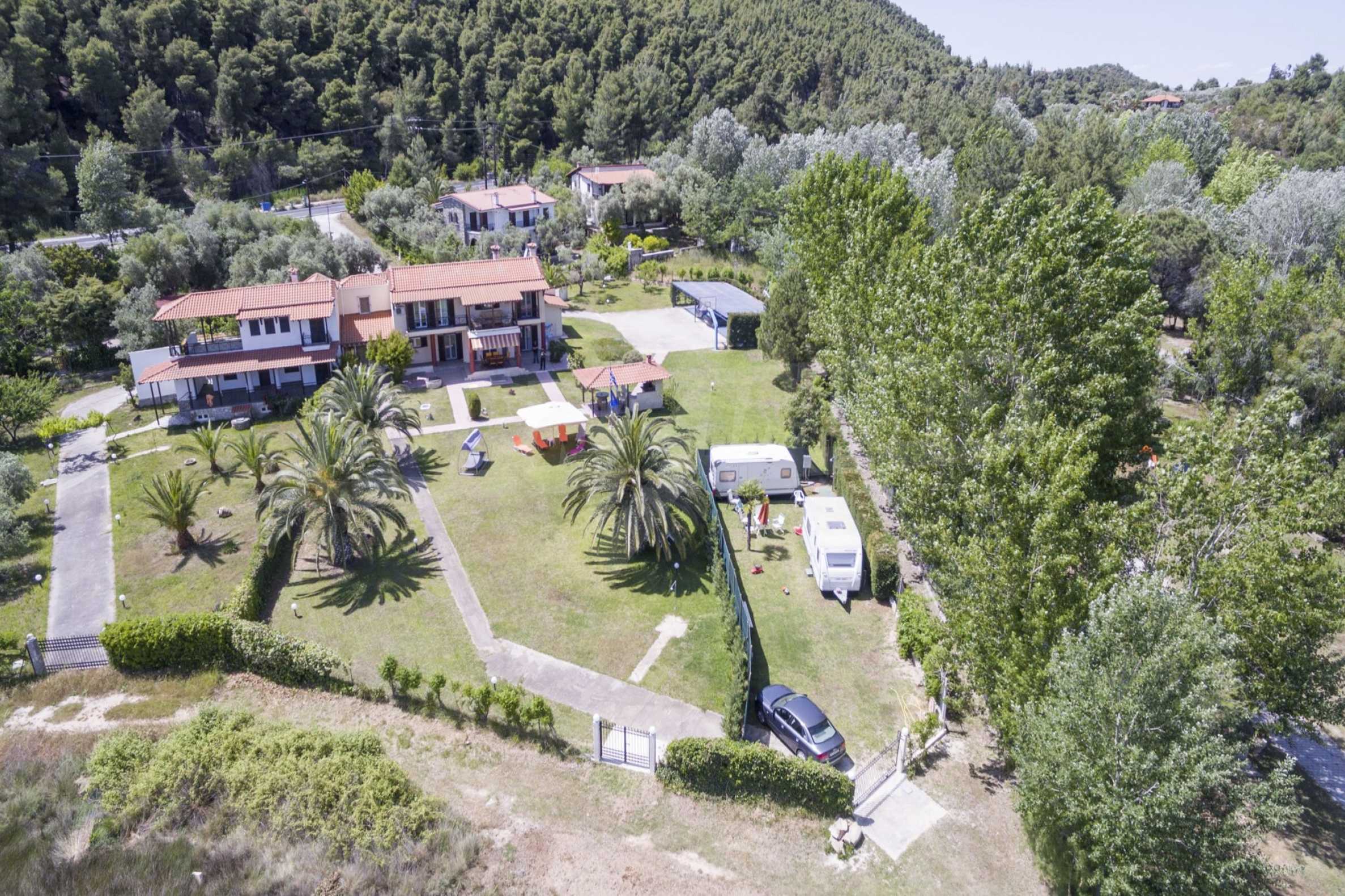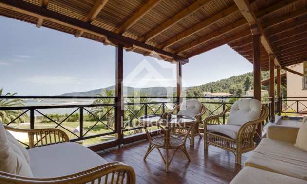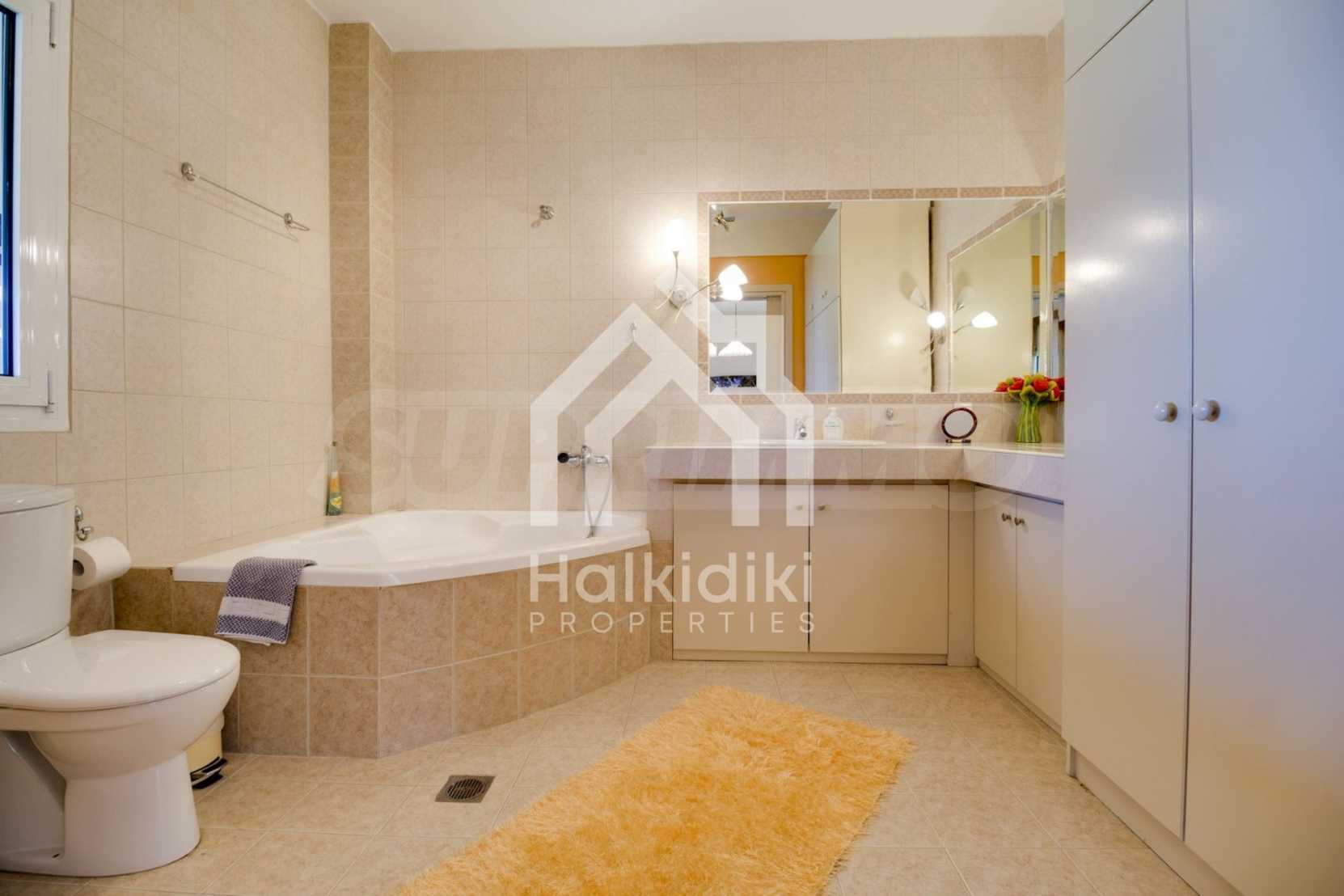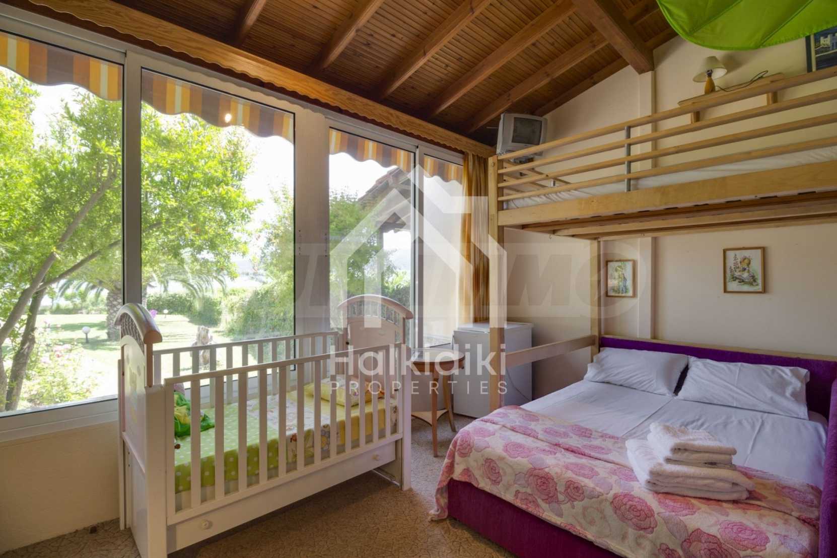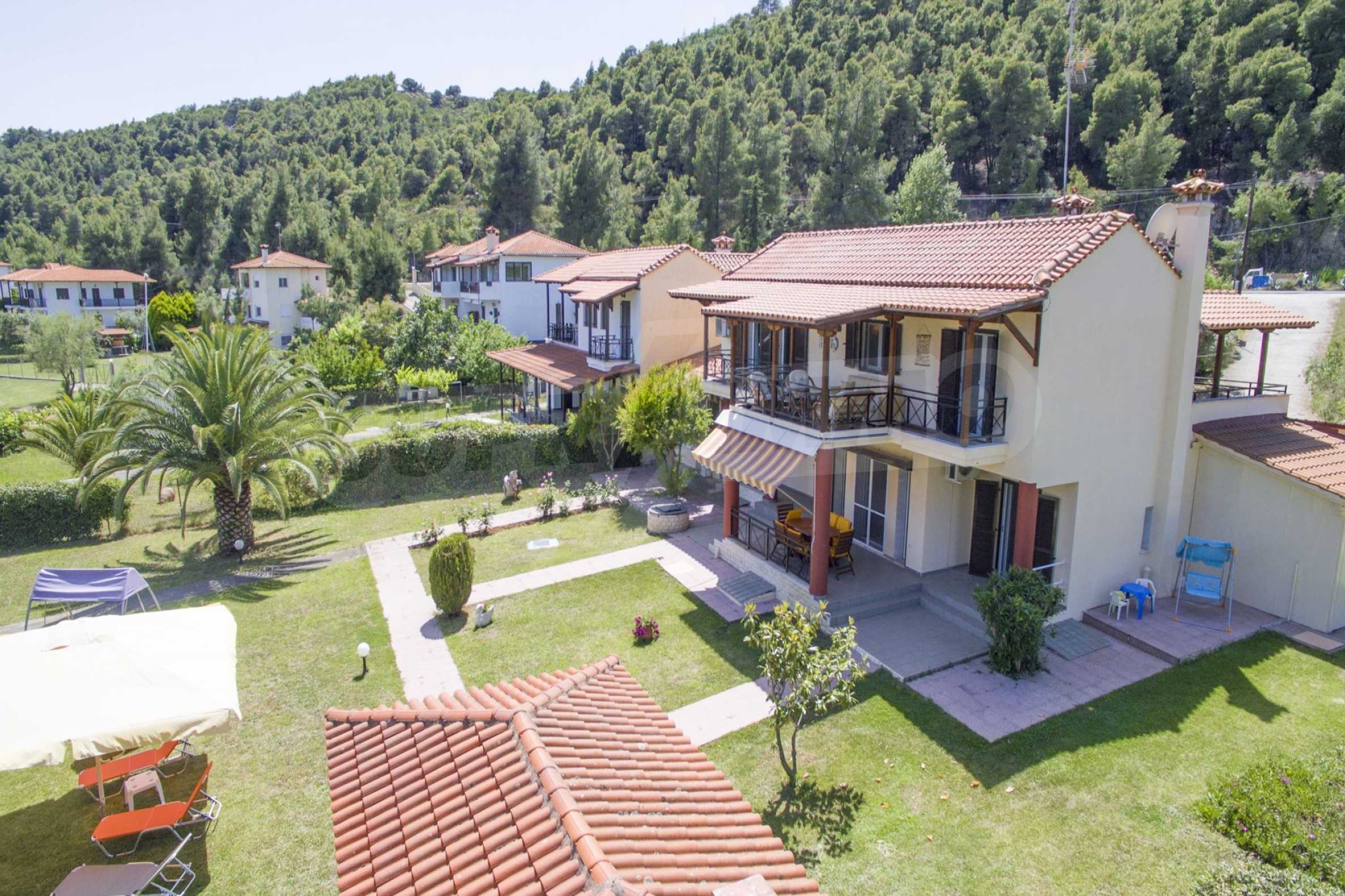 Luxurious detached house in Sithonia, Halkidiki, just in front of the beach, with amazing view to the sea and the mountains. The house consists of three floors and includes two living rooms, kitchen, five bedrooms and four bathrooms. The house has all the appliances, fitted closets, alarm system and mosquito nets in every window. It is built on a piece of land which covers 3.500 sqm. The garden is lovely groomed and has a lot of trees, such as palm trees and lemoncypresses. Also there is a kitchen with barbeque, an autonomus guest house (40 sqm), a well and six covered parking lots