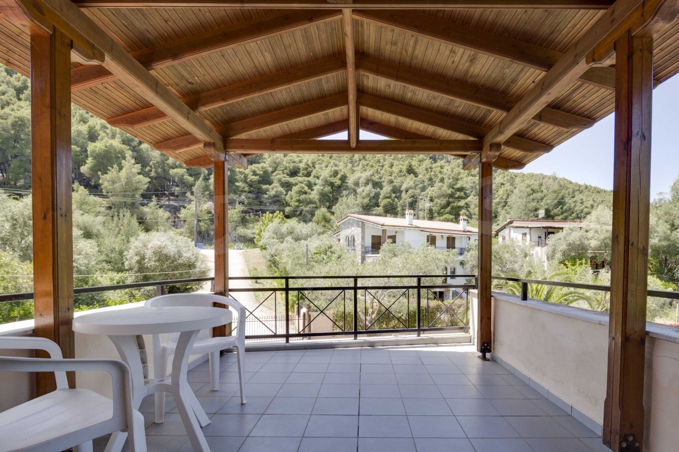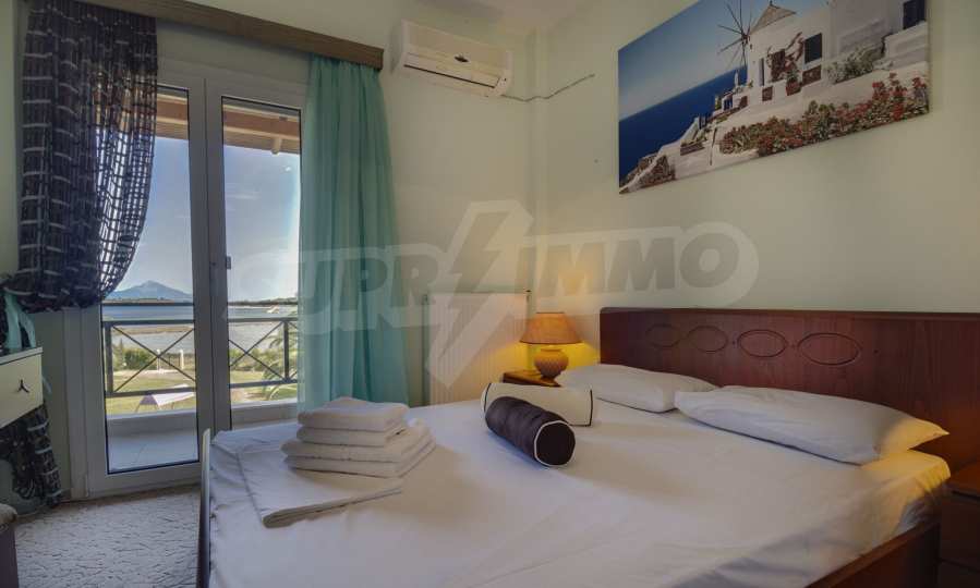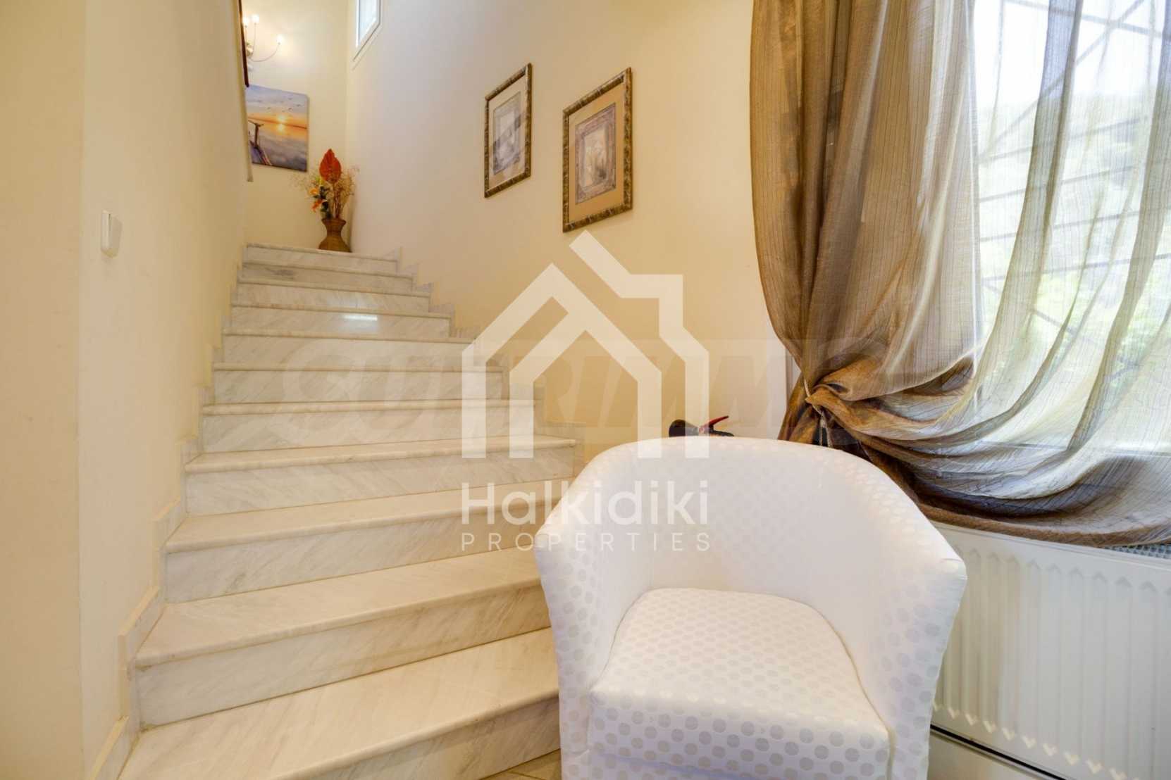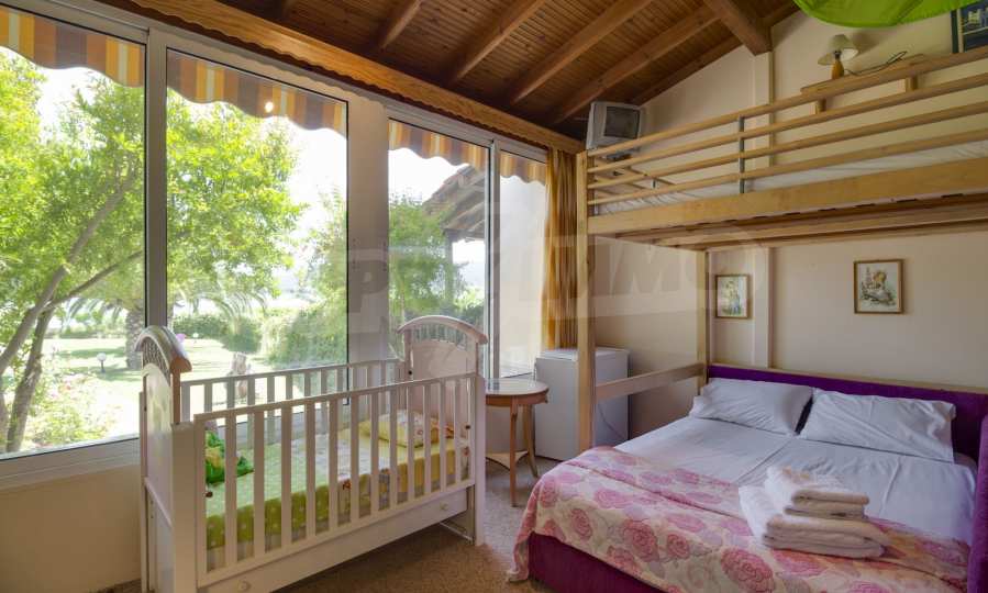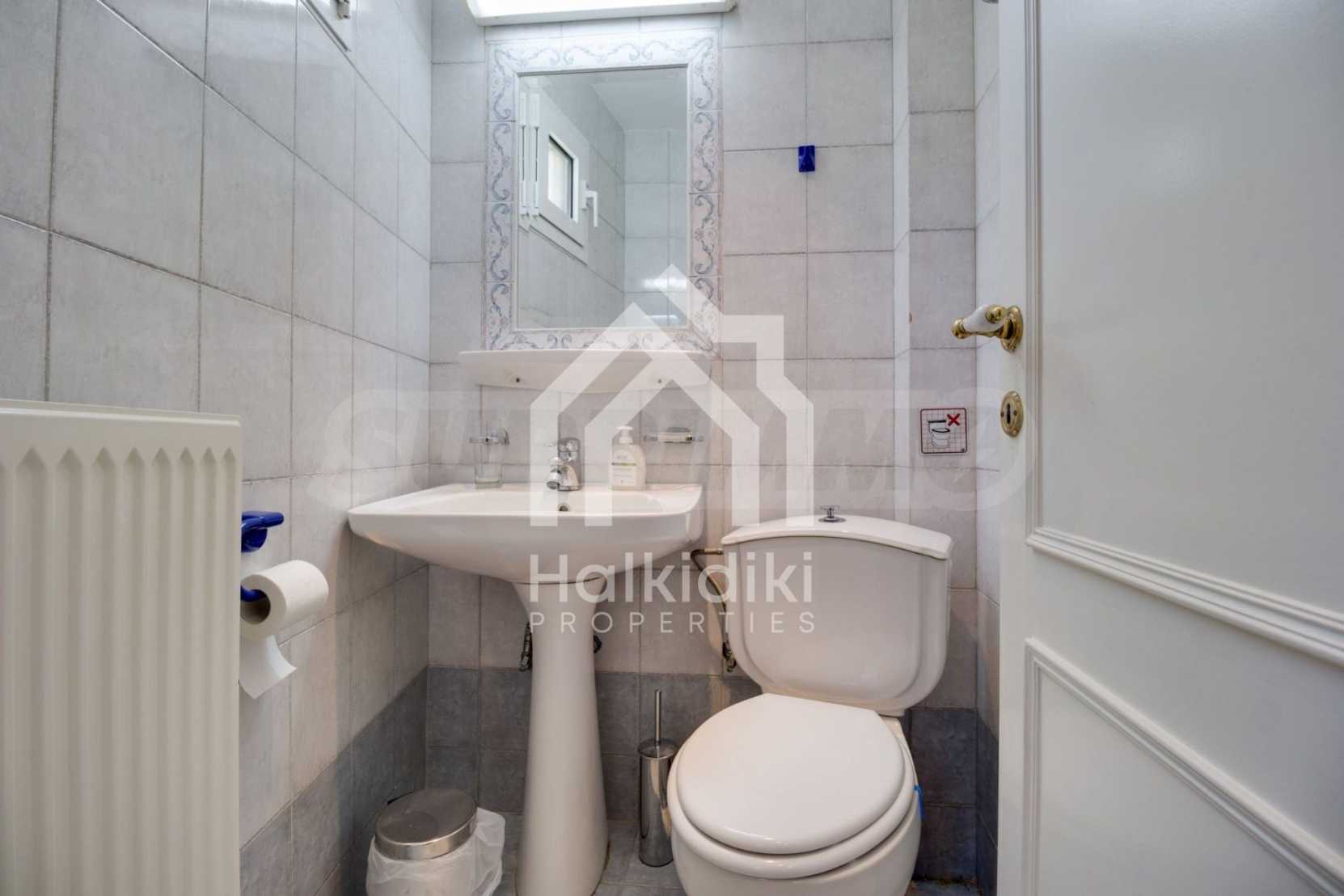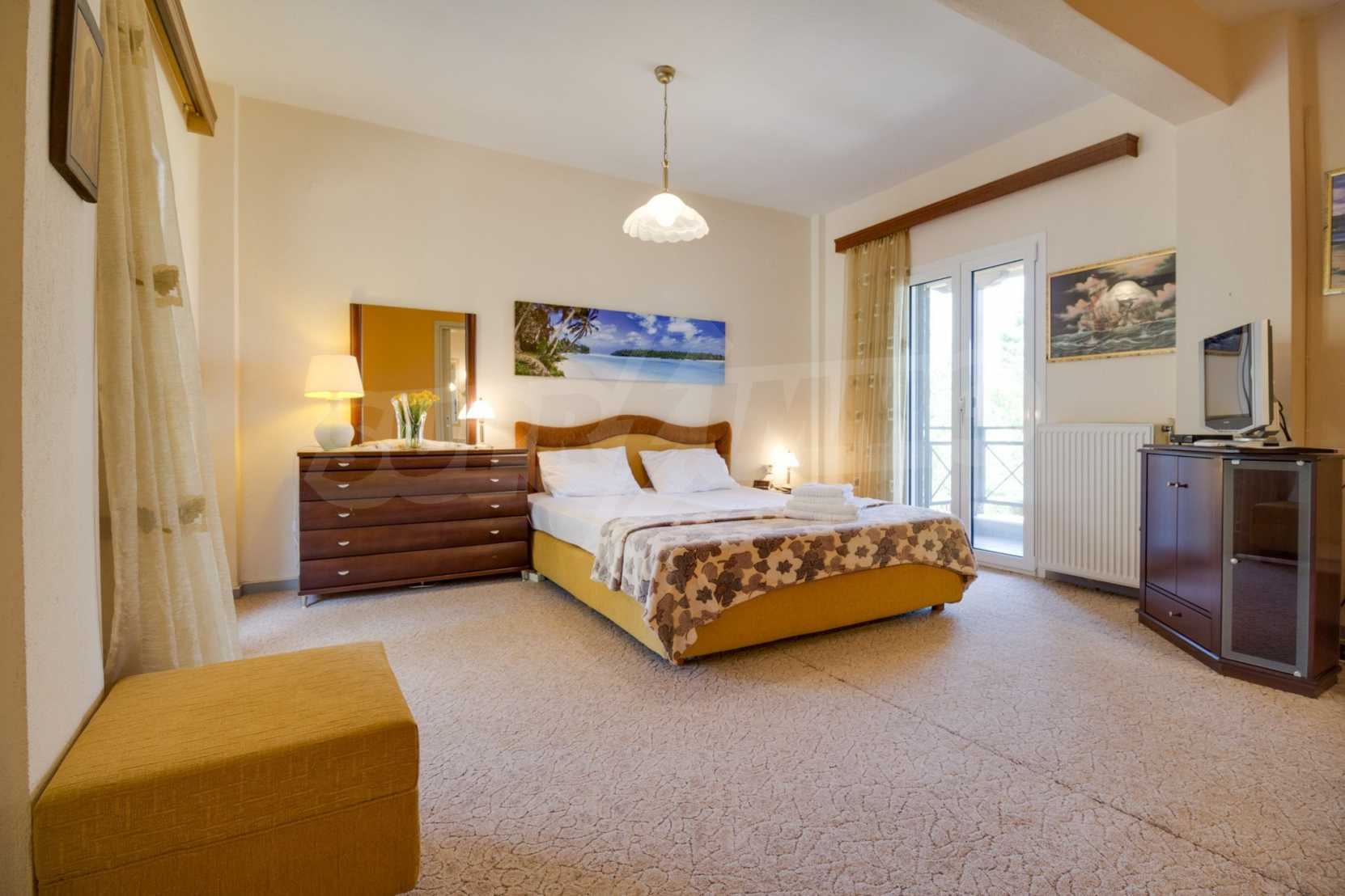 Luxurious detached house in Sithonia, Halkidiki, just in front of the beach, with amazing view to the sea and the mountains. The house consists of three floors and includes two living rooms, kitchen, five bedrooms and four bathrooms. The house has all the appliances, fitted closets, alarm system and mosquito nets in every window. It is built on a piece of land which covers 3.500 sqm. The garden is lovely groomed and has a lot of trees, such as palm trees and lemoncypresses. Also there is a kitchen with barbeque, an autonomus guest house (40 sqm), a well and six covered parking lots