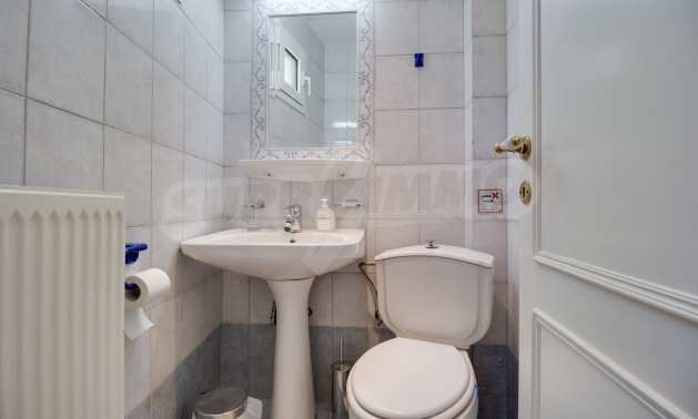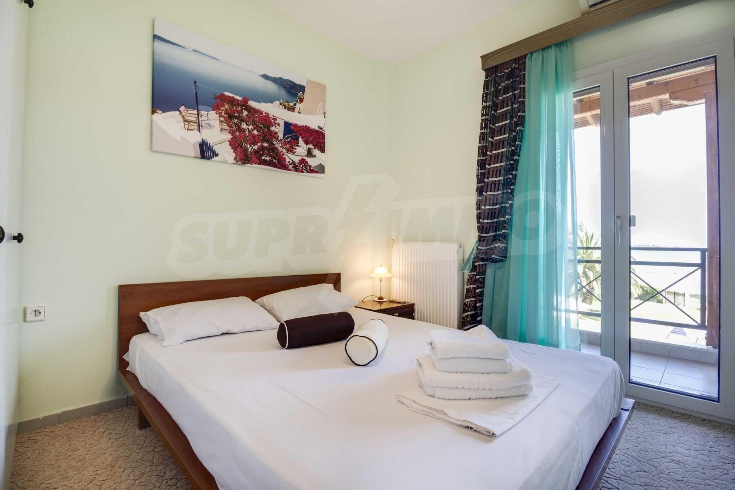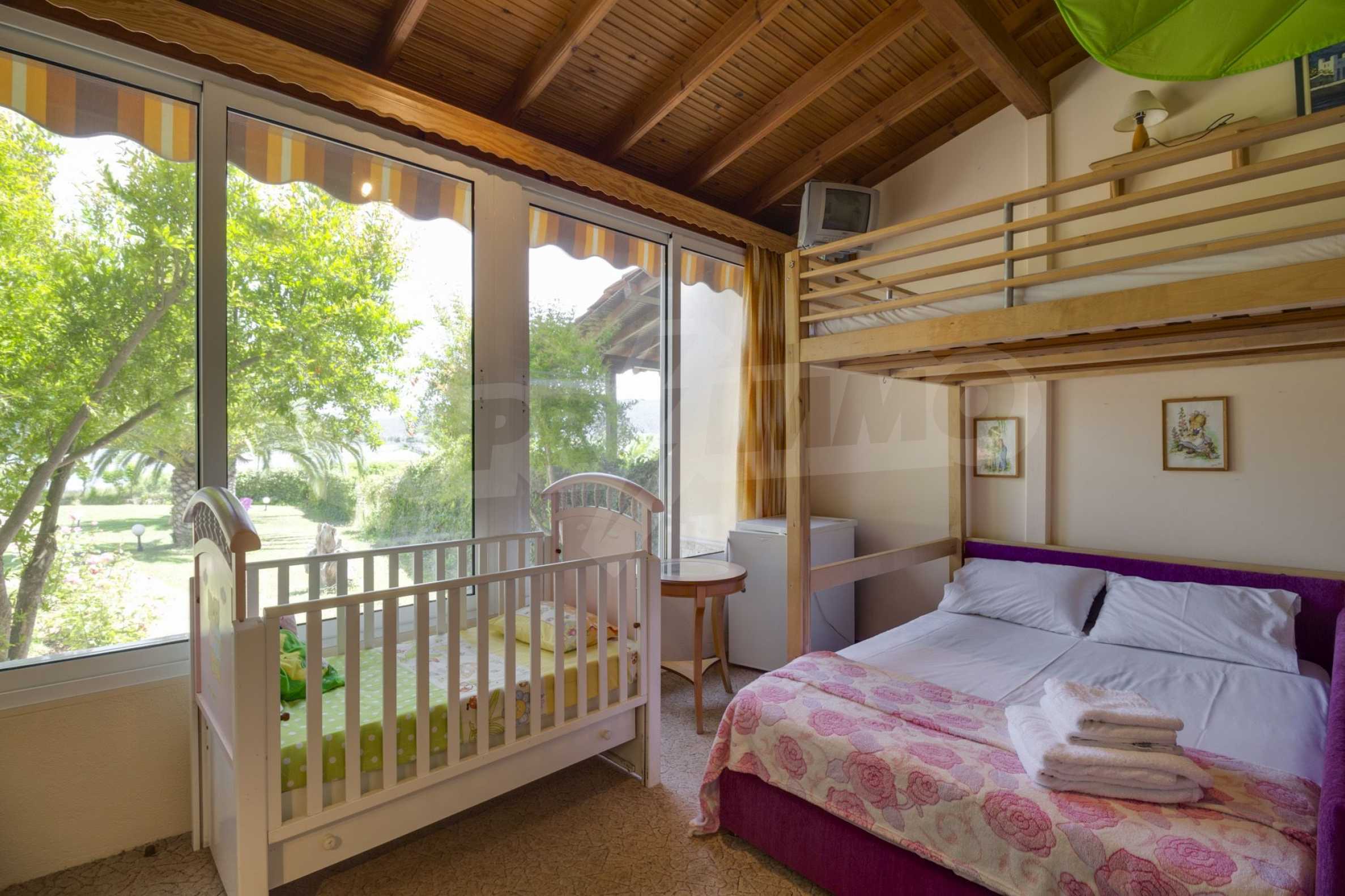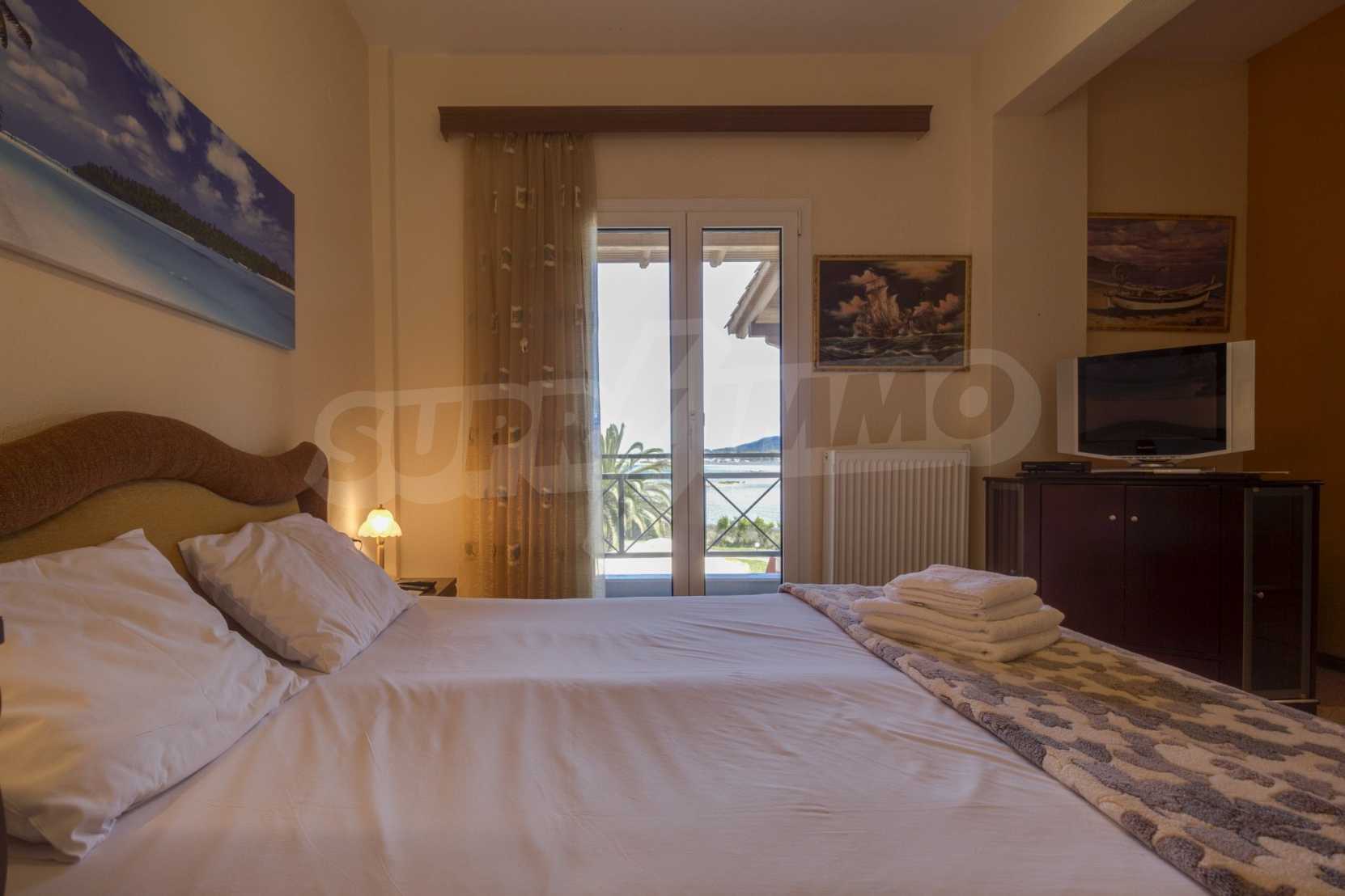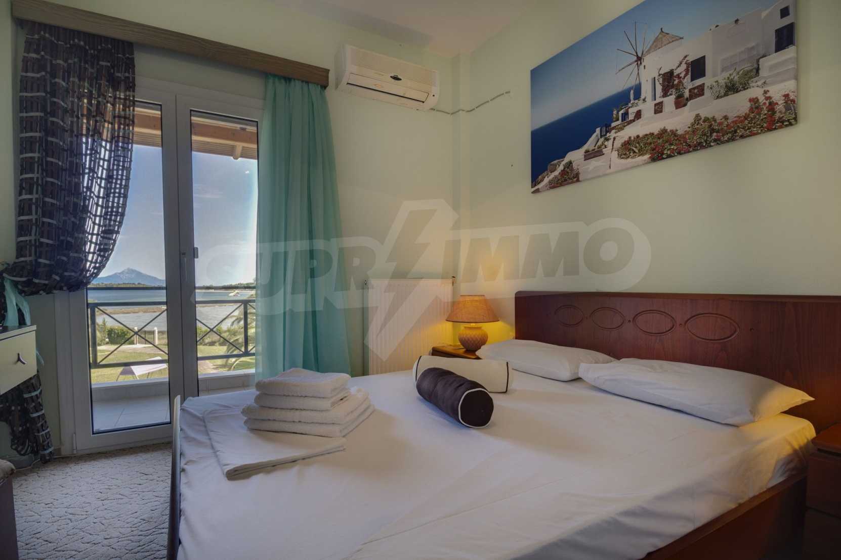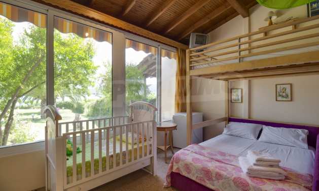 Luxurious detached house in Sithonia, Halkidiki, just in front of the beach, with amazing view to the sea and the mountains. The house consists of three floors and includes two living rooms, kitchen, five bedrooms and four bathrooms. The house has all the appliances, fitted closets, alarm system and mosquito nets in every window. It is built on a piece of land which covers 3.500 sqm. The garden is lovely groomed and has a lot of trees, such as palm trees and lemoncypresses. Also there is a kitchen with barbeque, an autonomus guest house (40 sqm), a well and six covered parking lots