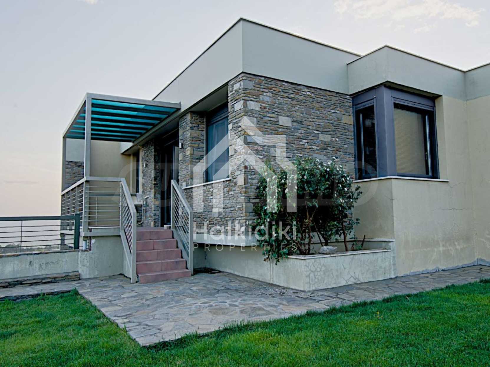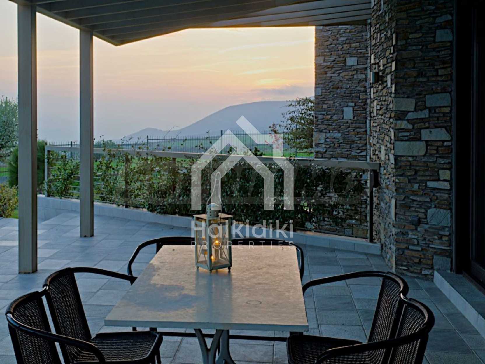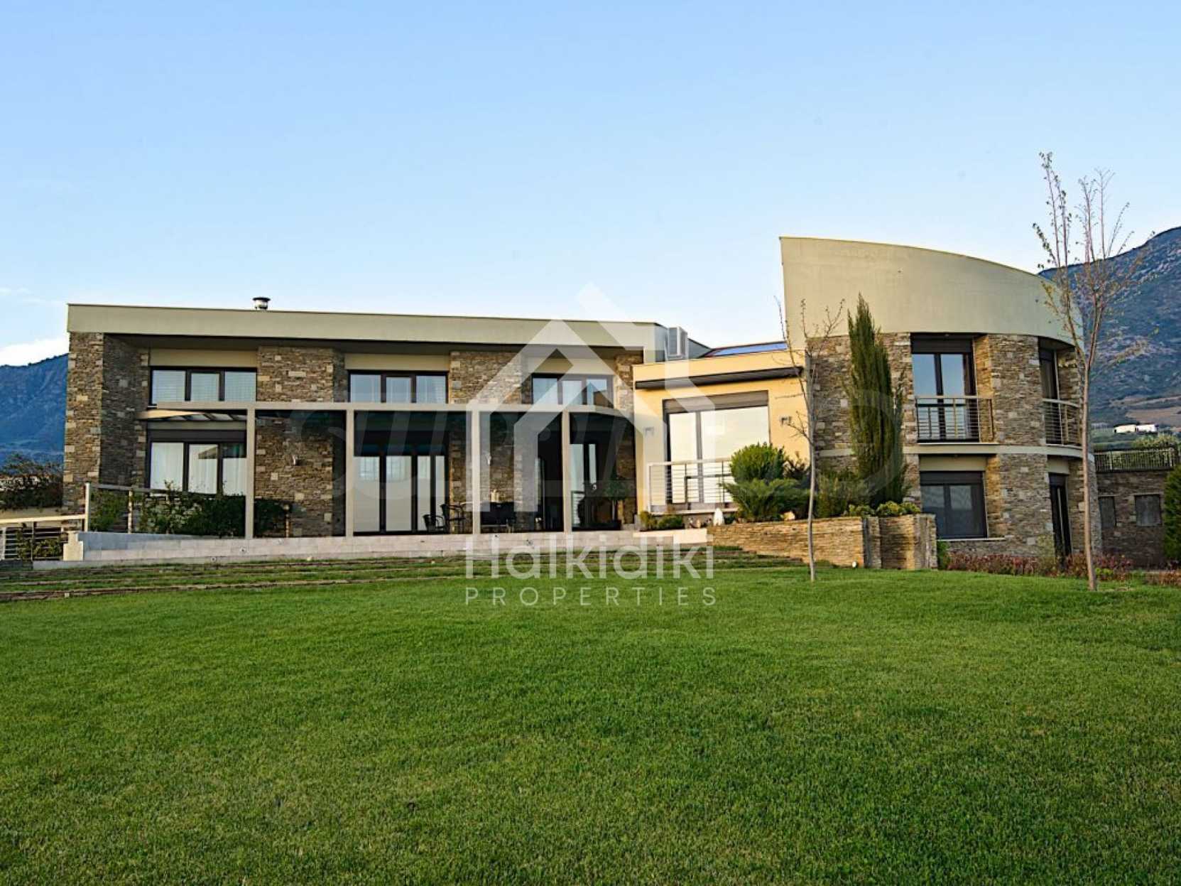 Villa, Poligiros, 450 m, open view, Eastern orientation, Unobstructed permanent view, Open field, Exclusive beachfront access, Outside village, Mountain view, Southern orientation, Panoramic, Fenced, Parking, Automated watering, Drilling inside, Water tanks, Modeled outside spaces, Satelite antenna, Olive field inside, Fitted closets, Fitted kitchenware, Appliances, Heater/boiler, Video doorphone, Garage, Spacious garden, Window screens, Alarm system pre-installation, Tents, Fireplace, Water massage - jacuzzi, No V.A.T., Independent single house, Independent single house in complex, Granite floors, Airy, Can be separated into two houses, Aluminum joinery, Big balconies, Stone-built, Luxurious, Modern construction, High ceiling