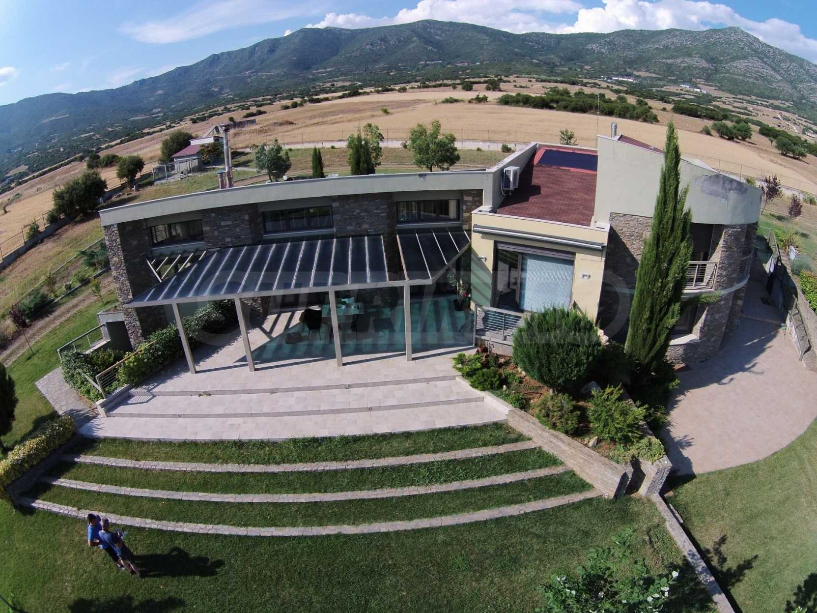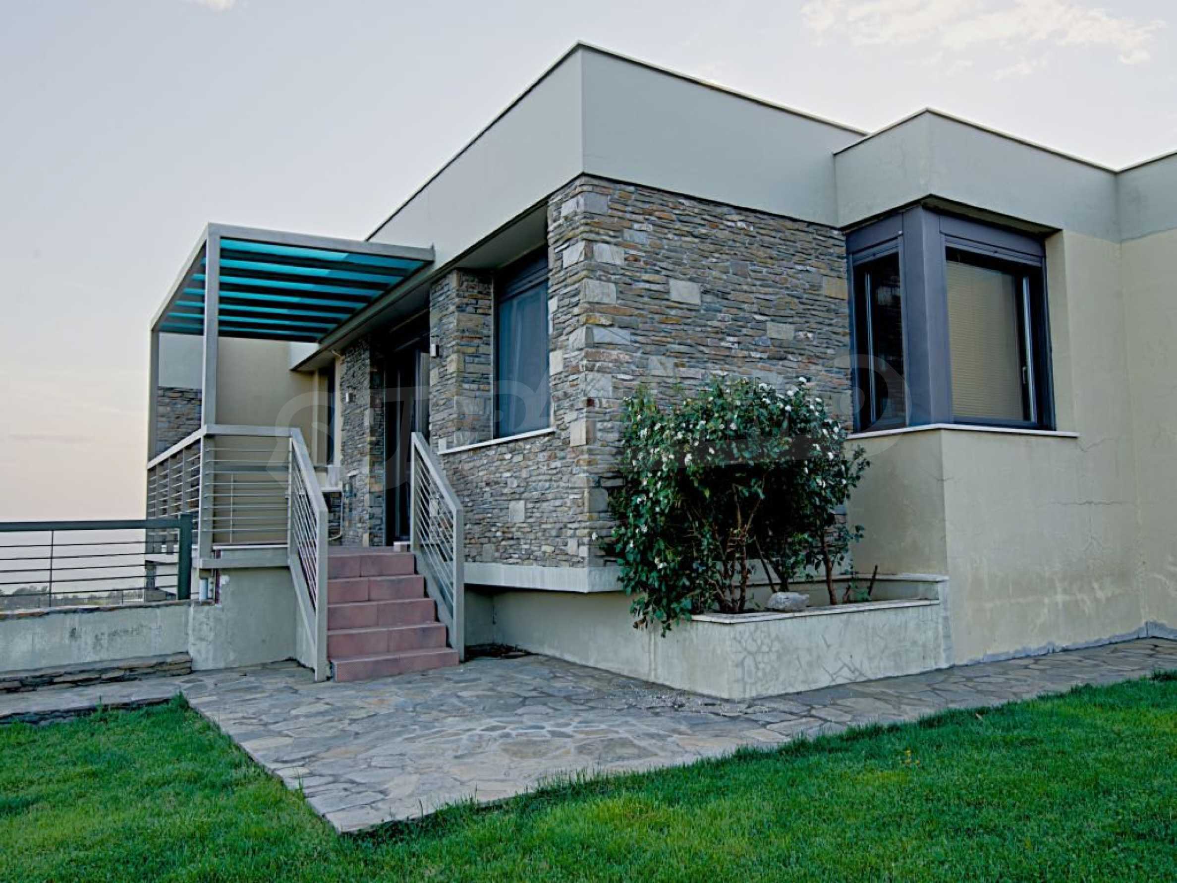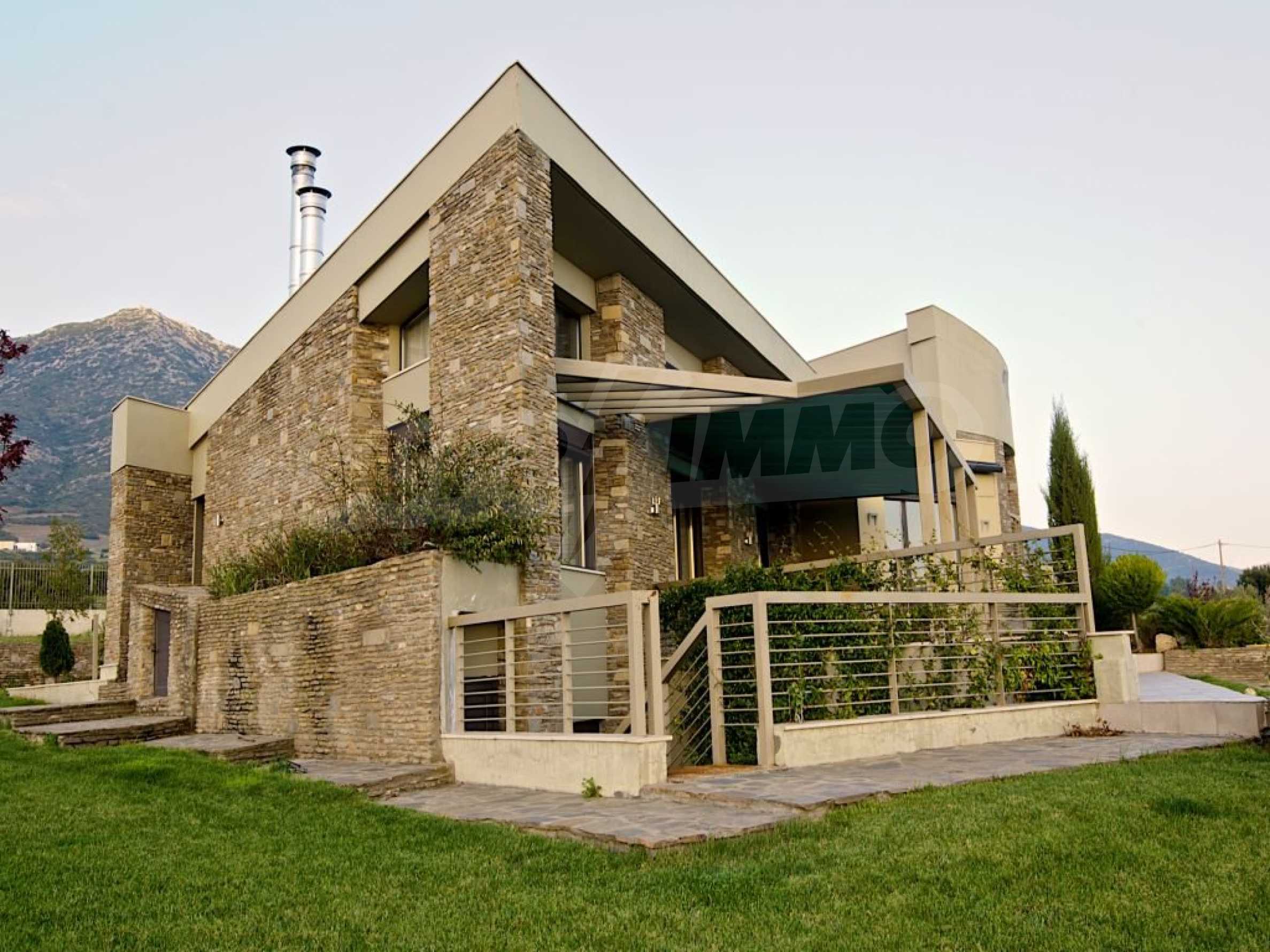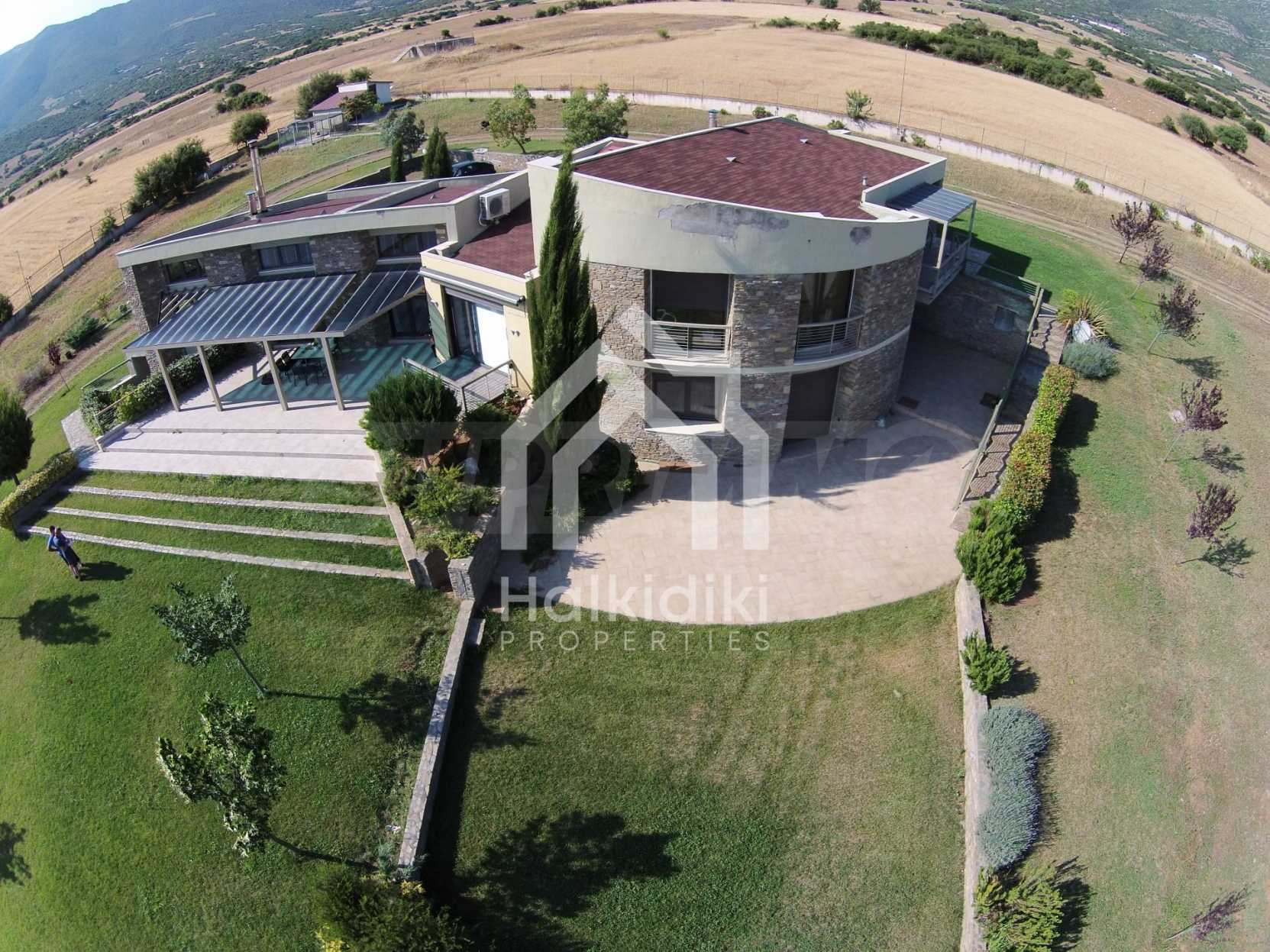 Villa, Poligiros, 450 m, open view, Eastern orientation, Unobstructed permanent view, Open field, Exclusive beachfront access, Outside village, Mountain view, Southern orientation, Panoramic, Fenced, Parking, Automated watering, Drilling inside, Water tanks, Modeled outside spaces, Satelite antenna, Olive field inside, Fitted closets, Fitted kitchenware, Appliances, Heater/boiler, Video doorphone, Garage, Spacious garden, Window screens, Alarm system pre-installation, Tents, Fireplace, Water massage - jacuzzi, No V.A.T., Independent single house, Independent single house in complex, Granite floors, Airy, Can be separated into two houses, Aluminum joinery, Big balconies, Stone-built, Luxurious, Modern construction, High ceiling