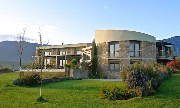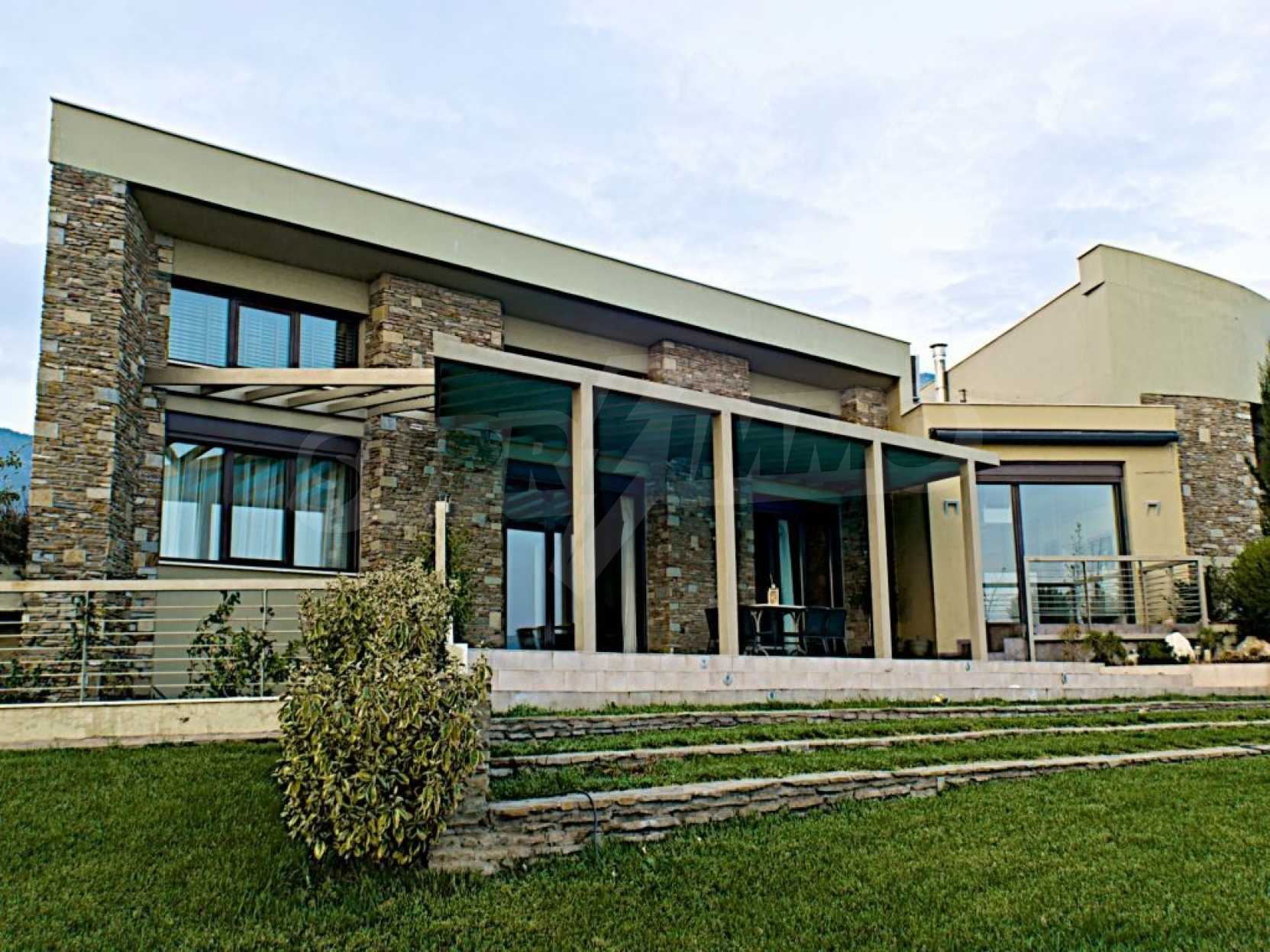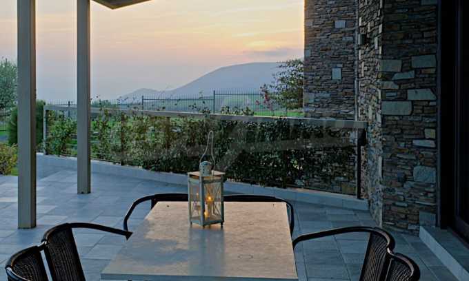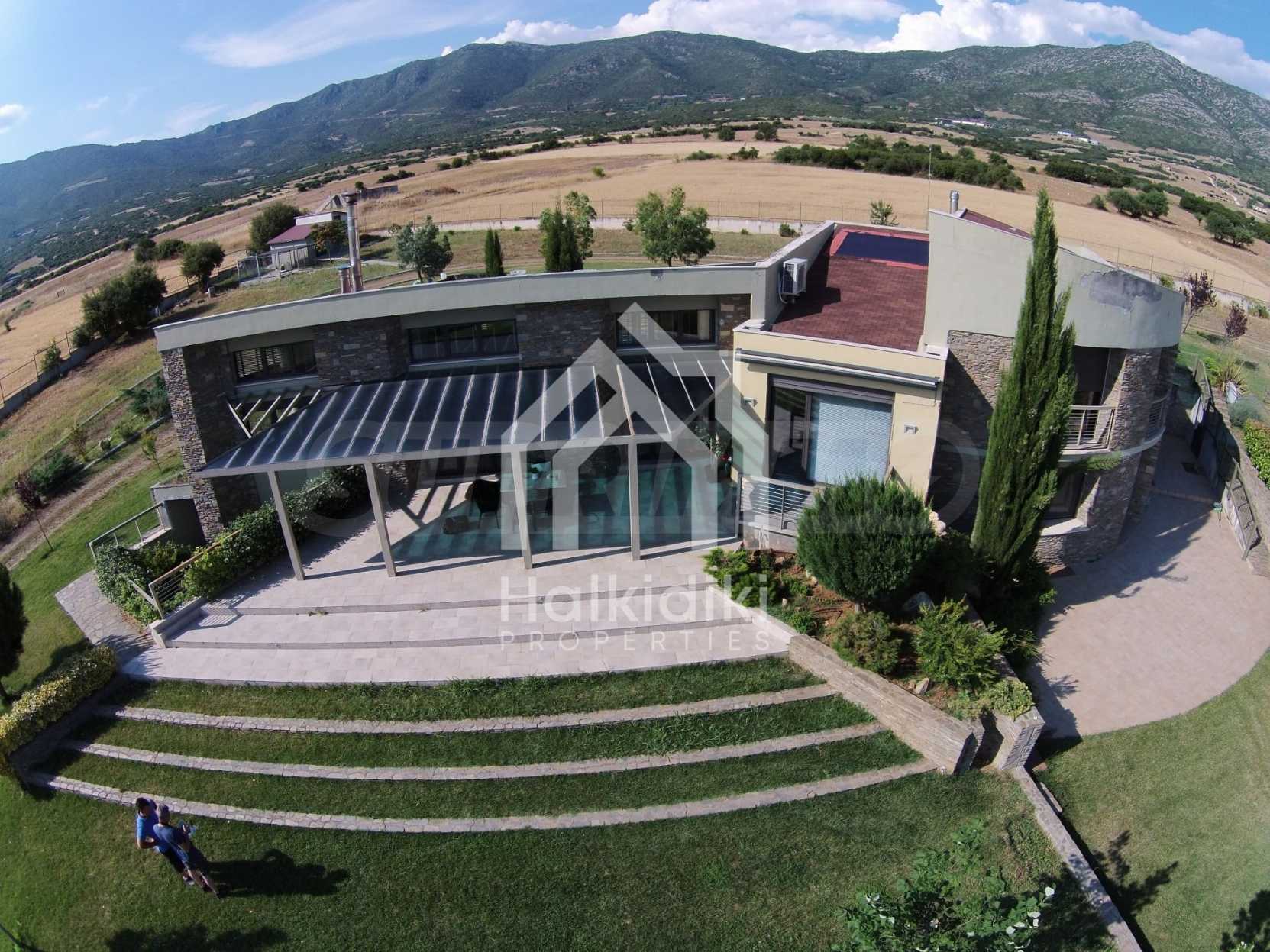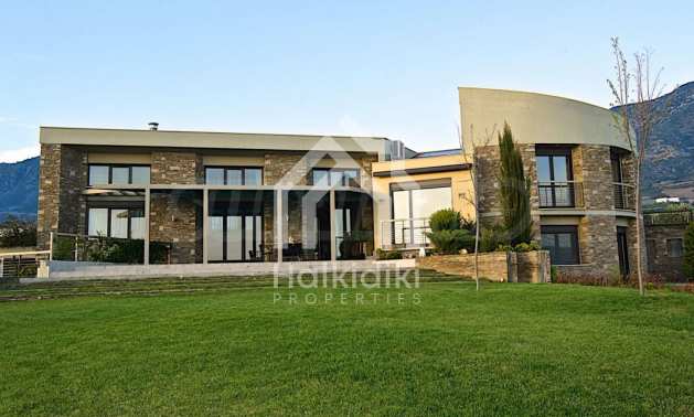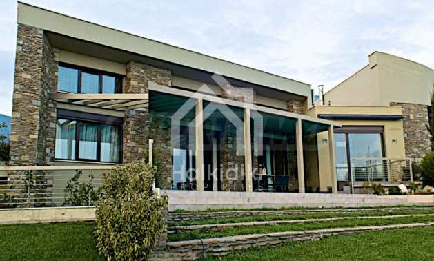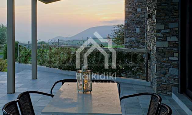 Villa, Poligiros, 450 m, open view, Eastern orientation, Unobstructed permanent view, Open field, Exclusive beachfront access, Outside village, Mountain view, Southern orientation, Panoramic, Fenced, Parking, Automated watering, Drilling inside, Water tanks, Modeled outside spaces, Satelite antenna, Olive field inside, Fitted closets, Fitted kitchenware, Appliances, Heater/boiler, Video doorphone, Garage, Spacious garden, Window screens, Alarm system pre-installation, Tents, Fireplace, Water massage - jacuzzi, No V.A.T., Independent single house, Independent single house in complex, Granite floors, Airy, Can be separated into two houses, Aluminum joinery, Big balconies, Stone-built, Luxurious, Modern construction, High ceiling