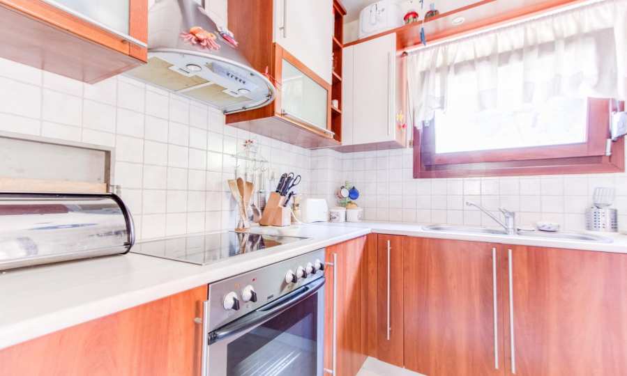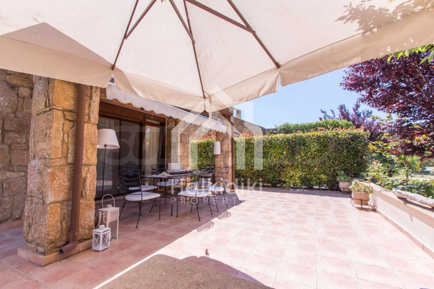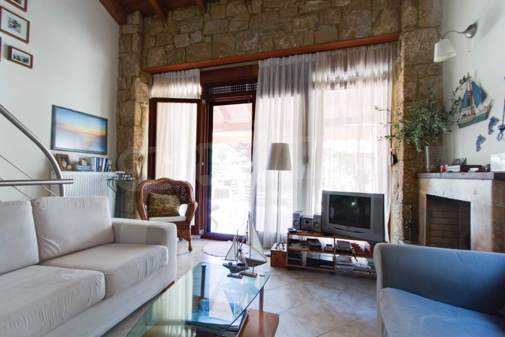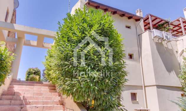 Villa in Kassandra, Halkidiki, 115 sqm. It is very close to the beach and has beautiful view to the garden. Villa is a corner property with parking, automated watering, beautifully landscaped garden next to the pool and is fully furnished and equipped with all the appliances and solar heater. On the garden is a barbecue. Villa has also mosquito nets, alarm system and a fireplace. It is divided in three floors and consists of a living room, kitchen, four bedrooms and three bathrooms.Furthermore,there is a second villa nearby with the same characteristics