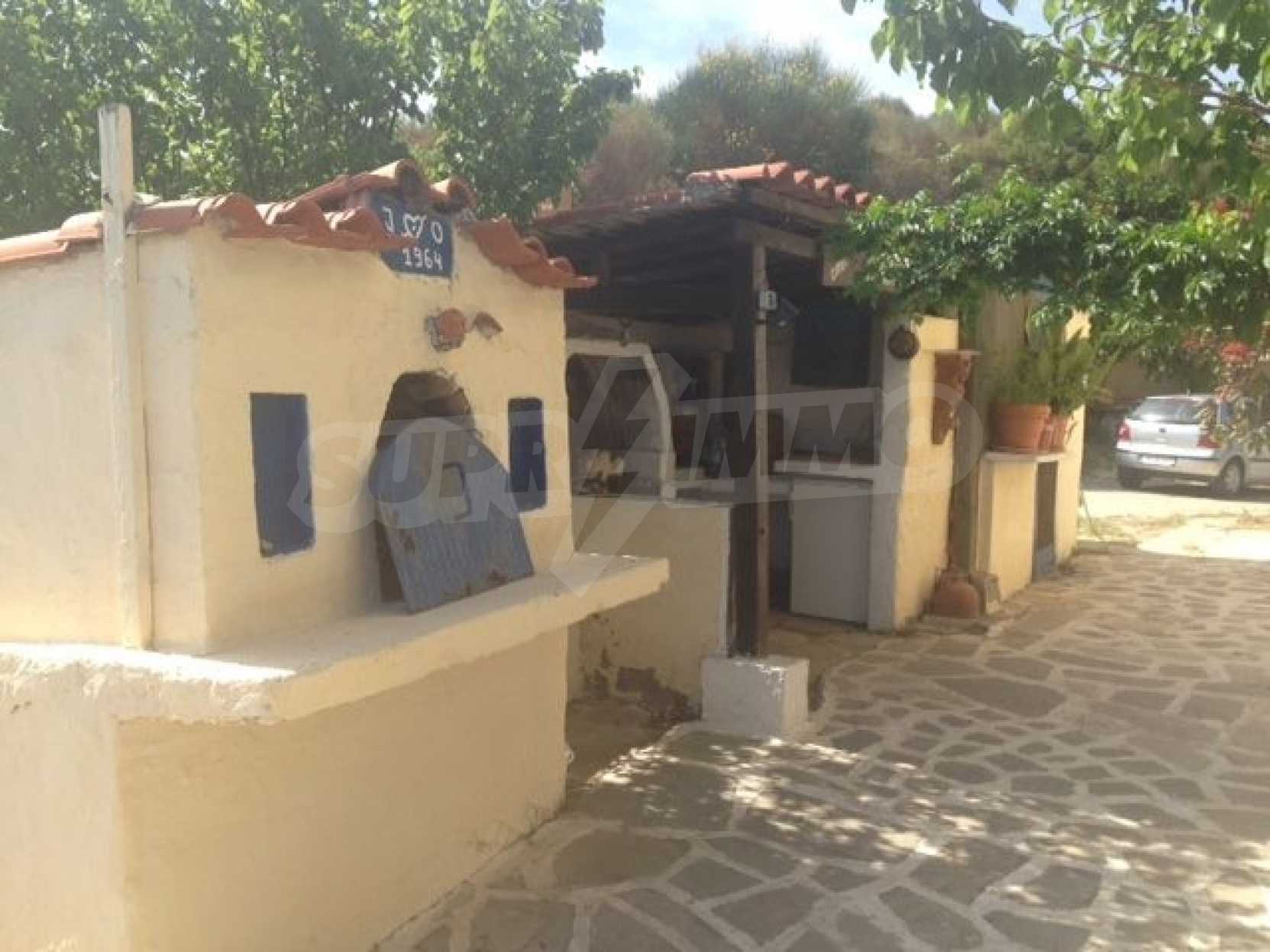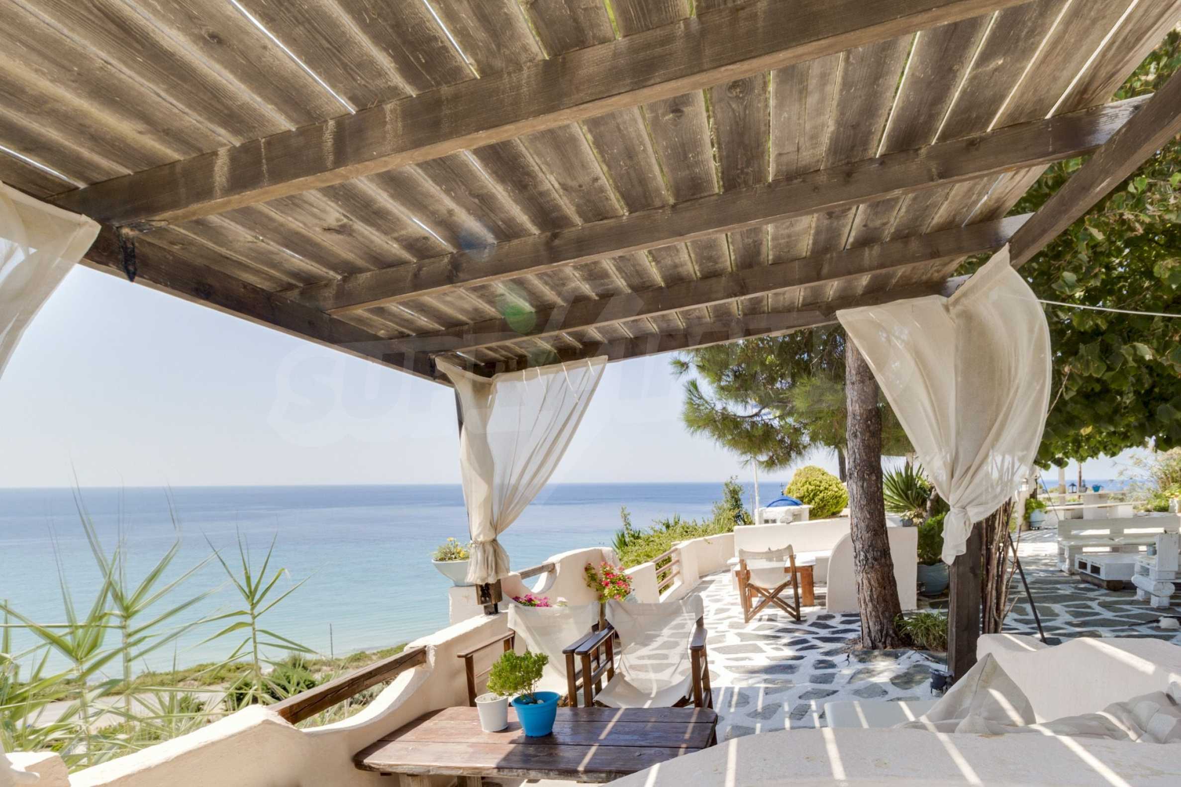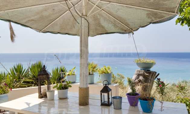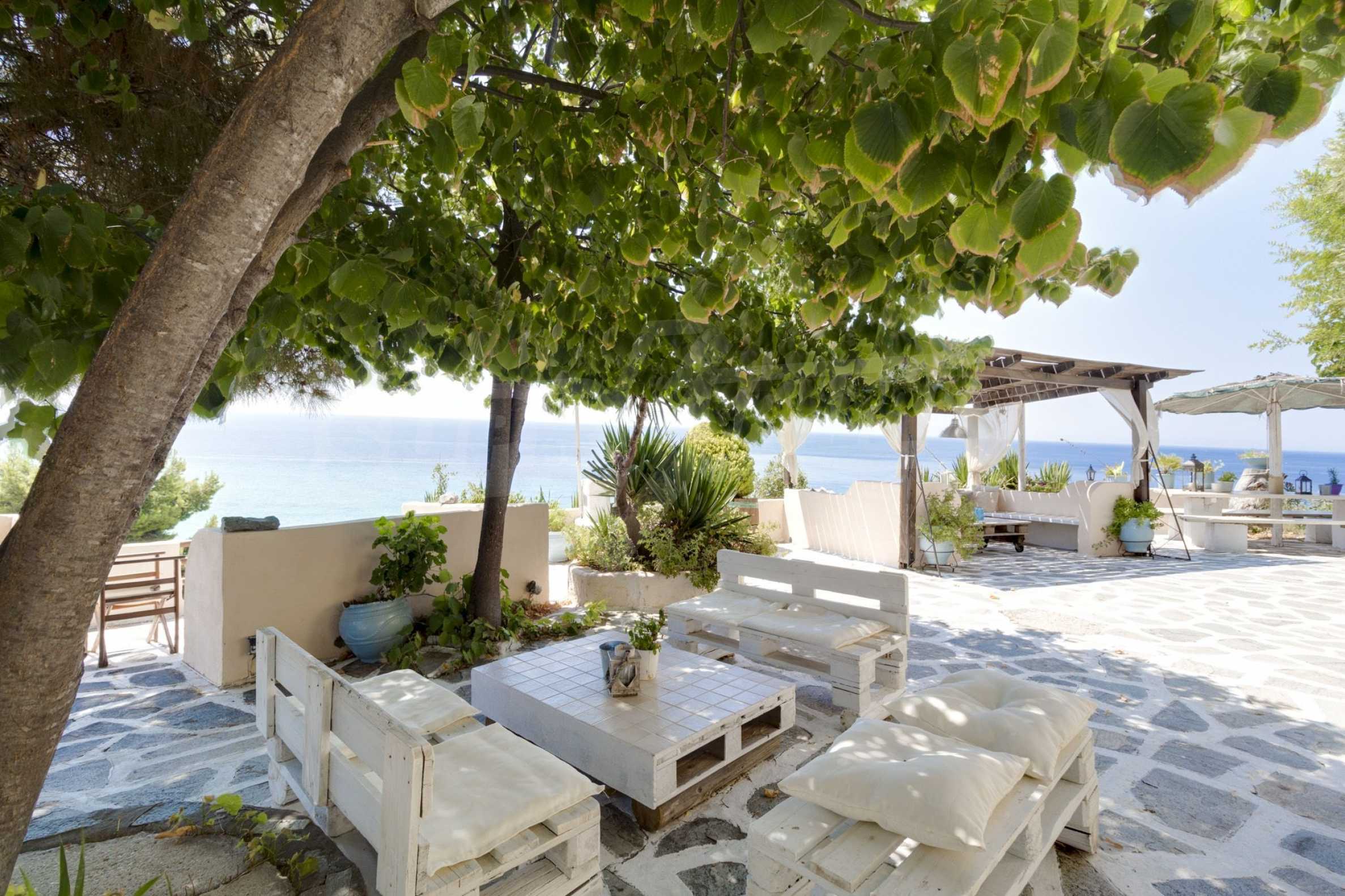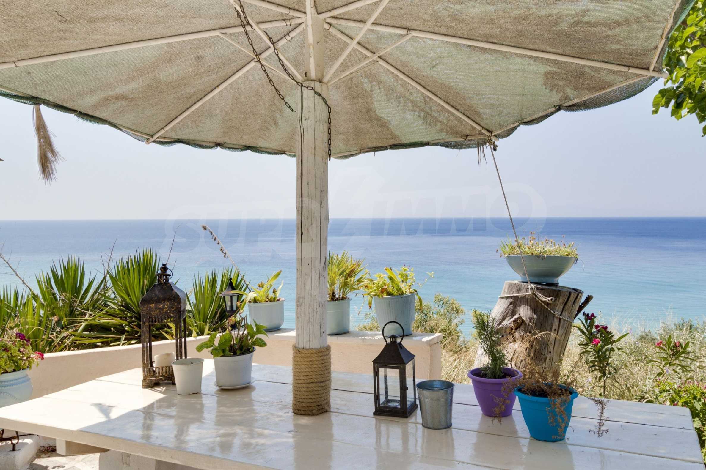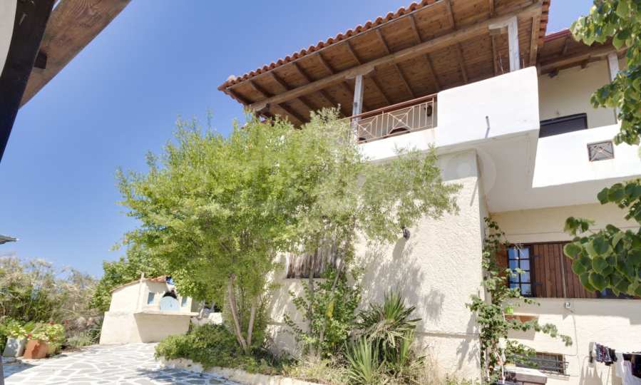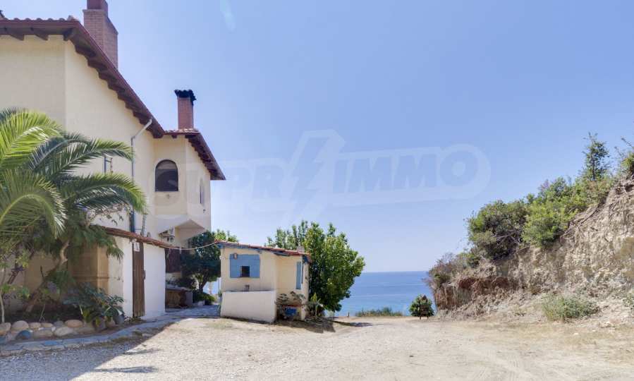 Detached house in Kassandra, Halkidiki, with floor area 390 sqm. It has unique, unobstructed view to the sea and the mountains and eastern orientation. The house is very close to the beach, on a panoramic location with easy access to the sea. It is surrounded by 5 acres fenced garden, exterior kitchen, barbecue, kiosk and a dining table on the garden. The house consists of two levels. On the ground floor there are five independend rooms – studio with living room, kitchen and a bedroom, while next to it there is a two storey maisonette. In total there are ten bedrooms with eight bathrooms and a toilet.
