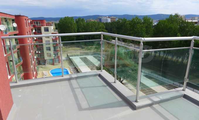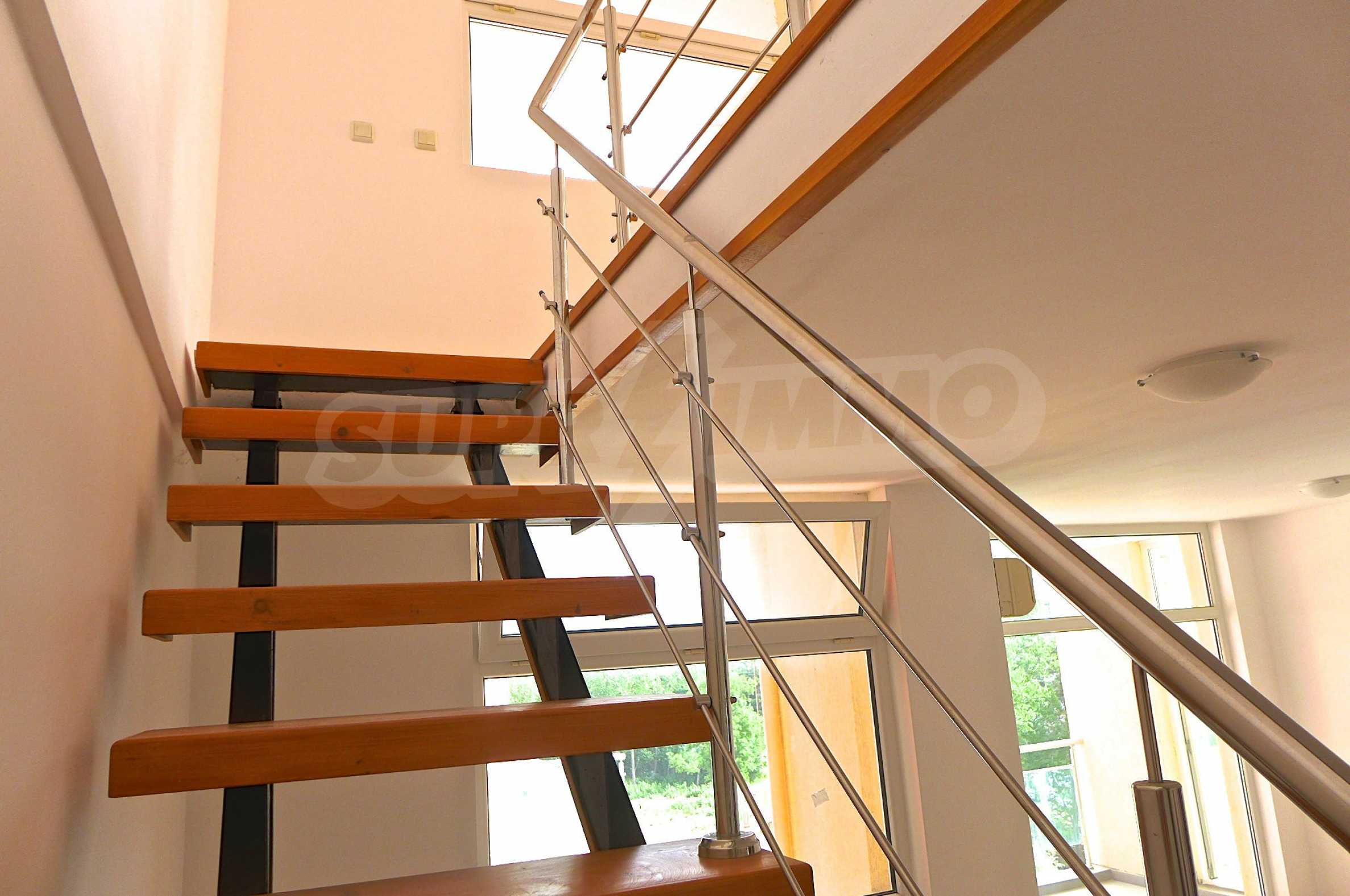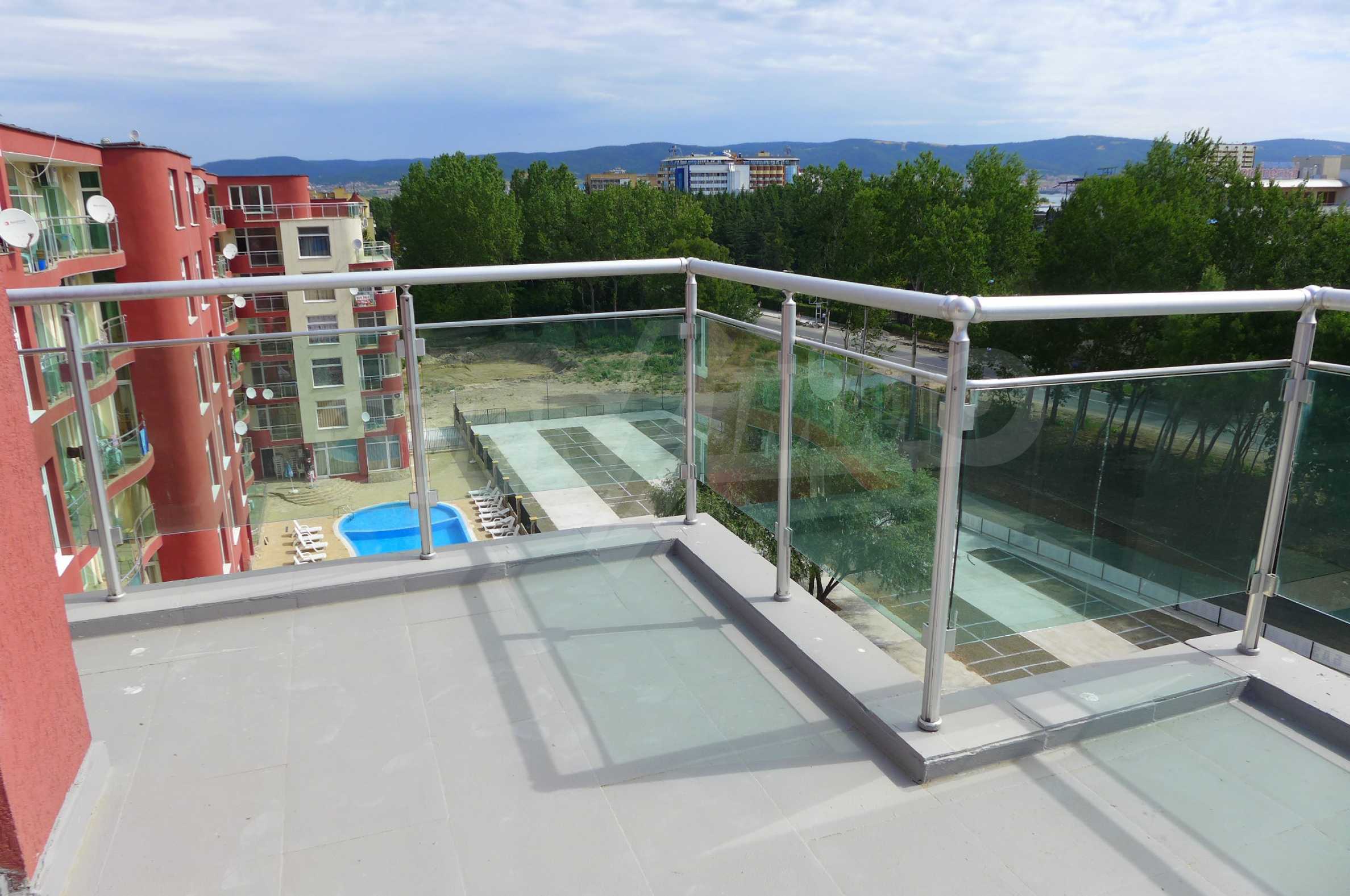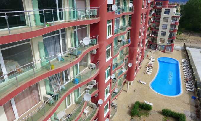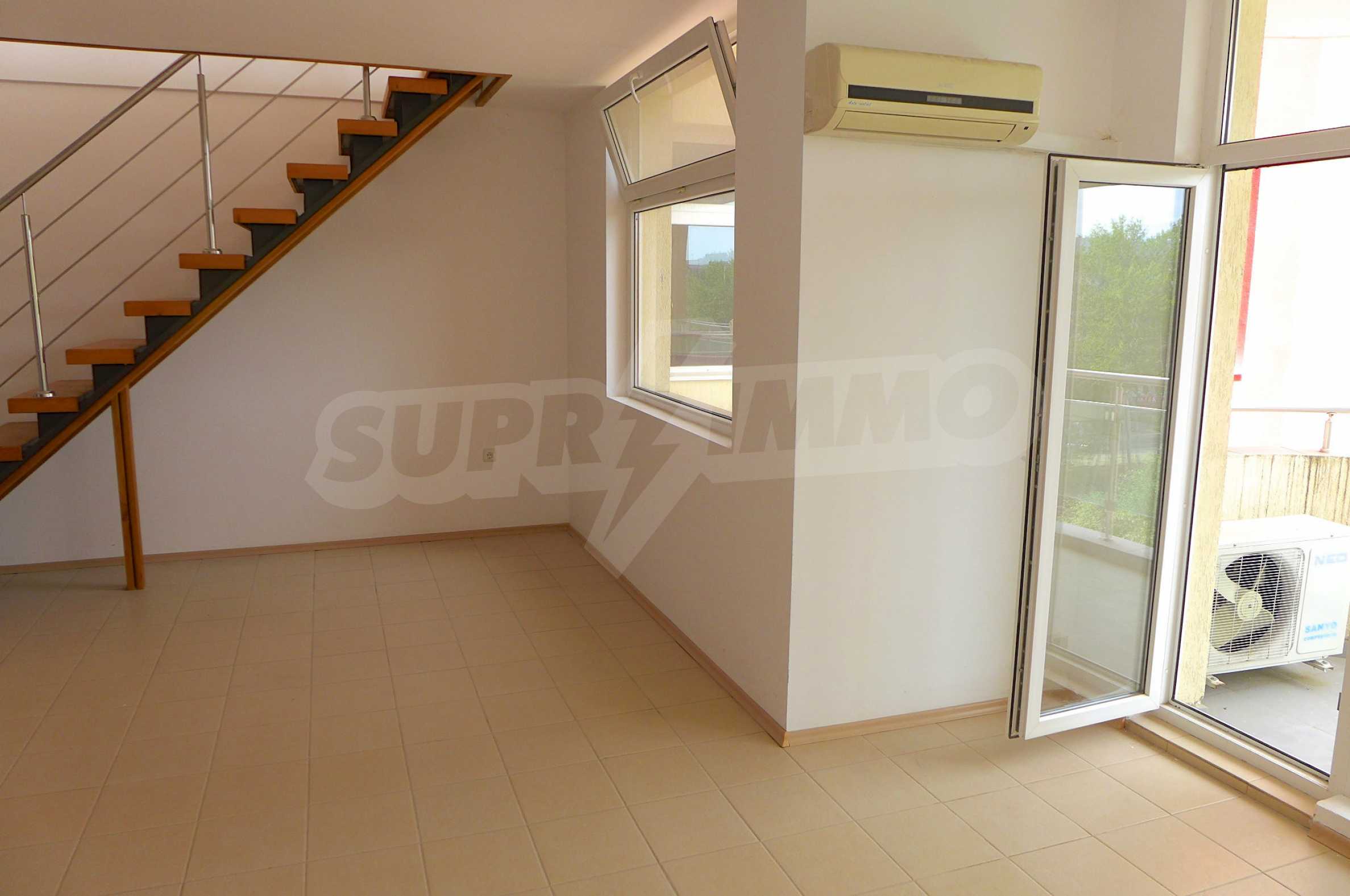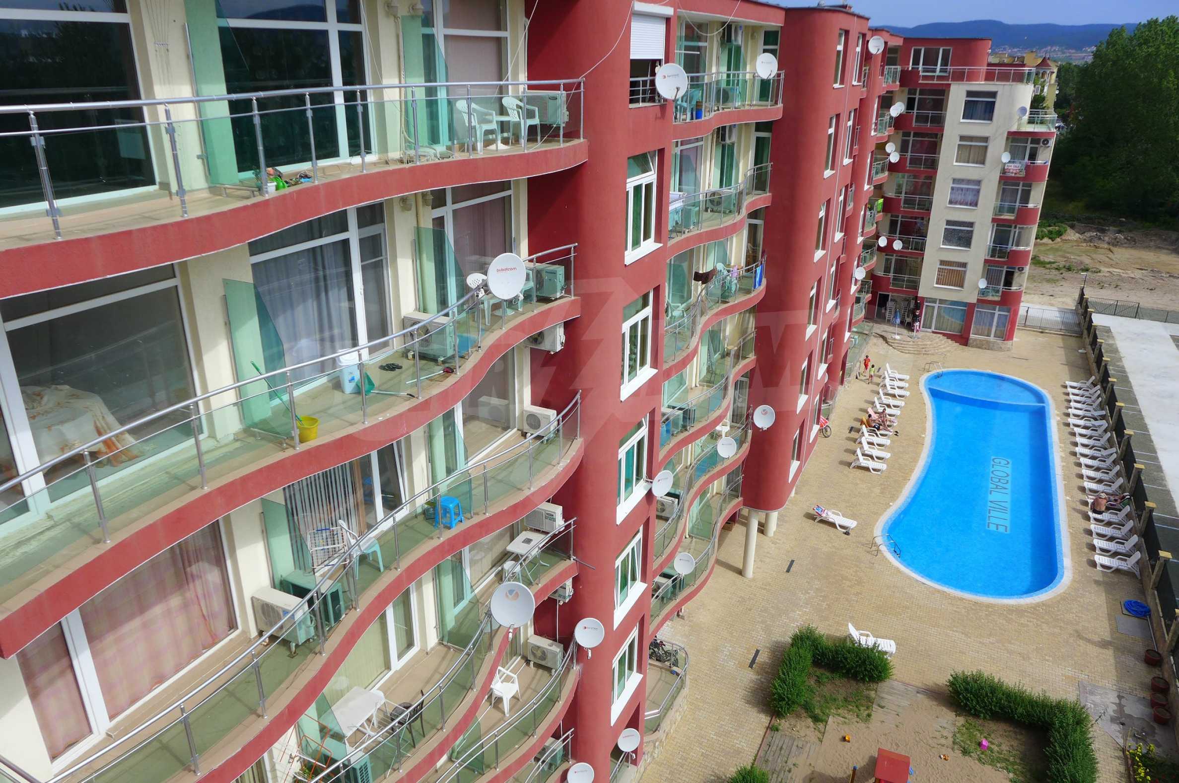 Two-level apartment in the western part of the prestigious seaside resort Sunny Beach, 70 meters from a bus stop, close to the sea (300 m) and to a variety of entertainments and shops, 600 meters from the center of the resort and 700 meters from Cacao Beach. The apartment is located on the fifth floor in the gated complex Global Ville, behind the former Tiffany bar and opposite the Continental Hotel (just across the street).