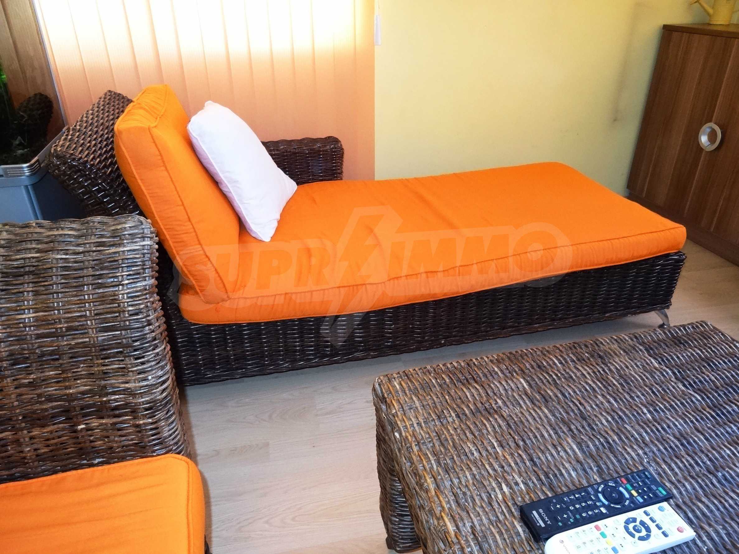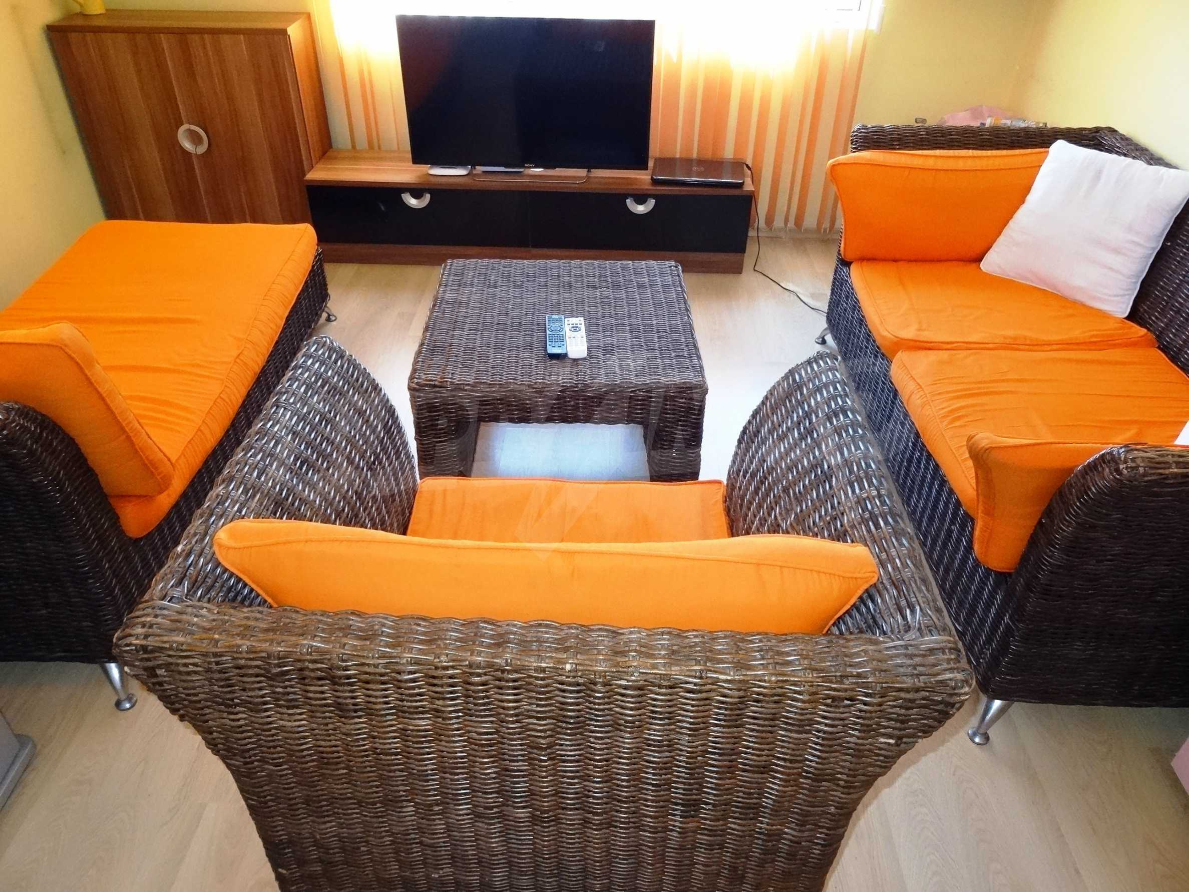 It is offered for rent fully furnished: bedroom with wardrobe and bedside tables, kitchen - oven and ceramic hob, extractor hood, fridge, dining table with four chairs, rattan sofa and TV.