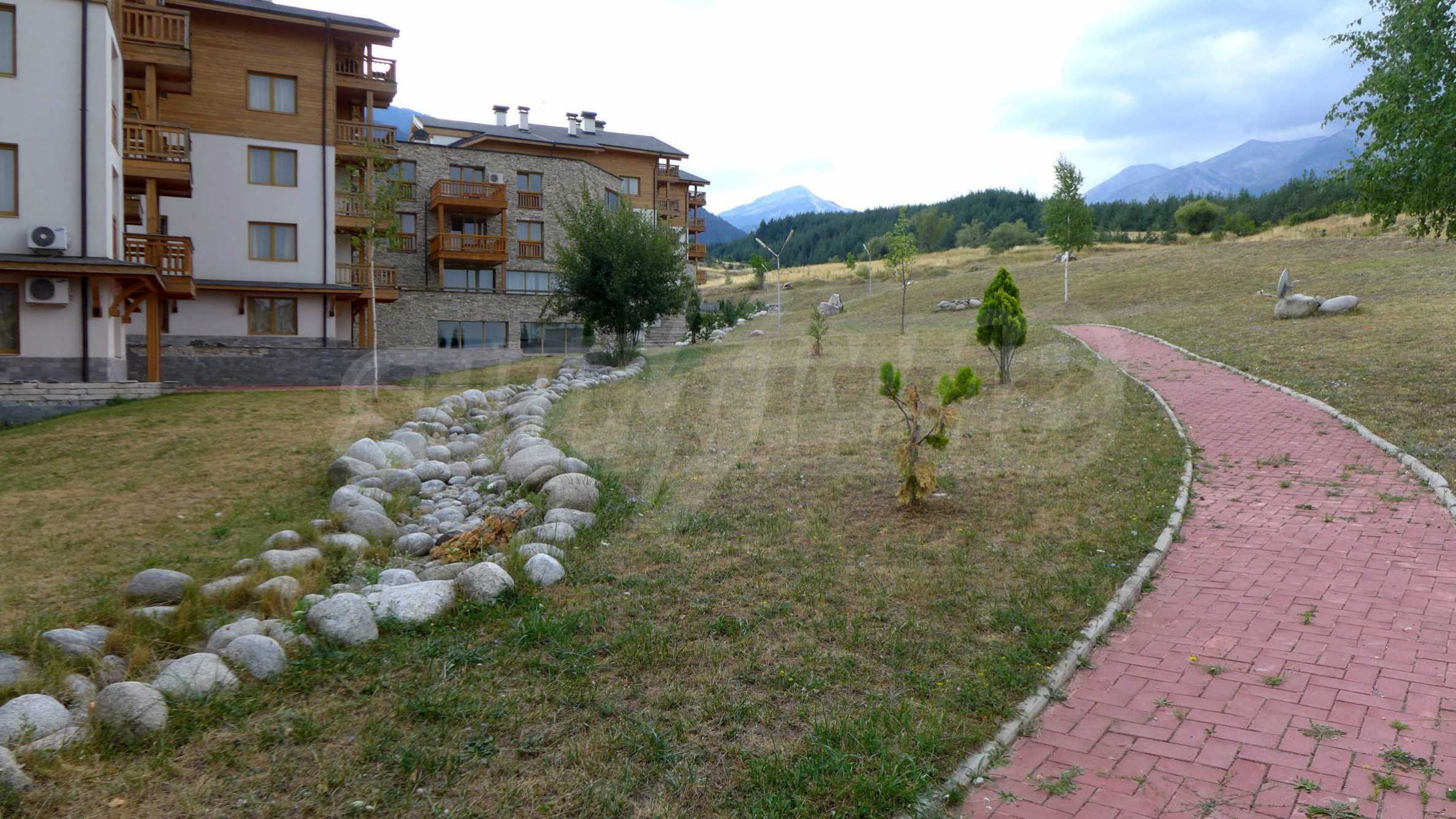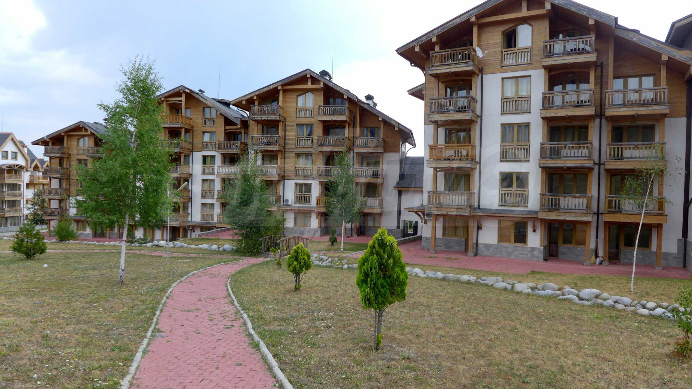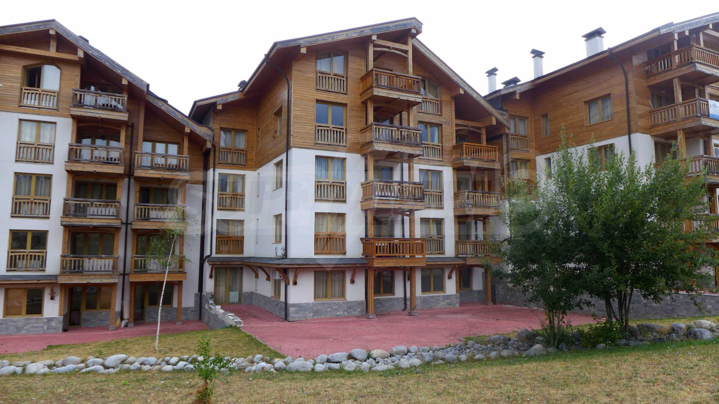 The newly-built complex St. John Hill (2006) is a luxury apart-hotel extending over 3400 sq.m. It is equipped with a restaurant, lobby bar, fitness, indoor swimming pool, jacuzzi, massage and beauty salons, sauna, ski storage, children playground and playroom, parking lot, safe at the reception, elevator. The inner courtyard is planted with grass, flowers, ornamental shrubs and trees, beautifully landscaped streams with bridges and walkways.