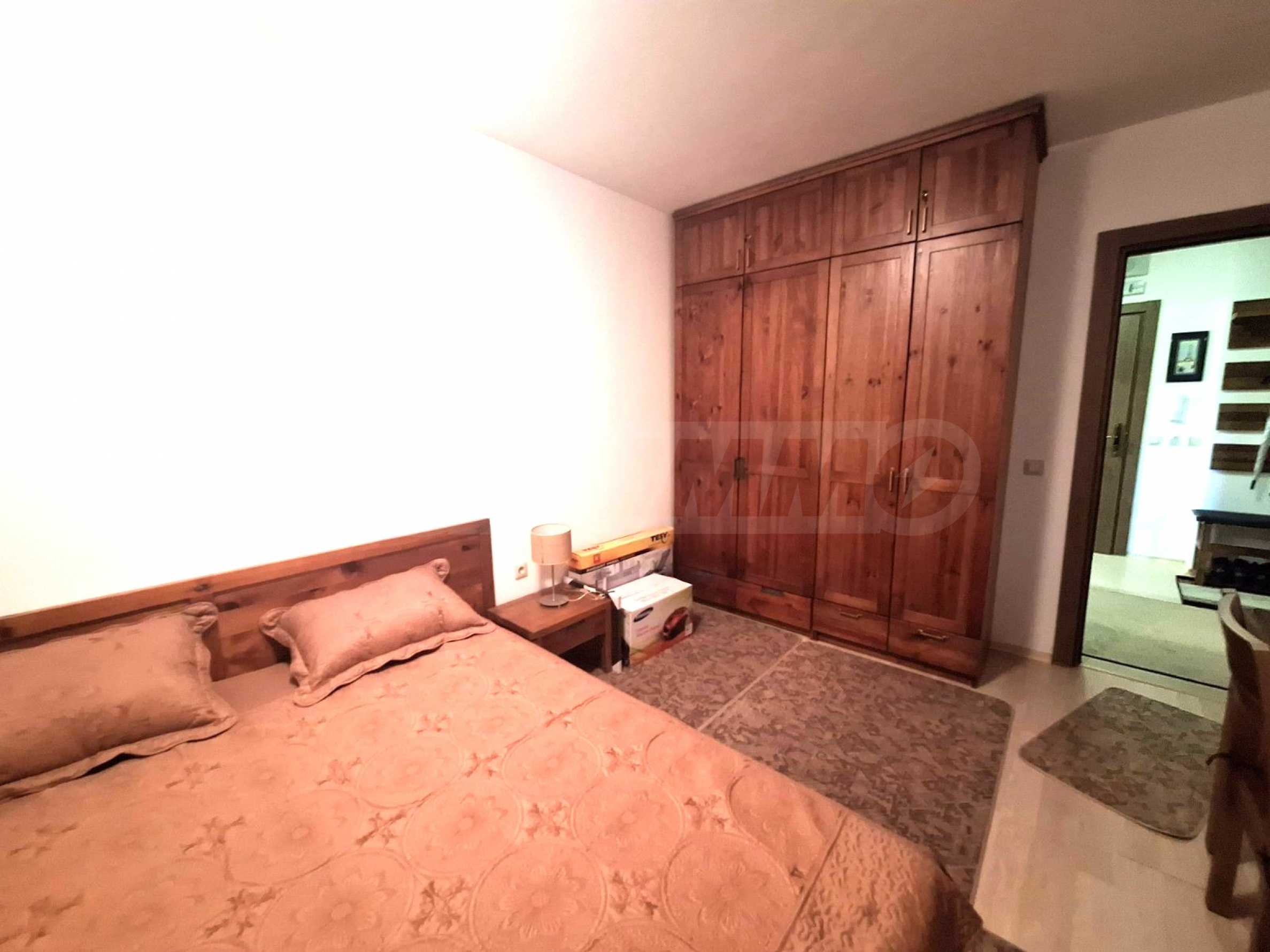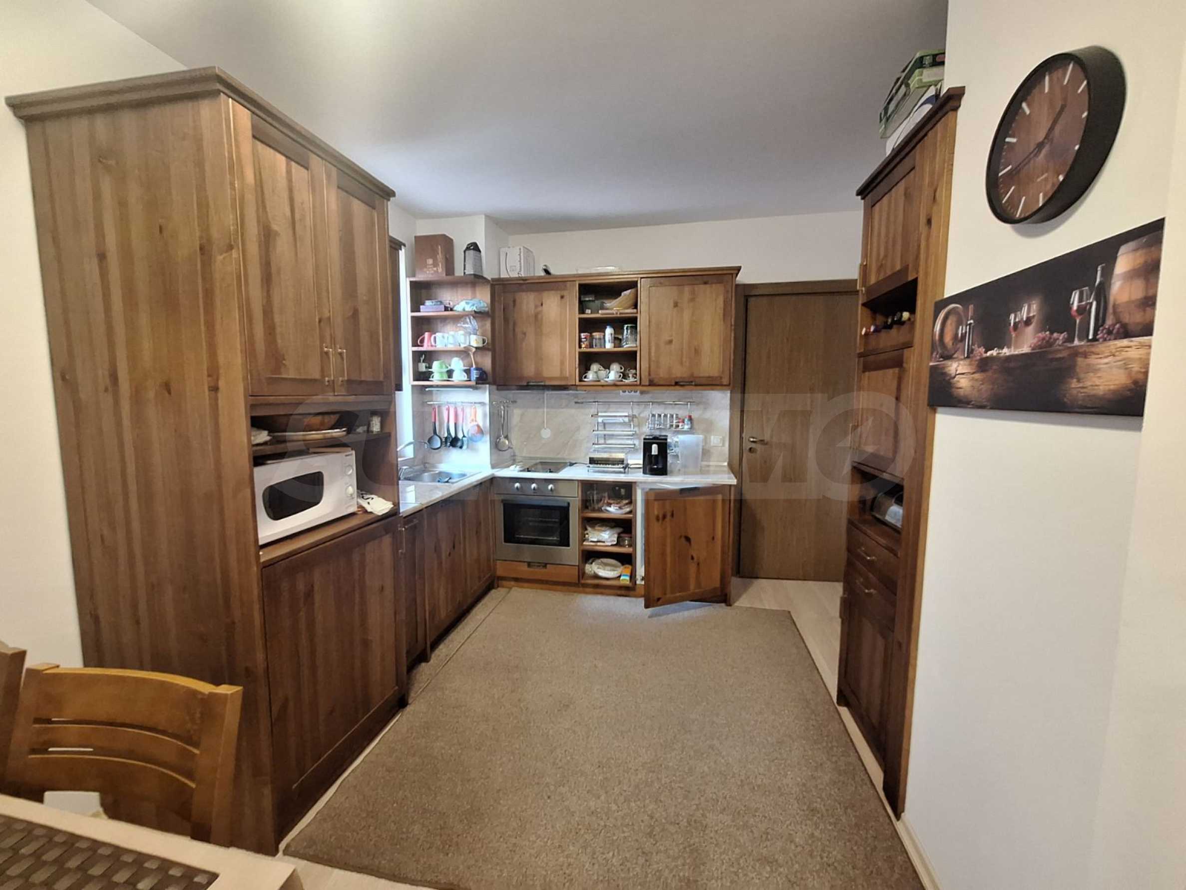All the furniture of this home is made of solid oak, with attention to every detail. The property is facing west and is located on the 2/5 floor. The total area is 102 sq.m., living area - 85 sq.m., common areas - 17 sq.m. The property includes 60 sq.m. of the adjacent land. The kitchen is fully furnished and equipped with a glass-ceramic hob with two hot plates, an extractor hood, built-in oven, dishwasher, washing machine and refrigerator, microwave, sink, cabinets for tools and utensils, a dining table with four chairs. The water heater and the boiler ar hidden in one of the cupboards. The fully furnished living room includes a corner sofa, a coffee table, a TV set, shelves, a fireplace and a wardrobe. Both of the bedrooms have a double bed with mattress, bedside tables, a dressing table and a wardrobe. One of the bathrooms with WC has a bathtub with shower, a washbasin with mirror and the other - a shower box and a washbasin with mirror. The only one balcony has beautiful panorama. The heating is local and the dwelling is equipped with cable TV.