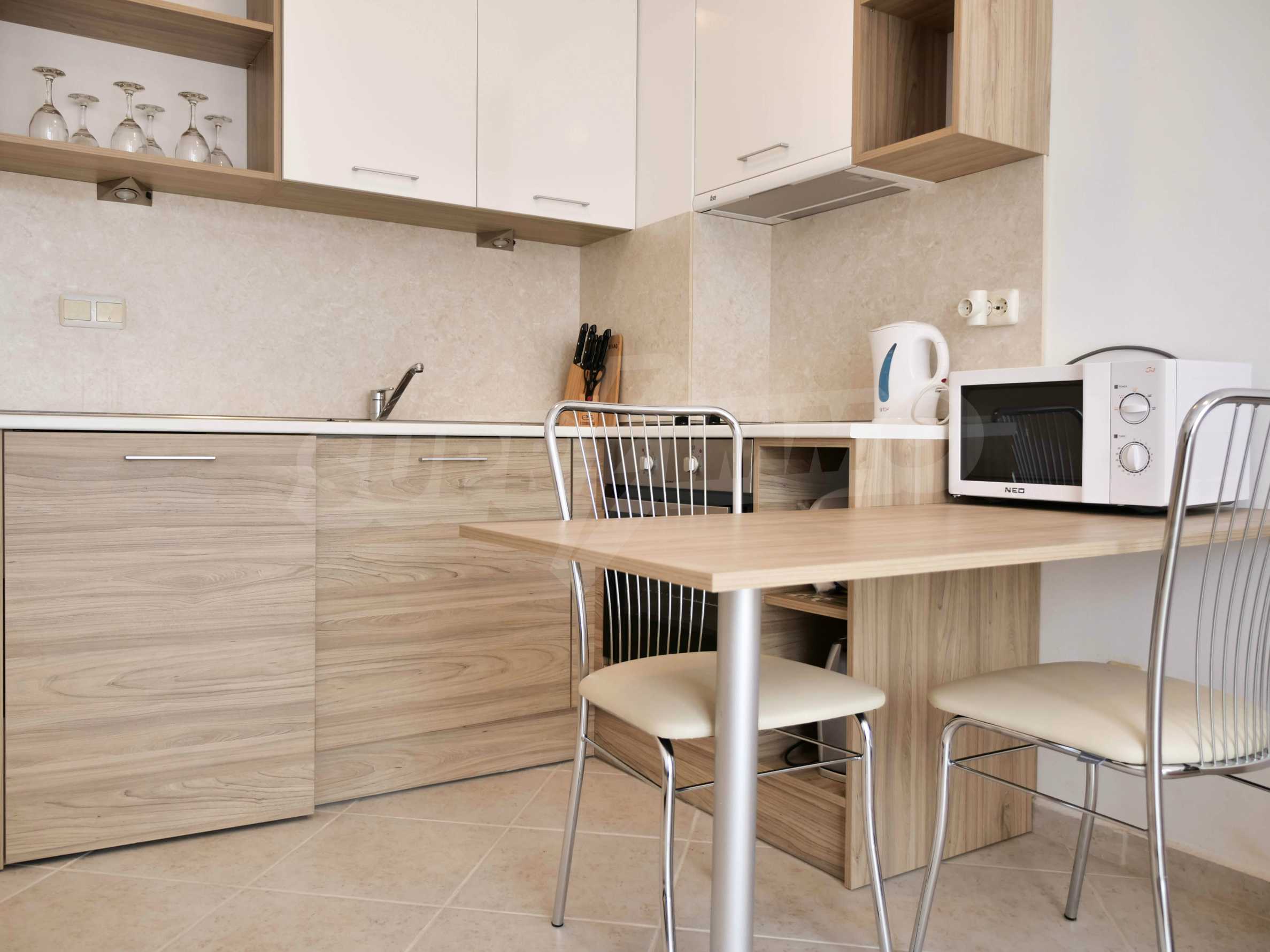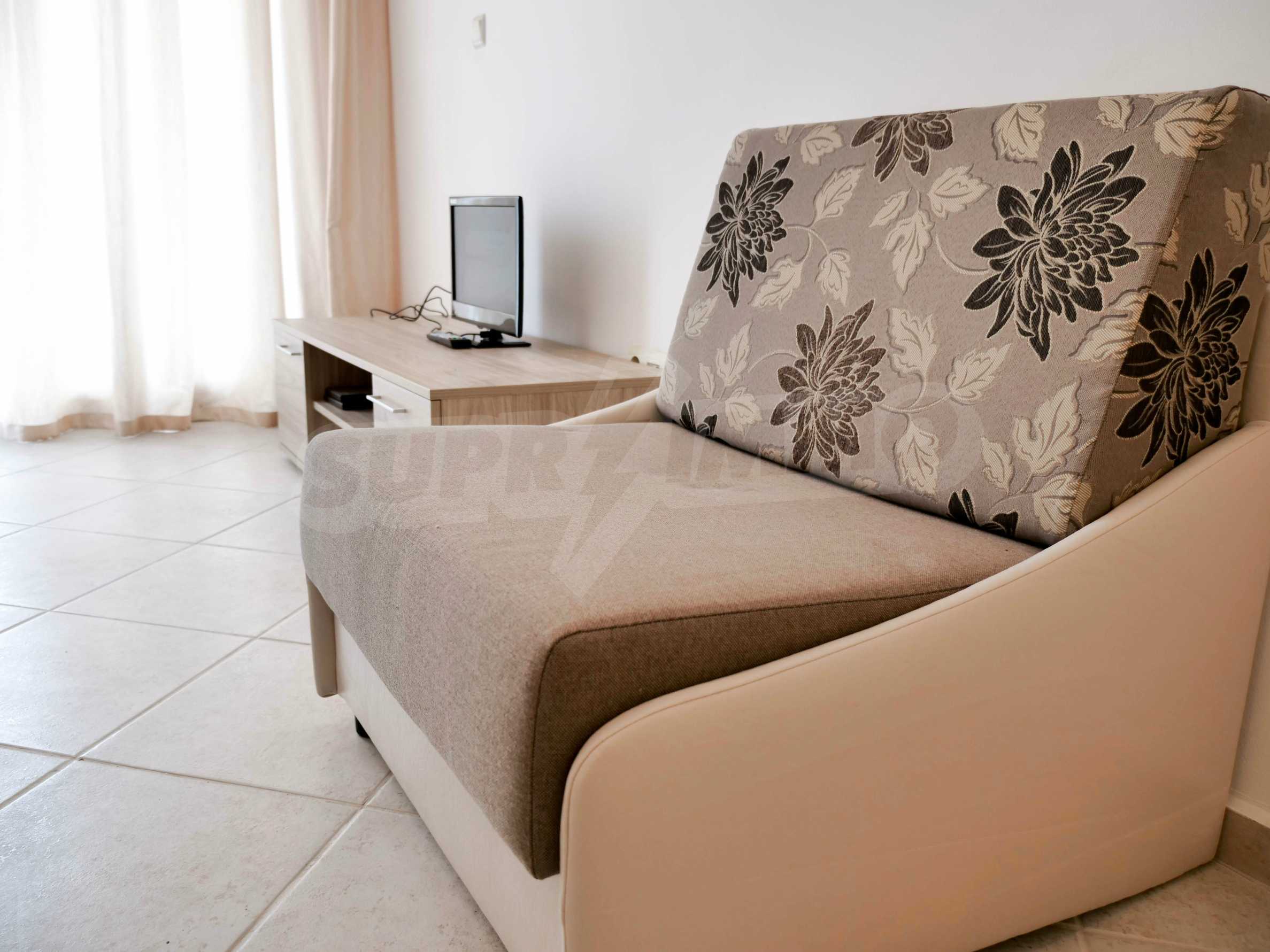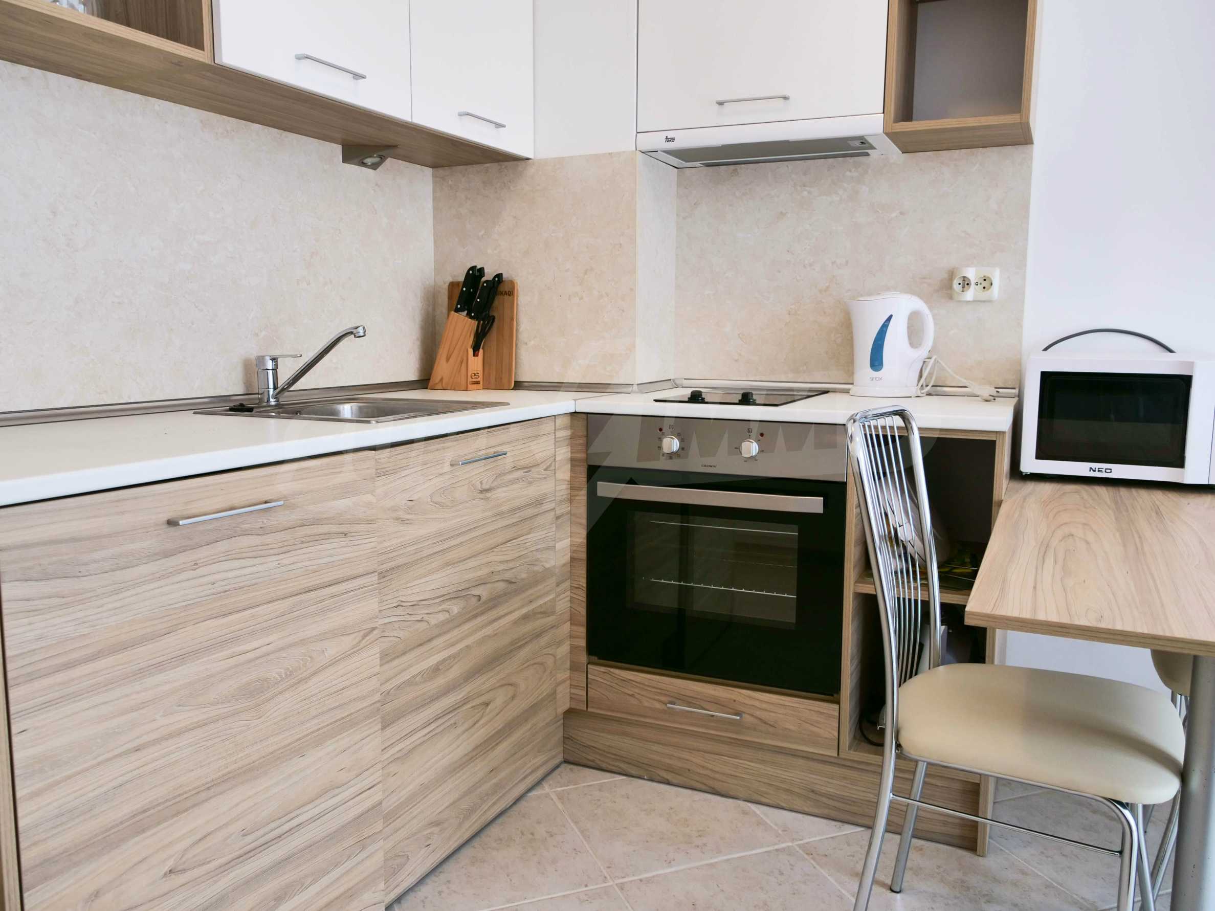 The apartment has a total area of 58.29 sq.m. It is offered for sale fully furnished. There is an open-plan kitchen with a living room, one bright bedroom, a bathroom with toilet and balcony. The walls are plastered and painted with white latex paint.