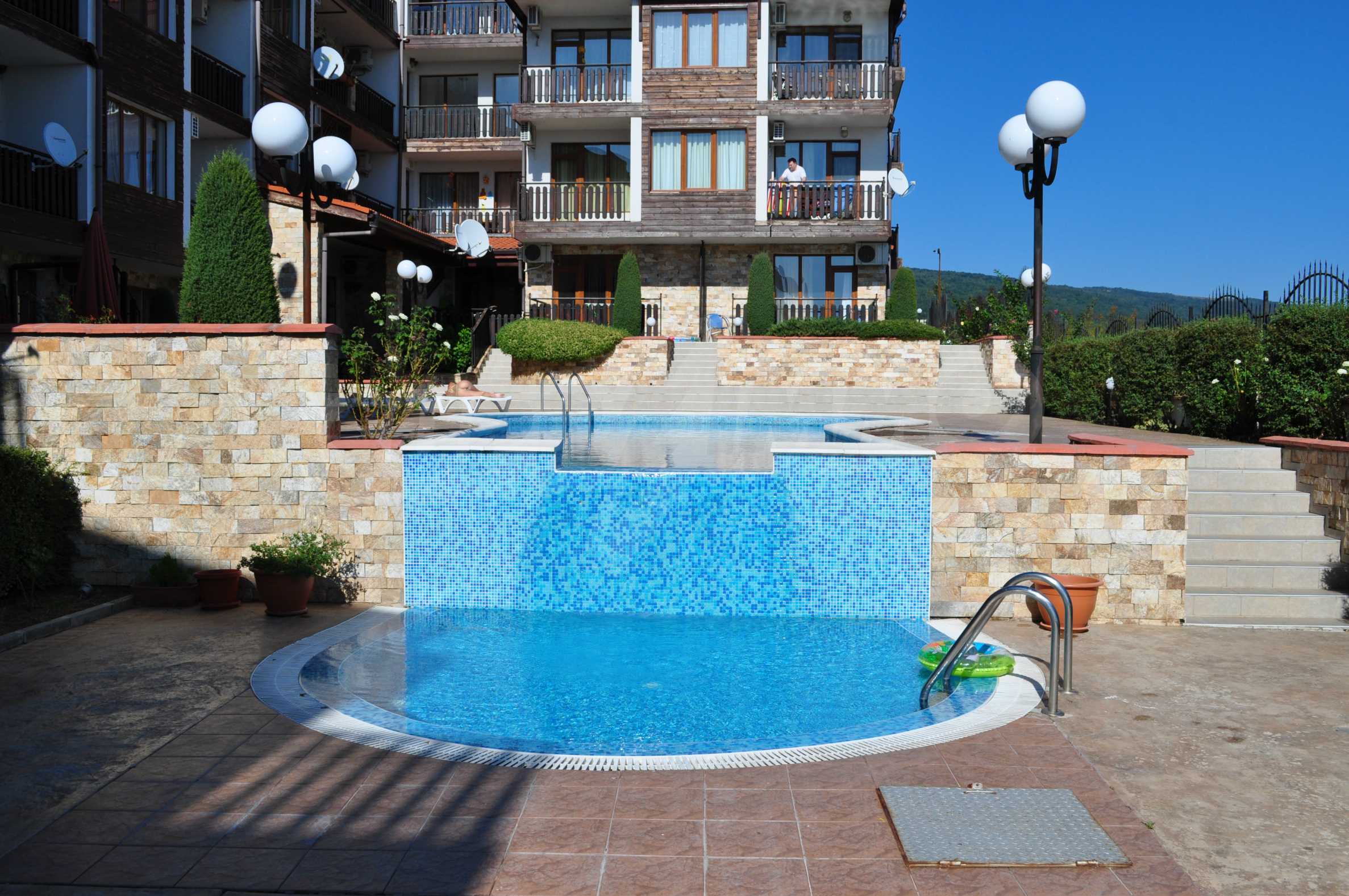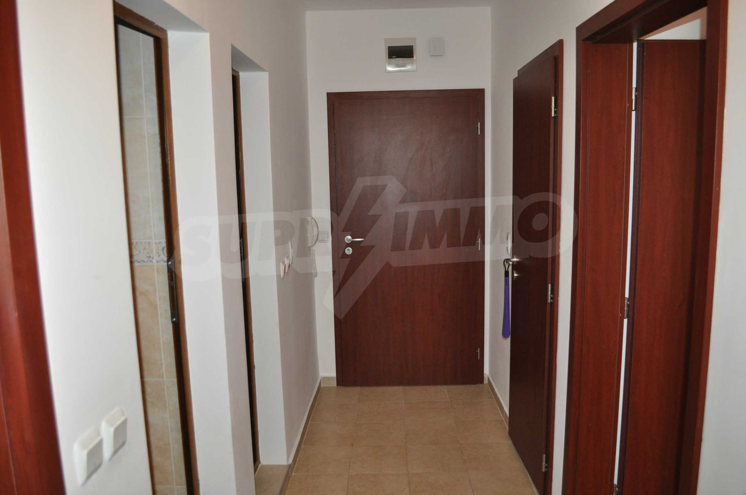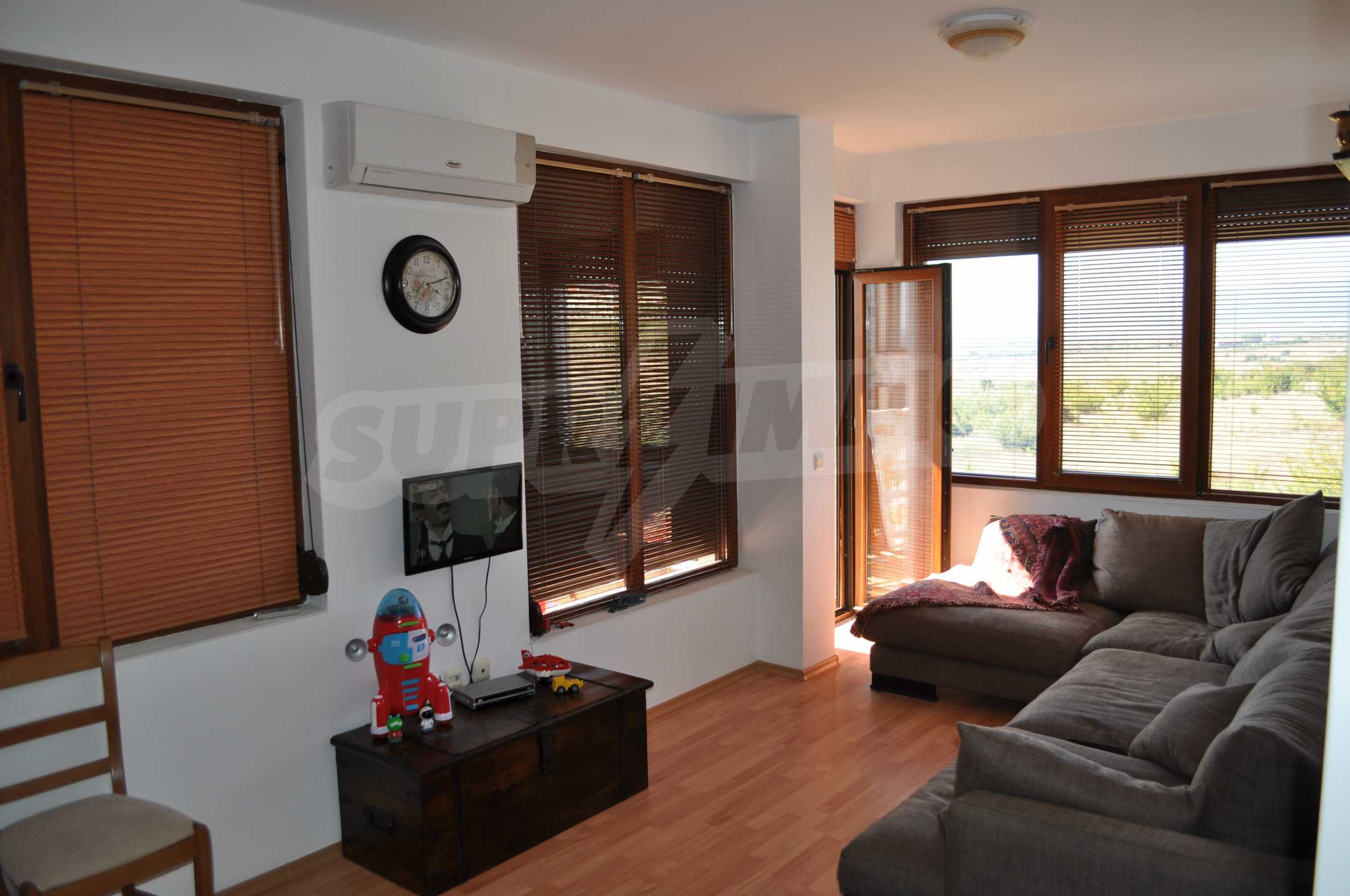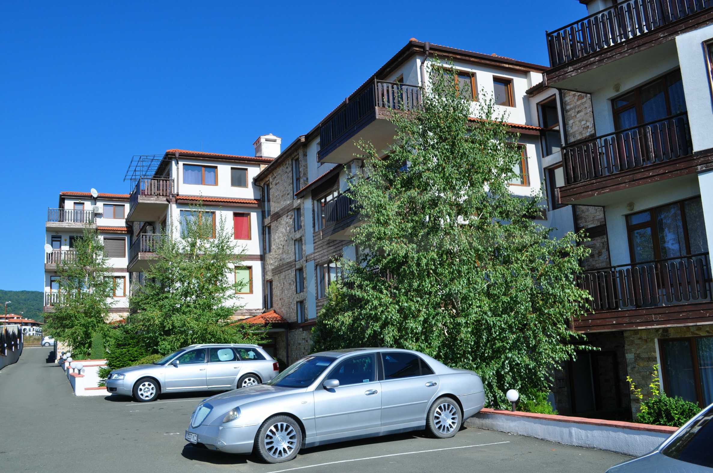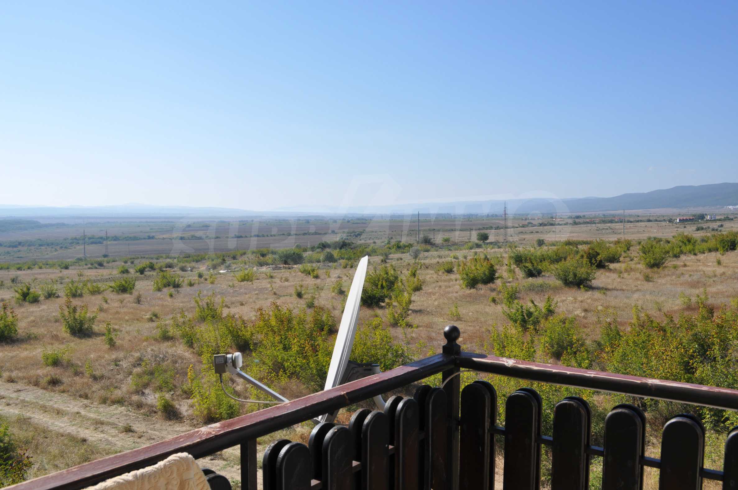 The new 2-bedroom apartment (2007-2008) is characterized by eastern exposure and an area of 103 sq.m. The rooms are finished with tiled / laminate flooring; windows - PVC, as well as full and comfortable furniture and necessary equipment. The kitchen is finished with appliances, a dining table; the living room - with a sofa and a TV set; the two bedrooms with a double bed and a wardrobe. The apartment has two balconies with spacious view of the surrounding countryside and the mountain. The property is equipped with telephone, cable TV and Internet.