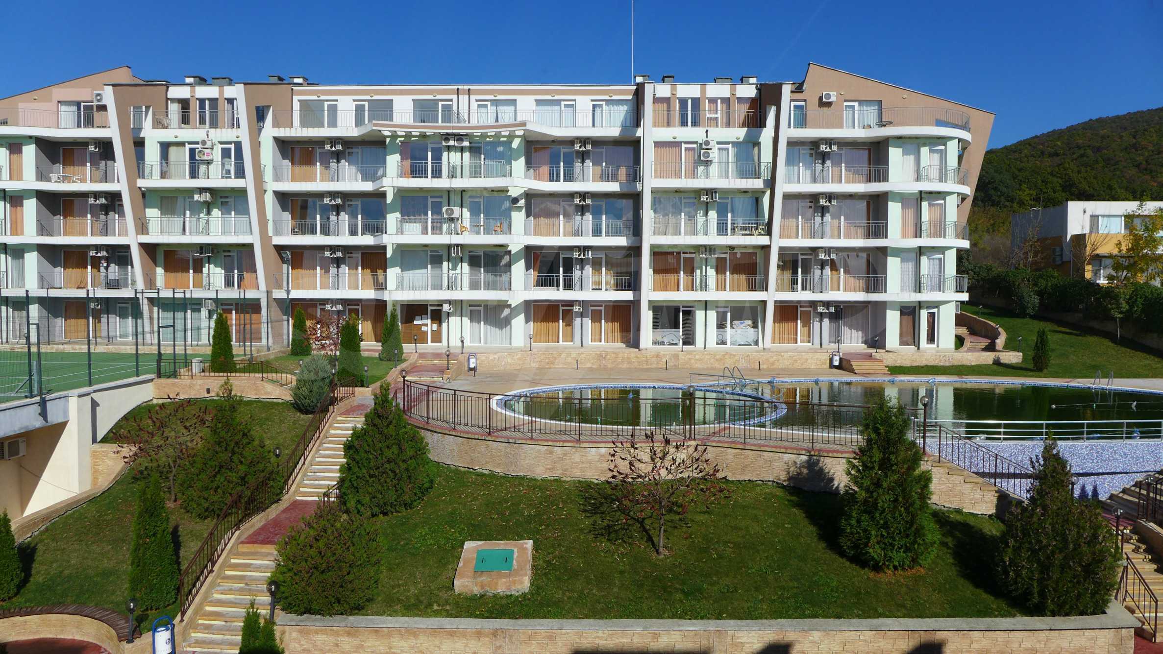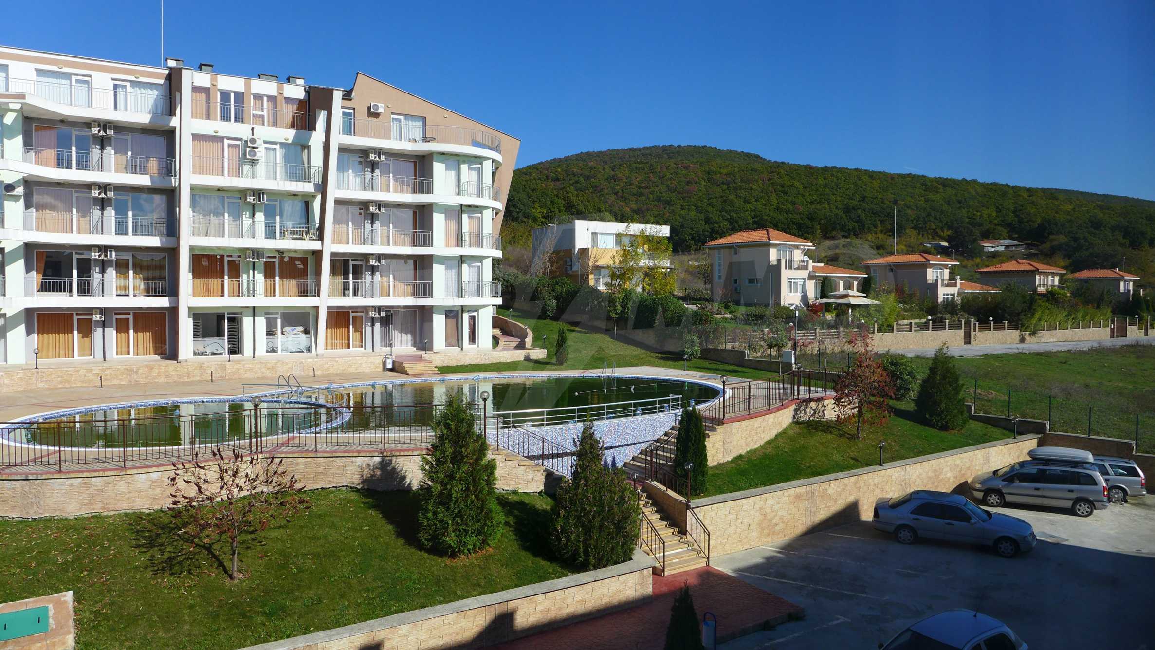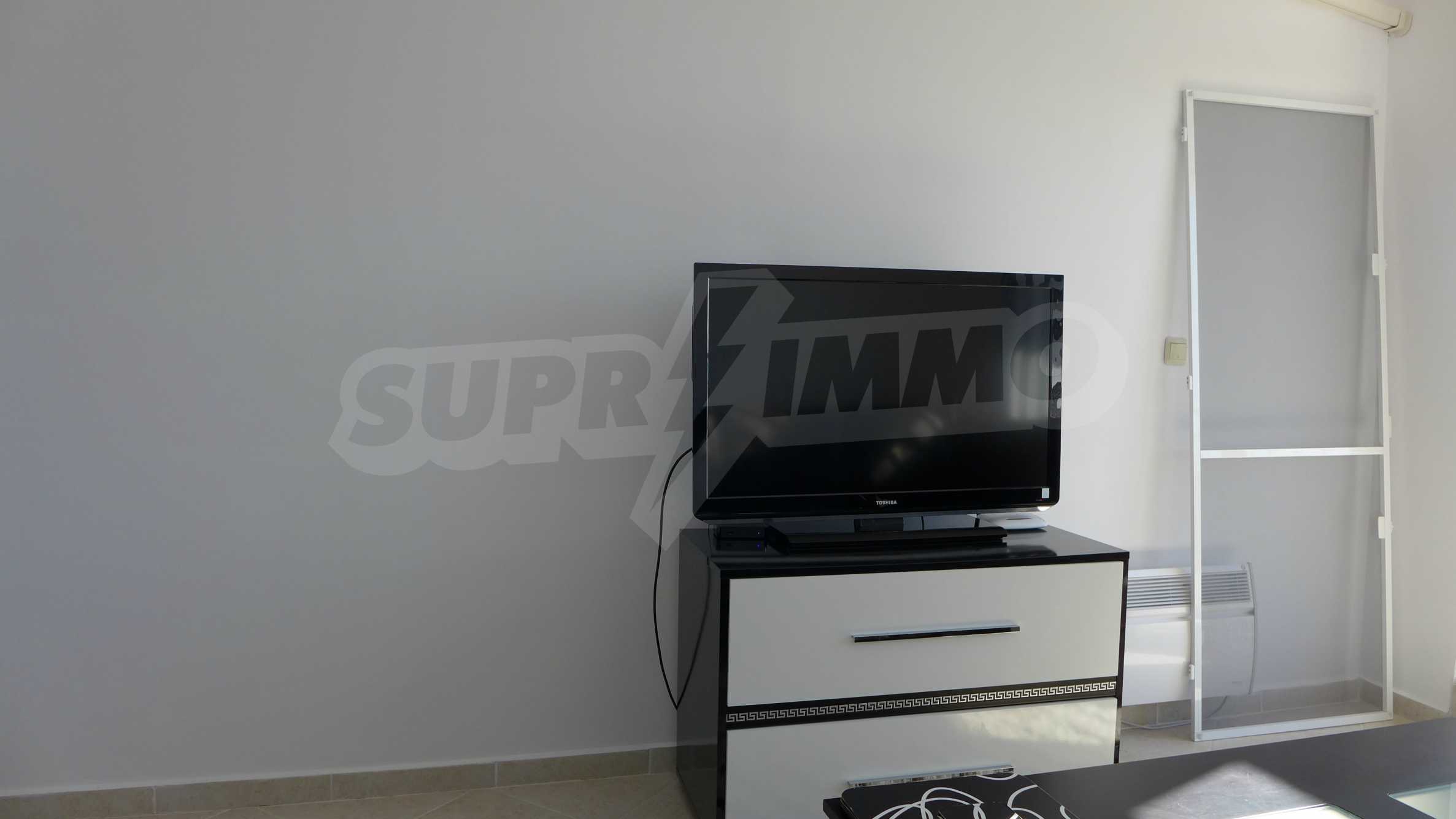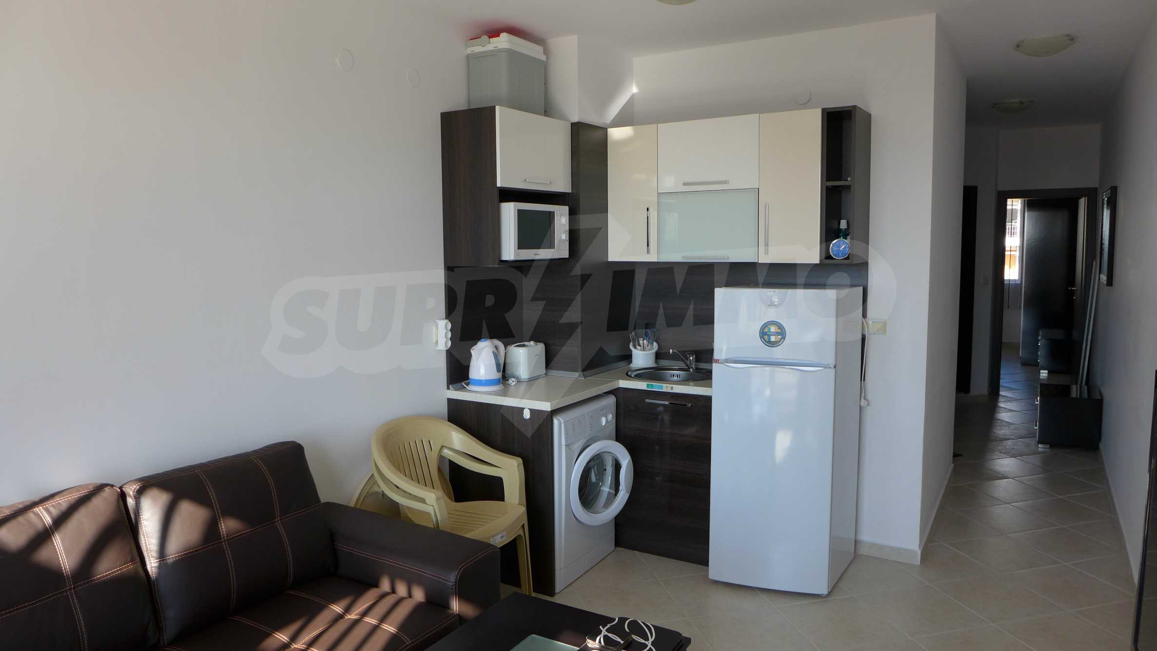 The property offers a wonderful view of the surroundings, the sea and the swimming pool. The exhibition of the flat is South and North. The total area is 58.56 square meters, with available fully furnished living room with kitchenette, bedroom, balcony and bathroom.