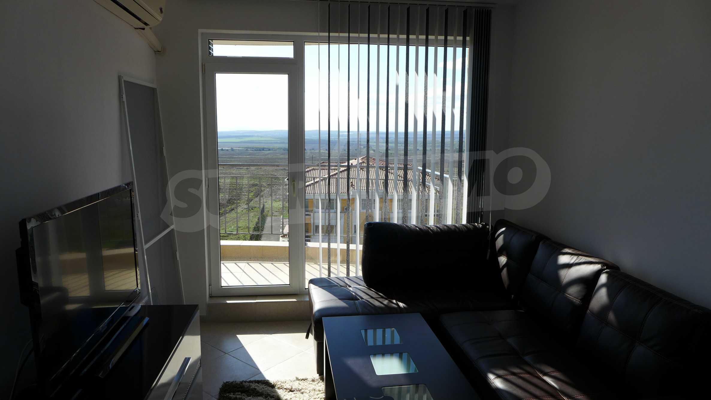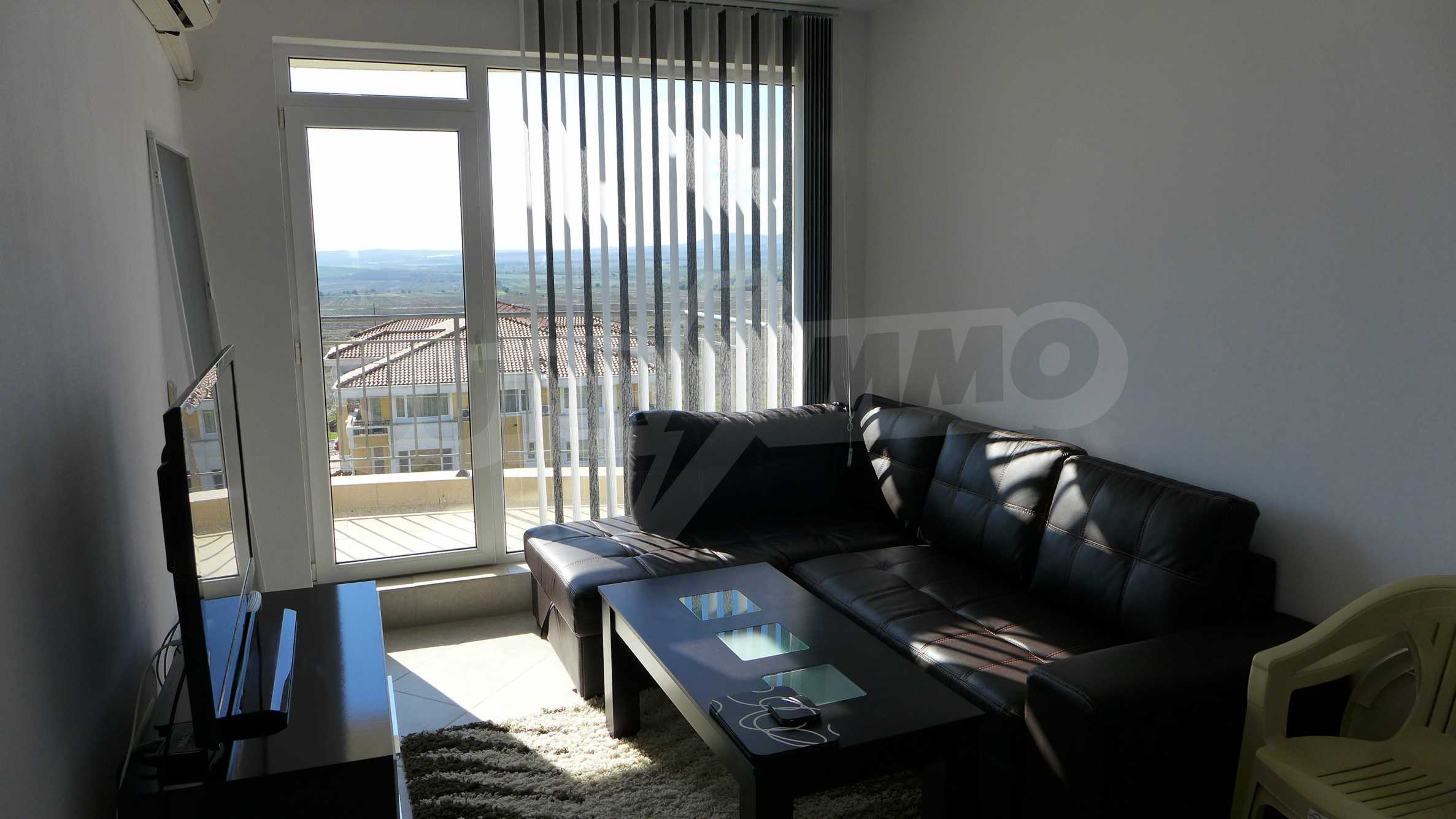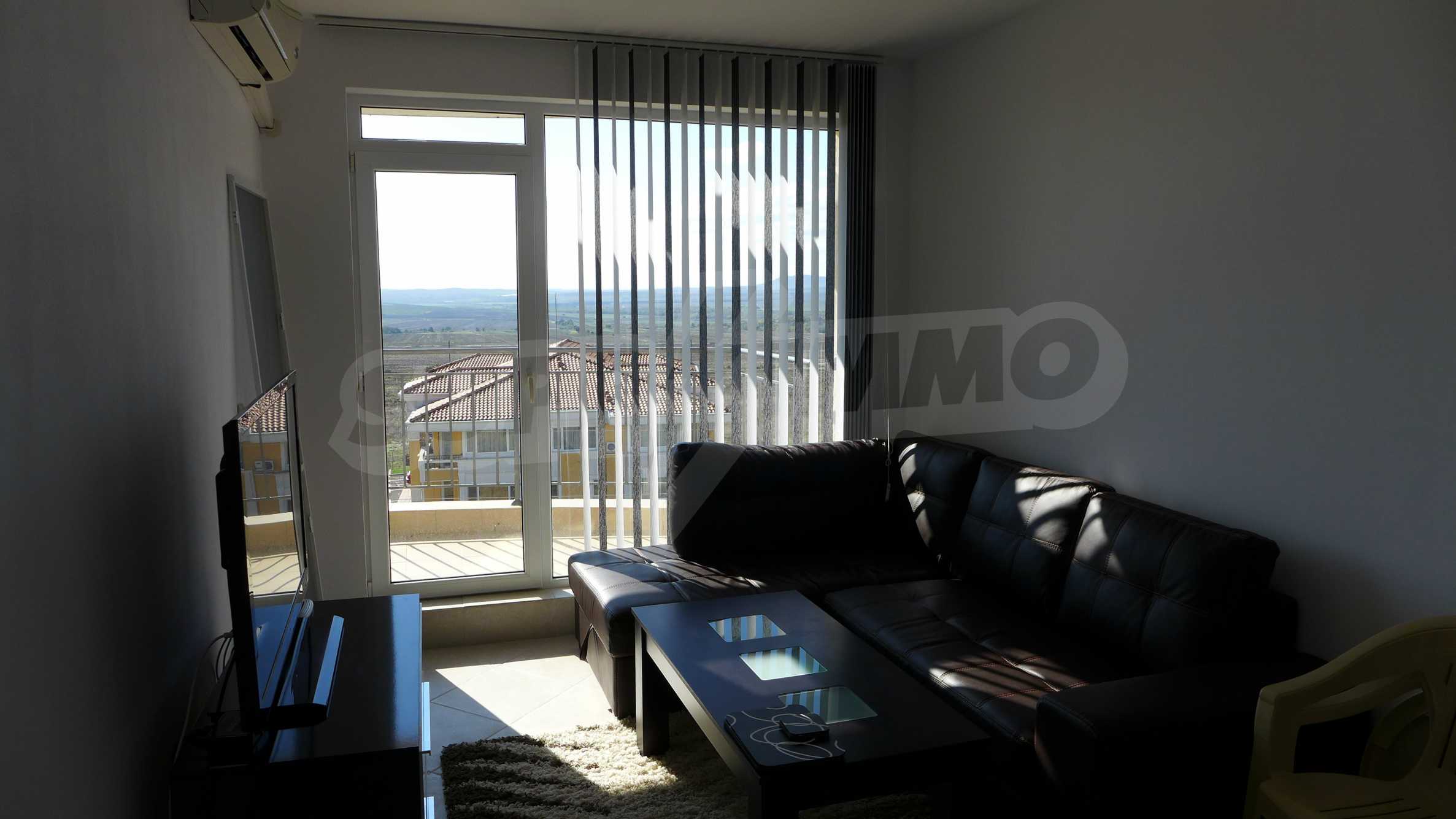 The property offers a wonderful view of the surroundings, the sea and the swimming pool. The exhibition of the flat is South and North. The total area is 58.56 square meters, with available fully furnished living room with kitchenette, bedroom, balcony and bathroom.