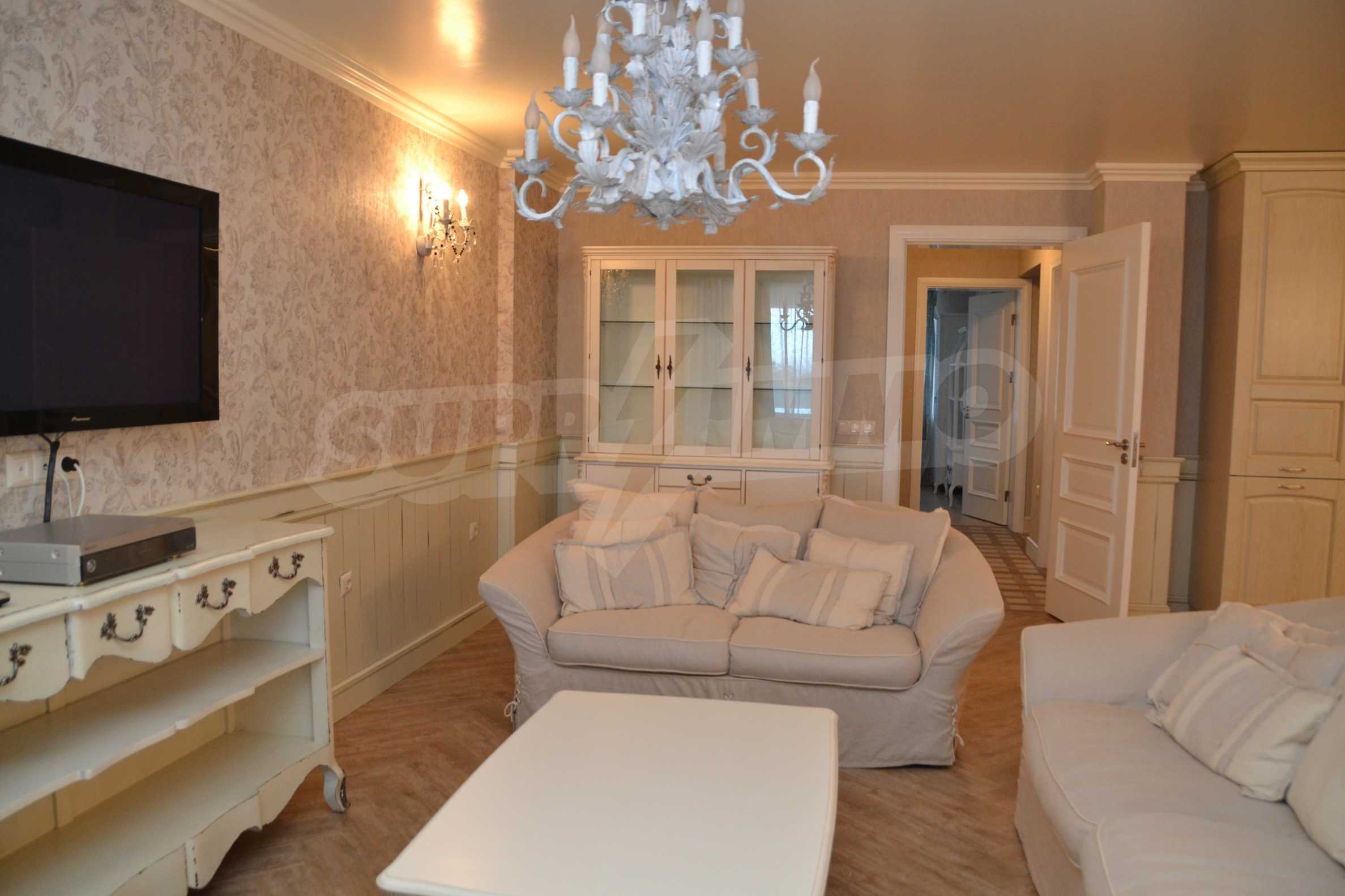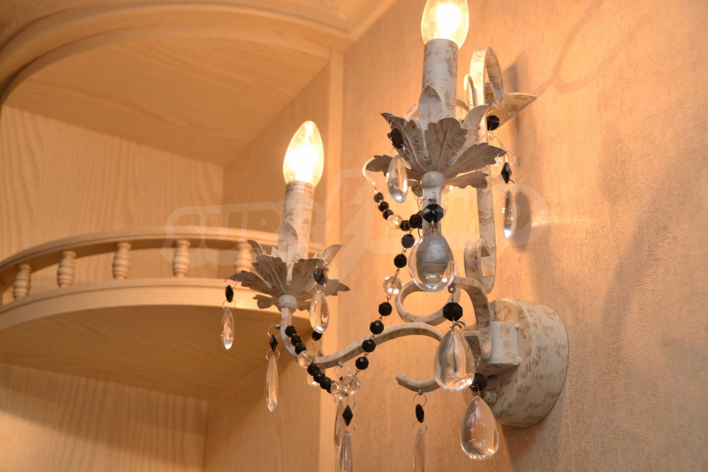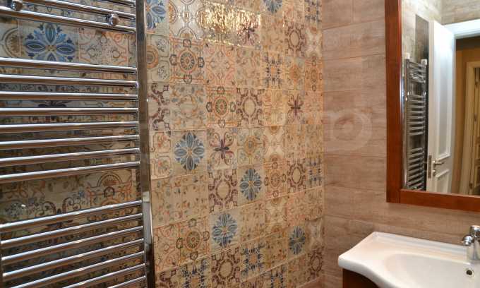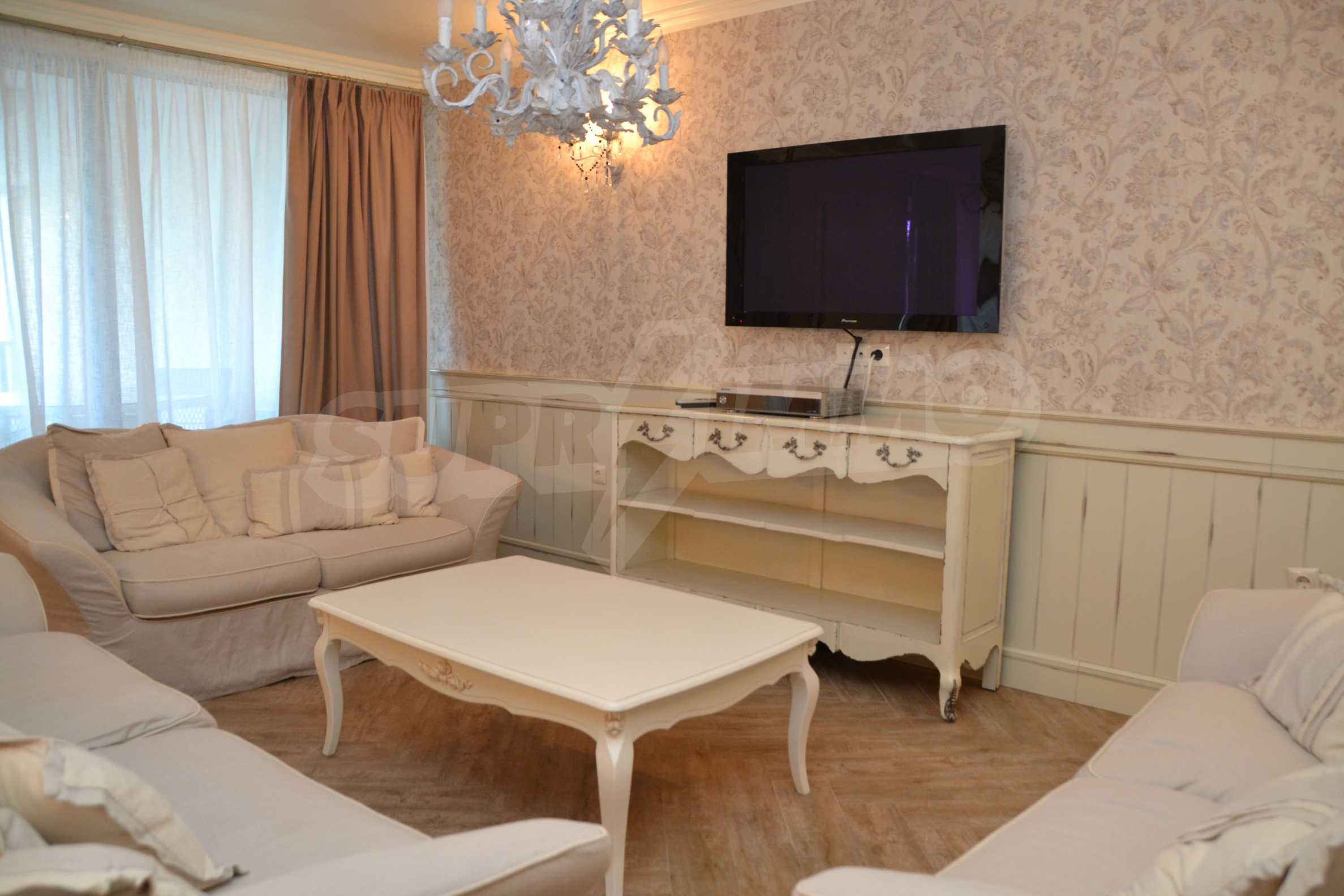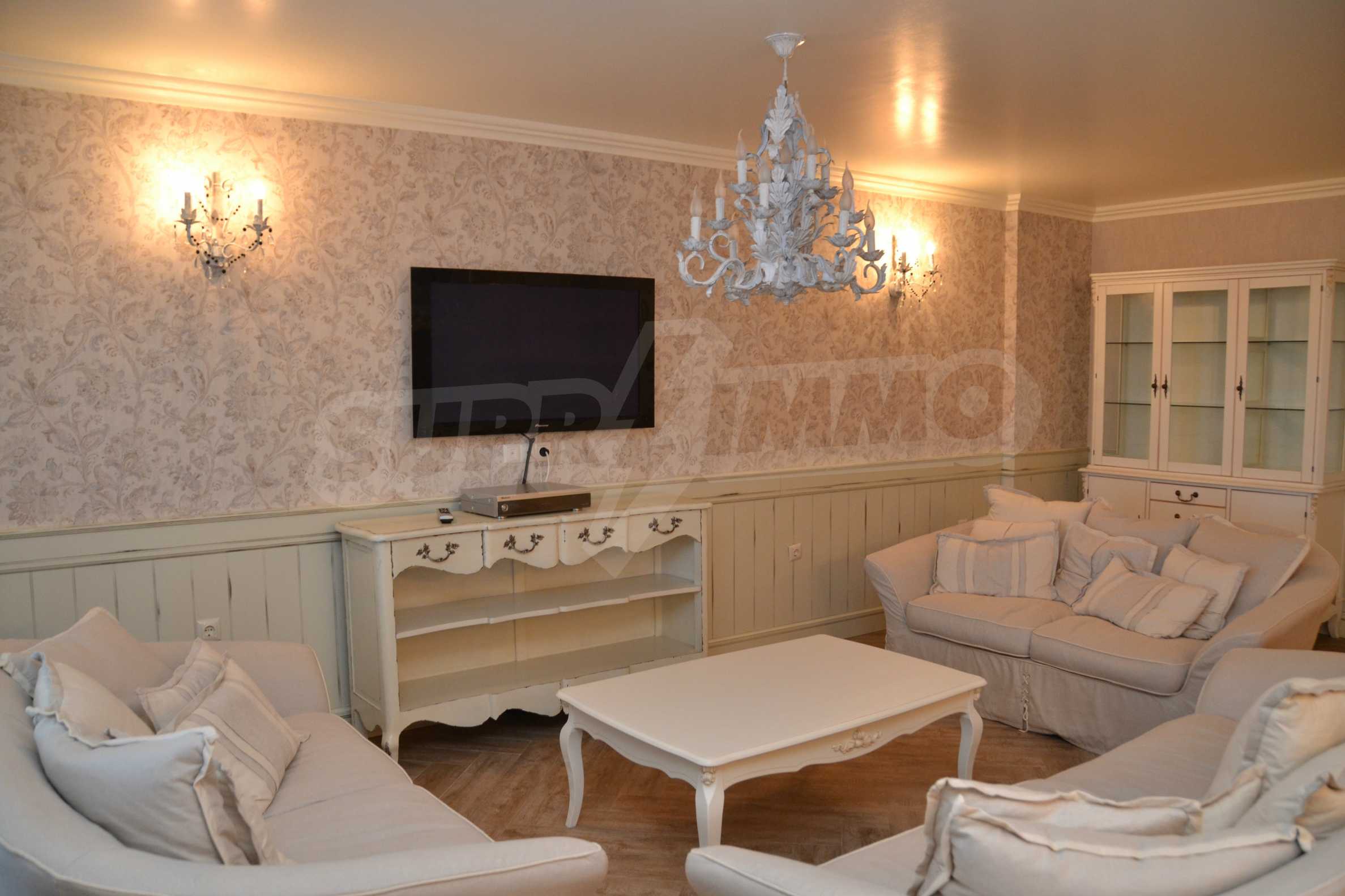 The living room has comfortable white sofas, wide enough for more residents or guests.The dining room has a large solid wooden table and can accommodate 6 people. Kitchen with white cupboards is supplied with all necessary appliances with retro design. Classical follows the elegant lines of almost every meter of dwelling. Curtains, wallpaper and beautiful chandeliers in the living room add a touch of royal feeling.