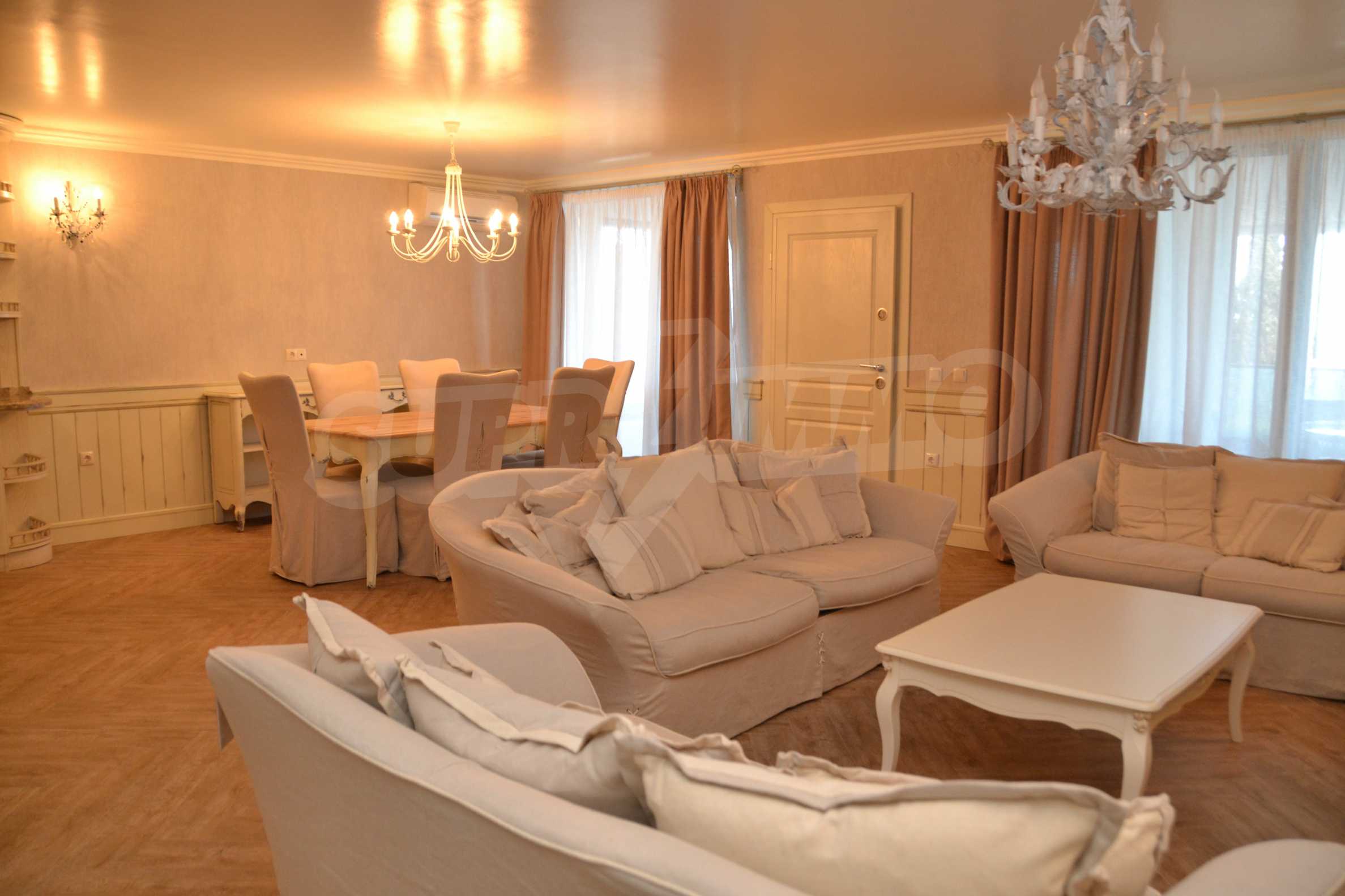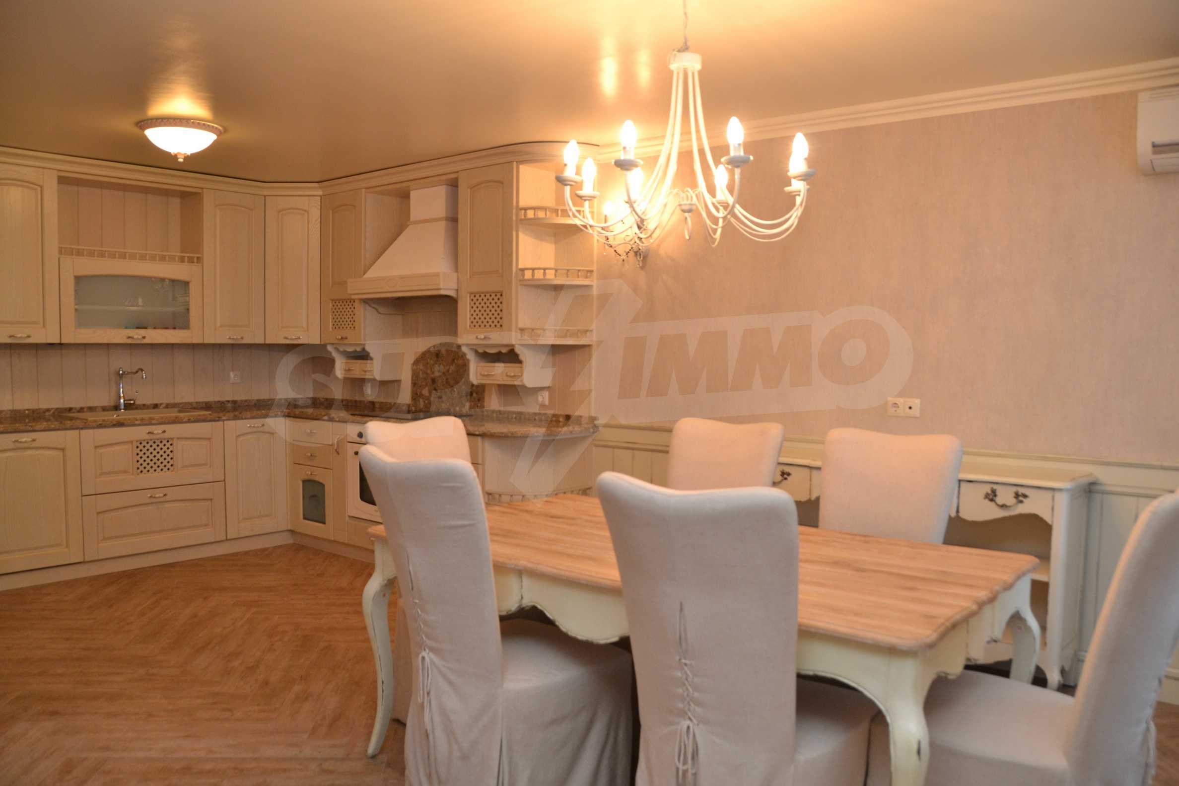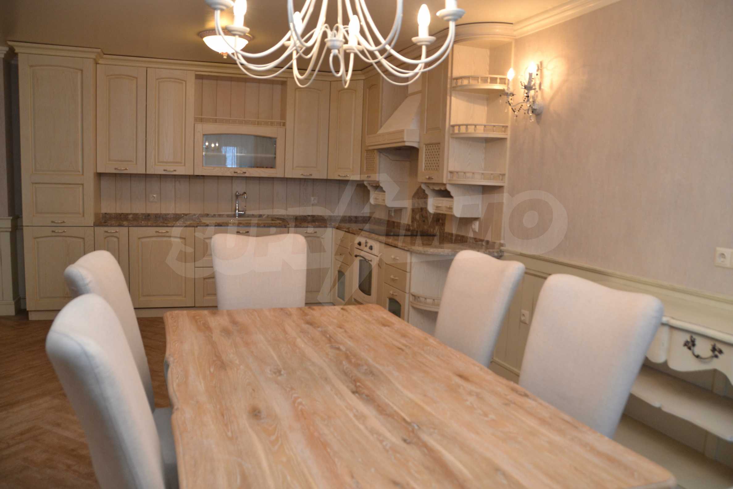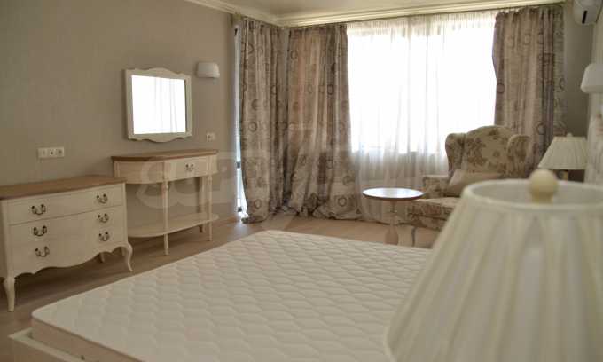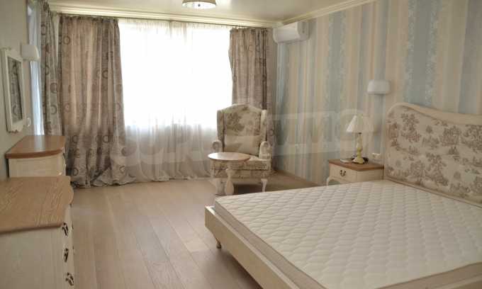 The living room has comfortable white sofas, wide enough for more residents or guests.The dining room has a large solid wooden table and can accommodate 6 people. Kitchen with white cupboards is supplied with all necessary appliances with retro design. Classical follows the elegant lines of almost every meter of dwelling. Curtains, wallpaper and beautiful chandeliers in the living room add a touch of royal feeling.
