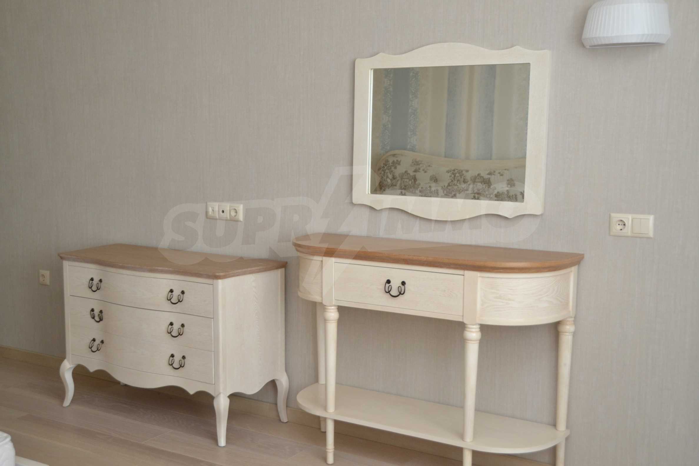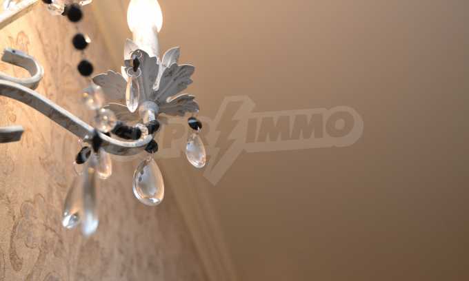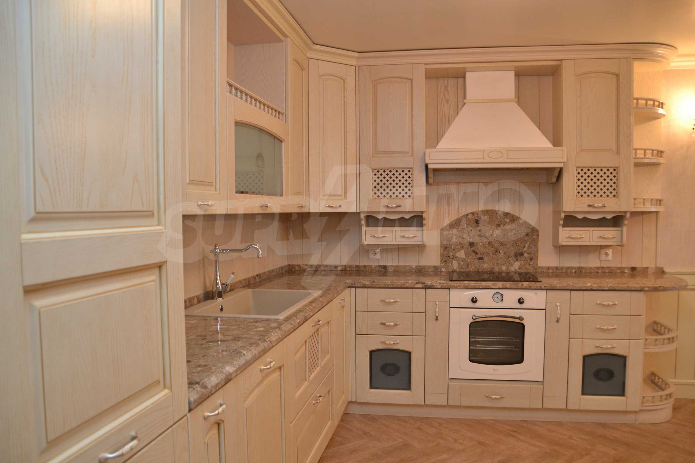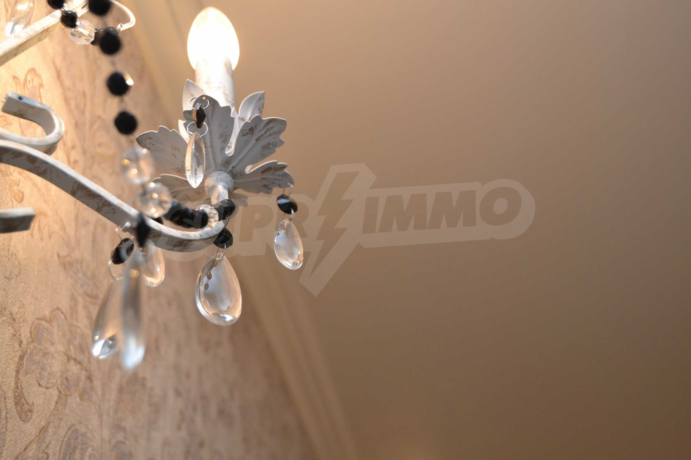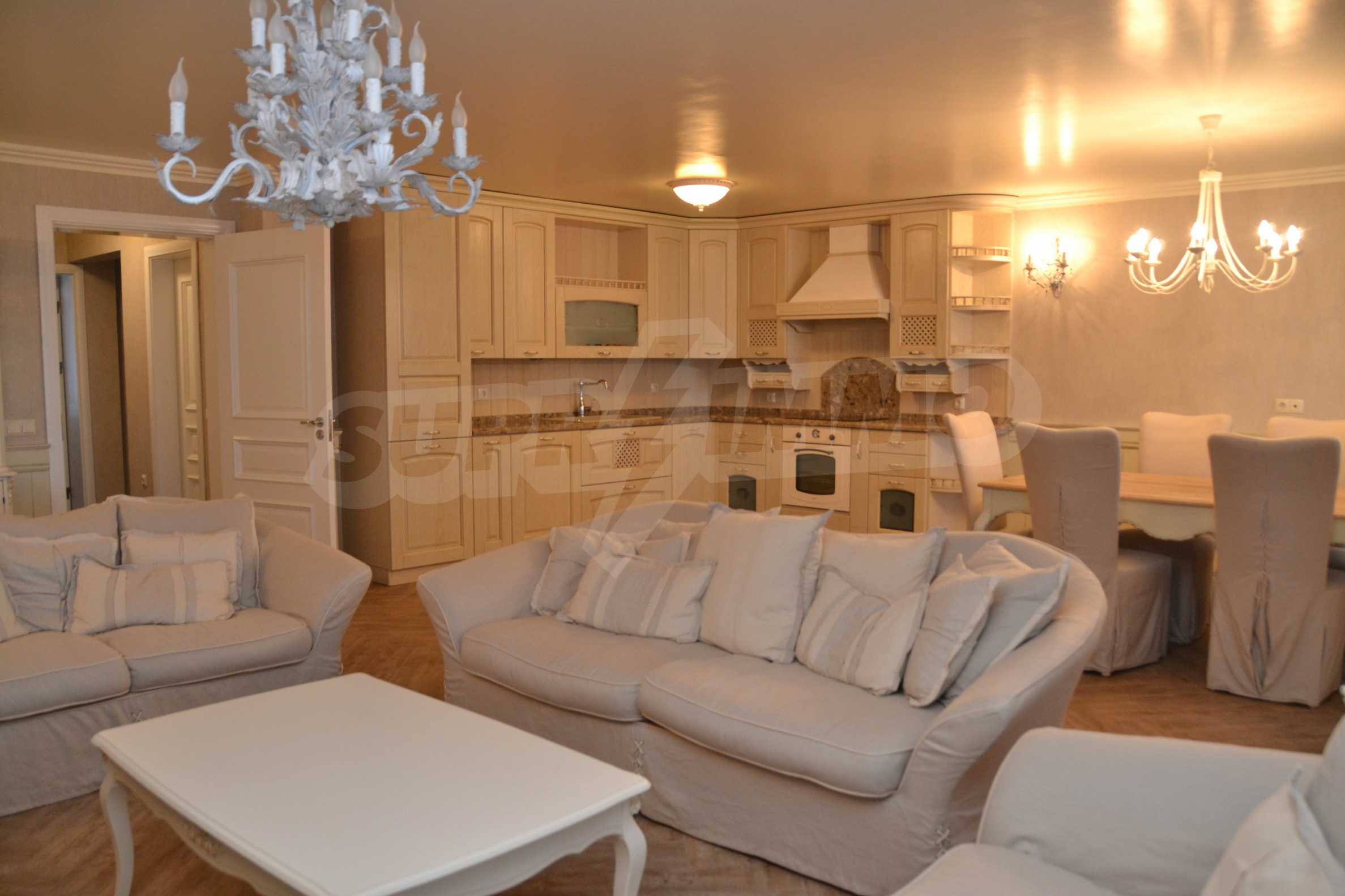 The living room has comfortable white sofas, wide enough for more residents or guests.The dining room has a large solid wooden table and can accommodate 6 people. Kitchen with white cupboards is supplied with all necessary appliances with retro design. Classical follows the elegant lines of almost every meter of dwelling. Curtains, wallpaper and beautiful chandeliers in the living room add a touch of royal feeling.