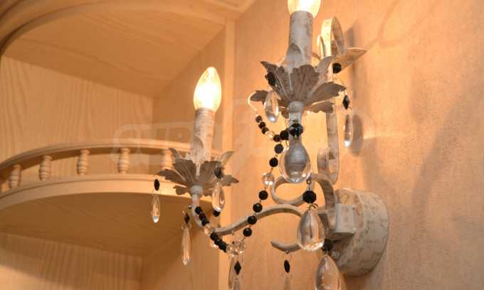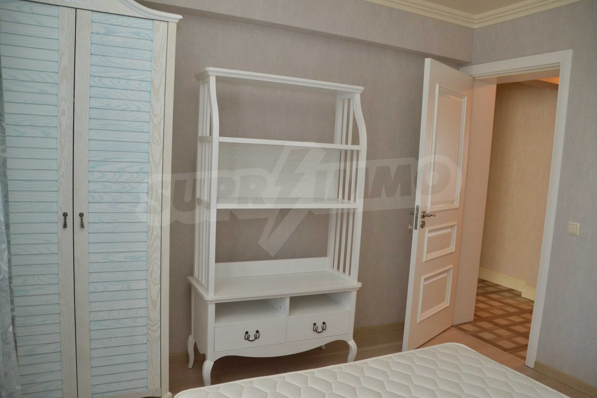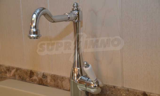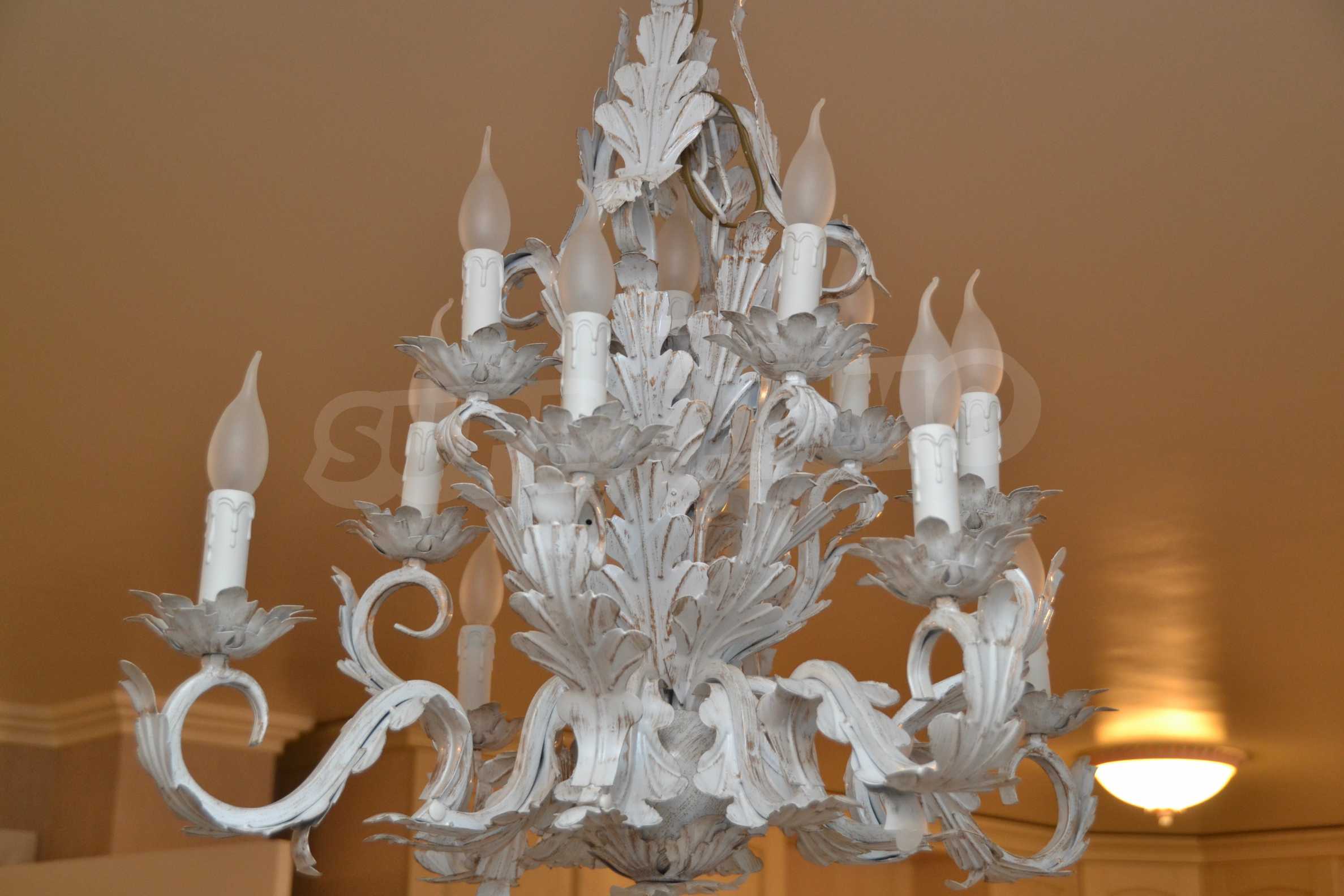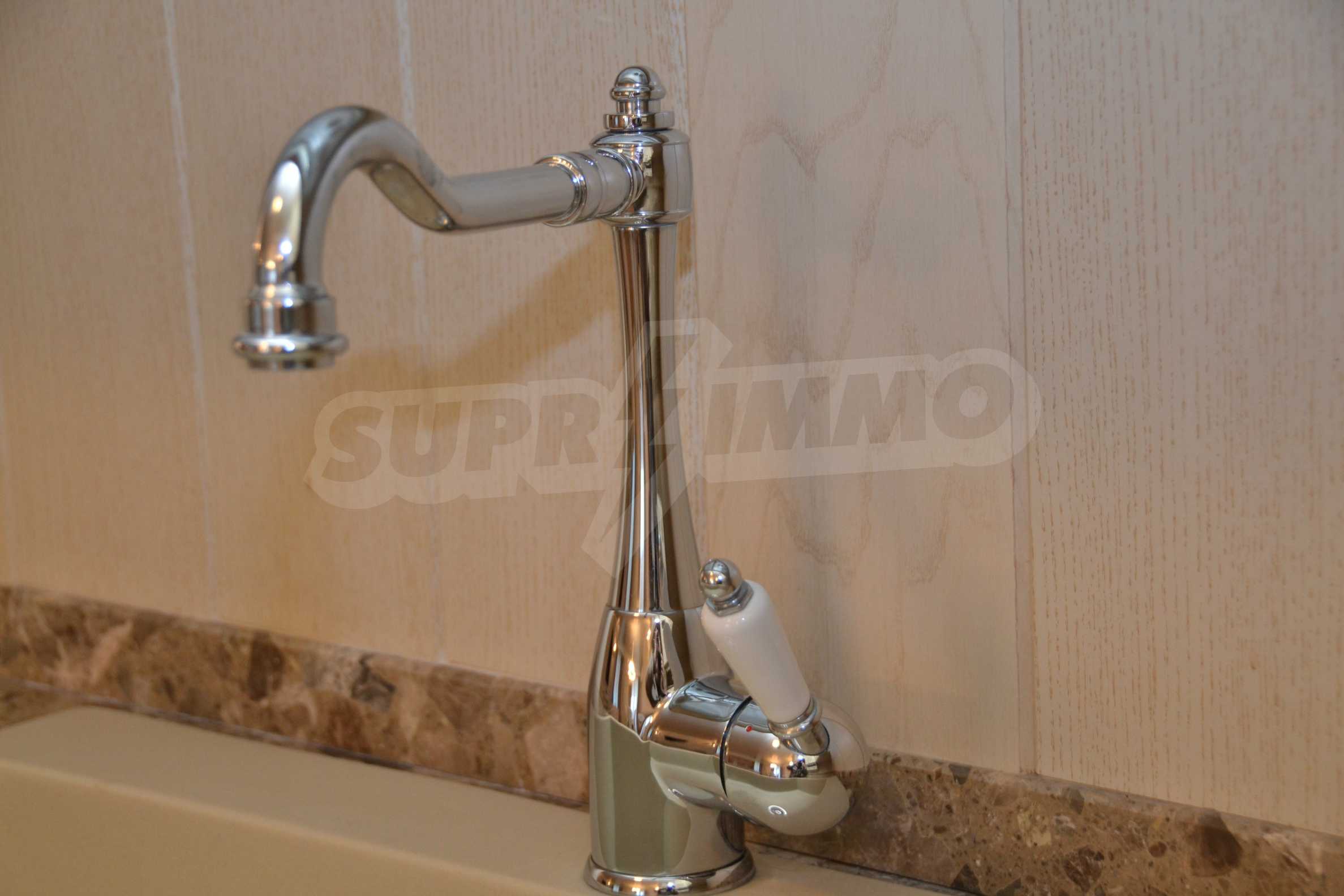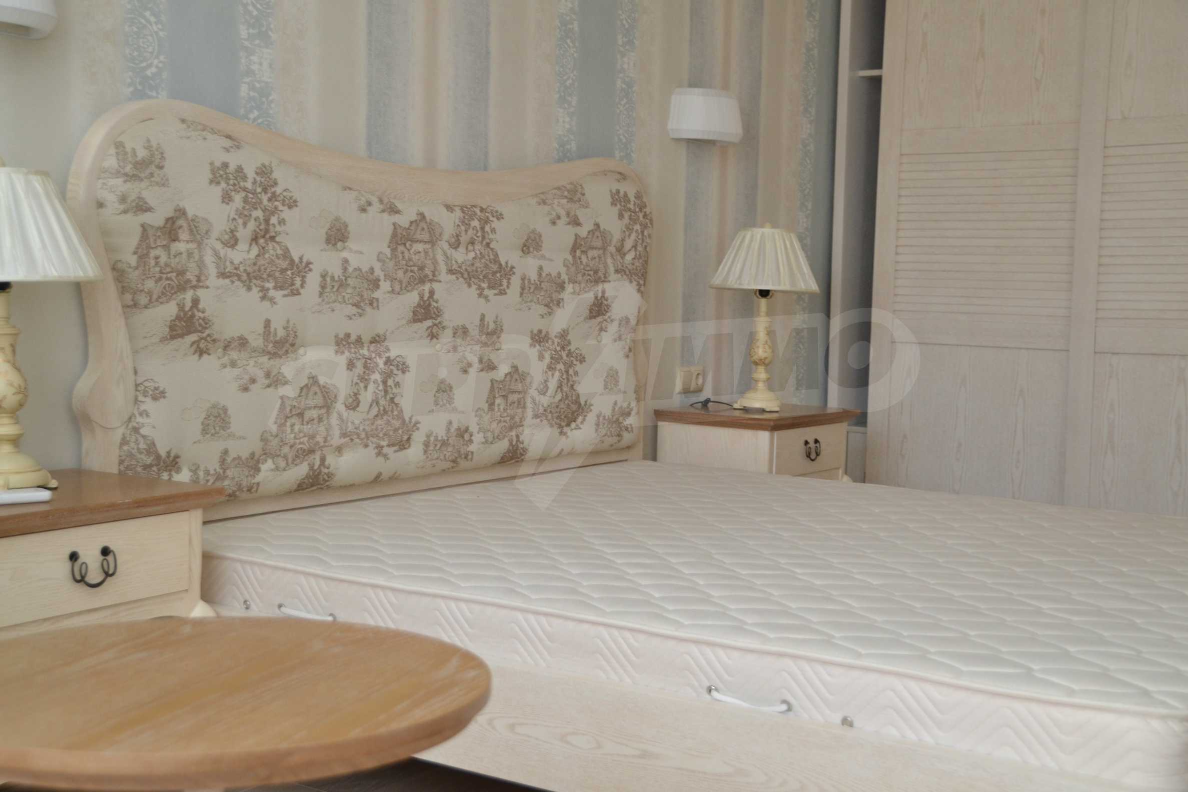 The living room has comfortable white sofas, wide enough for more residents or guests.The dining room has a large solid wooden table and can accommodate 6 people. Kitchen with white cupboards is supplied with all necessary appliances with retro design. Classical follows the elegant lines of almost every meter of dwelling. Curtains, wallpaper and beautiful chandeliers in the living room add a touch of royal feeling.