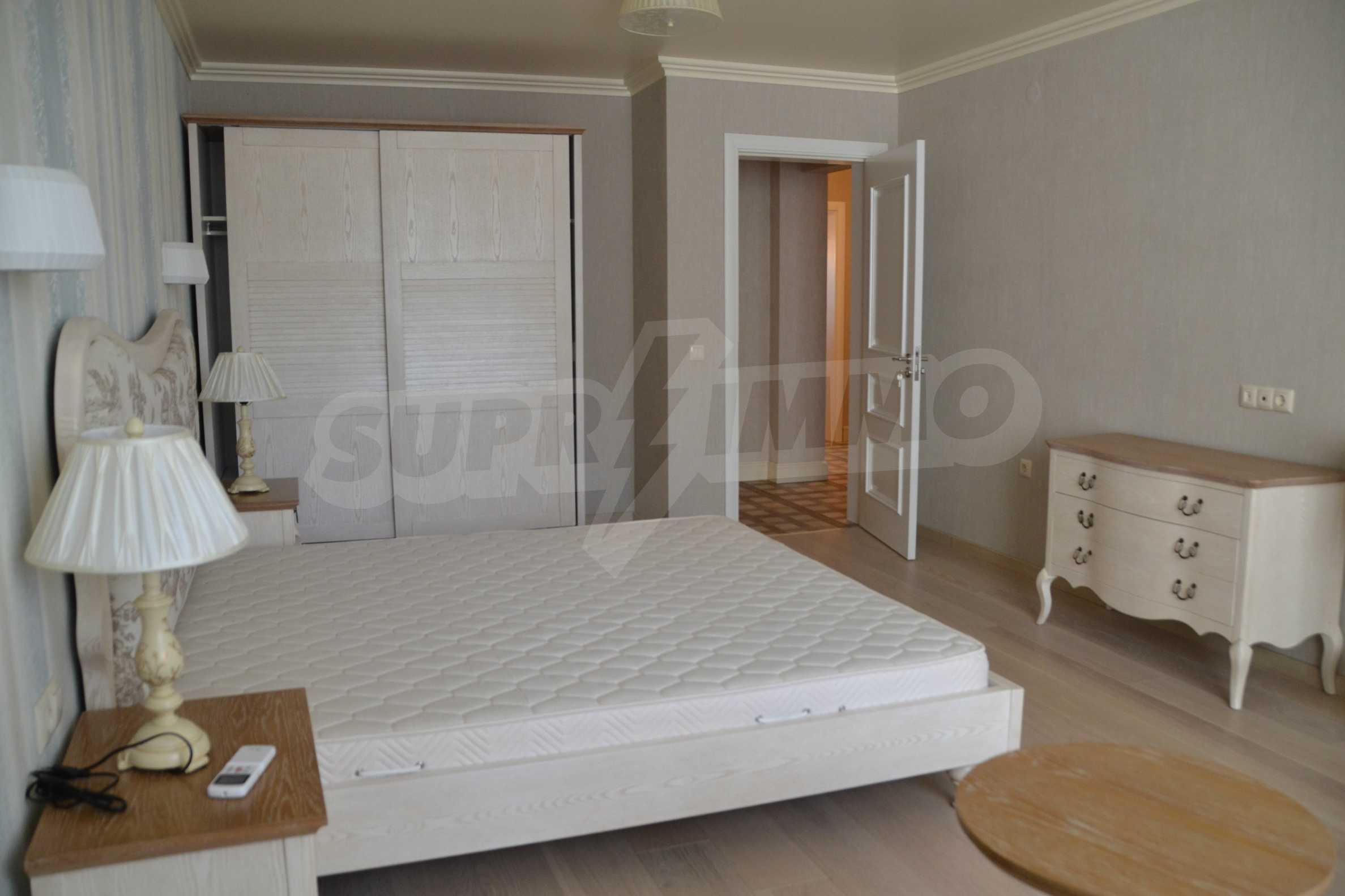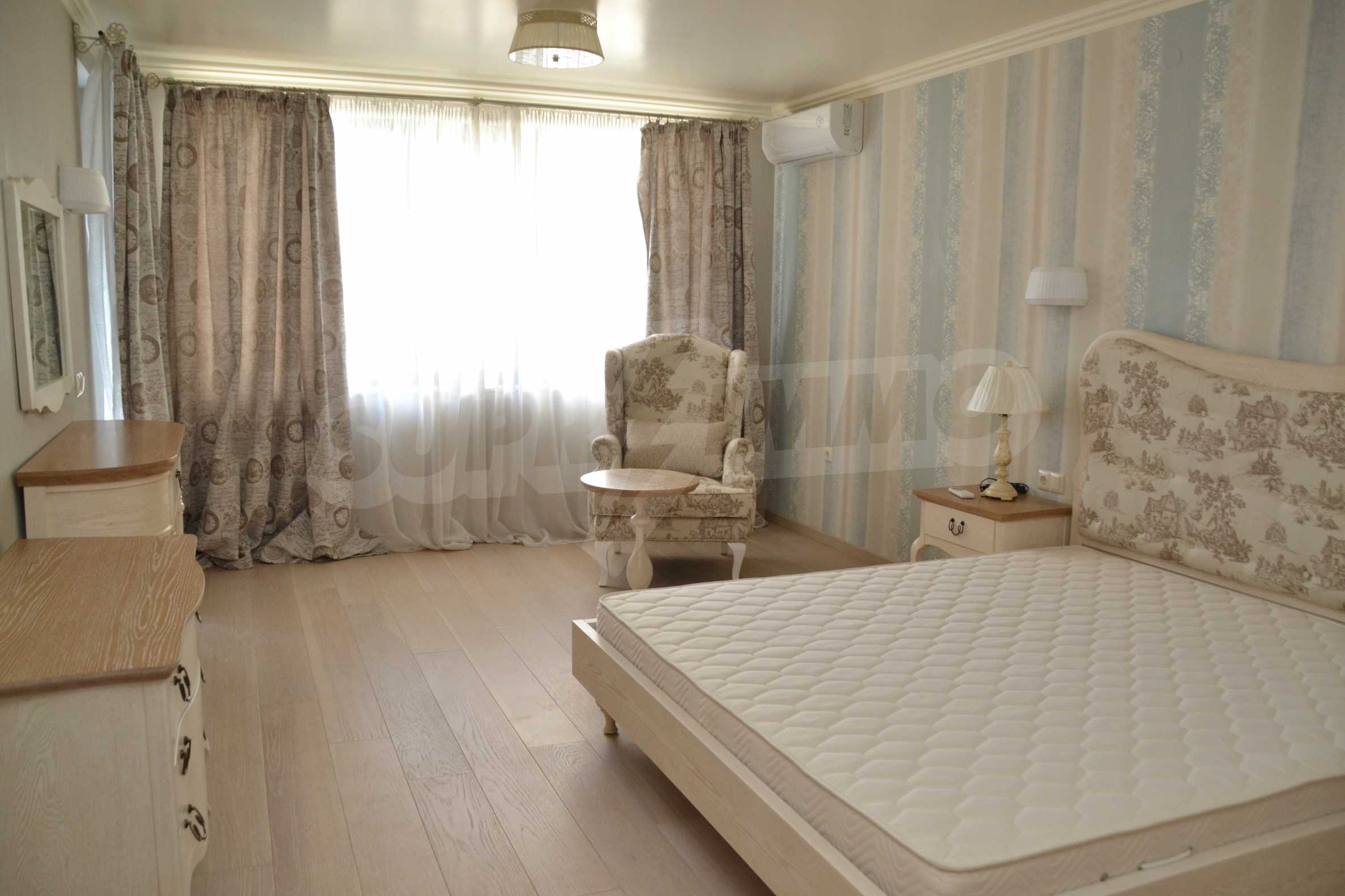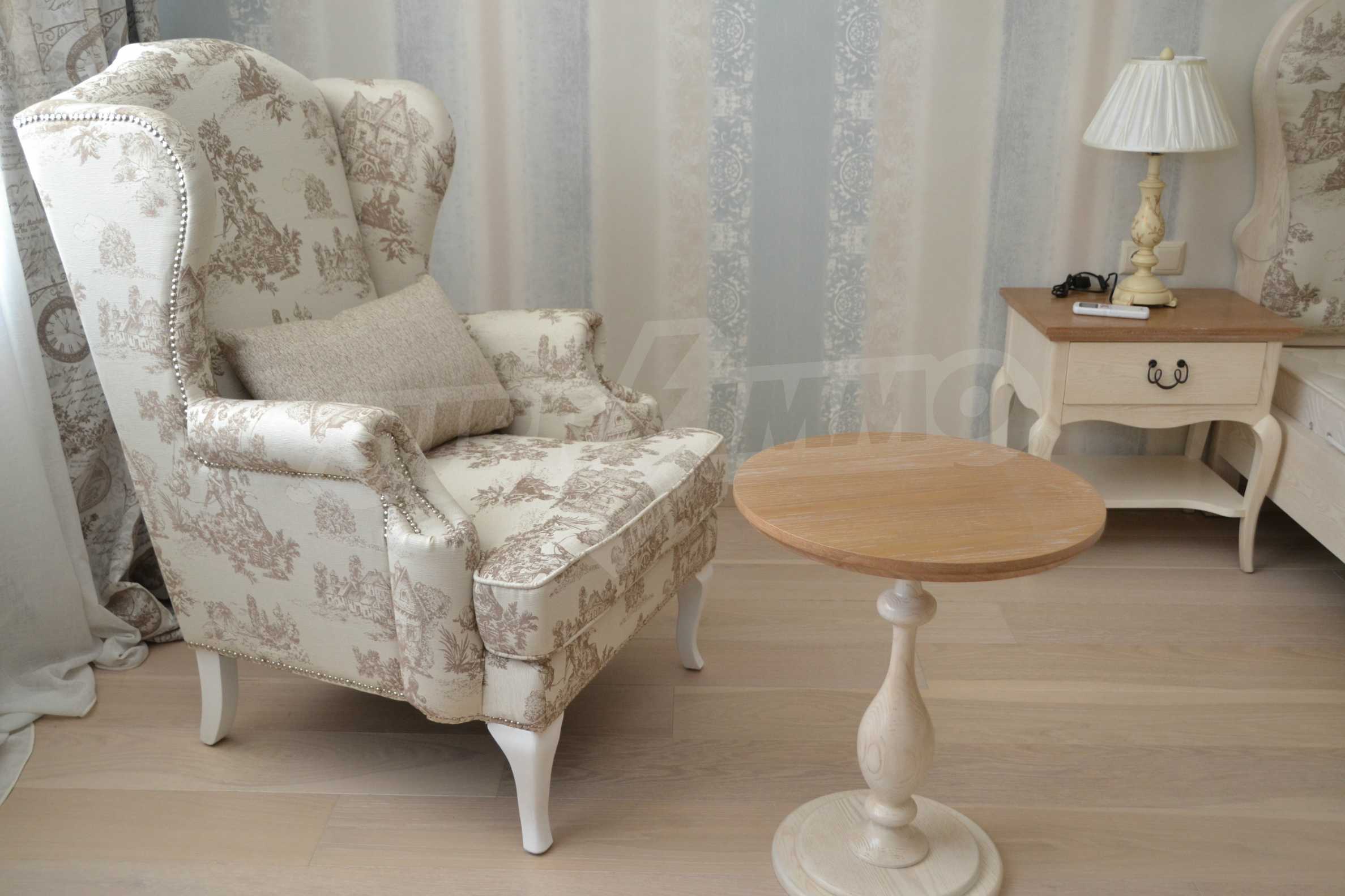 The first bedroom is decorated in white and gray colors, with upholstered headboard, and classic armchair.