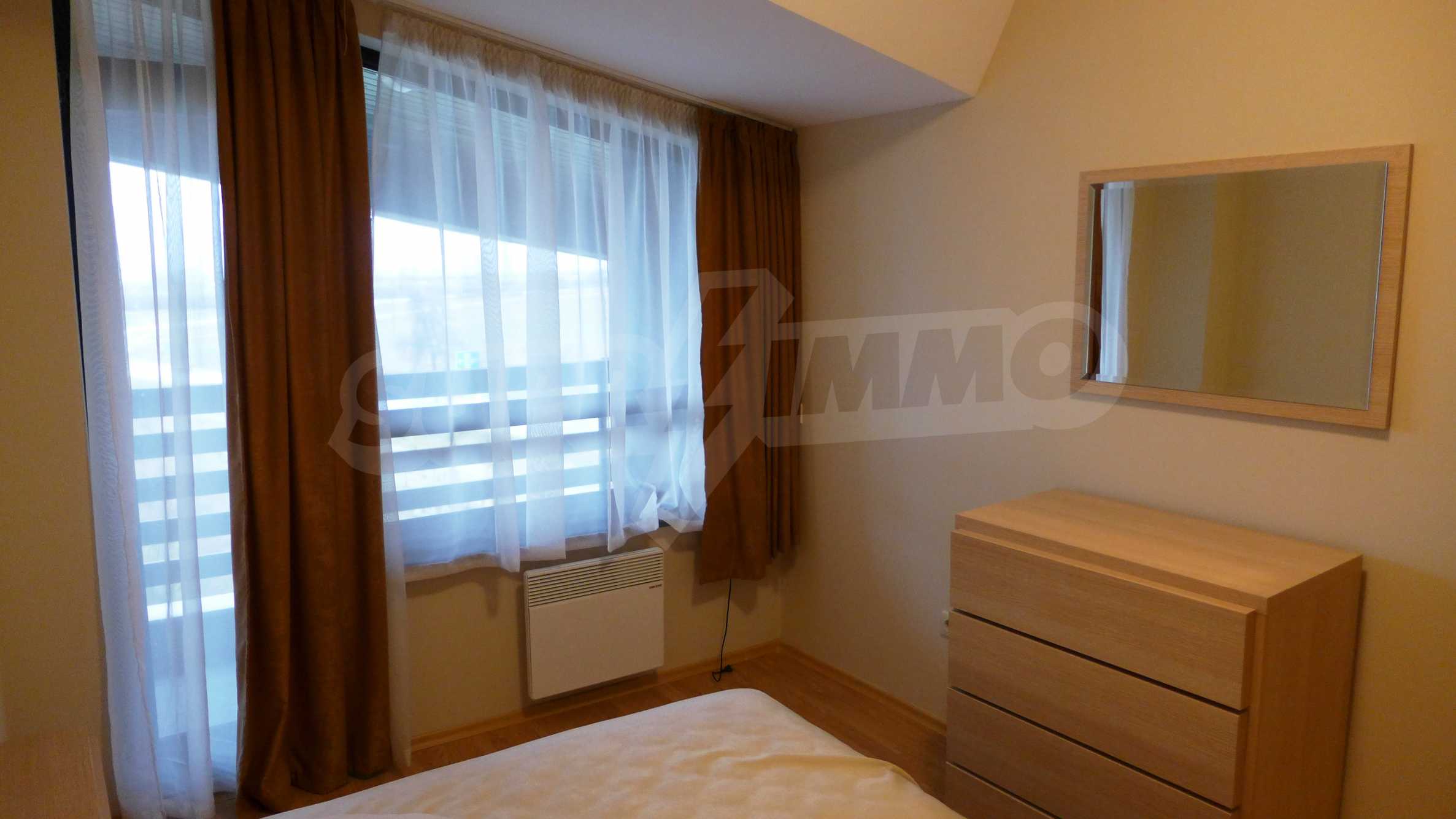 The newly-built penthouse apartment (2006) is facing south, with a total area of 125.72 sq.m., living area - 99.57 sq.m. The modern kitchen includes an oven, 4 hob, an extractor fan, a sink, a fridge, a kettle, a toaster; living room - a triple sofa-bed, an armchair, a coffee table, a plasma tv, a DVD player, a Tv Stand, a dining table, 6 dining chairs, curtains; Bedroom 1 - 2x single beds, a chest of drawers, a mirror, curtains; Bedroom 2 - a double bed, bedside cabinets, a double wardrobe, a large chest of drawers, curtains; bathroom with WC – a bathtub, a sink, a mirror, a water heater. The flat has cable TV and internet. The heating is by electric radiators. The building has an elevator. The annual maintenance fee of the common areas is 10 euros per square.
