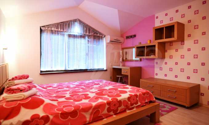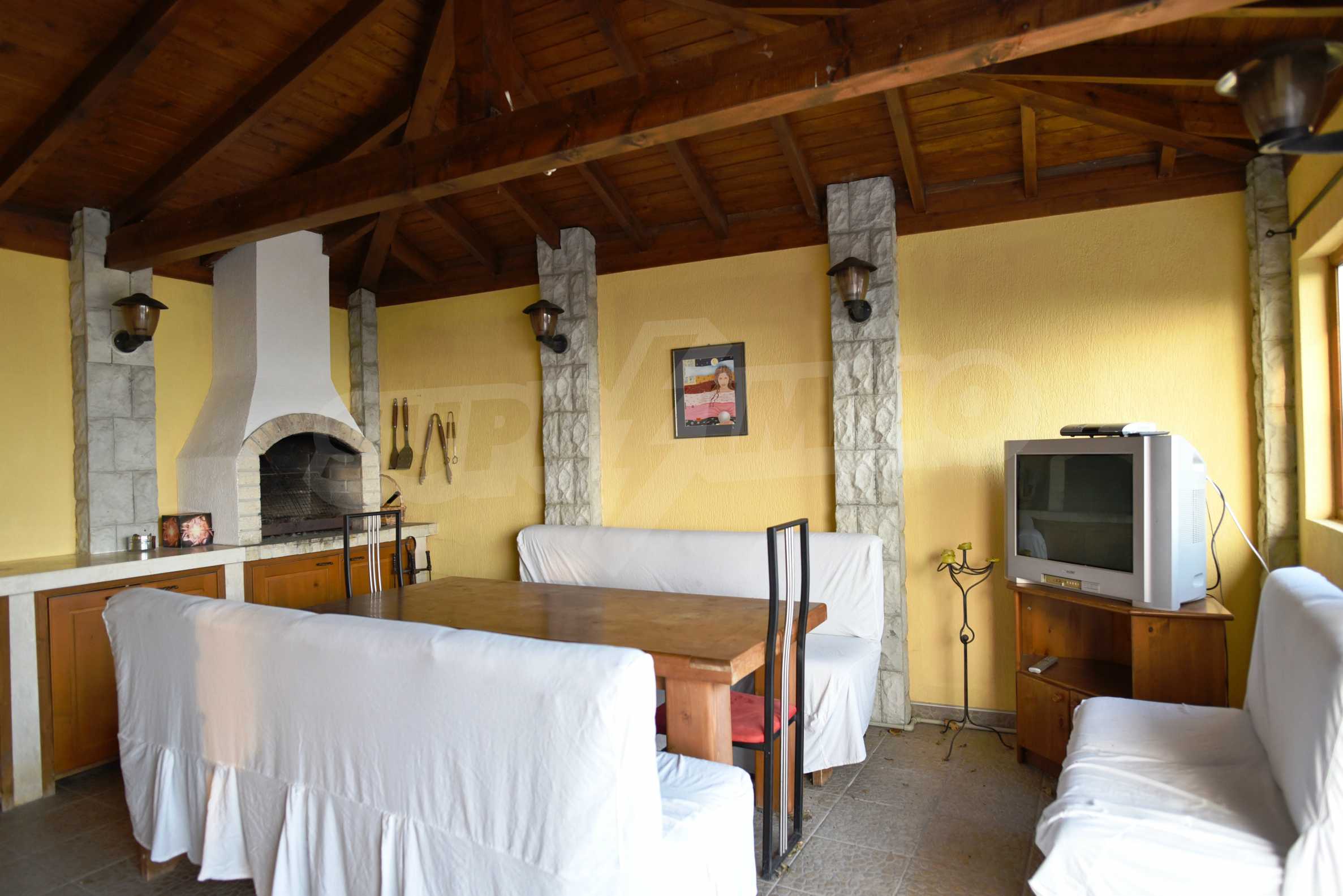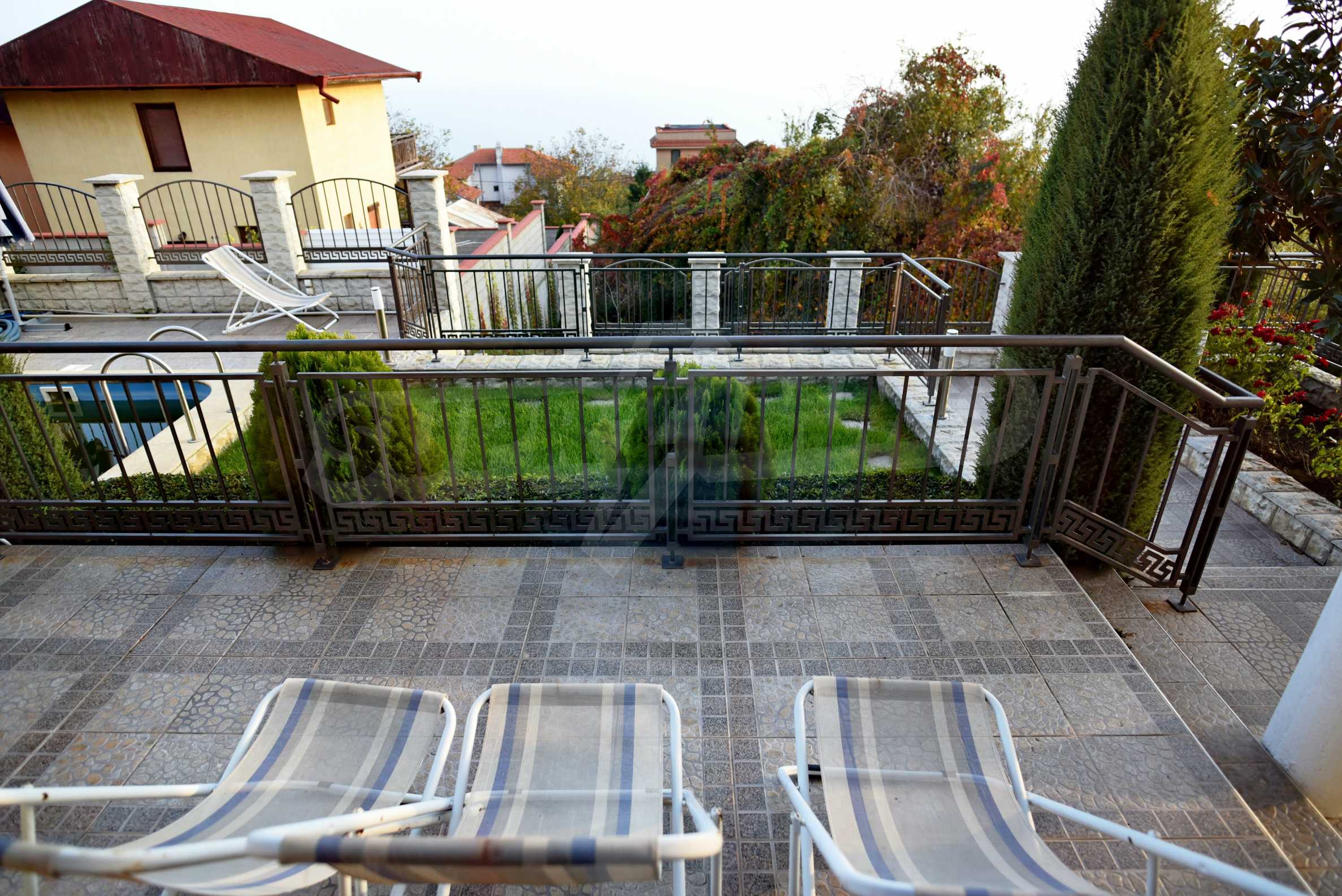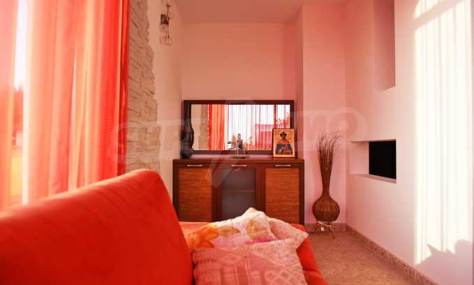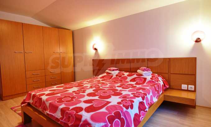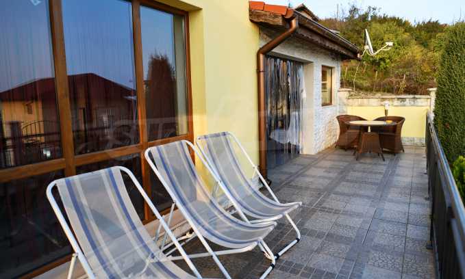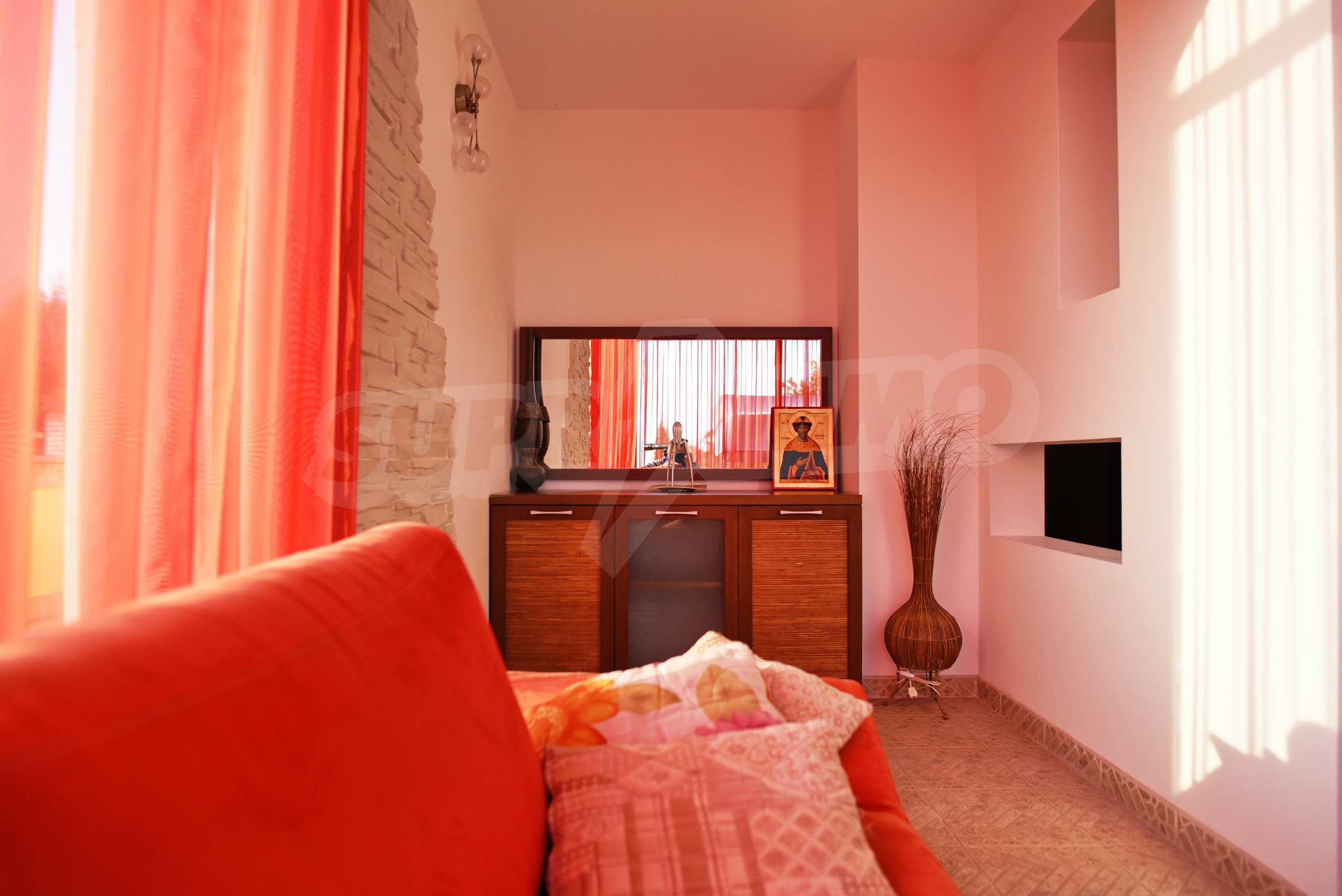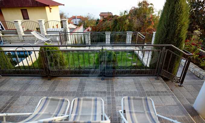 Outside this modern house is surrounded by very well trim garden with lawns and flowerbeds. There is a south facing sea view verandah with direct access from the living room with table and chairs. In the evenings, the stunning view over the enlightened resort of Albena will captivate you. In the private swimming pool sized 3,5 x 3,5 meters guests will chill out after having long day under the hot summer sun. The pool is solely for the use of guests with pool furniture around. Villa „Galini“ has a wonderful spacious roof terrace with BBQ and appropriate furniture.