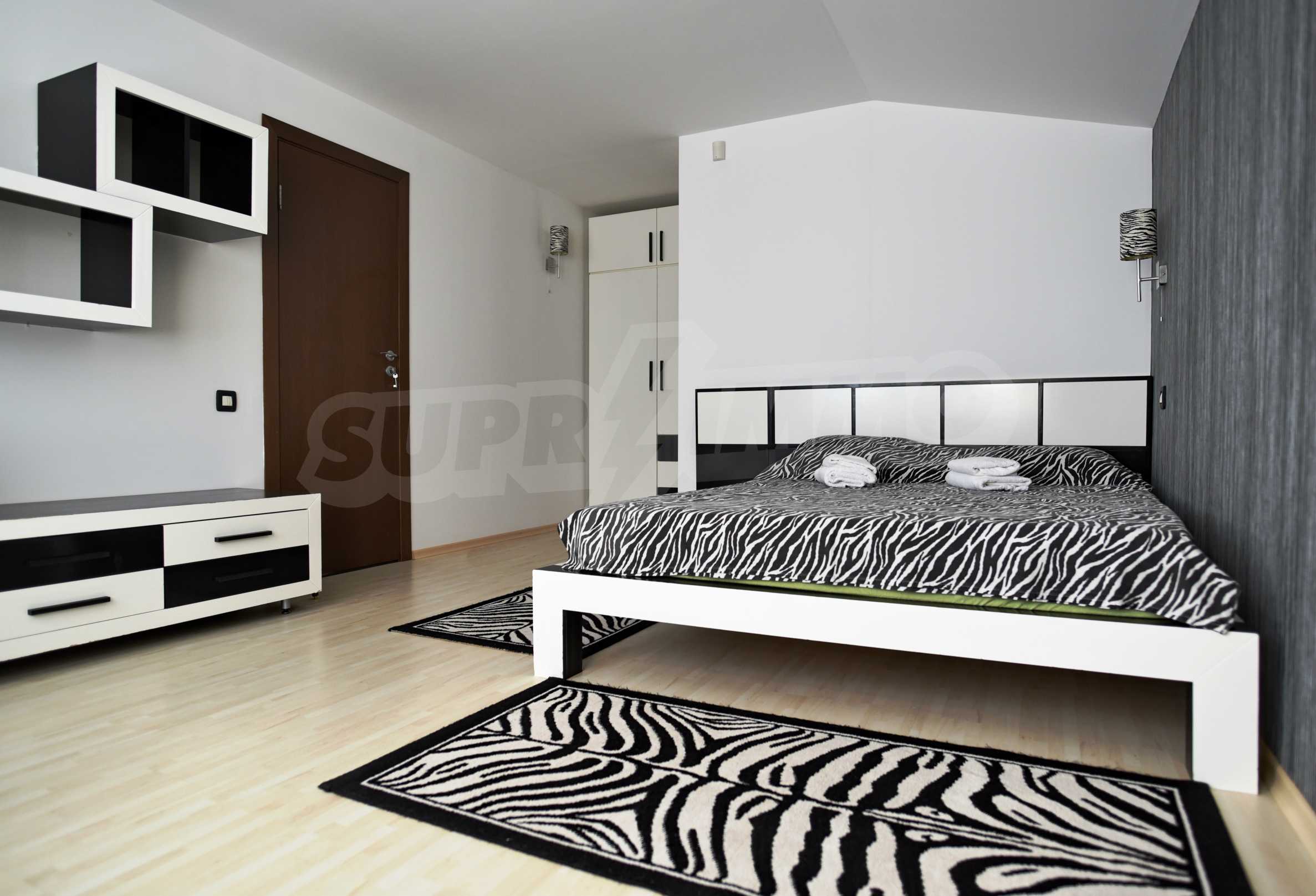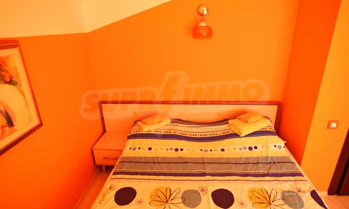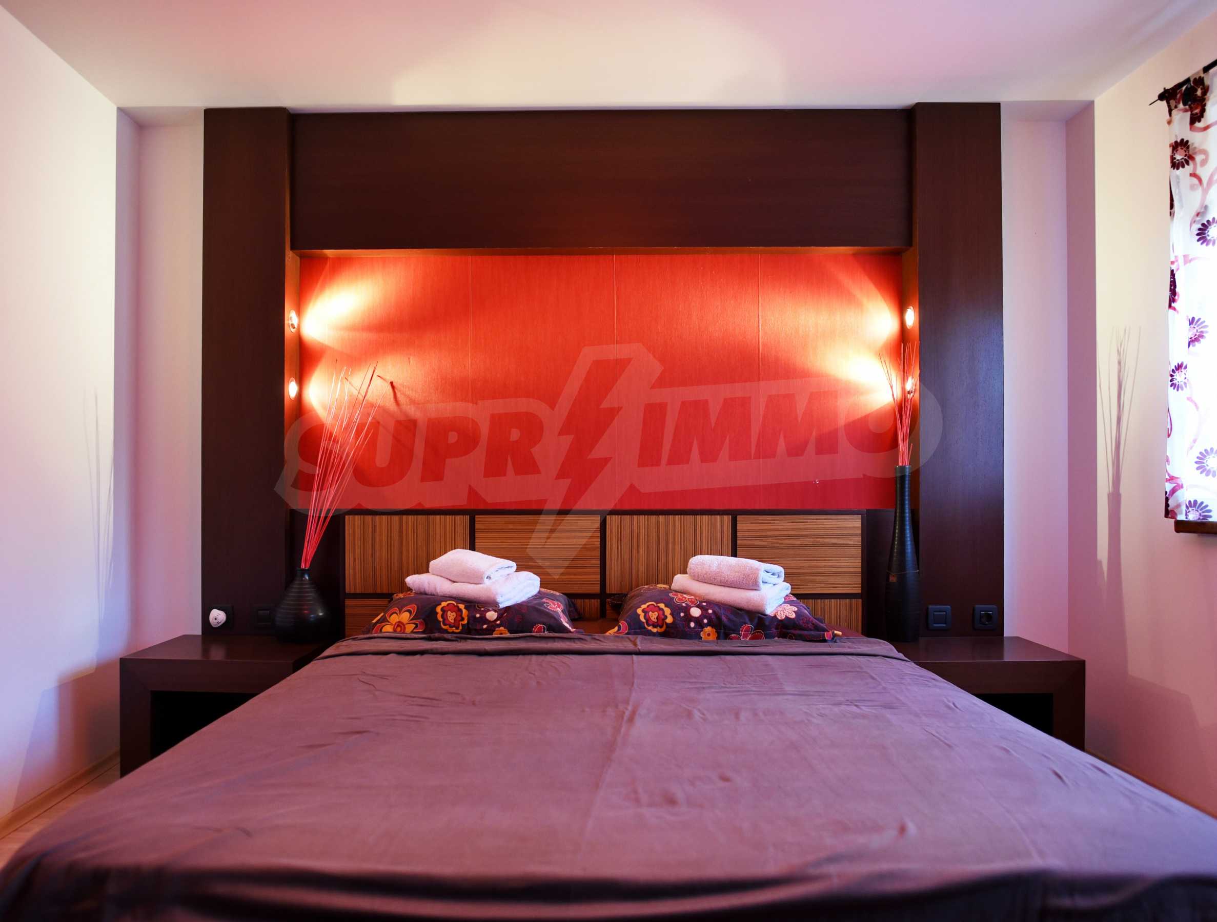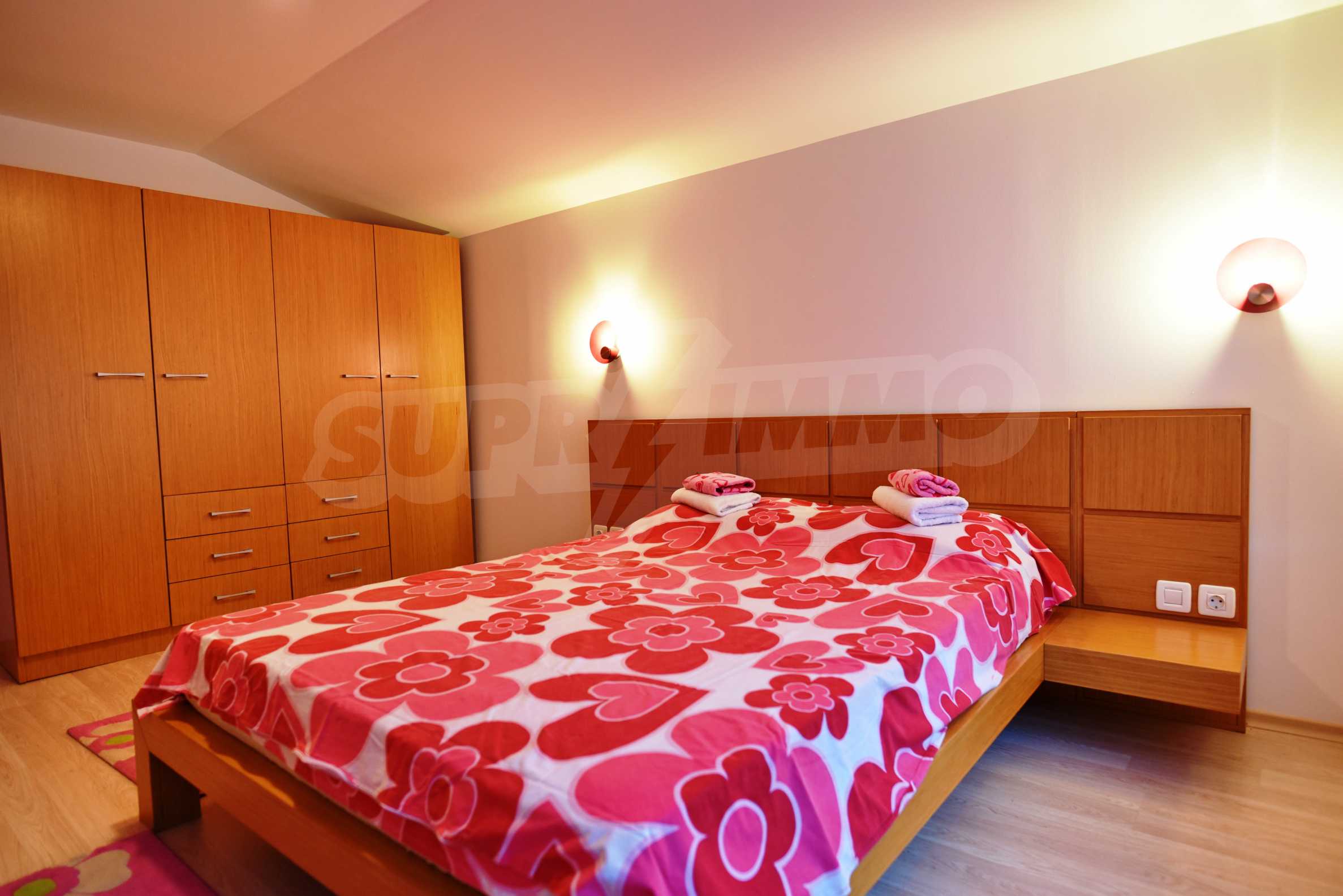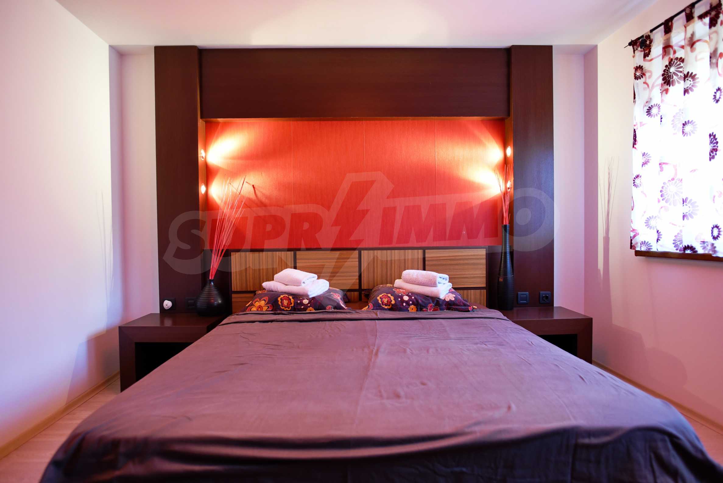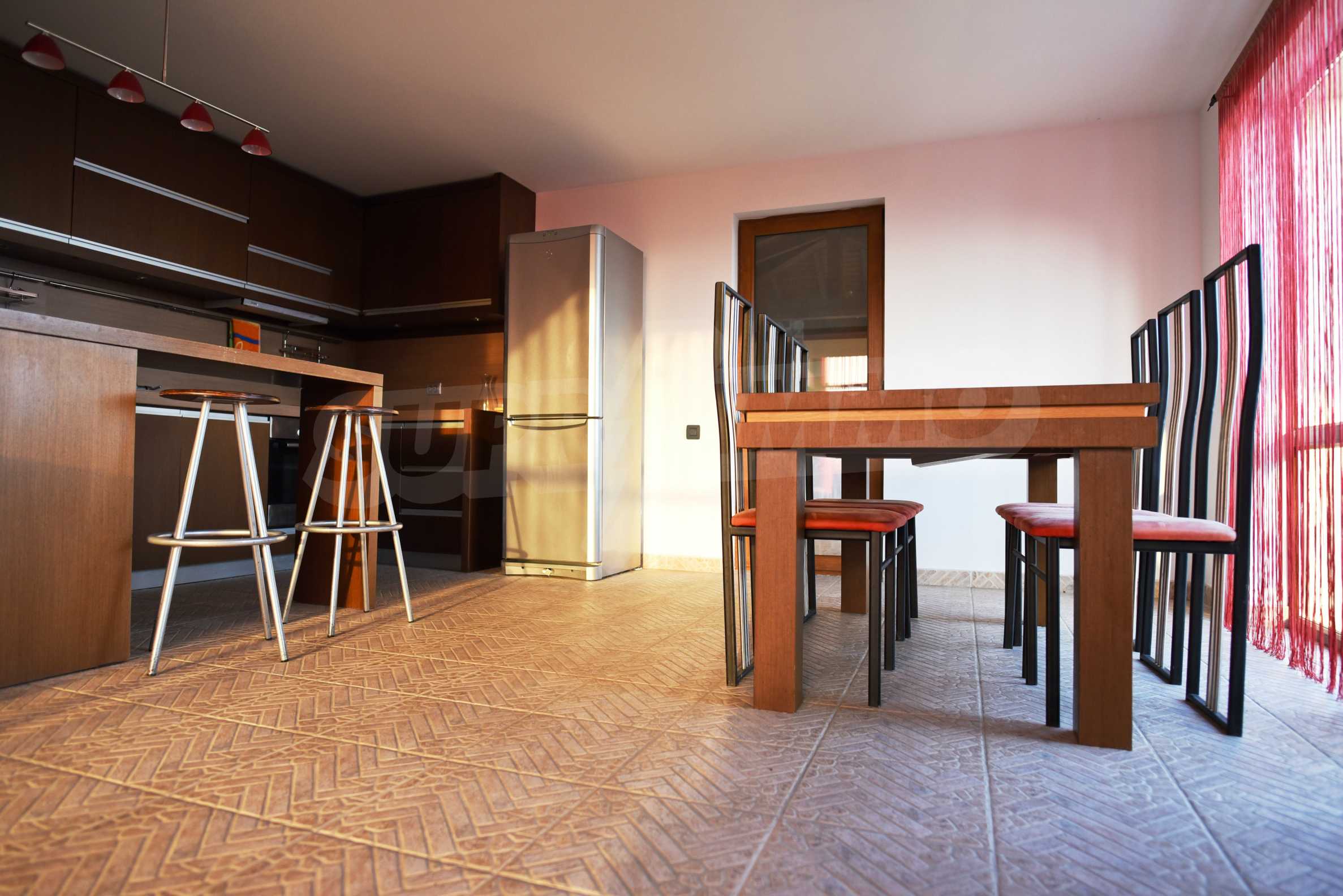 Outside this modern house is surrounded by very well trim garden with lawns and flowerbeds. There is a south facing sea view verandah with direct access from the living room with table and chairs. In the evenings, the stunning view over the enlightened resort of Albena will captivate you. In the private swimming pool sized 3,5 x 3,5 meters guests will chill out after having long day under the hot summer sun. The pool is solely for the use of guests with pool furniture around. Villa „Galini“ has a wonderful spacious roof terrace with BBQ and appropriate furniture.