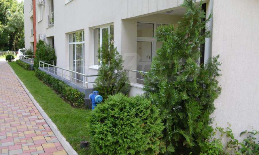 The described studio is located on the ground floor and consists of a living room with a kitchenette, a bathroom with WC and a big terrace. The property is offered for sale with furniture and equipment. The walls are painted, the flooring - tiled. Its total area is 39.37 m2., common parts 6.23 m2 and a terrace of 4.5 m2 overlooking the quiet inner yard with trees.