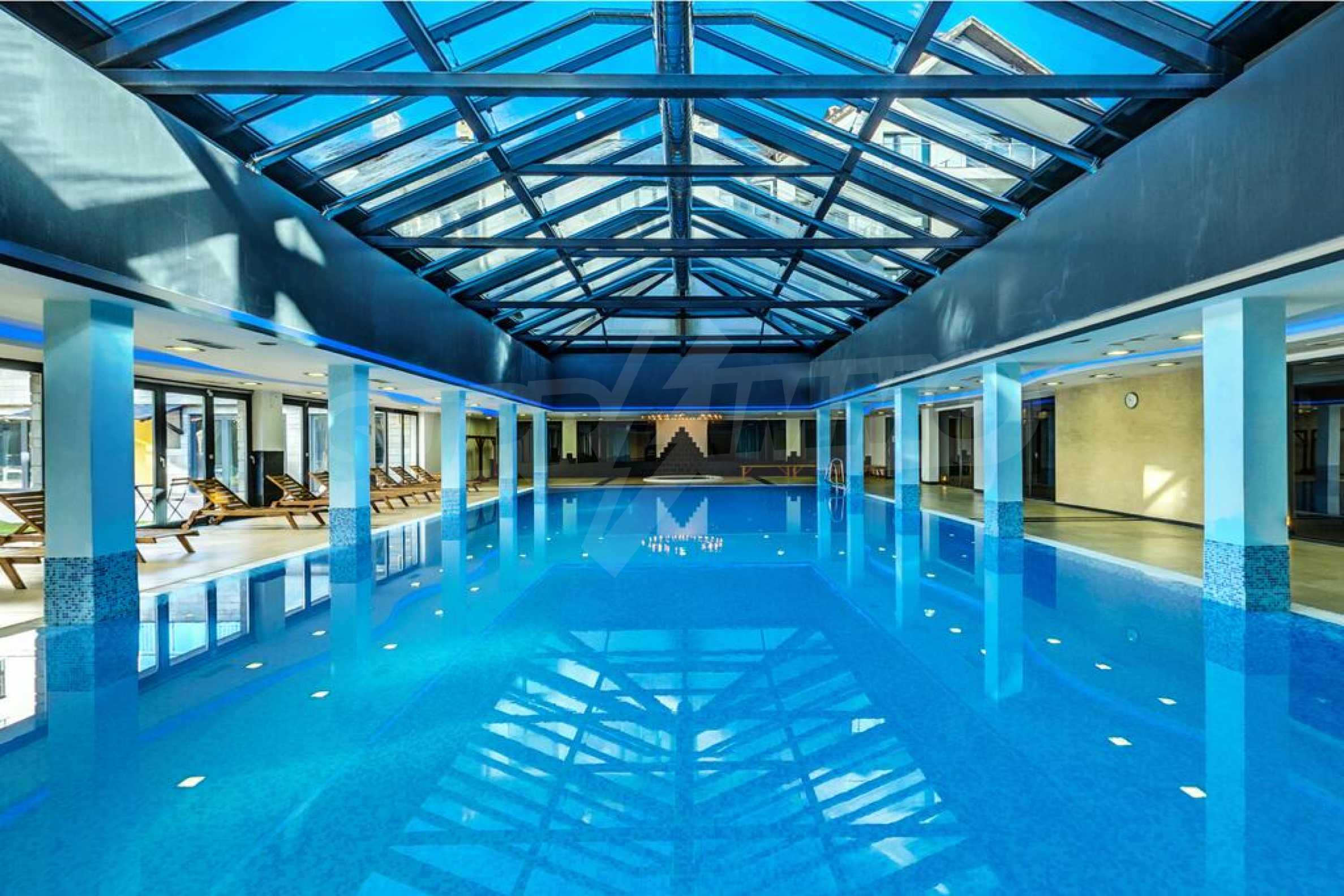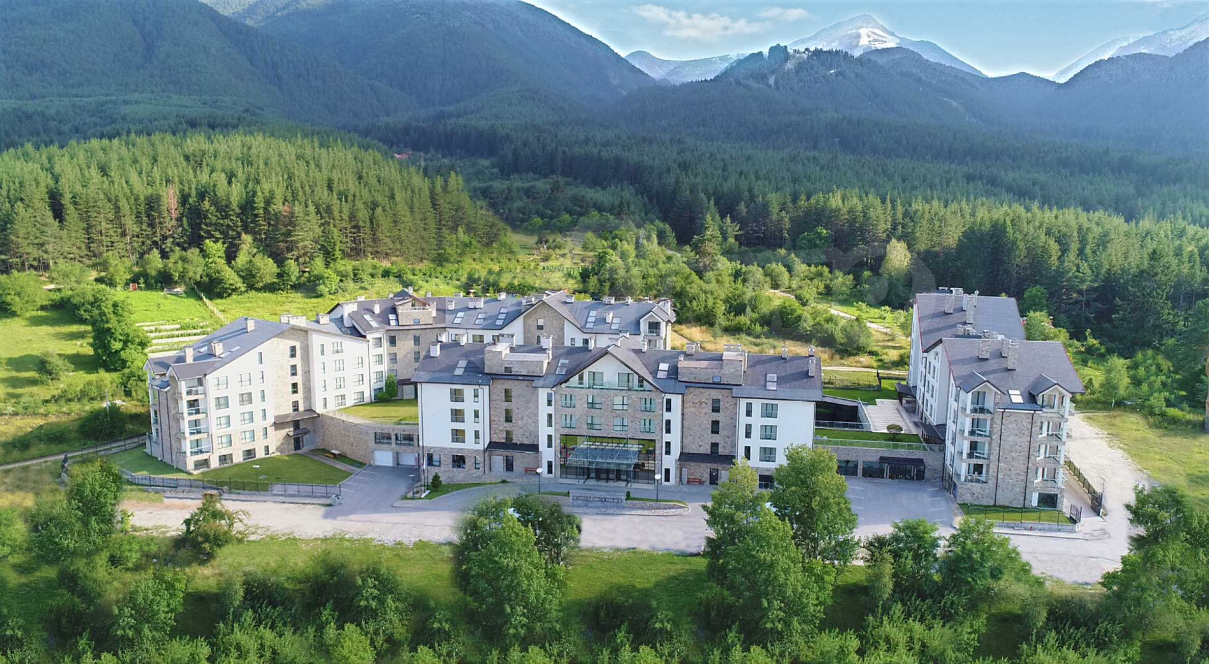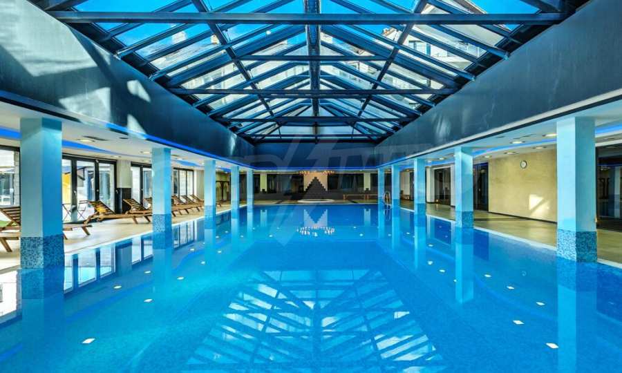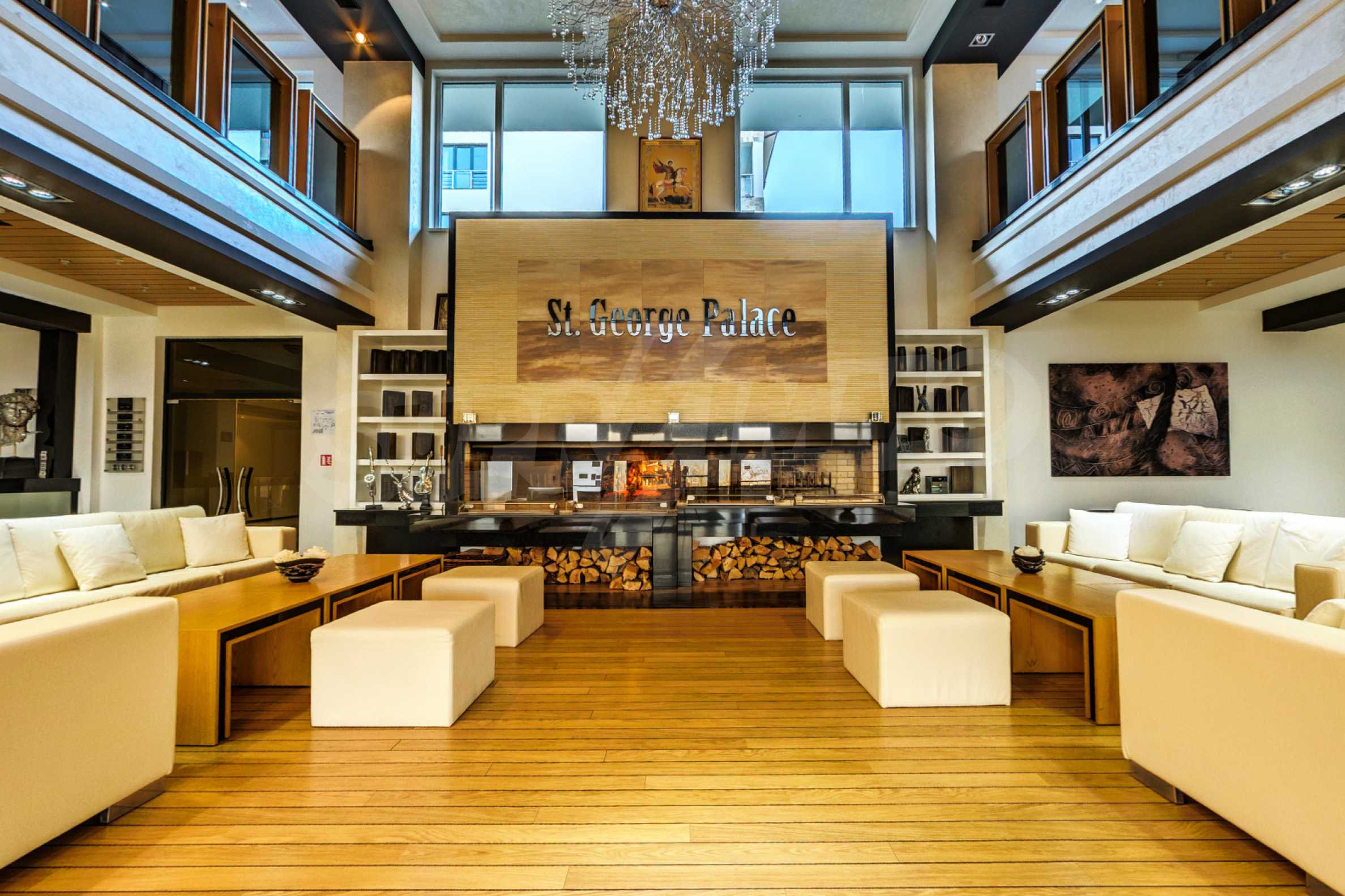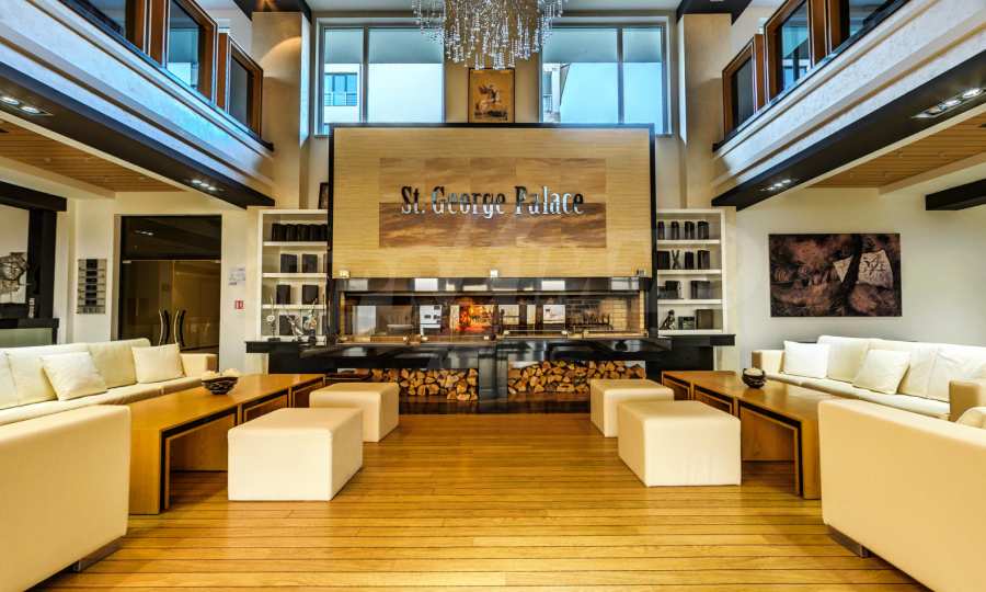 St. George Palace is one of the most luxurious year-round working complexes in Bansko, with spacious SPA center with massage services and panoramic views of Bansko, Pirin and Rila mountains. The complex has a modern restaurant which serves traditional Bulgarian, Italian and European cuisine, with children's play area. The apart-hotel has 2 bars - a sports bar with pool table and foosball and panoramic lobby bar with 50 seats, with mountain views. The guests can relax in the indoor swimming pool and hot tub or take advantage of the equipped fitness center and conference room (100-120 seats) and the following services - laundry, ironing, dry cleaning, safety deposit boxes at the reception, rent-a-car, excursions and transfers.