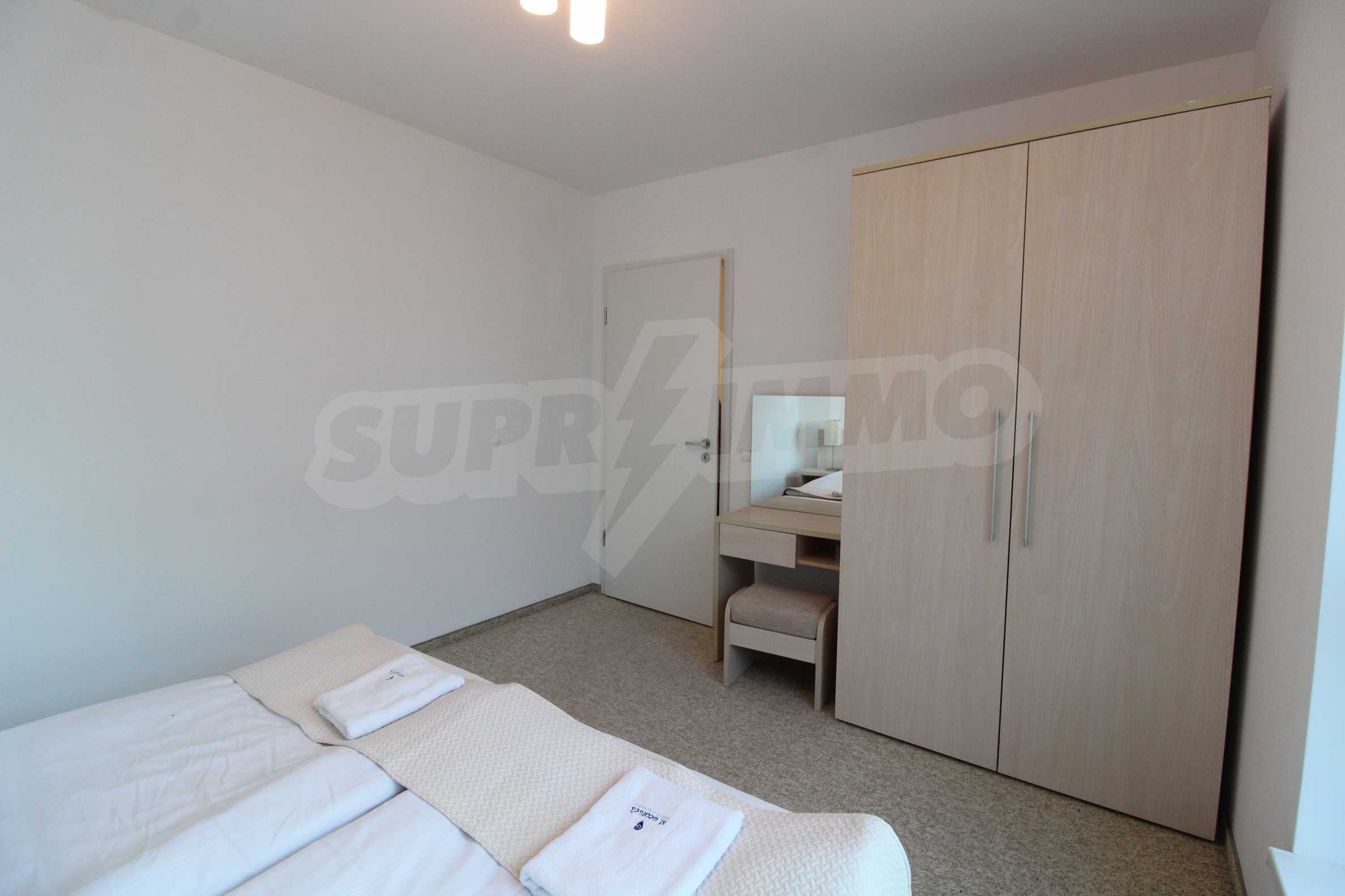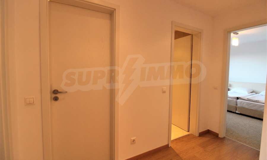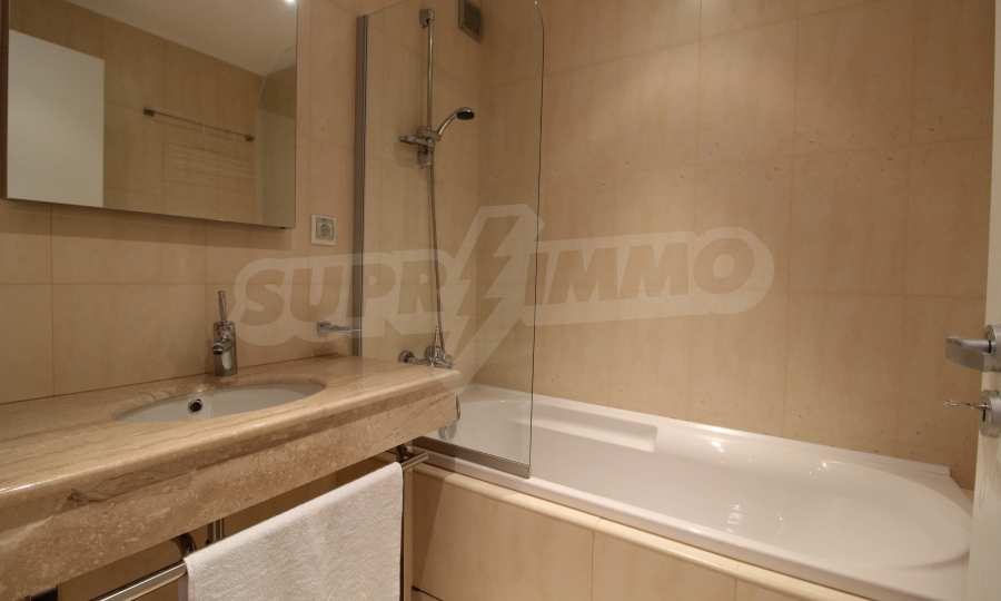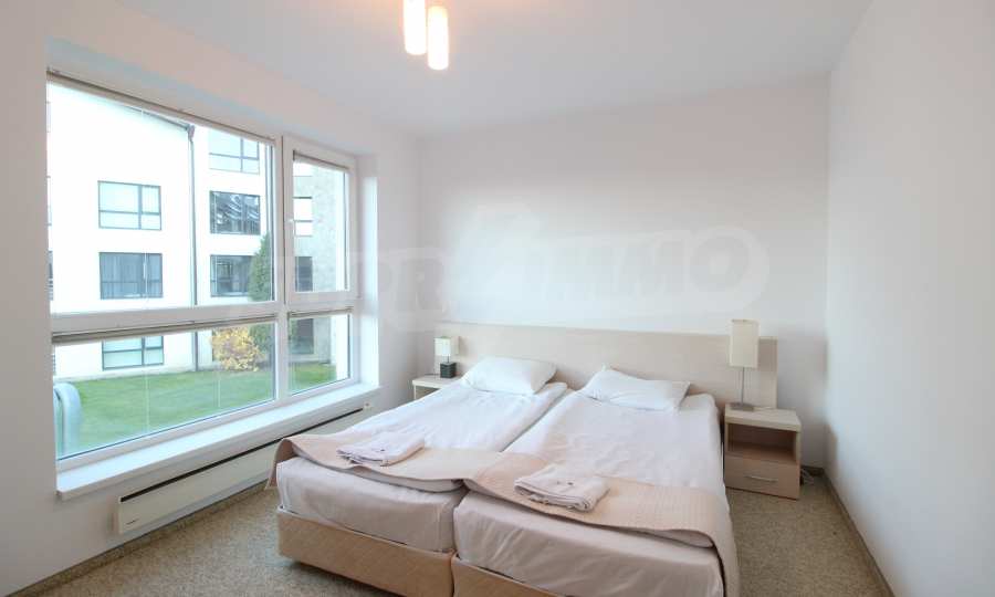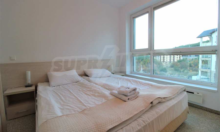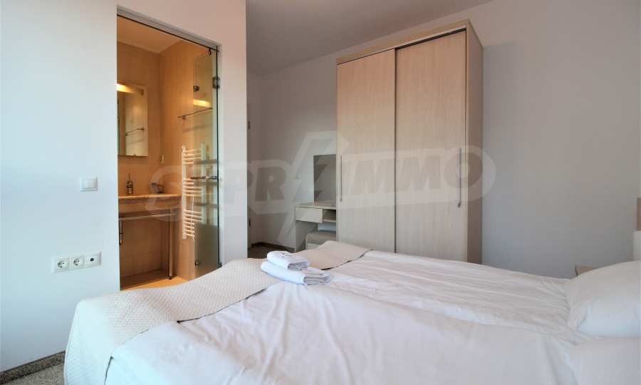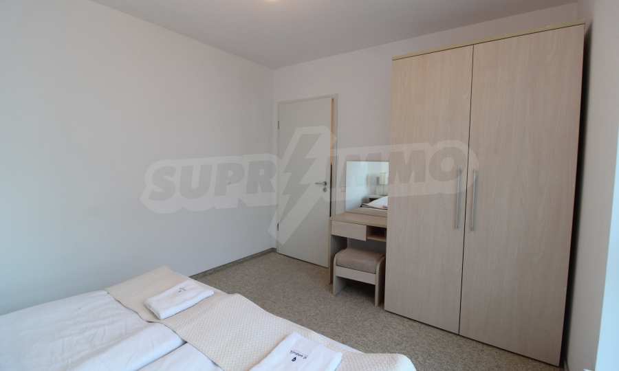 The described holiday home (2006), facing north, with beautiful view of the mountain, is located on the third floor with an area of 97 sq.m. The kitchen includes a 4-hob, an extractor fan, a sink, a fridge, a kettle, a toaster. The living room - a double sofa, 2 armchairs, a tv, a coffee table, a tv stand, wi-fi, telephone-reception, a dining table, 4 chairs, blinds. Bedroom 1: 2 single beds, 2 bedside tables, a double wardrobe, a dressing table with a mirror and a chair. Bedroom 2: a double bed, 2 bedside tables, a double wardrobe, a dressing table with a mirror and a chair. Bathroom with WC - a sink, a mirror. Bathroom with WC 2 - a bath, a shower box, a sink, a mirror, a water heater. En-suite Bathroom 3 - a shower, a sink, a mirror. The floors are with laminate and carpets, the window frames are PVC. The property is equipped with telephone, cable TV, Internet, and the building has a reception and lift. The annual maintenance fee is 12 euro / sq.m.