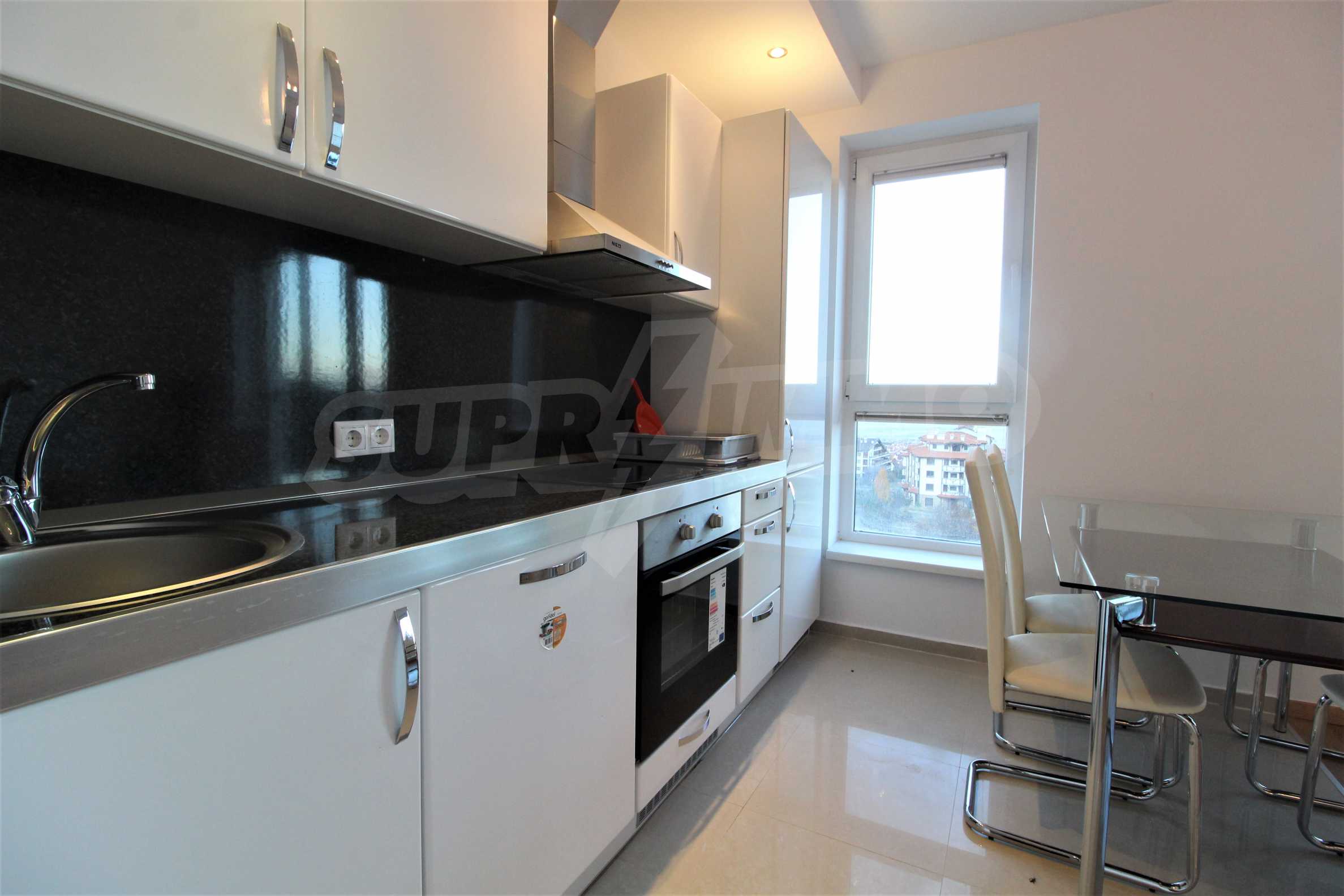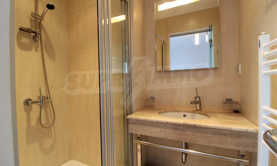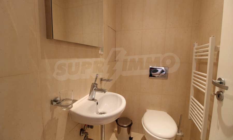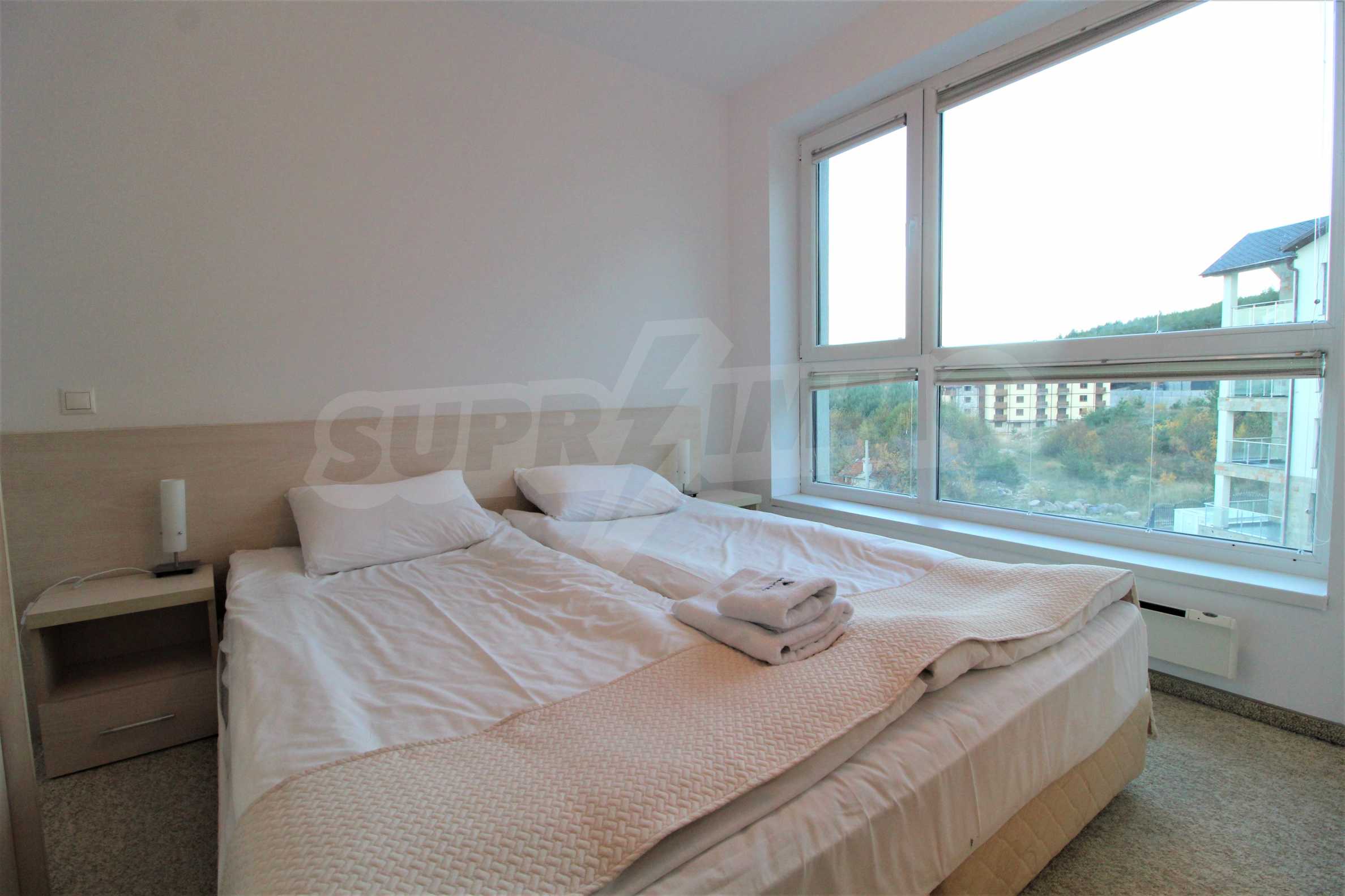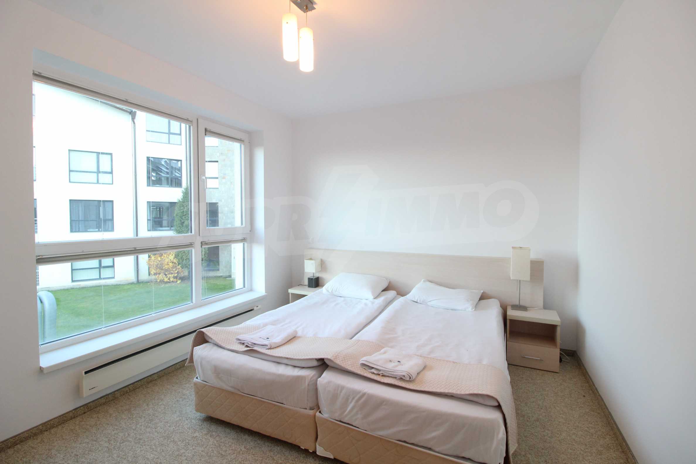 The described holiday home (2006), facing north, with beautiful view of the mountain, is located on the third floor with an area of 97 sq.m. The kitchen includes a 4-hob, an extractor fan, a sink, a fridge, a kettle, a toaster. The living room - a double sofa, 2 armchairs, a tv, a coffee table, a tv stand, wi-fi, telephone-reception, a dining table, 4 chairs, blinds. Bedroom 1: 2 single beds, 2 bedside tables, a double wardrobe, a dressing table with a mirror and a chair. Bedroom 2: a double bed, 2 bedside tables, a double wardrobe, a dressing table with a mirror and a chair. Bathroom with WC - a sink, a mirror. Bathroom with WC 2 - a bath, a shower box, a sink, a mirror, a water heater. En-suite Bathroom 3 - a shower, a sink, a mirror. The floors are with laminate and carpets, the window frames are PVC. The property is equipped with telephone, cable TV, Internet, and the building has a reception and lift. The annual maintenance fee is 12 euro / sq.m.